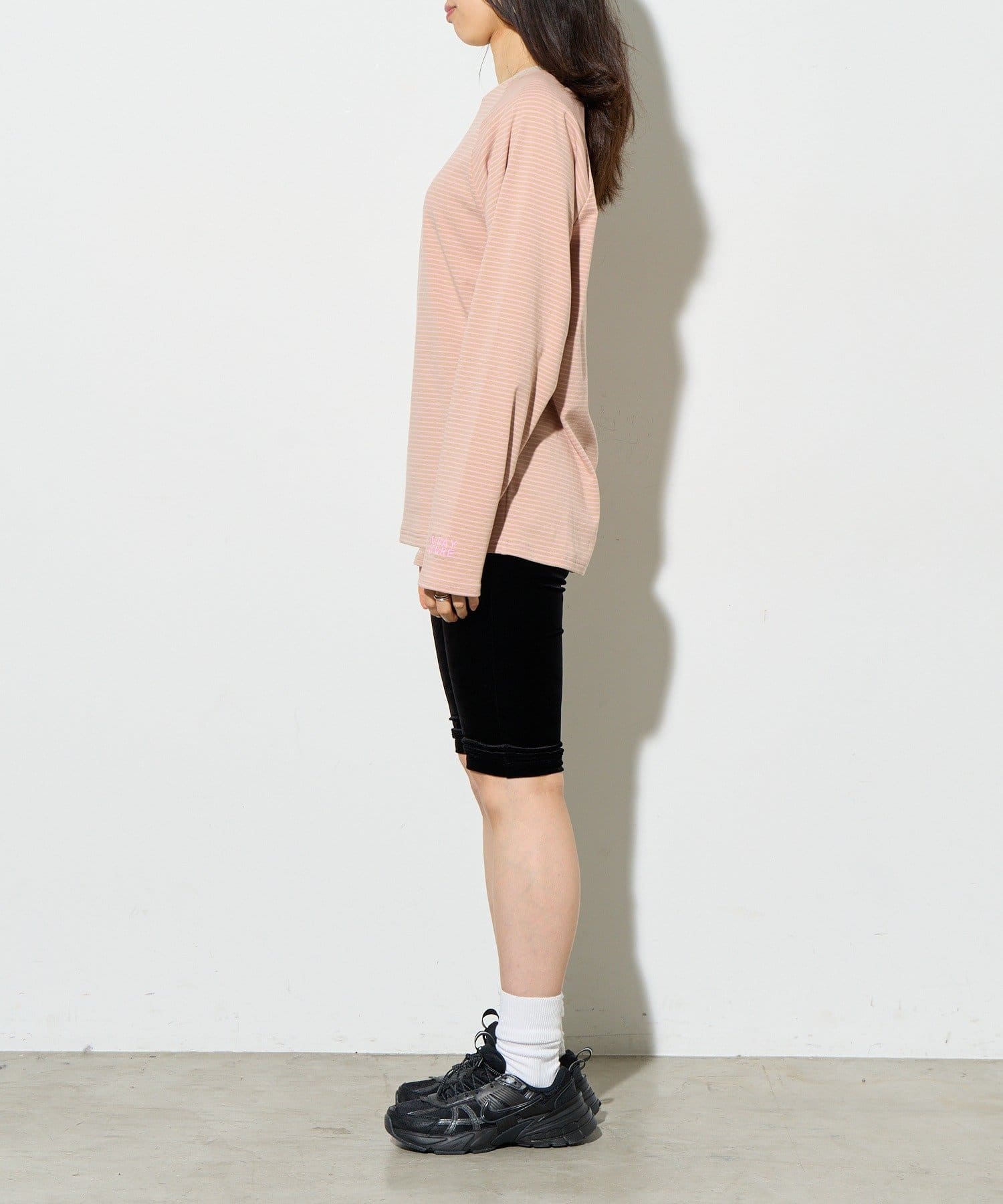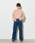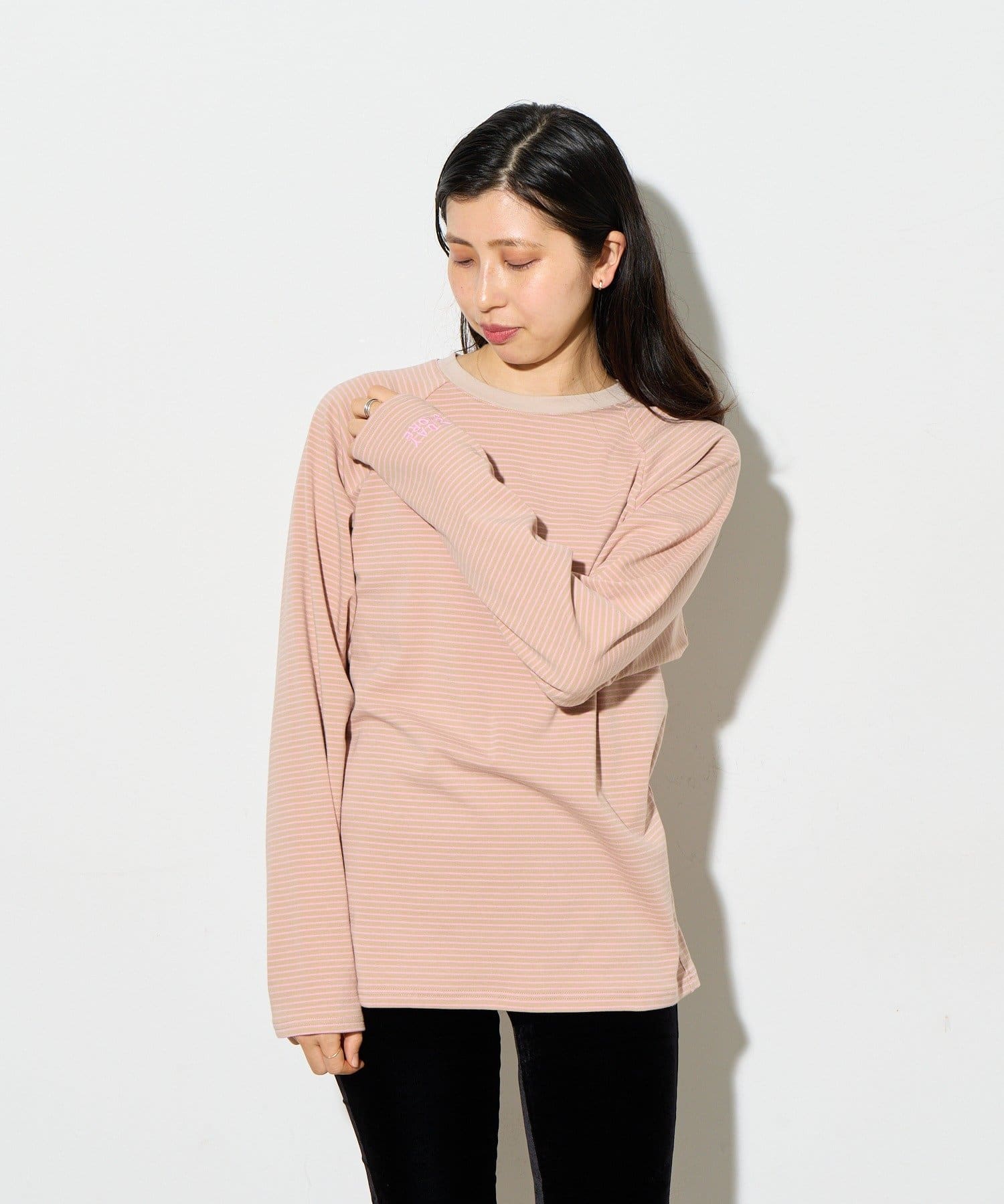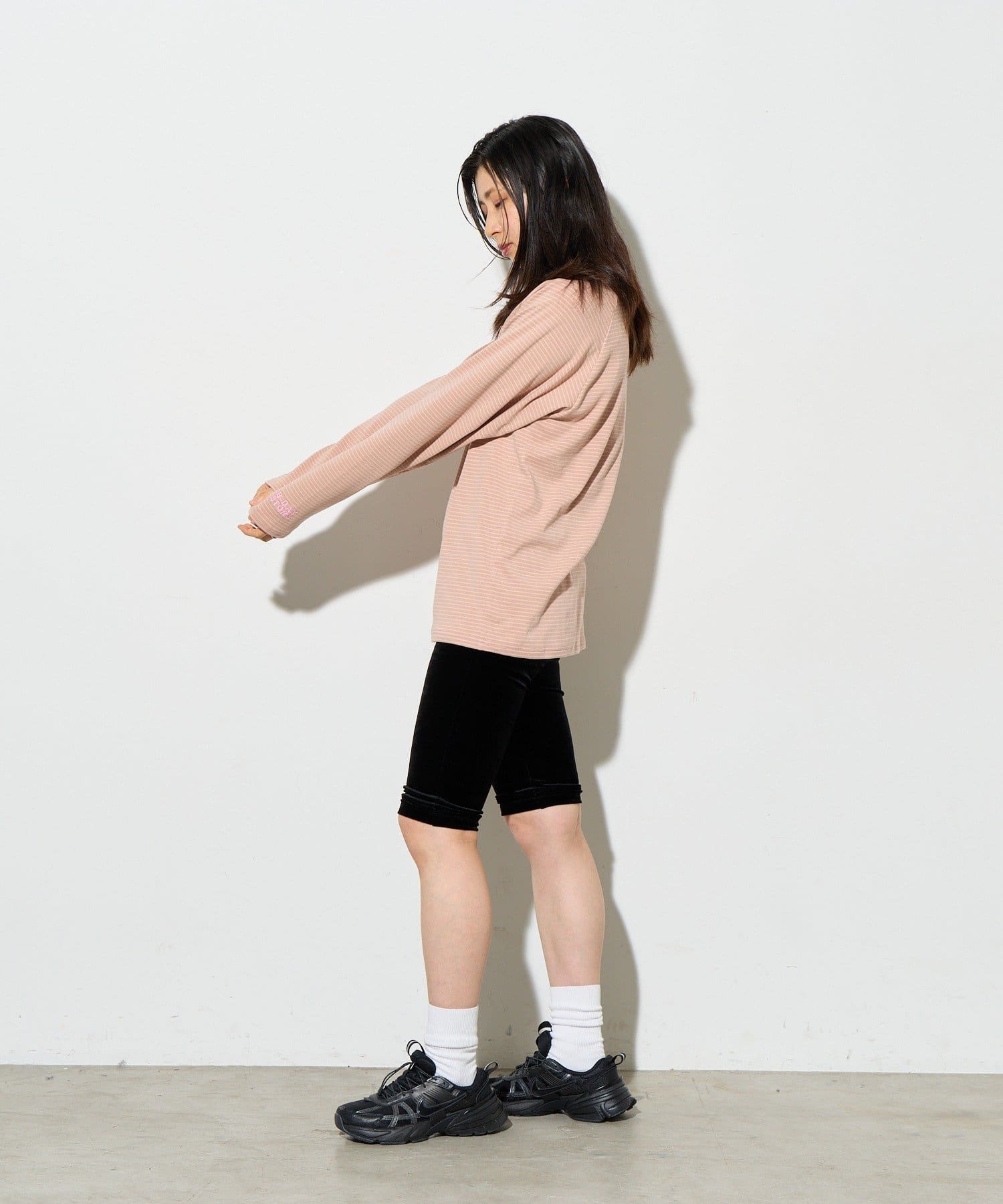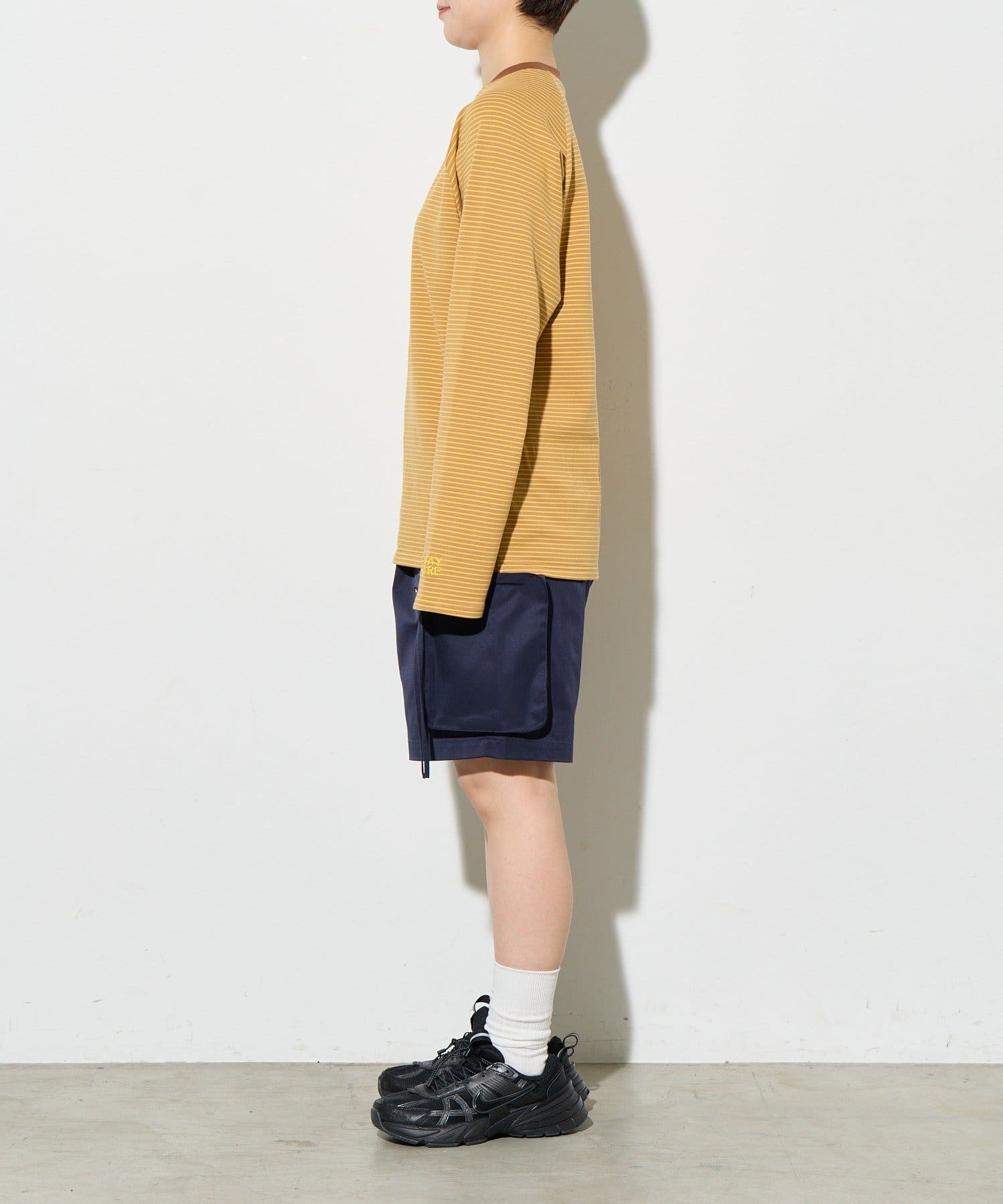 顔周りをすっきりと見せるクルーネックのデザインで、首元のリブは本体より少し濃い色合いになっており、さりげないデザインのアクセントに。