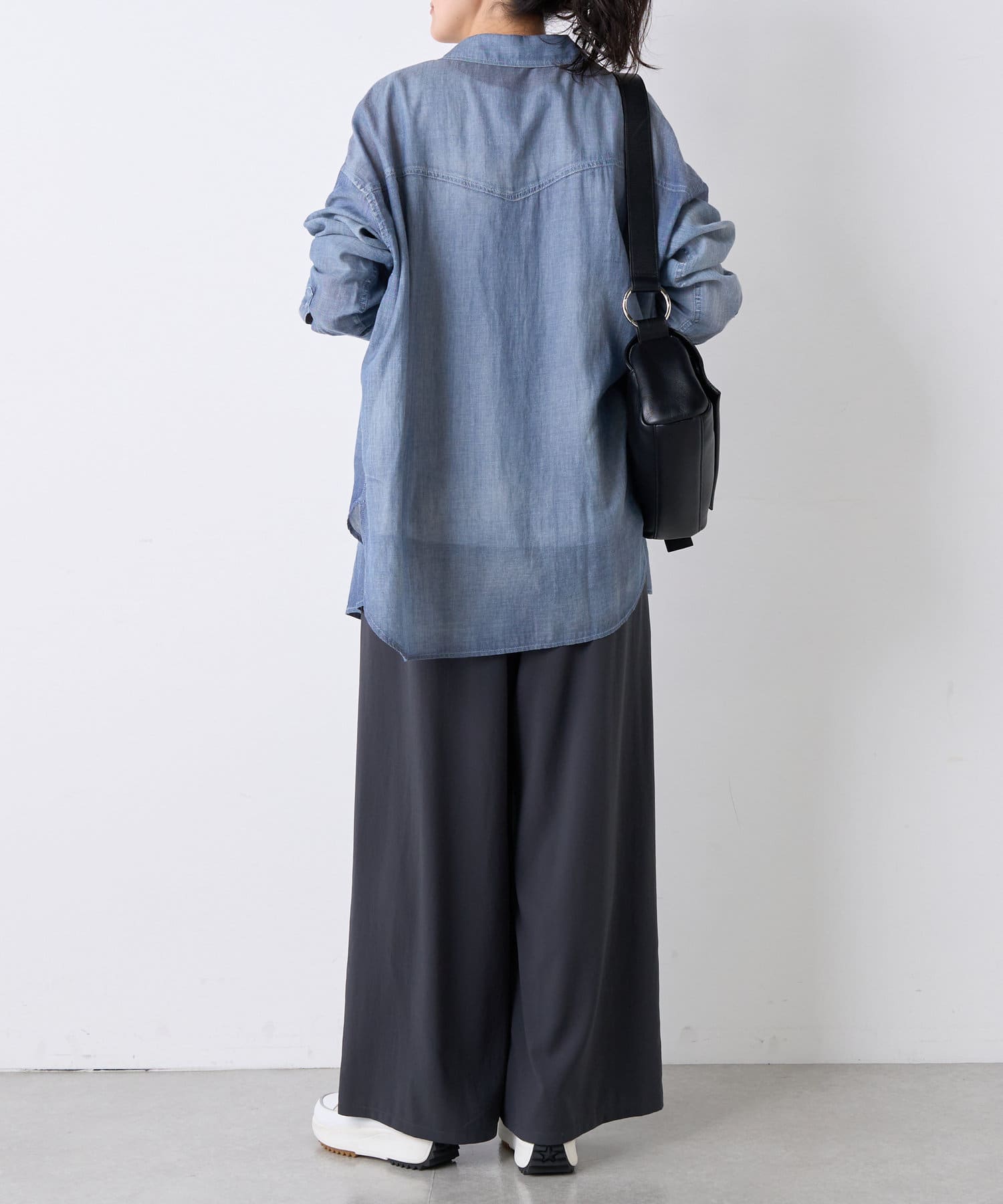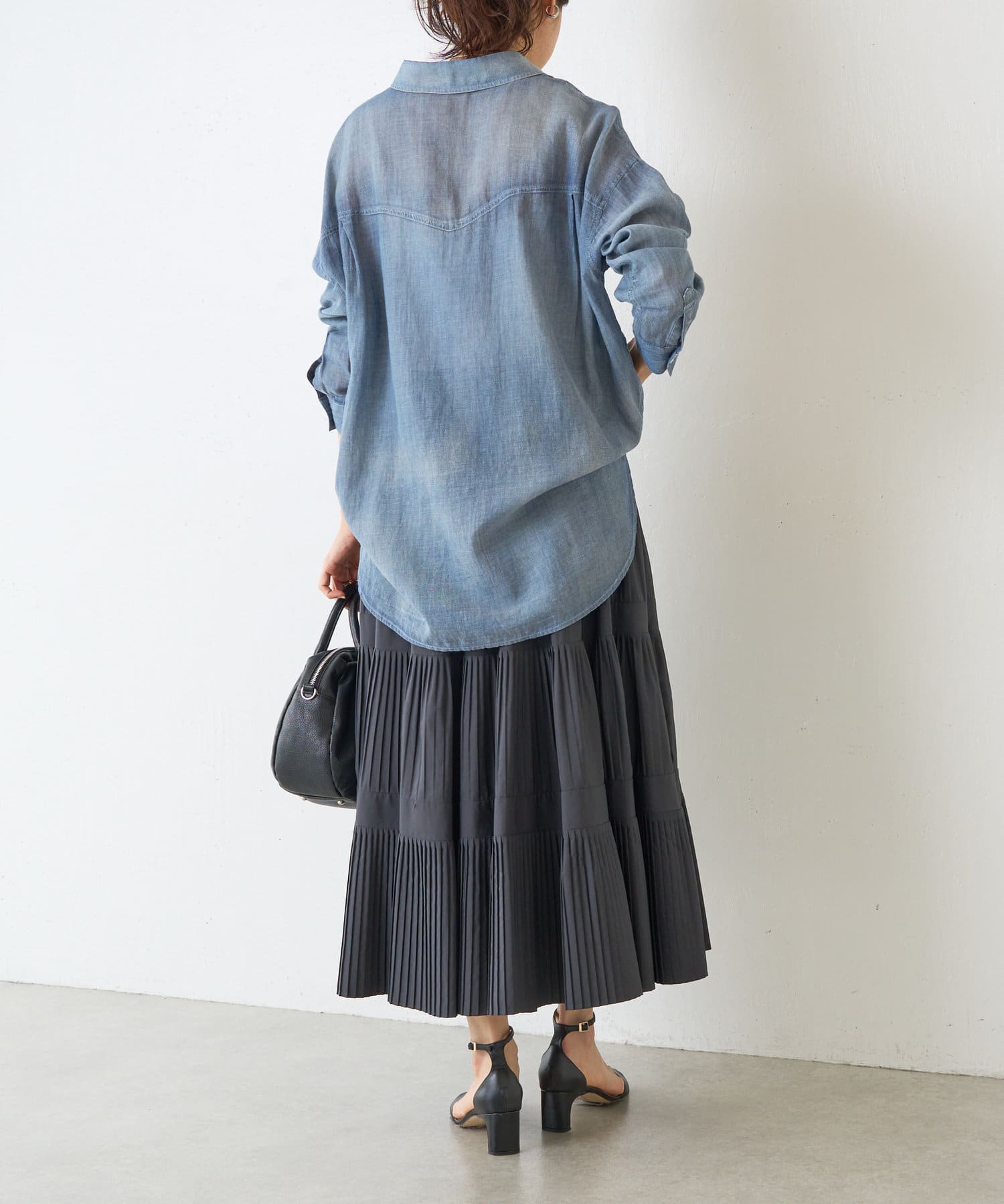 シフォンのようにシアー感のある柔らかいデニム素材を使用したシャツ。