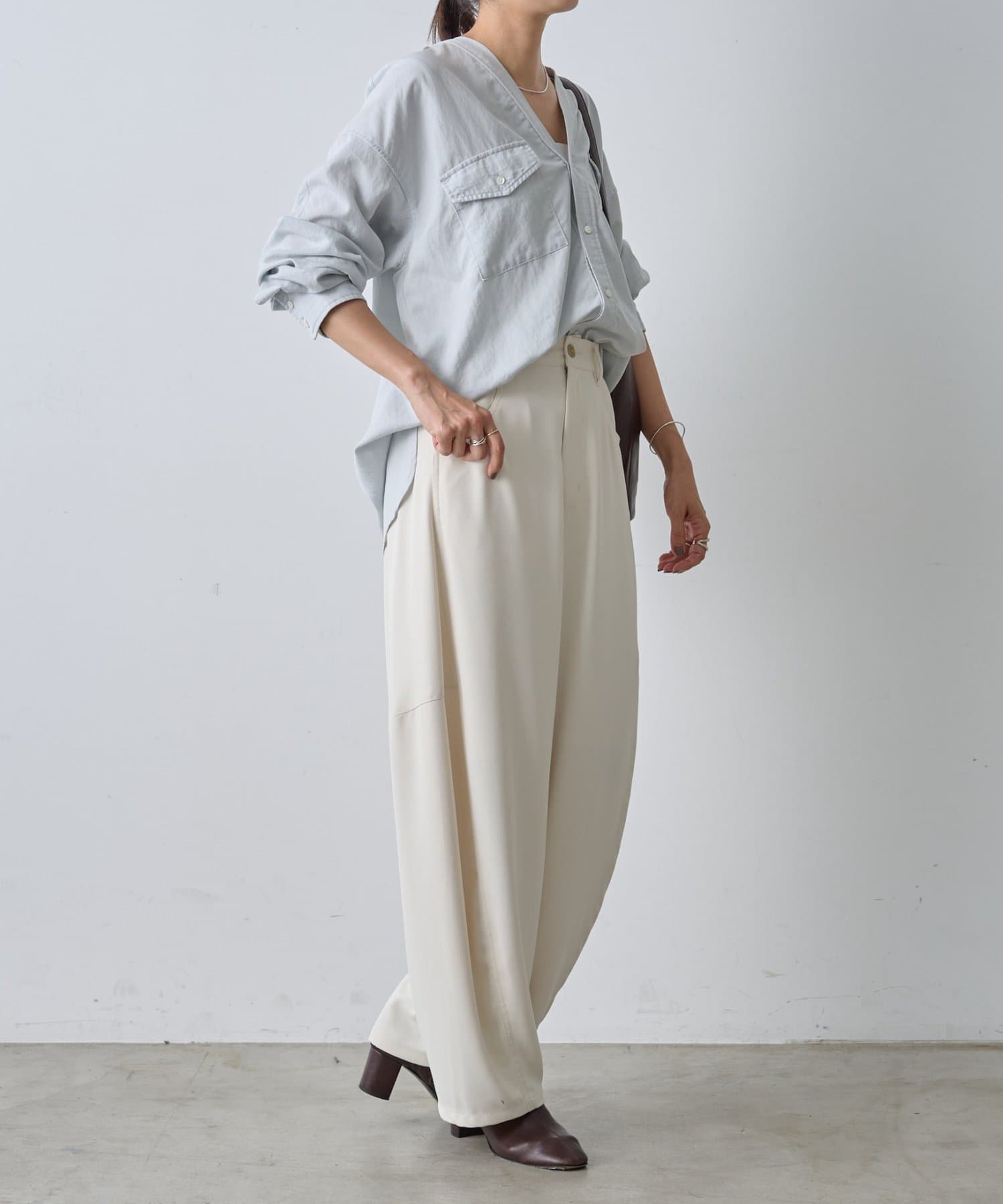ほどよいルーズ感と抜け感のあるVネックが、お顔回りをすっきり見せてくれるので、全体バランスがとりやすく◎。
