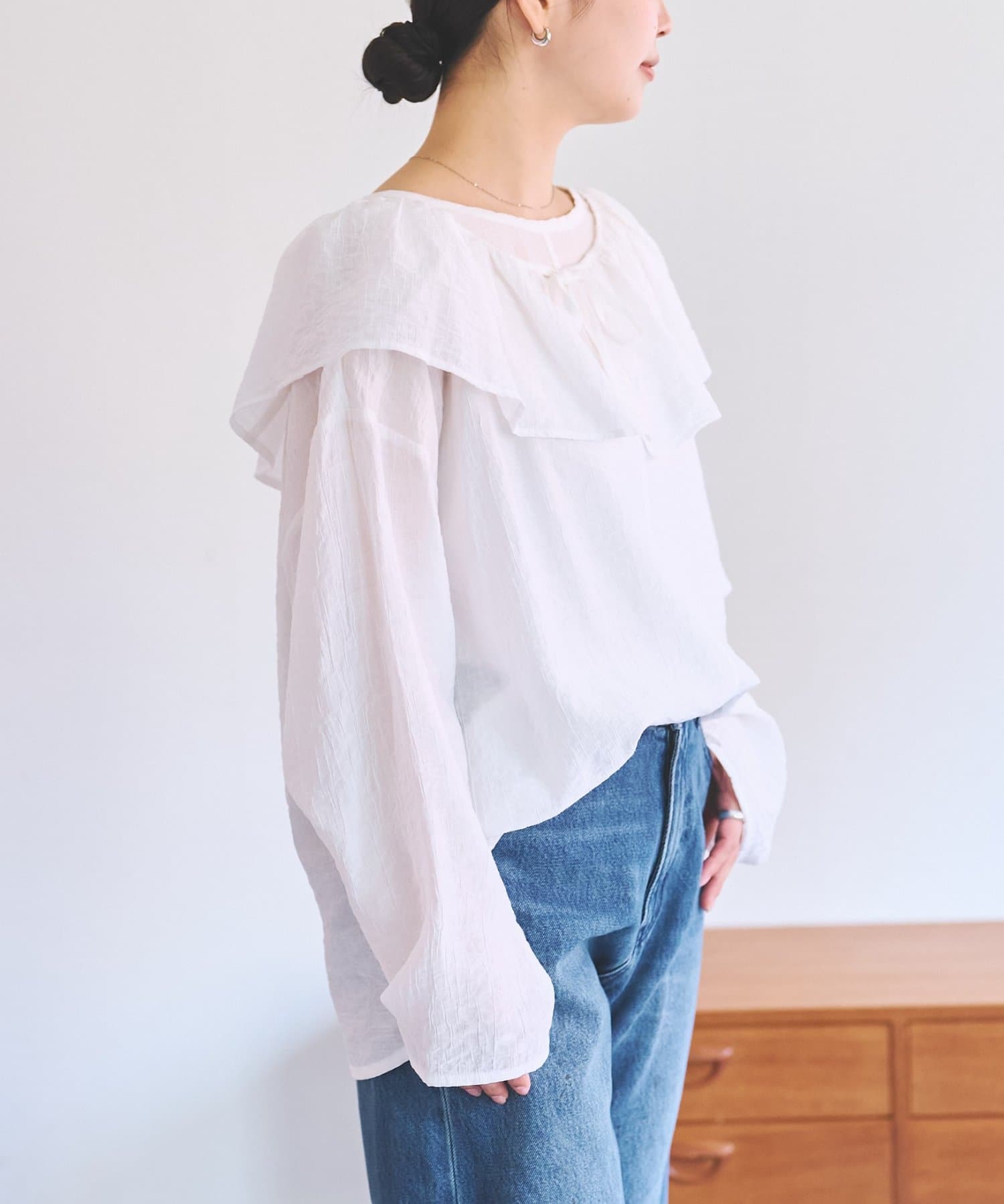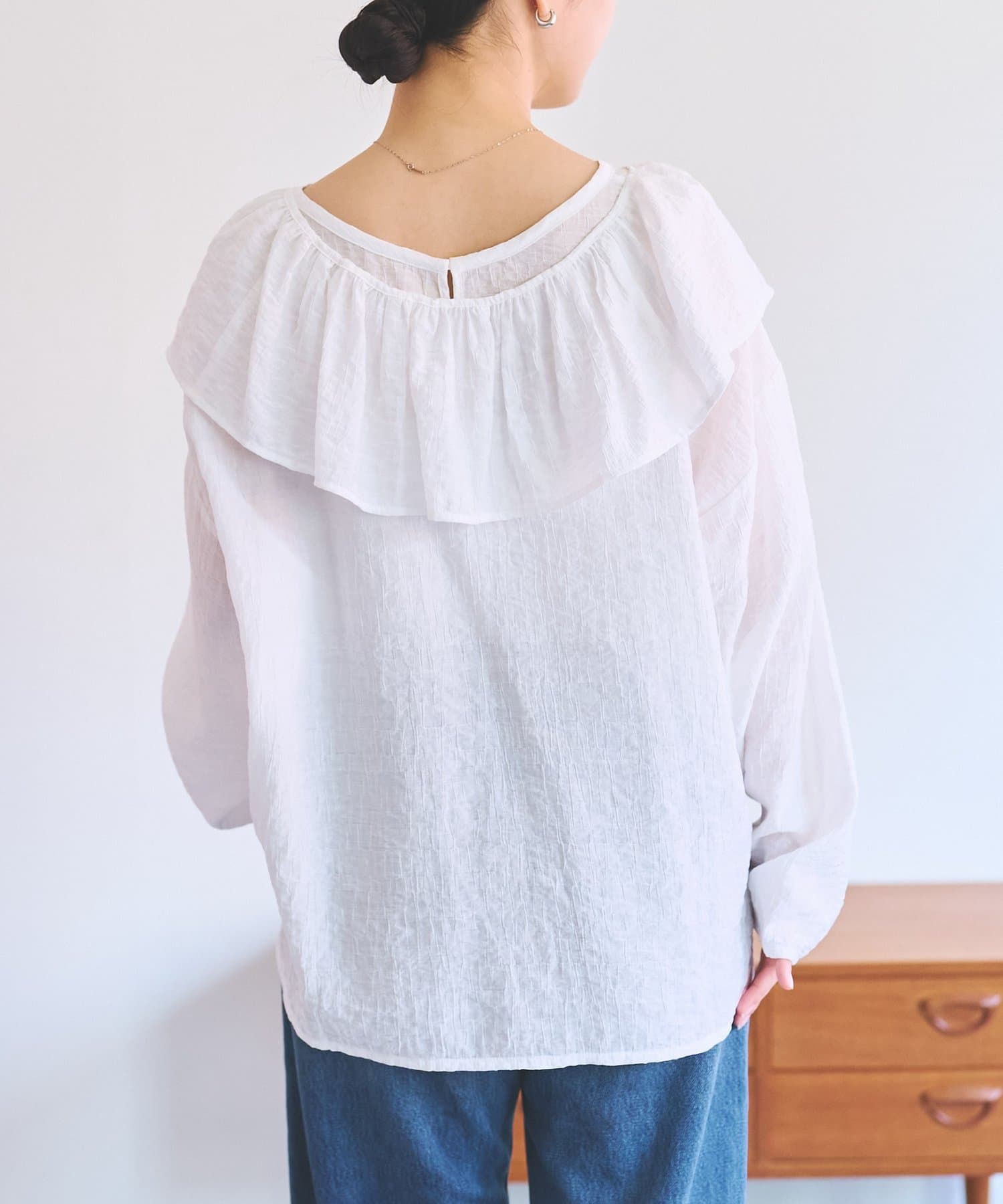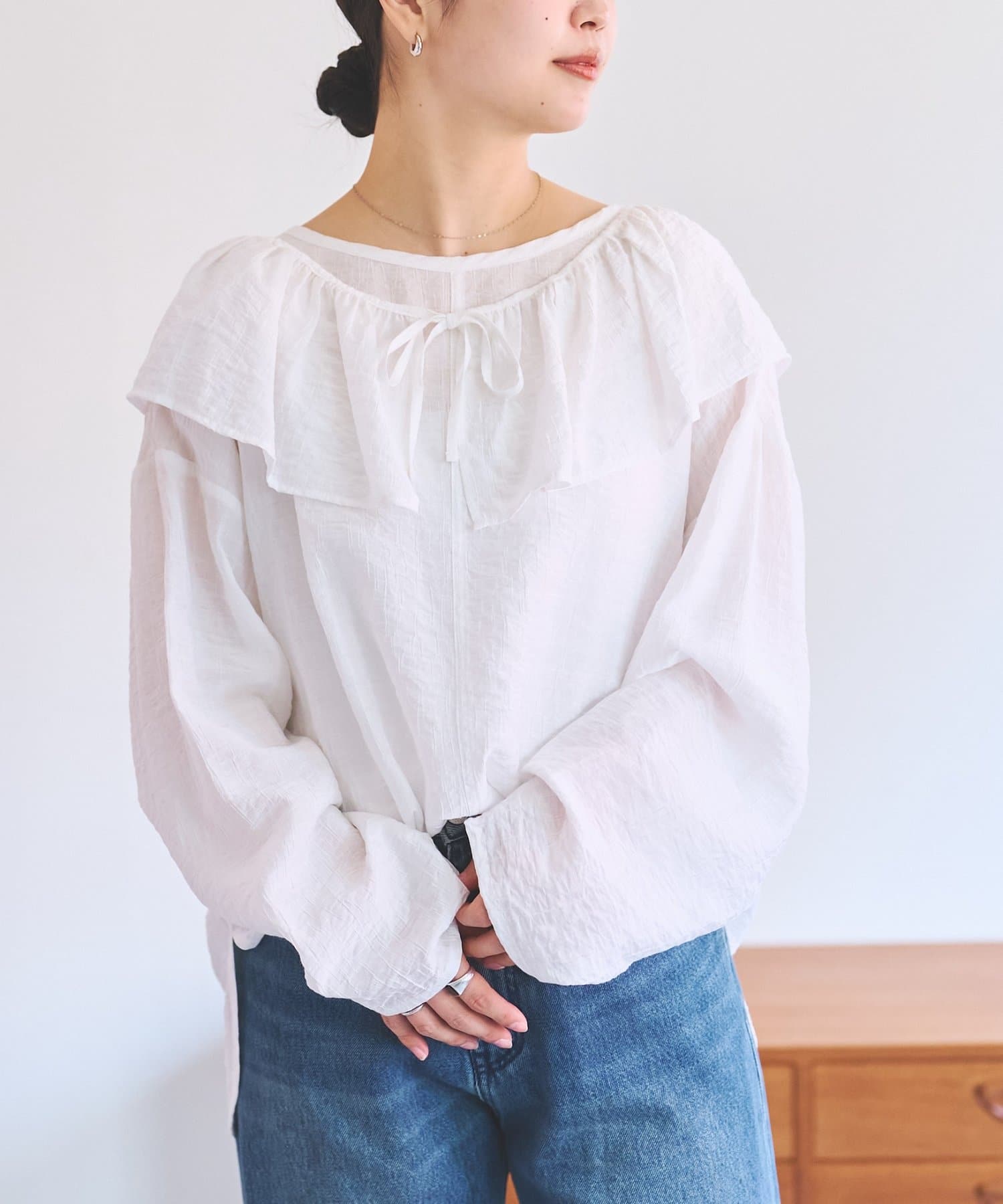 襟元のフリルは取り外し可能。フリルをジャケットに重ねたり、ブラウス一枚で着たりと別々で着るのもおすすめです。