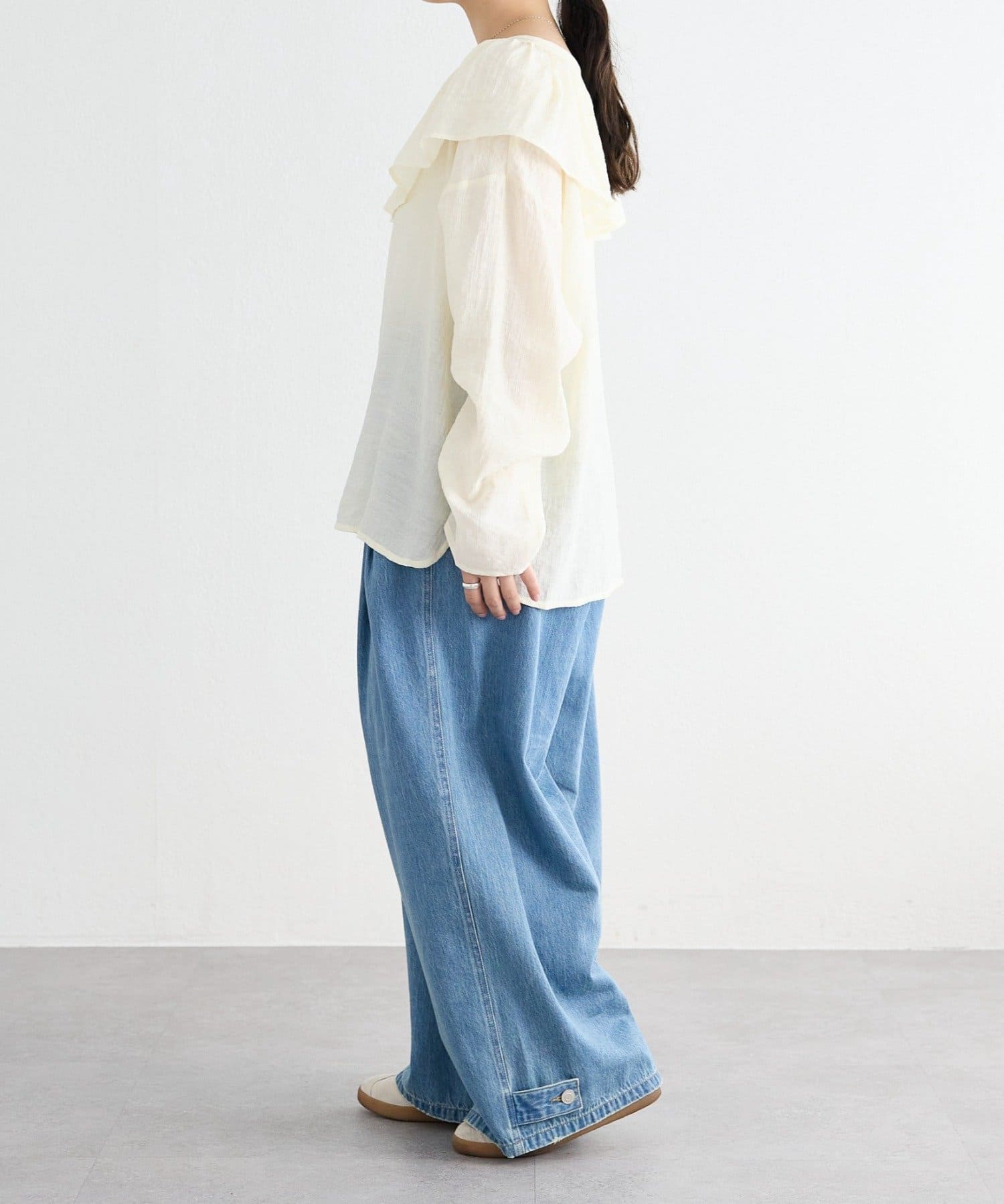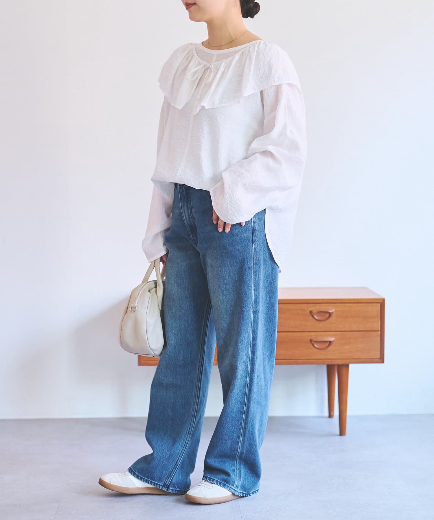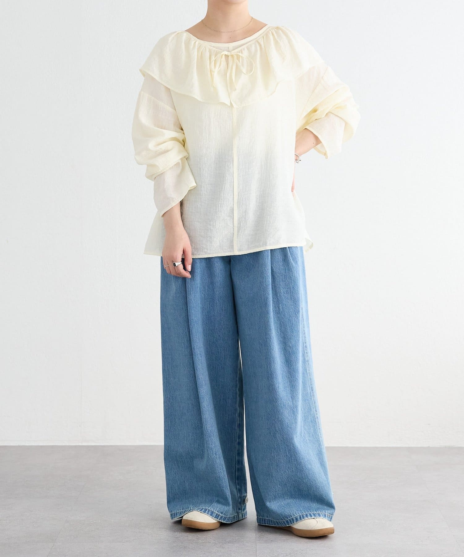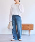 襟元のフリルは取り外し可能。フリルをジャケットに重ねたり、ブラウス一枚で着たりと別々で着るのもおすすめです。