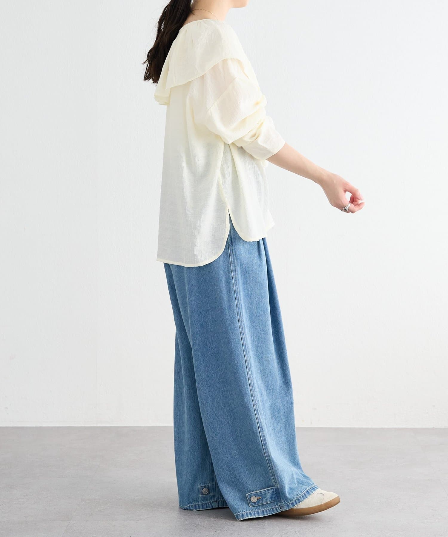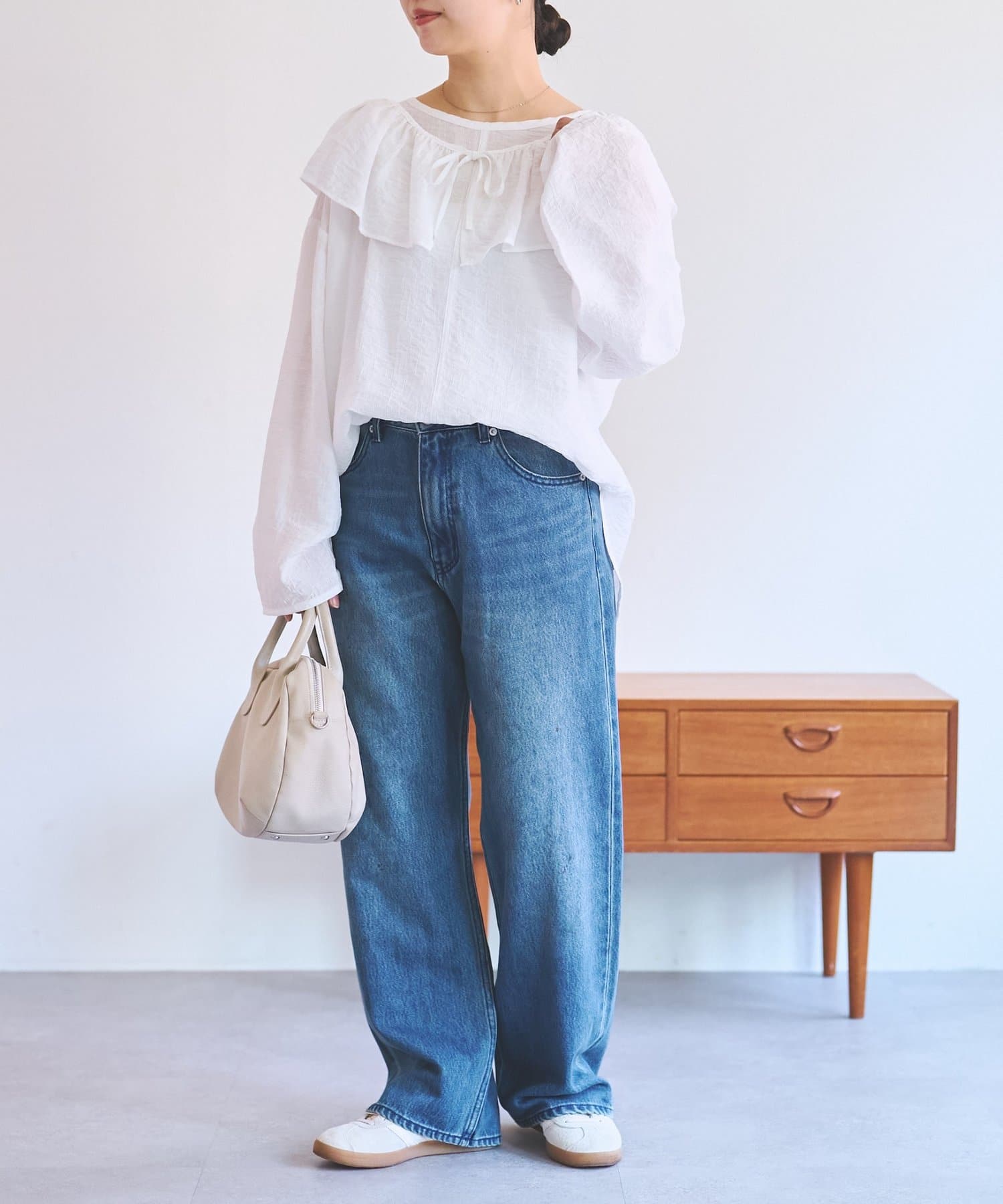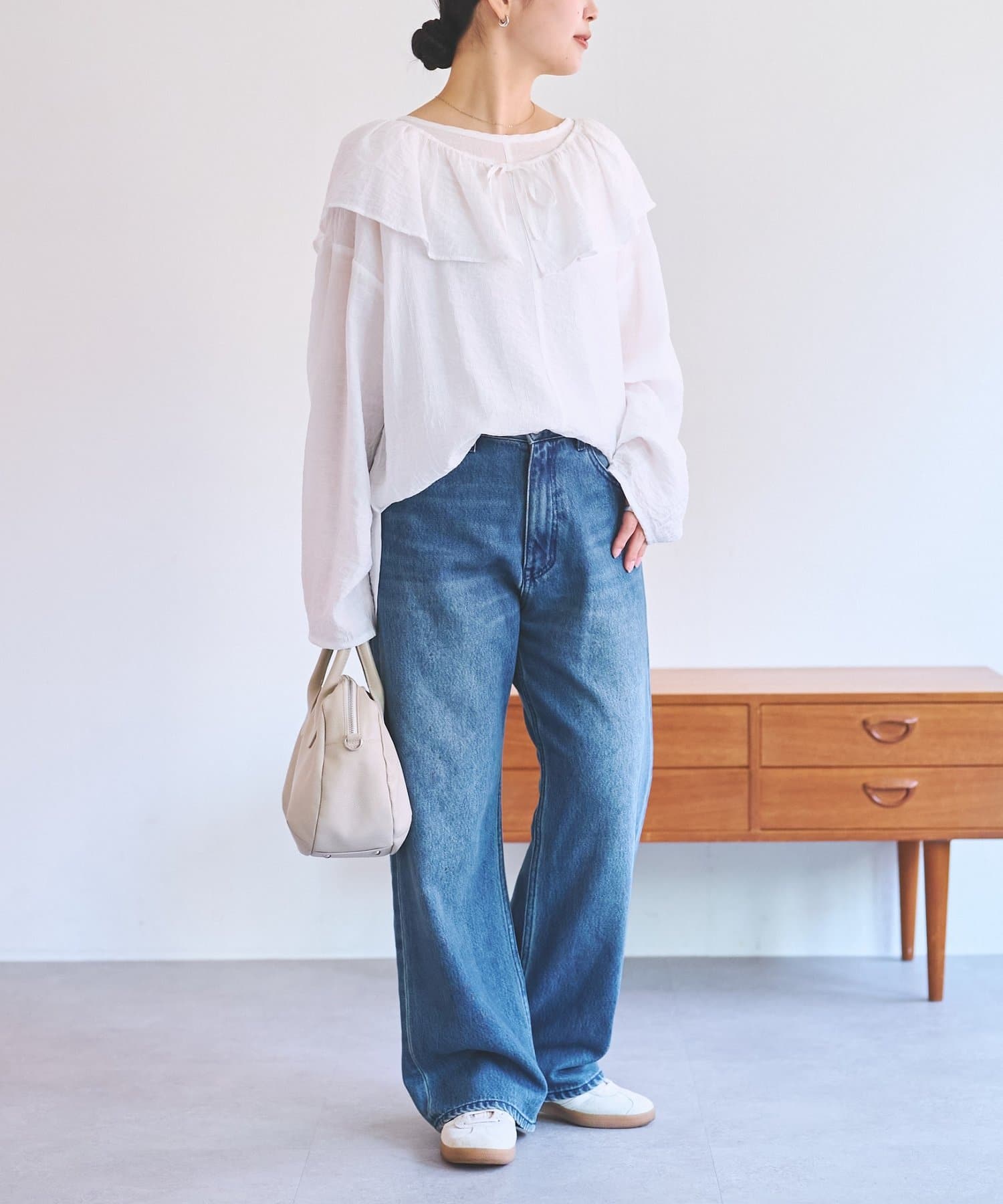 たっぷりとした身幅でリラックスして着られるサイズ感が甘さを抑えてくれます。