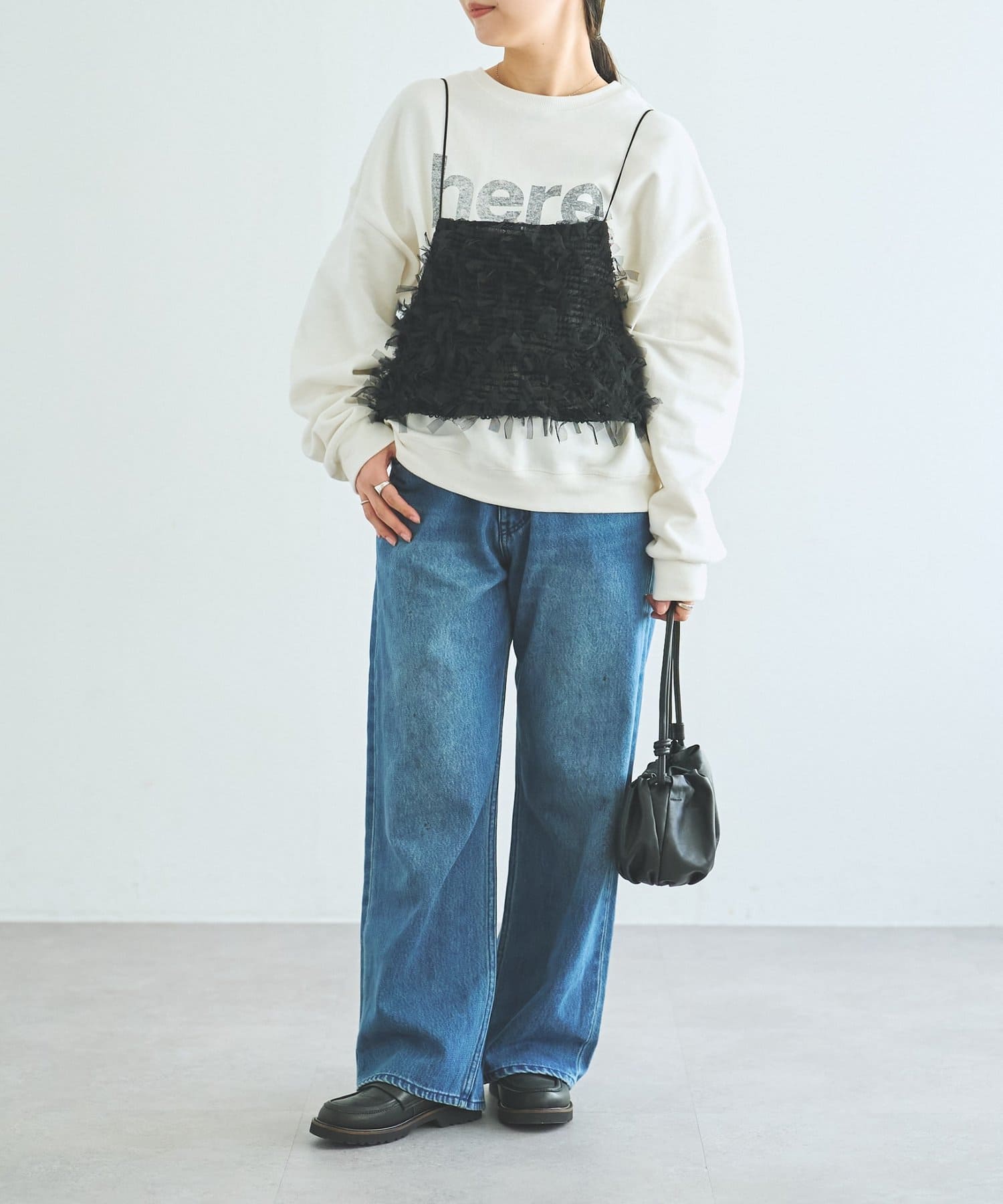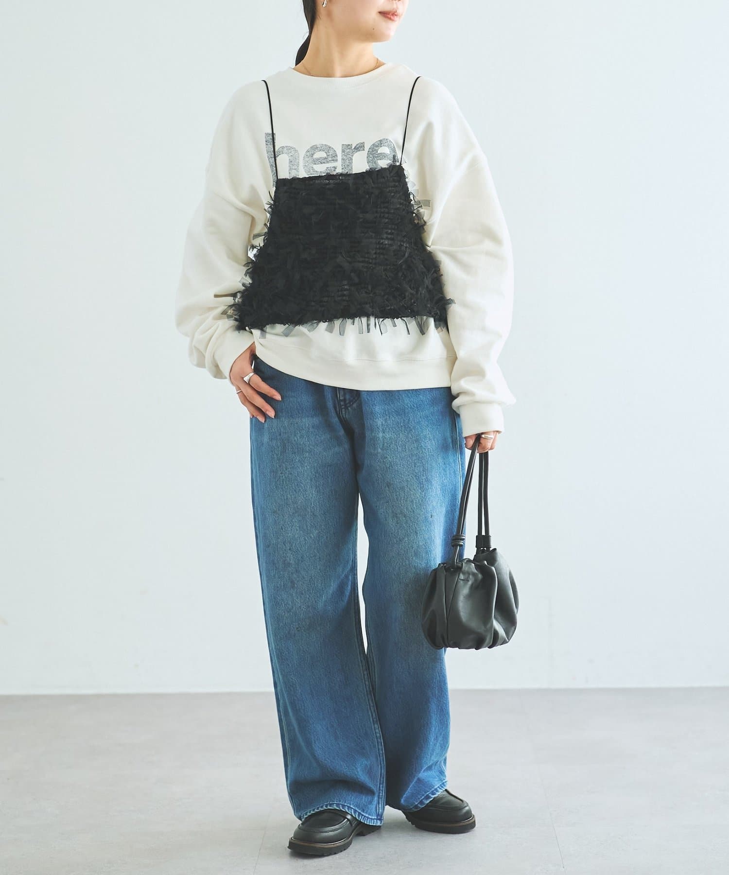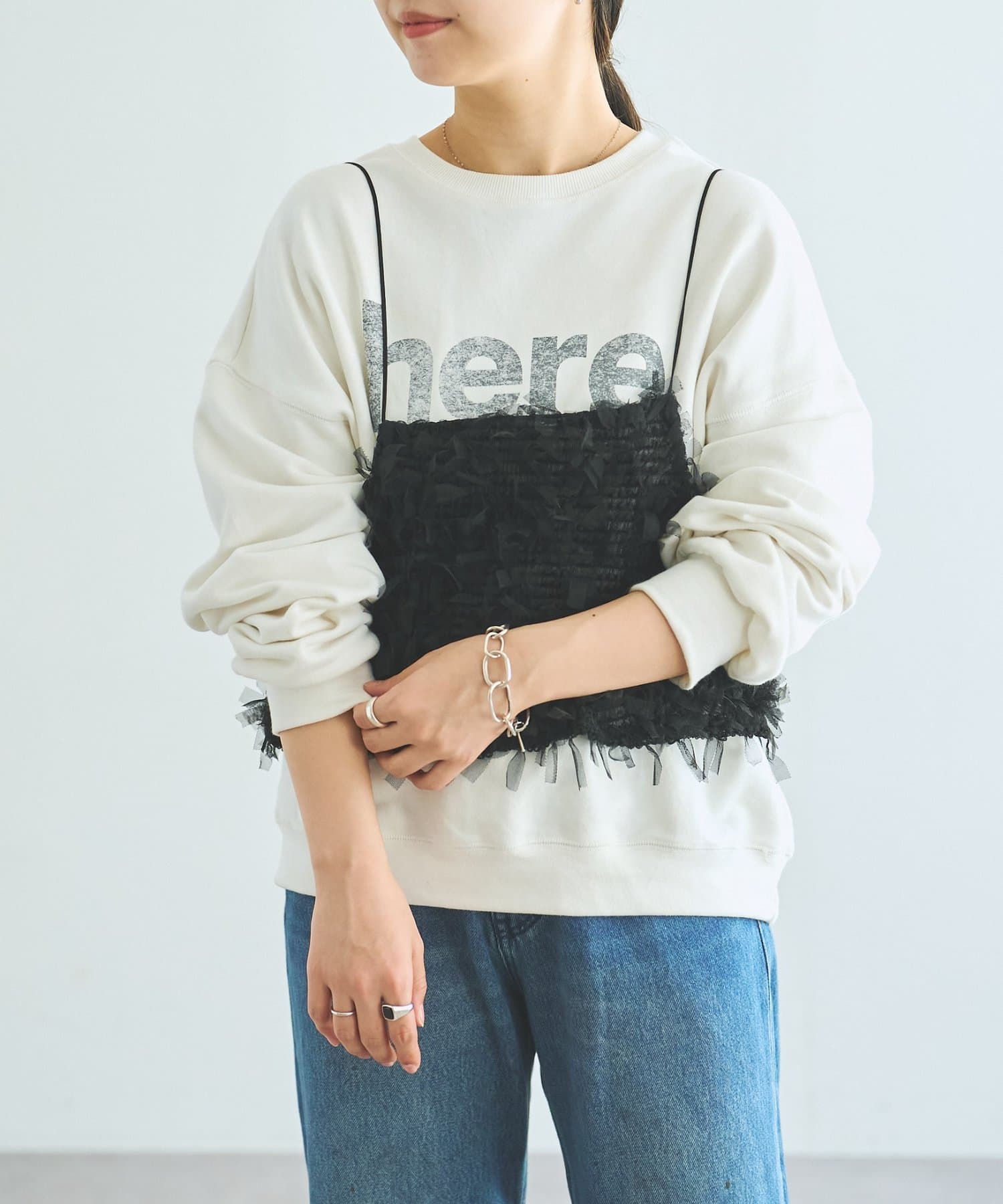 中央に「here...」のロゴを大胆にプリントしたスウェット。