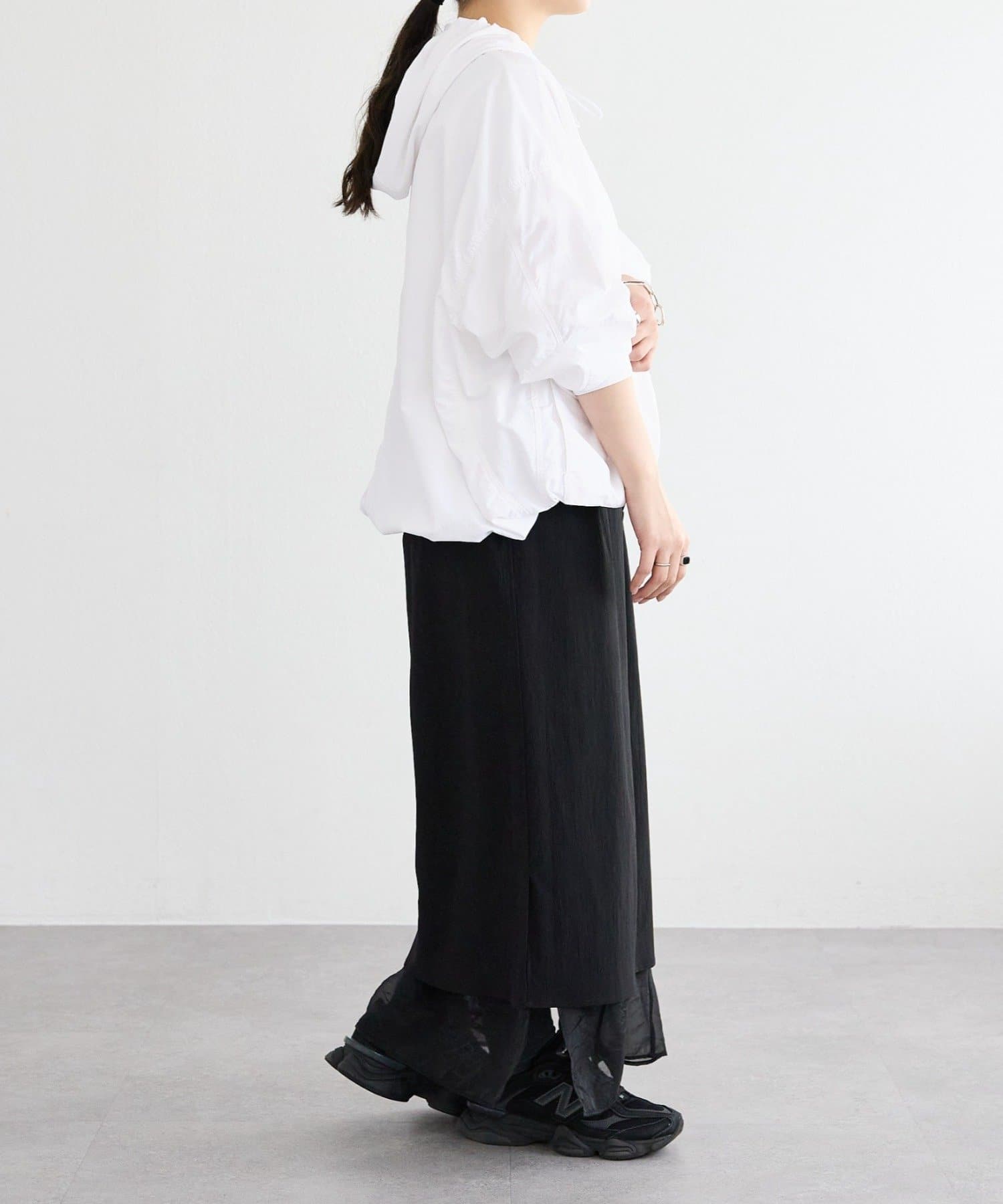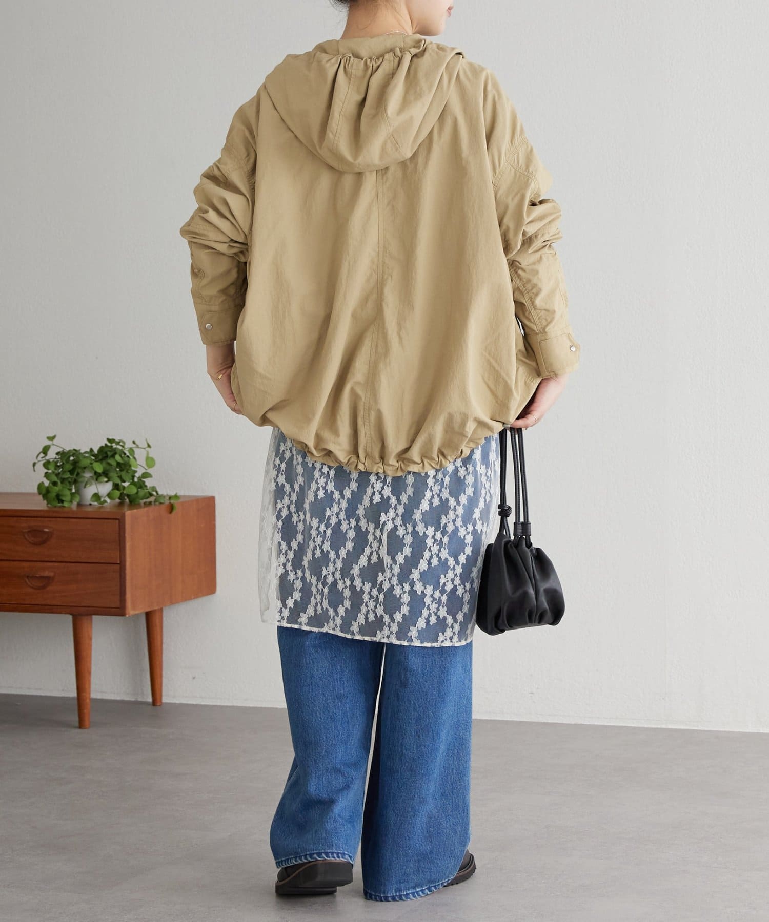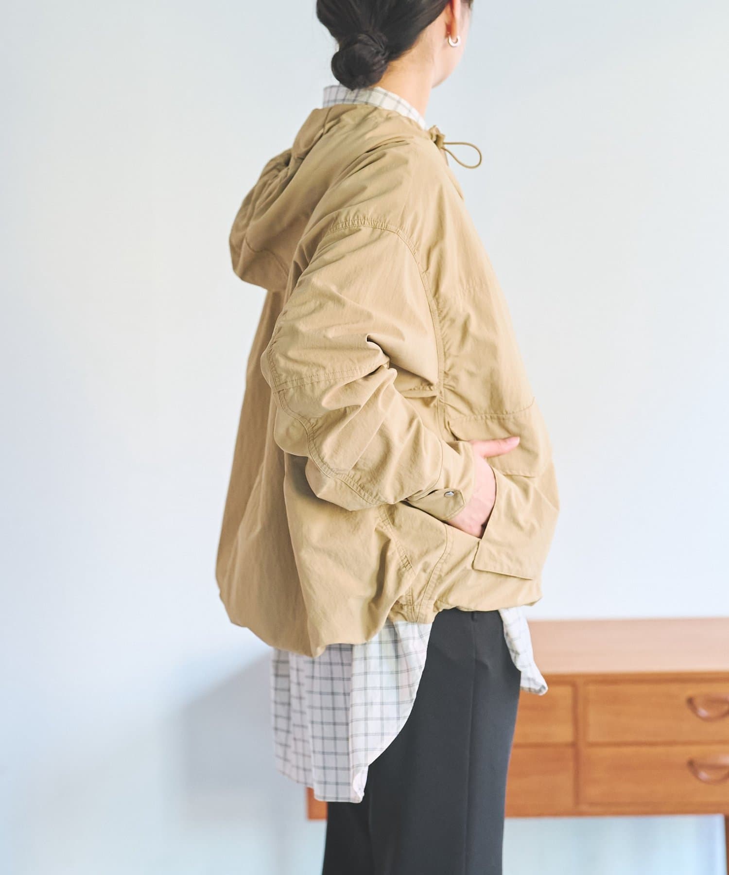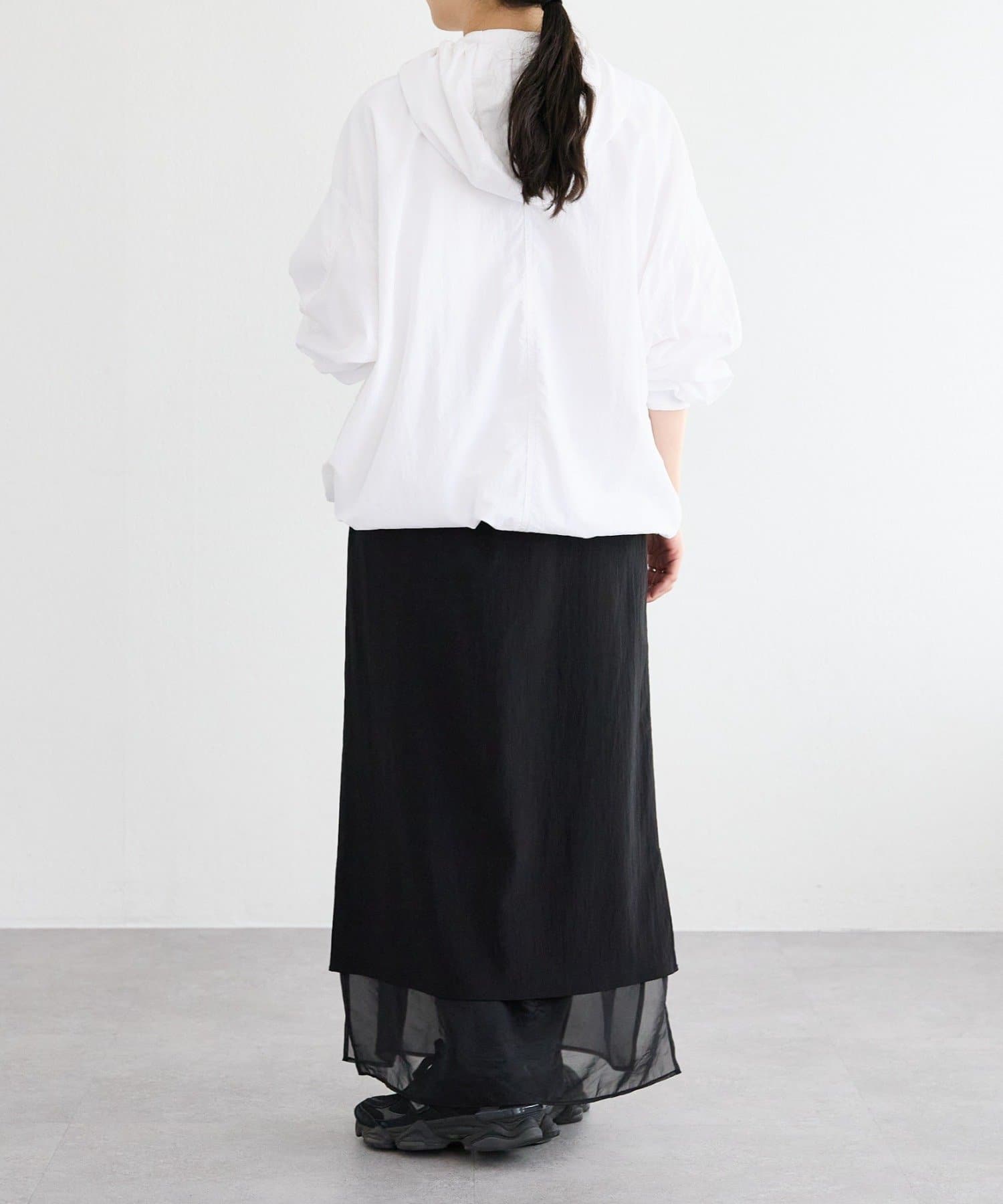 前後差のある着丈で後はお尻が隠れる長さ。裾のドロストコードでギャザーを寄せて短丈でも着ていただけます。