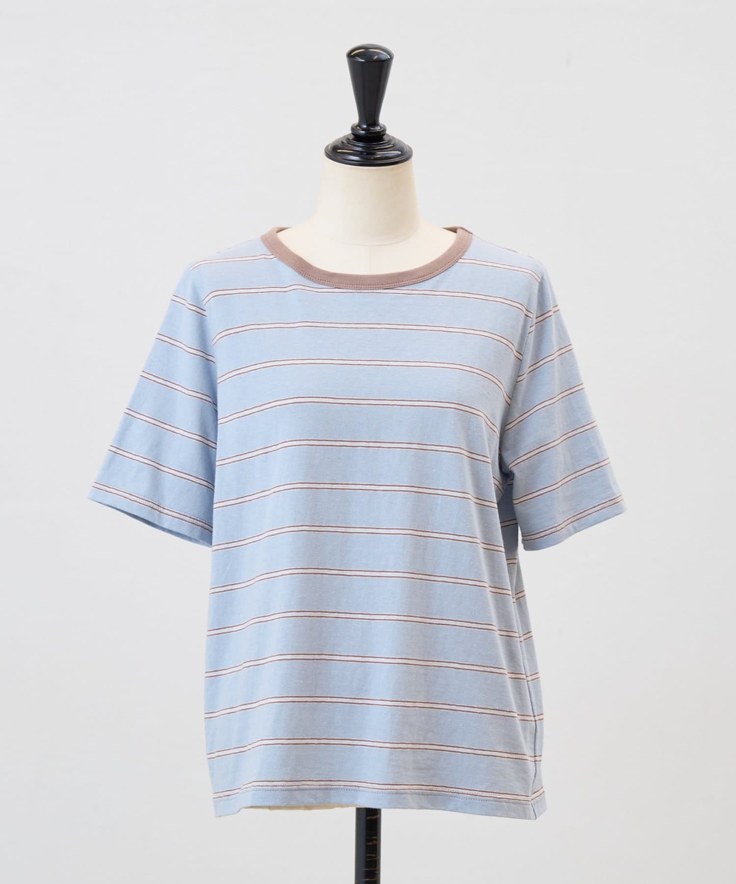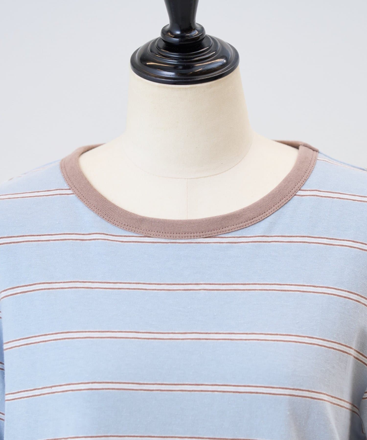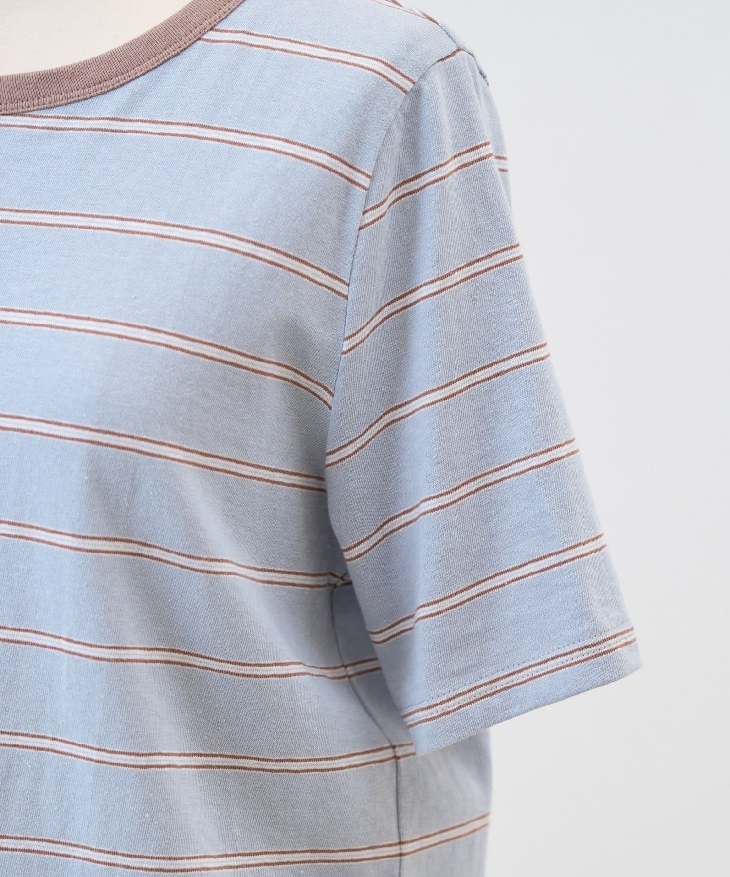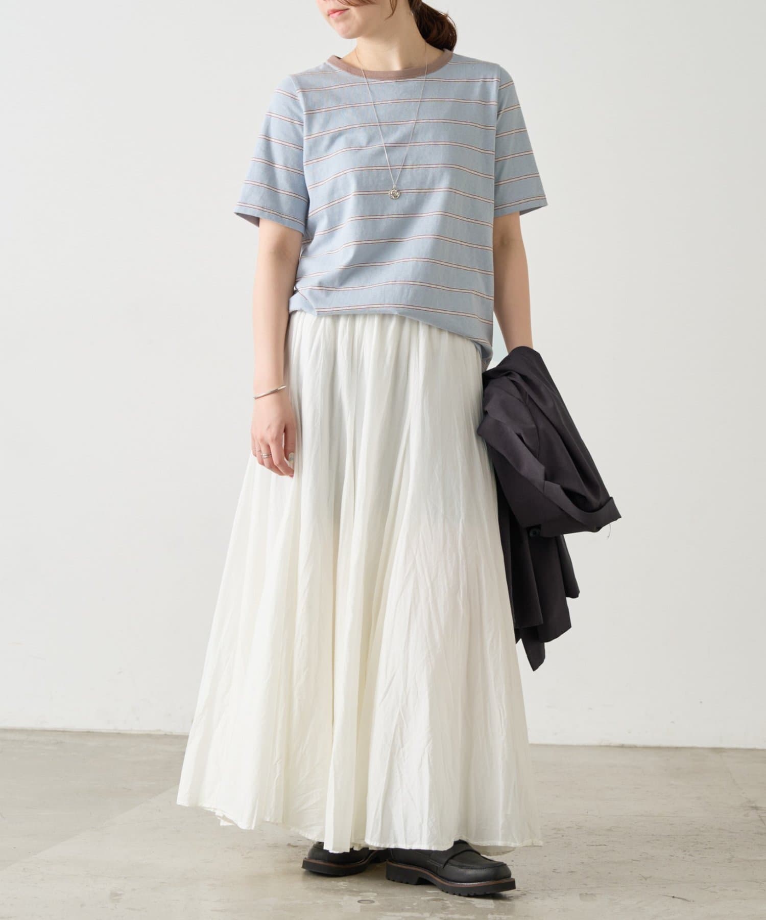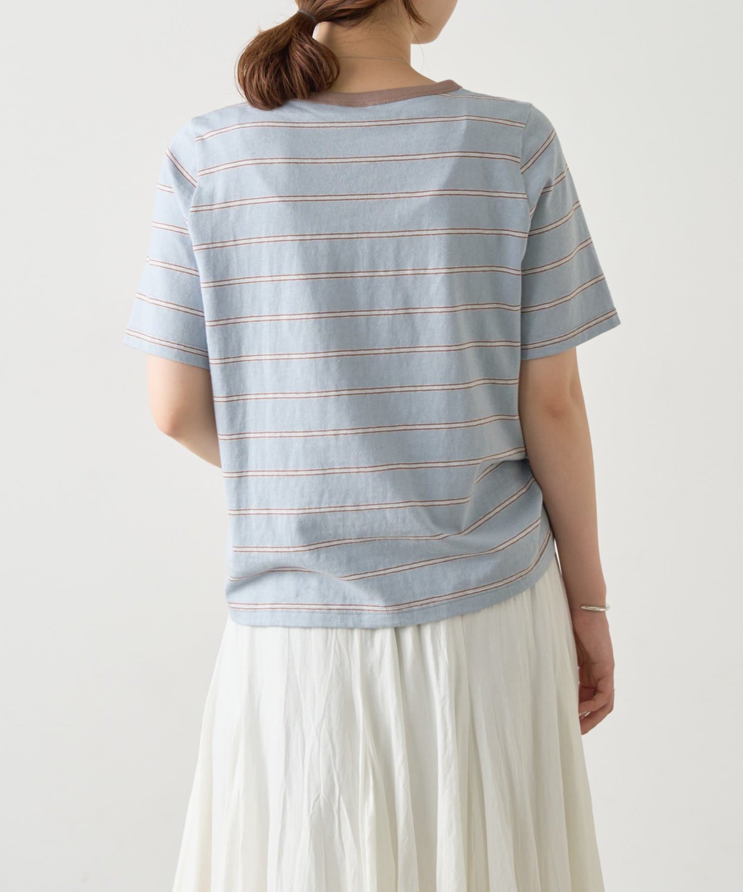 サックスブルーは、ブルーをベースに幅広のボーダーに細いラインを重ねたデザインで、やわらかな配色がスタイリングに奥行きをプラスします。