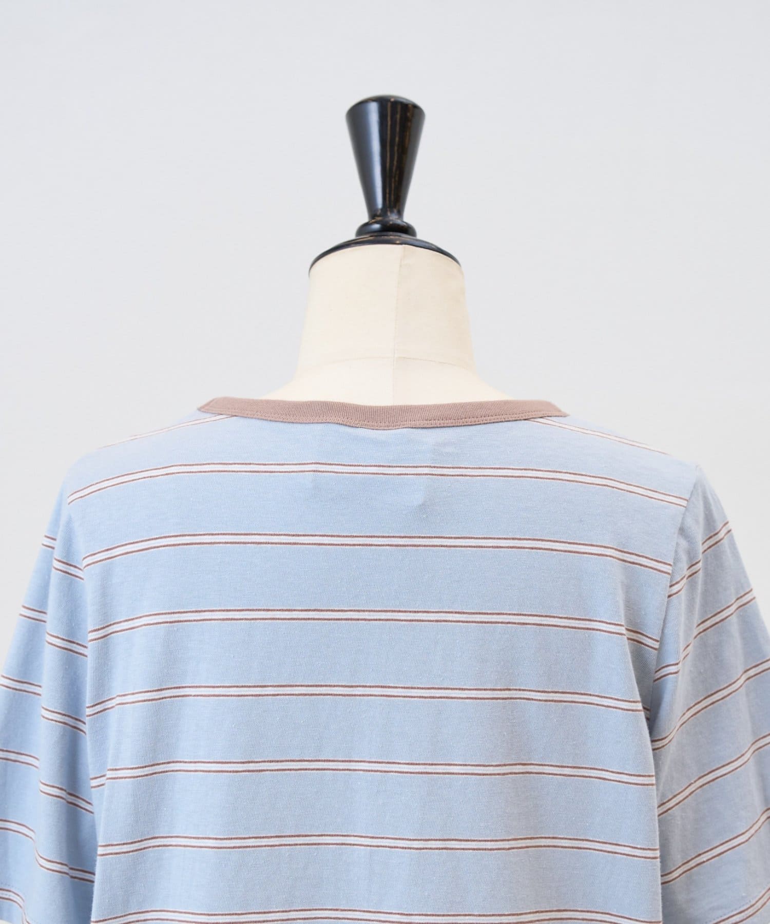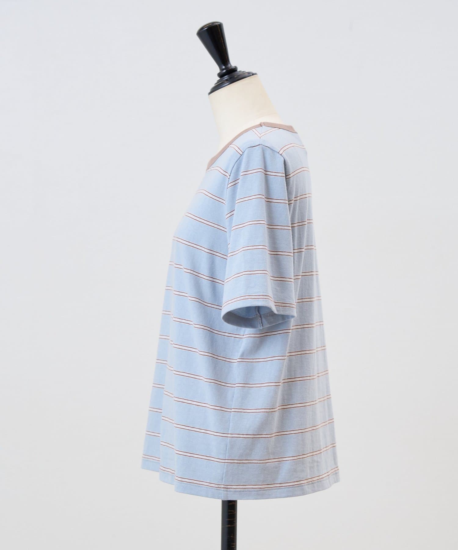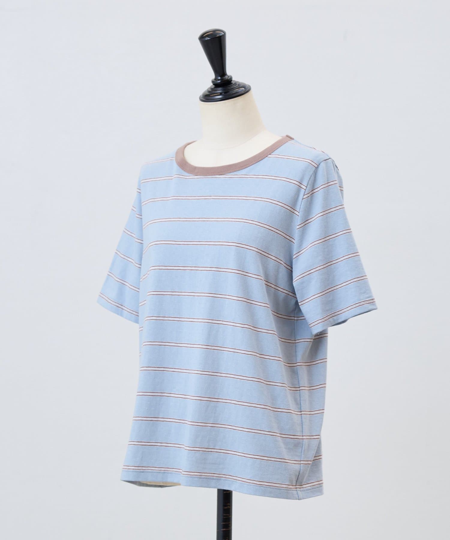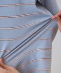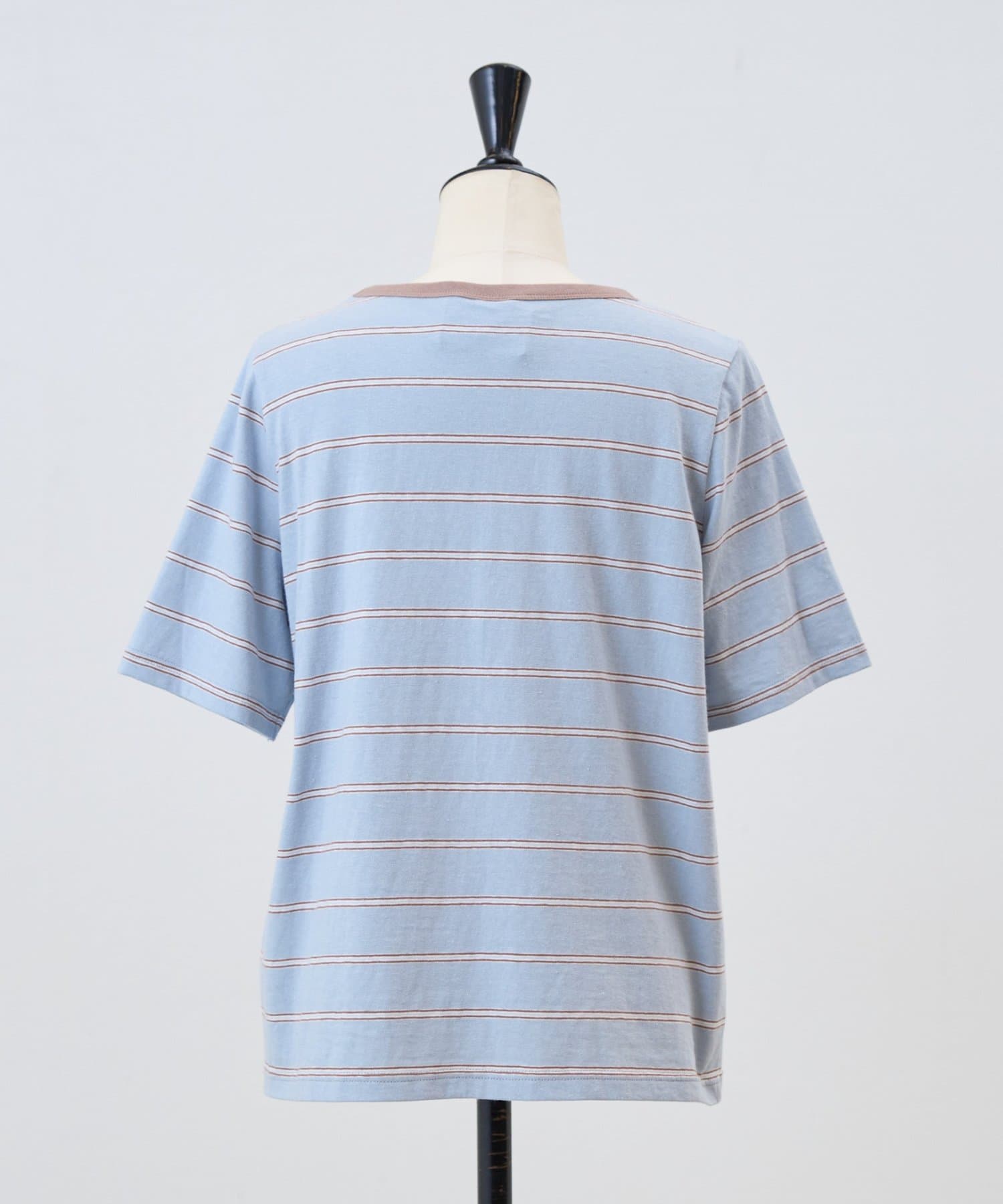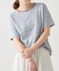 サックスブルーは、ブルーをベースに幅広のボーダーに細いラインを重ねたデザインで、やわらかな配色がスタイリングに奥行きをプラスします。