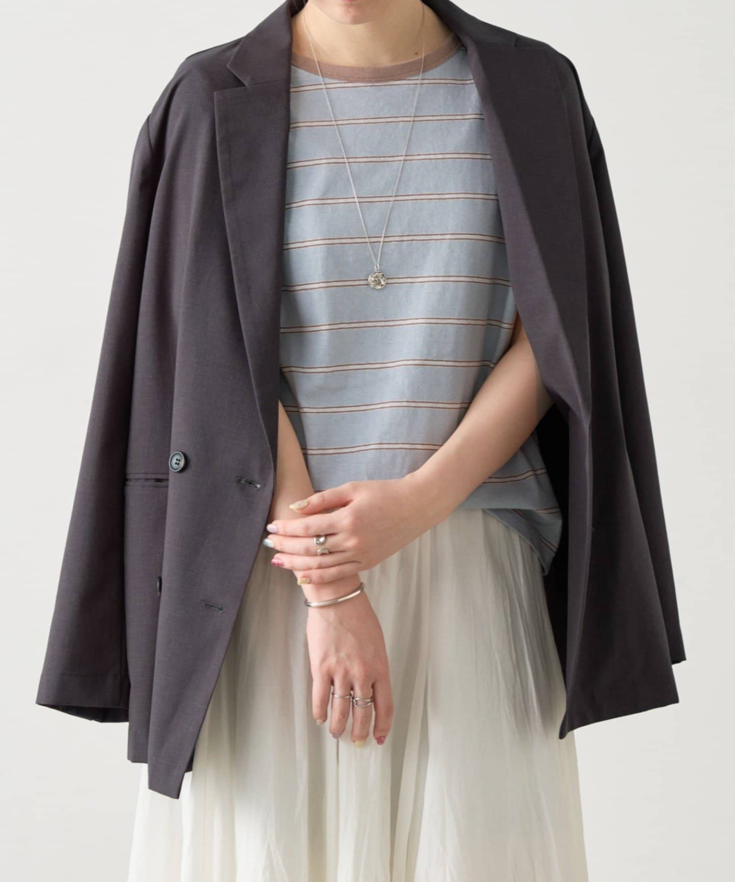 デニムやスカートと合わせるだけで、ナチュラルな大人のカジュアルスタイルに。