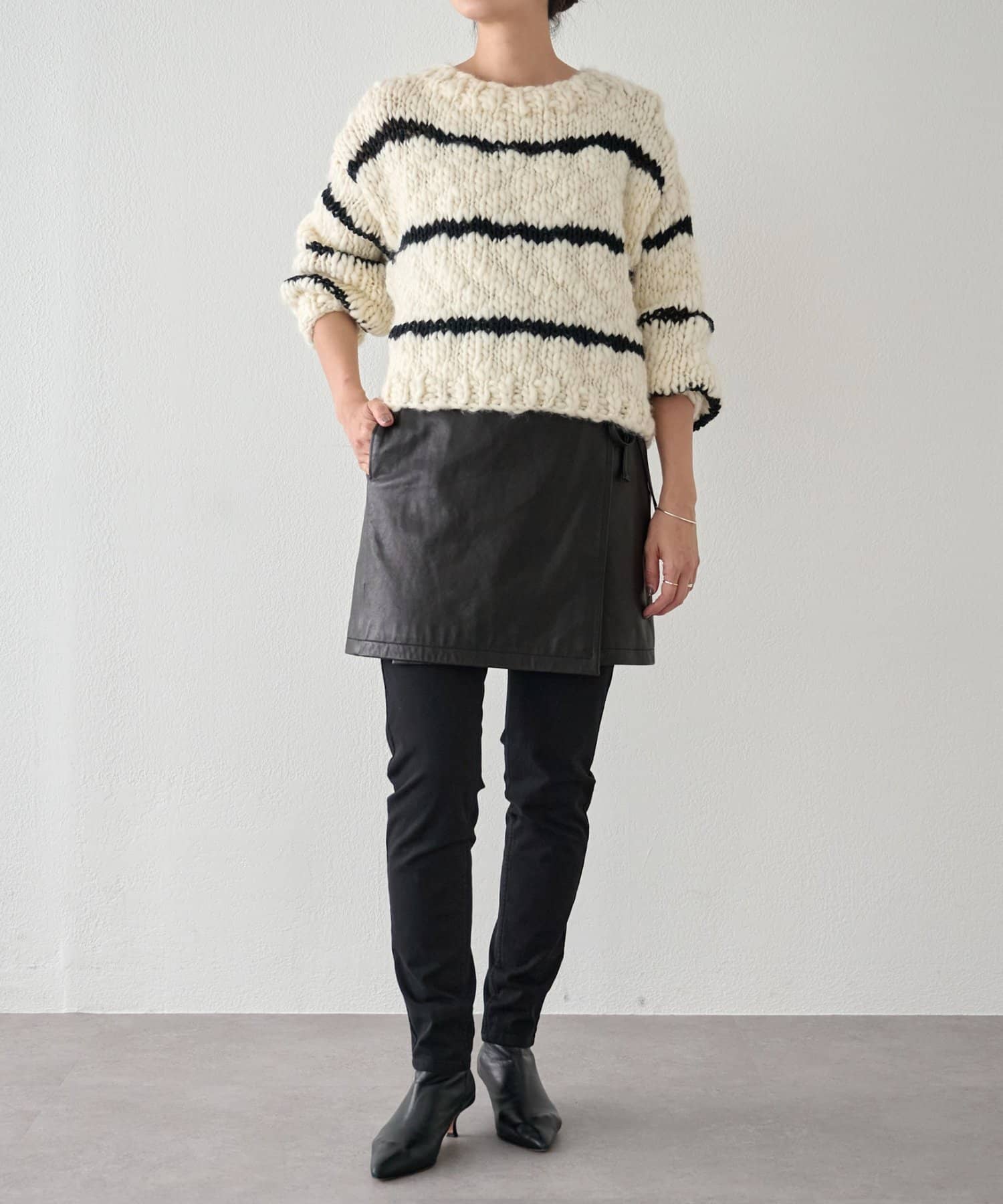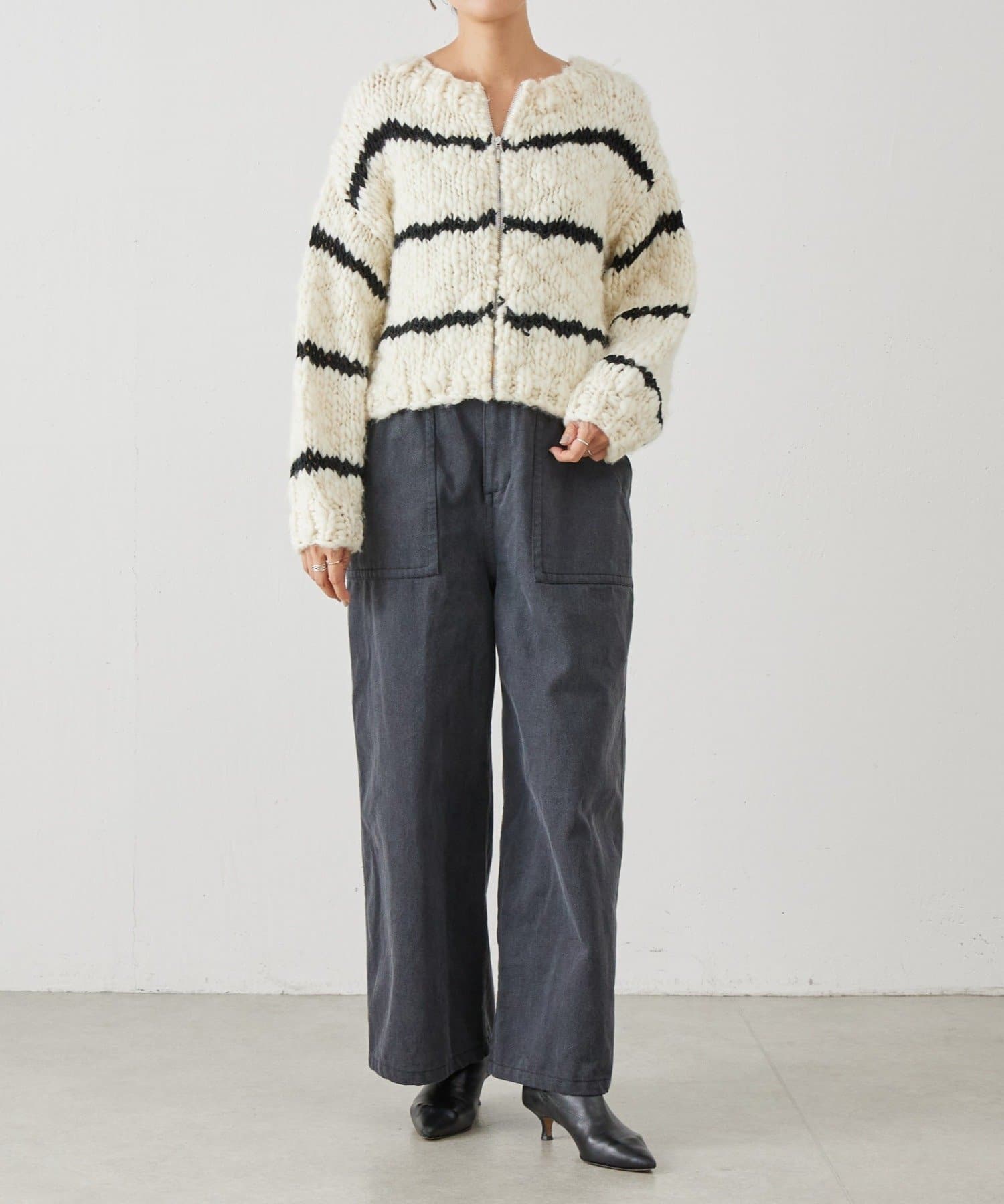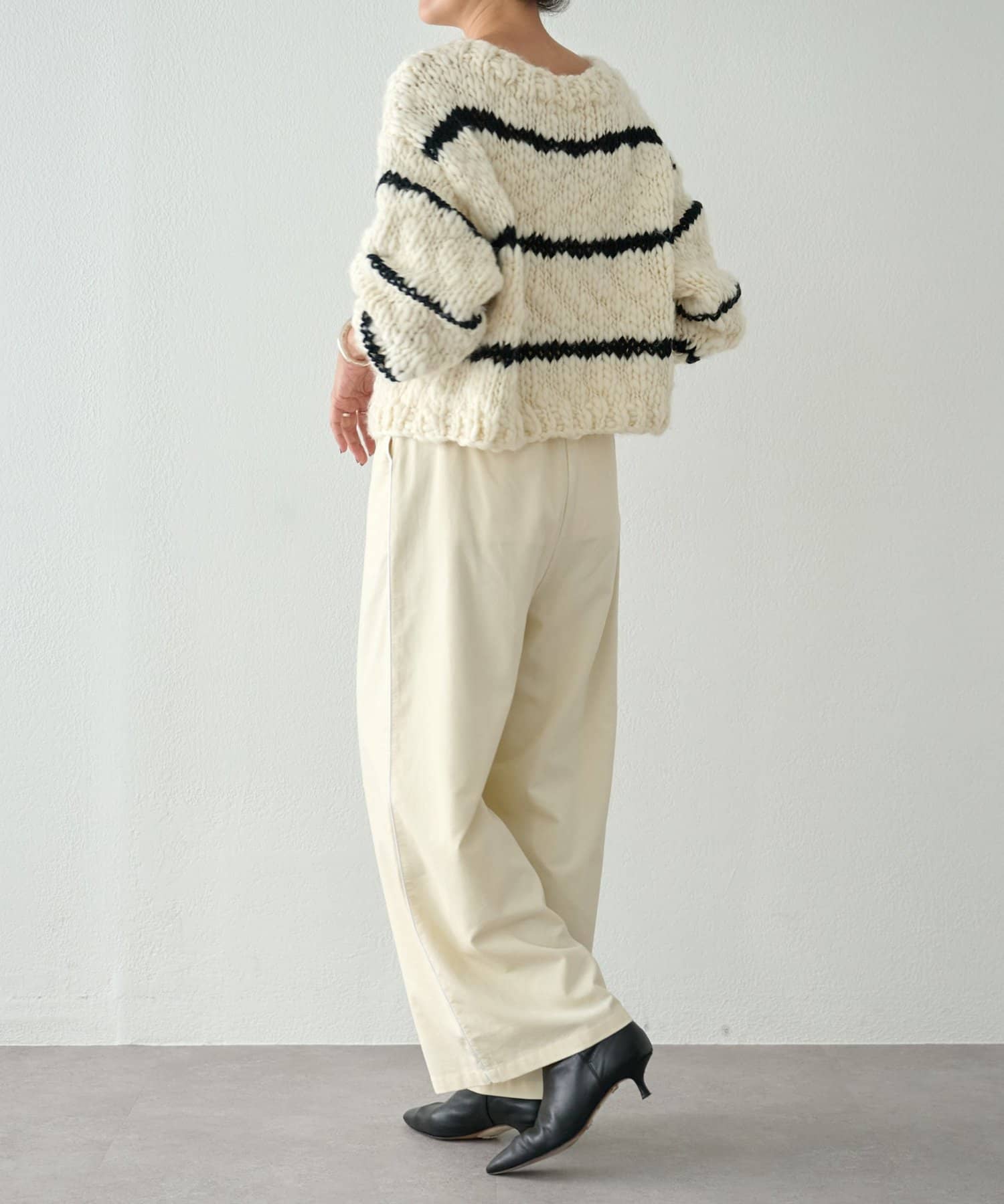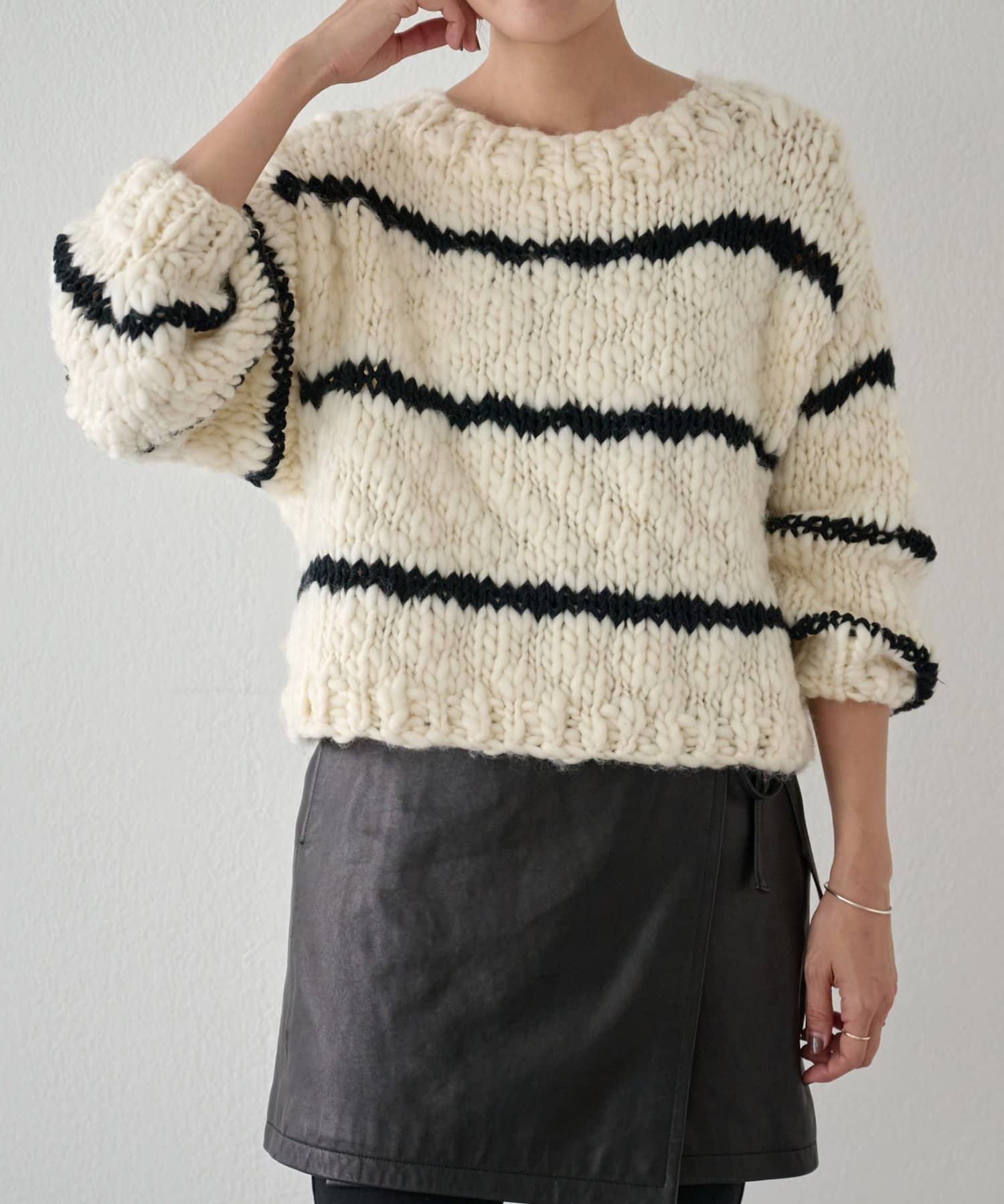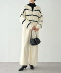 ほっこりしがちなざっくりニットも、オフホワイトにブラックのボーダーが入ることで甘くなりすぎず、こなれ感を演出。