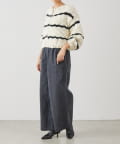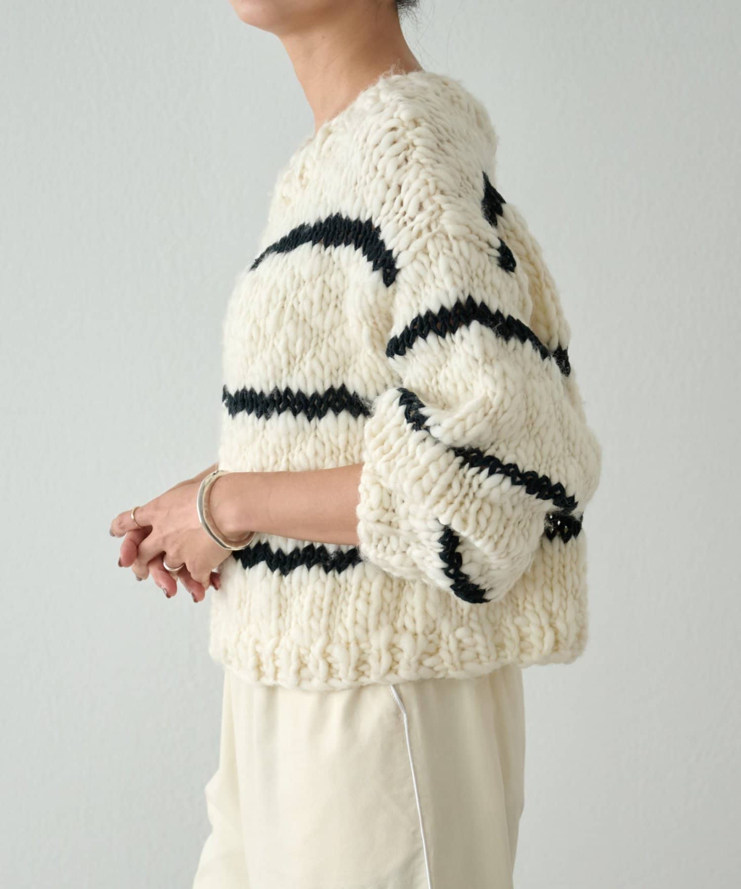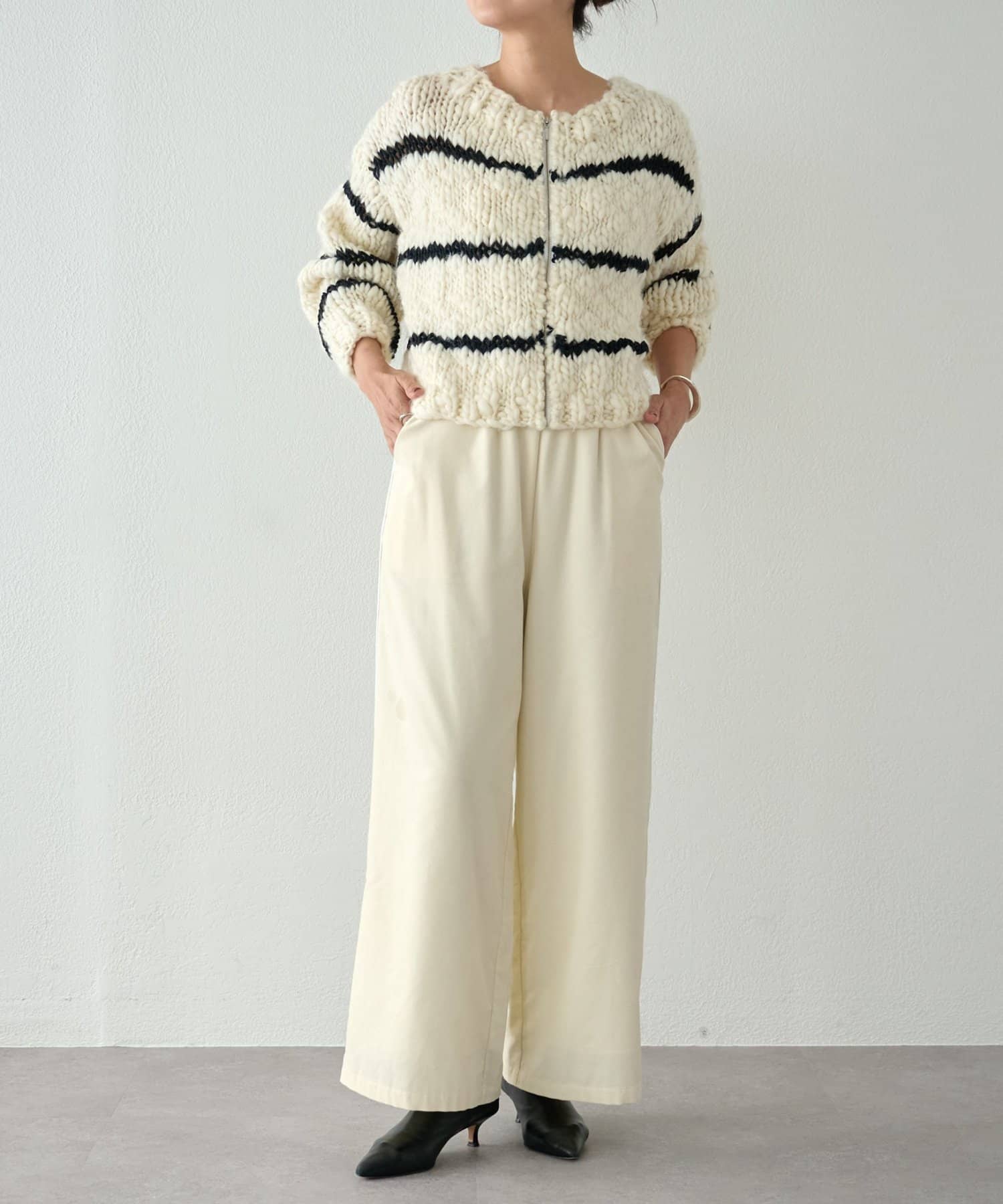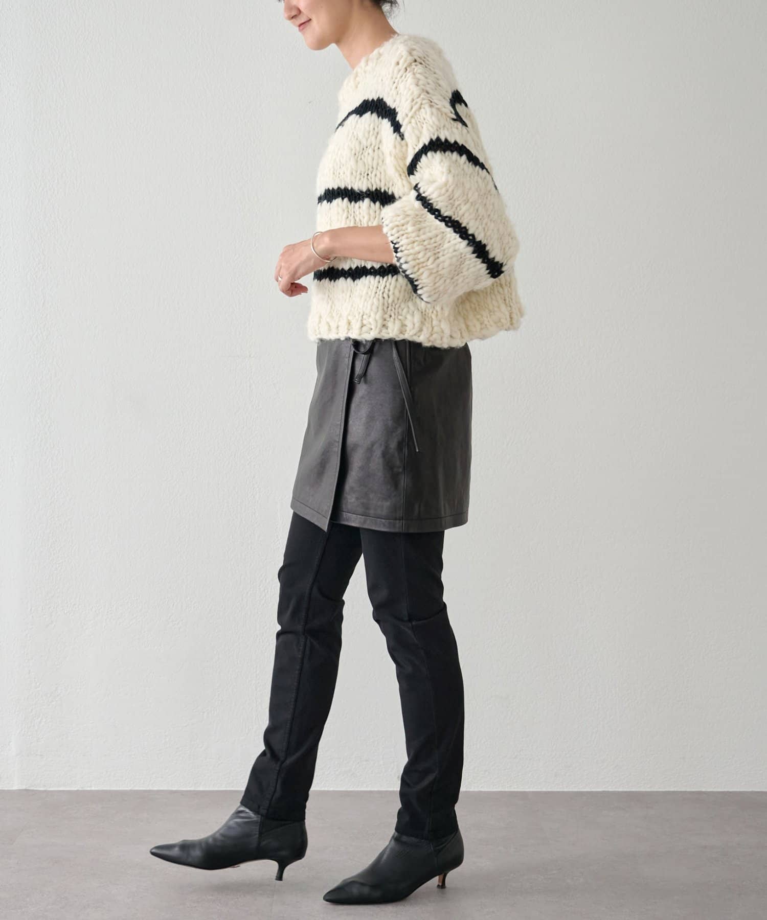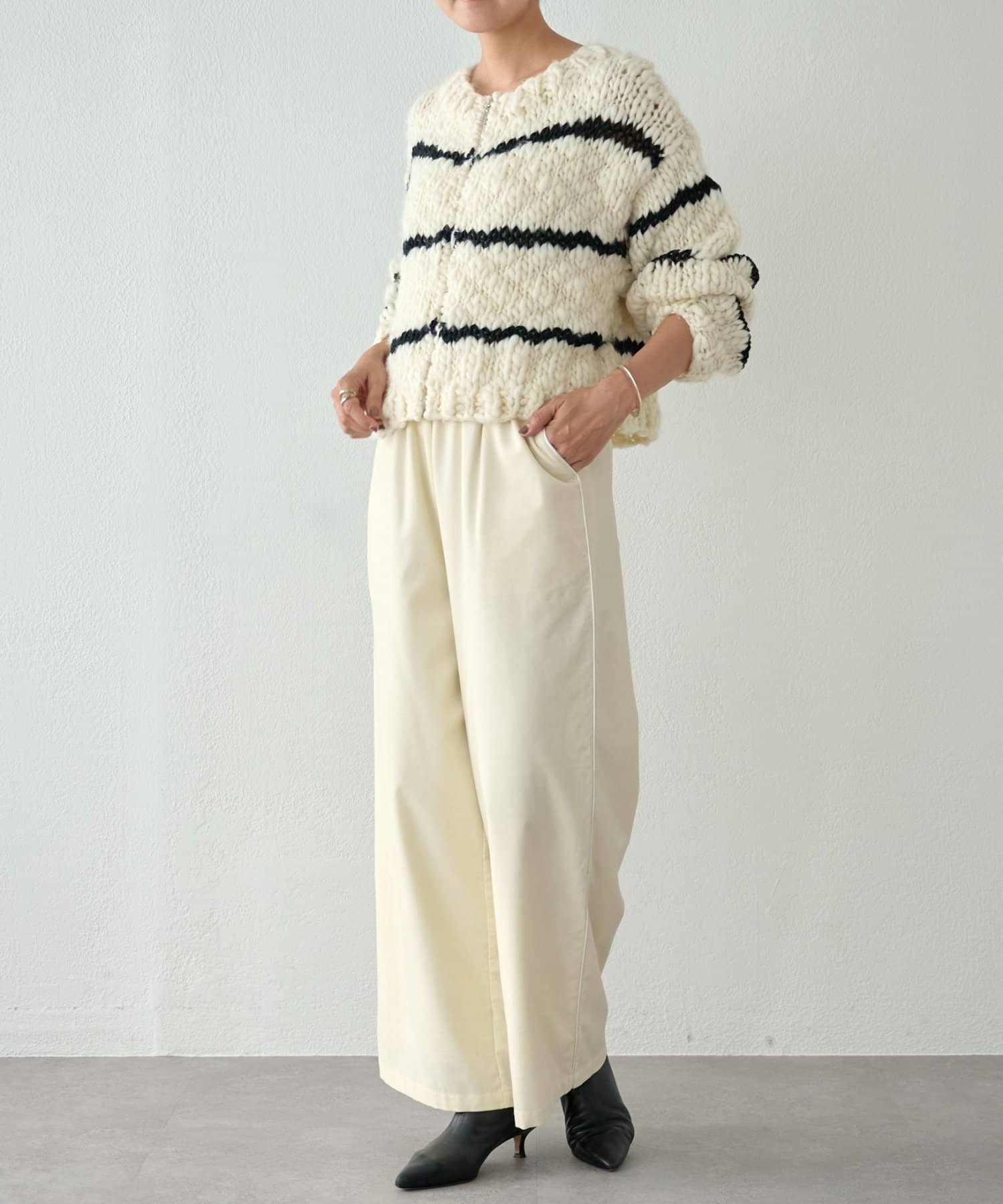 ほっこりしがちなざっくりニットも、オフホワイトにブラックのボーダーが入ることで甘くなりすぎず、こなれ感を演出。