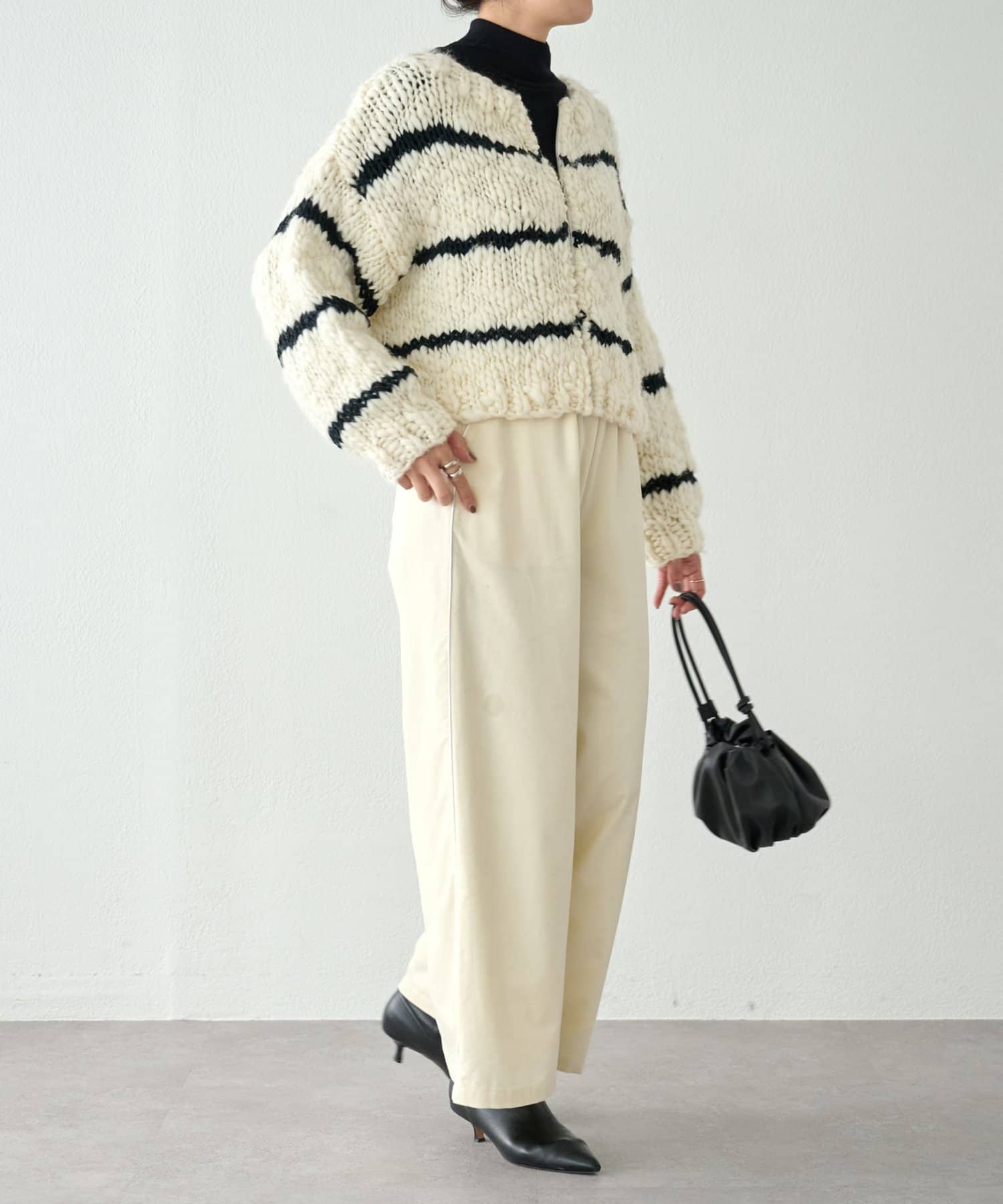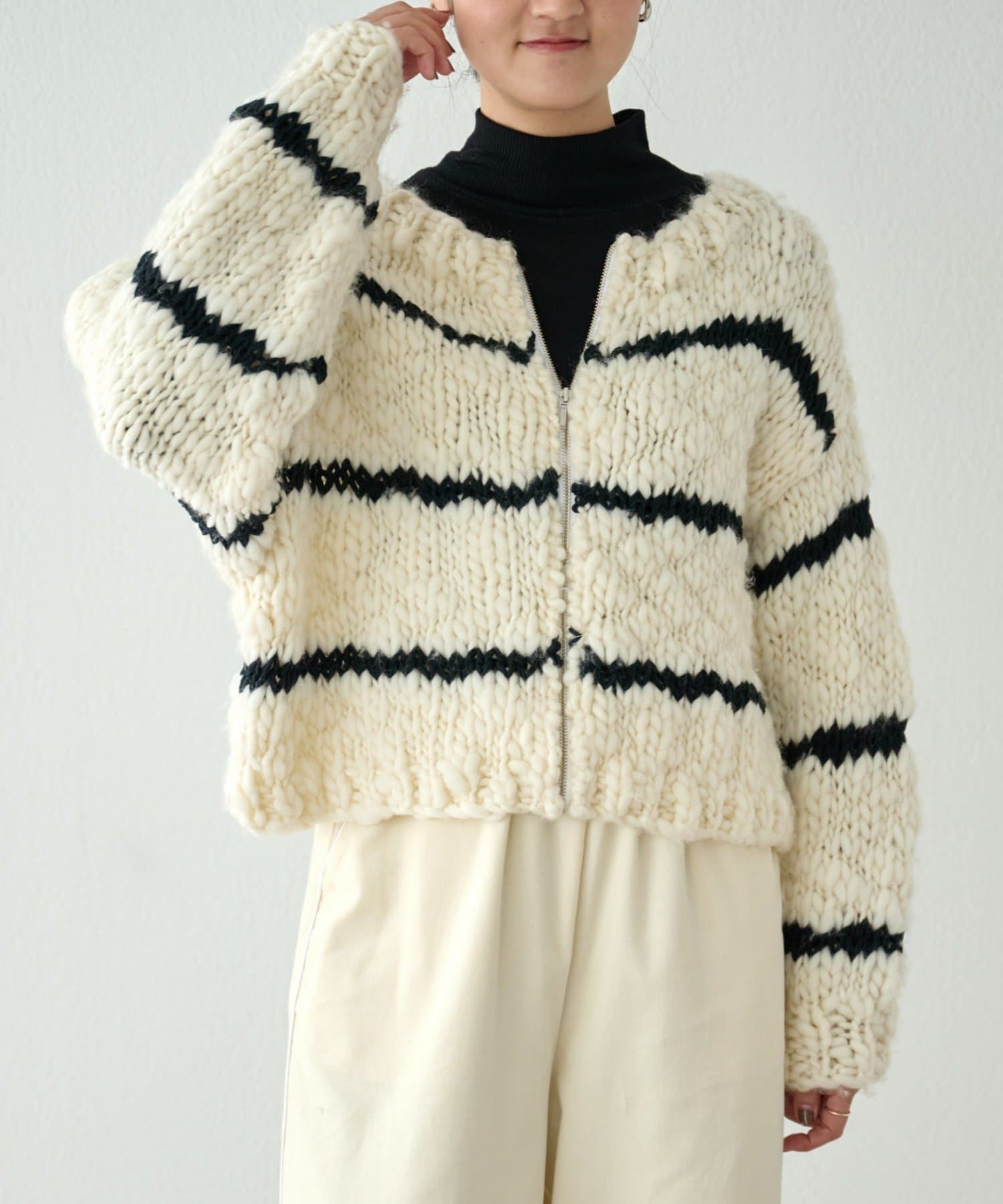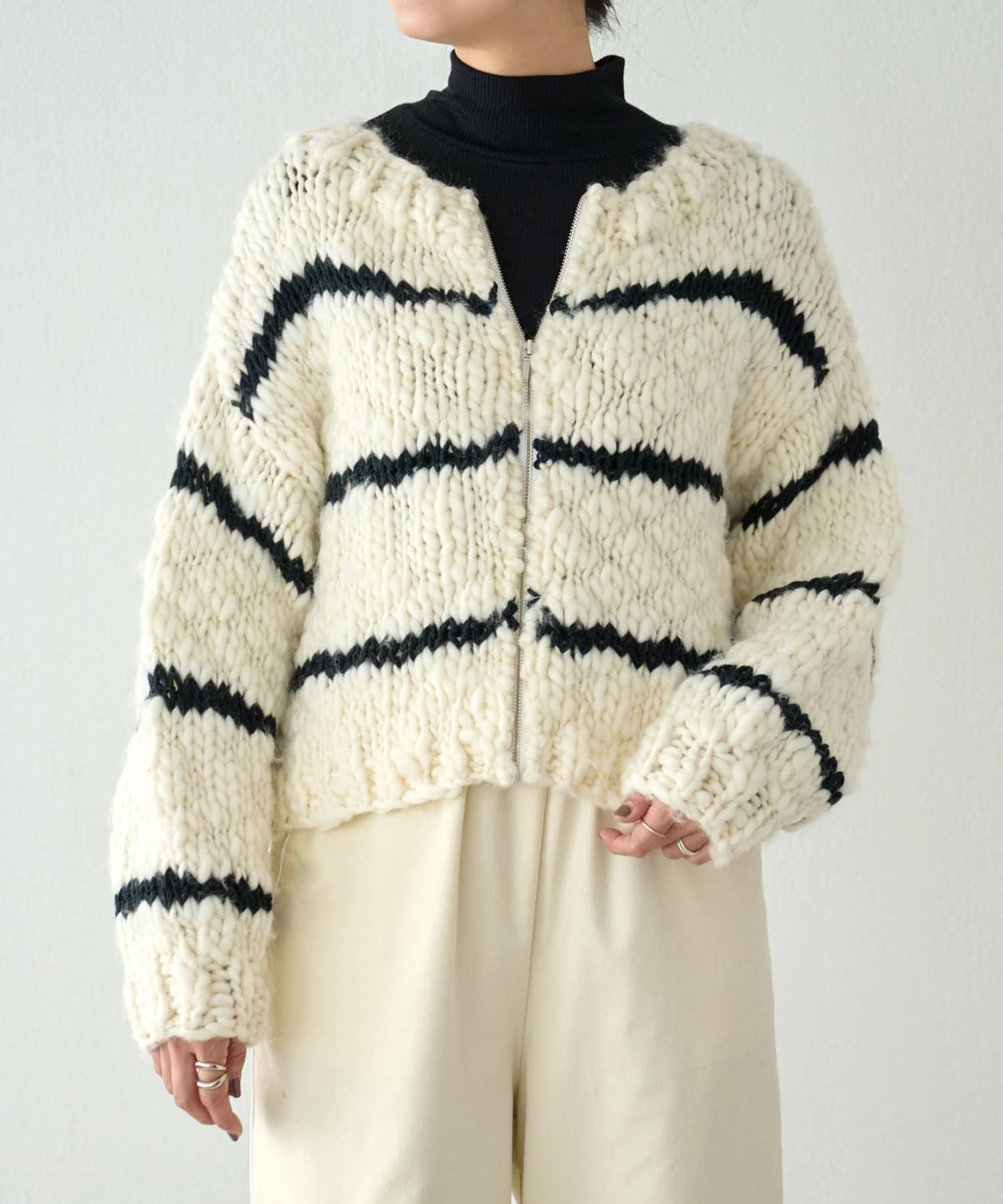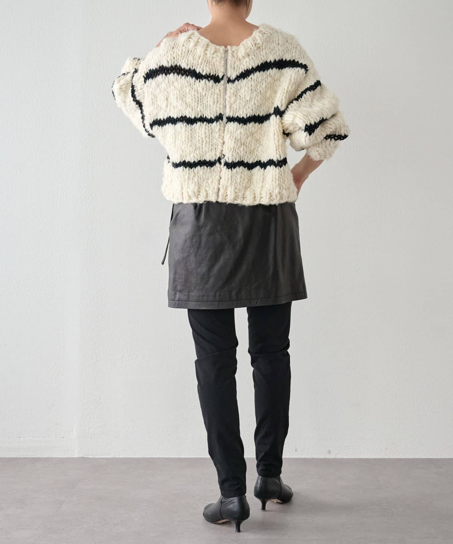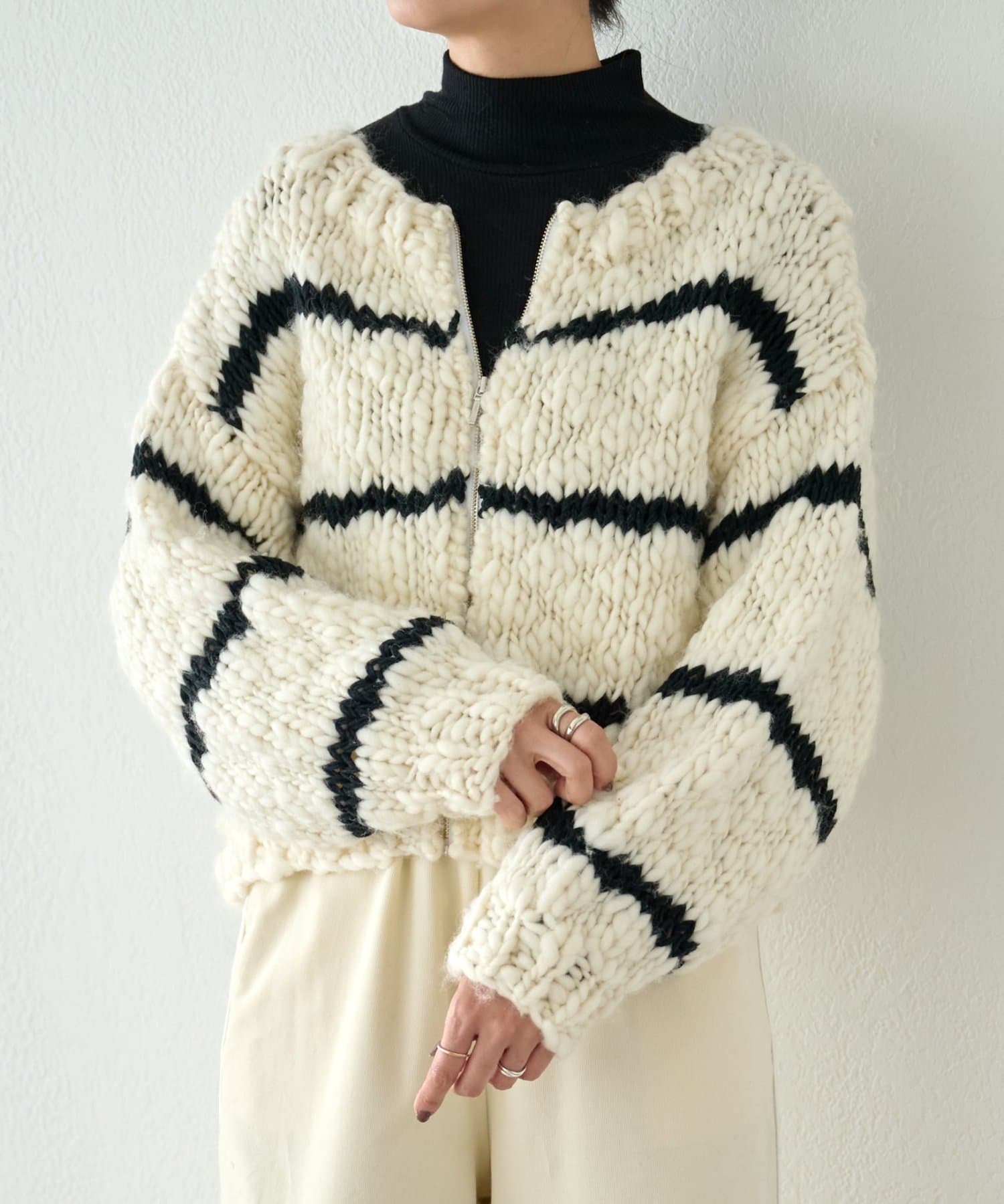ほっこりしがちなざっくりニットも、オフホワイトにブラックのボーダーが入ることで甘くなりすぎず、こなれ感を演出。