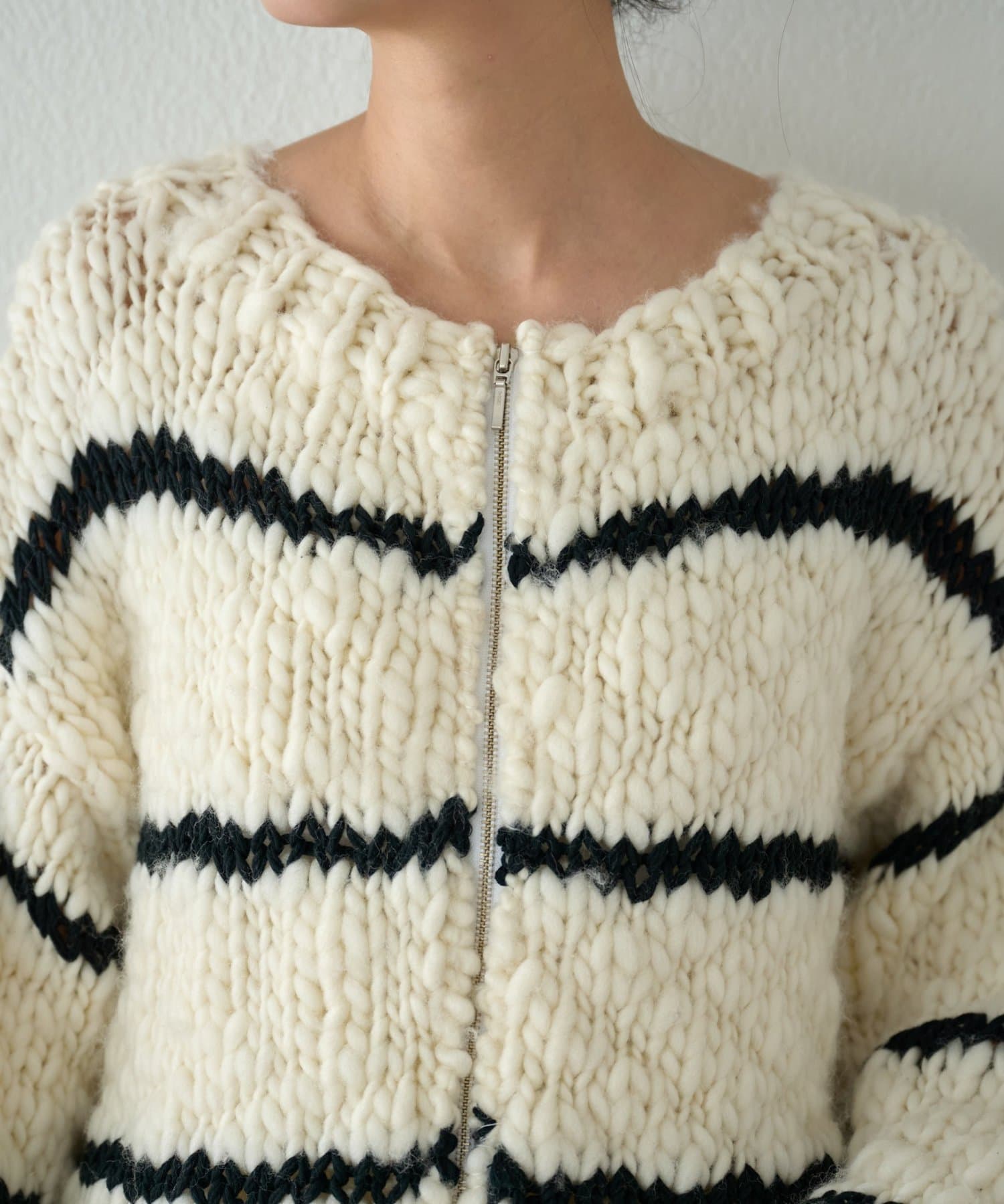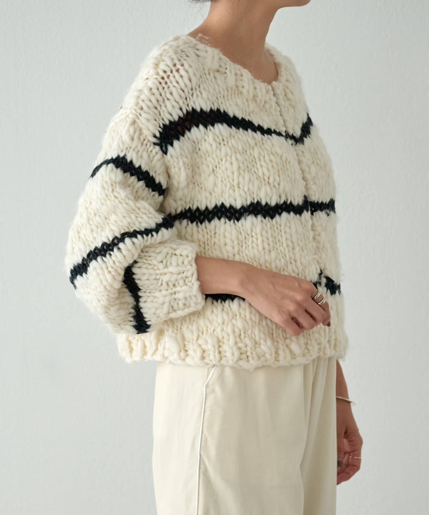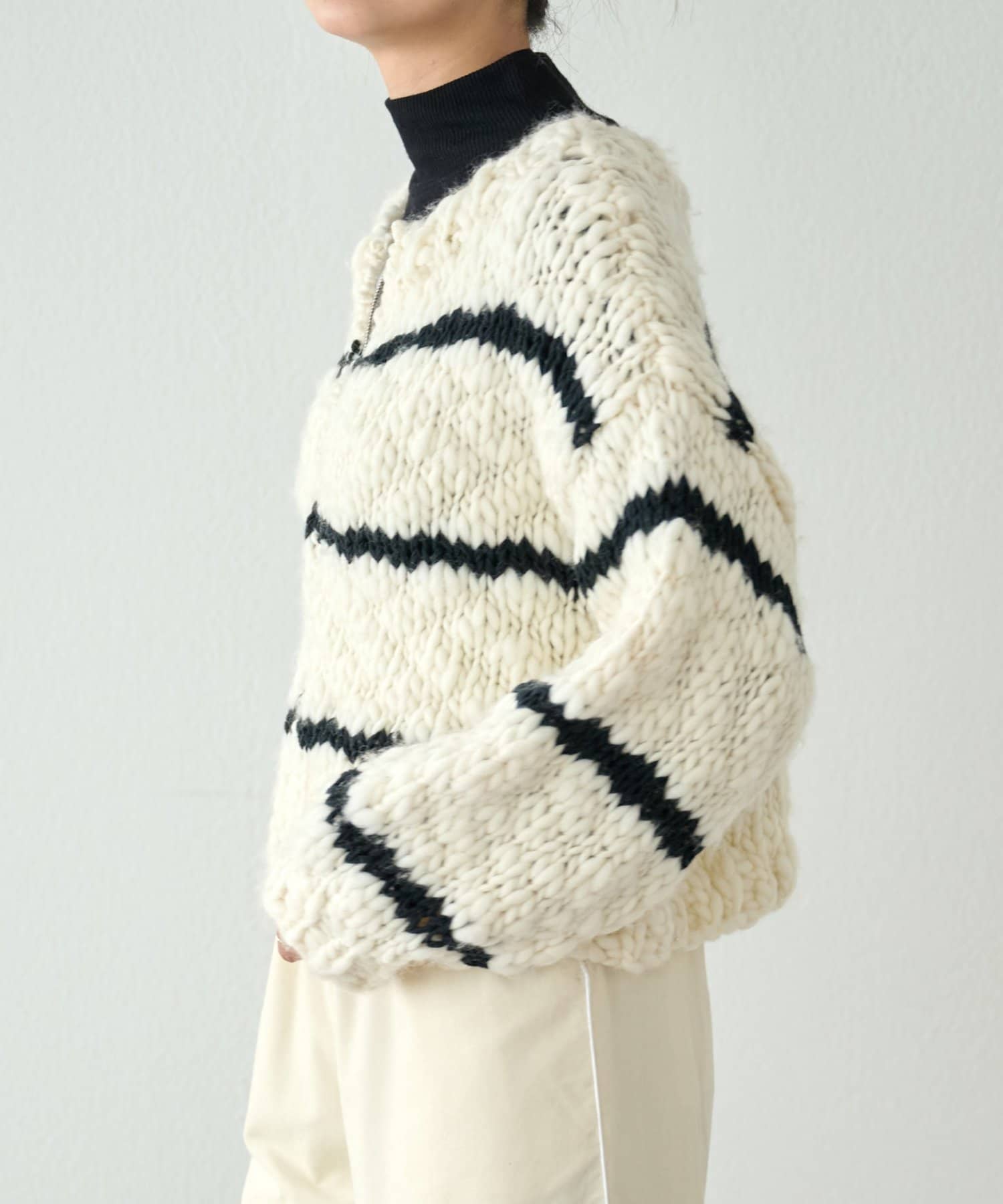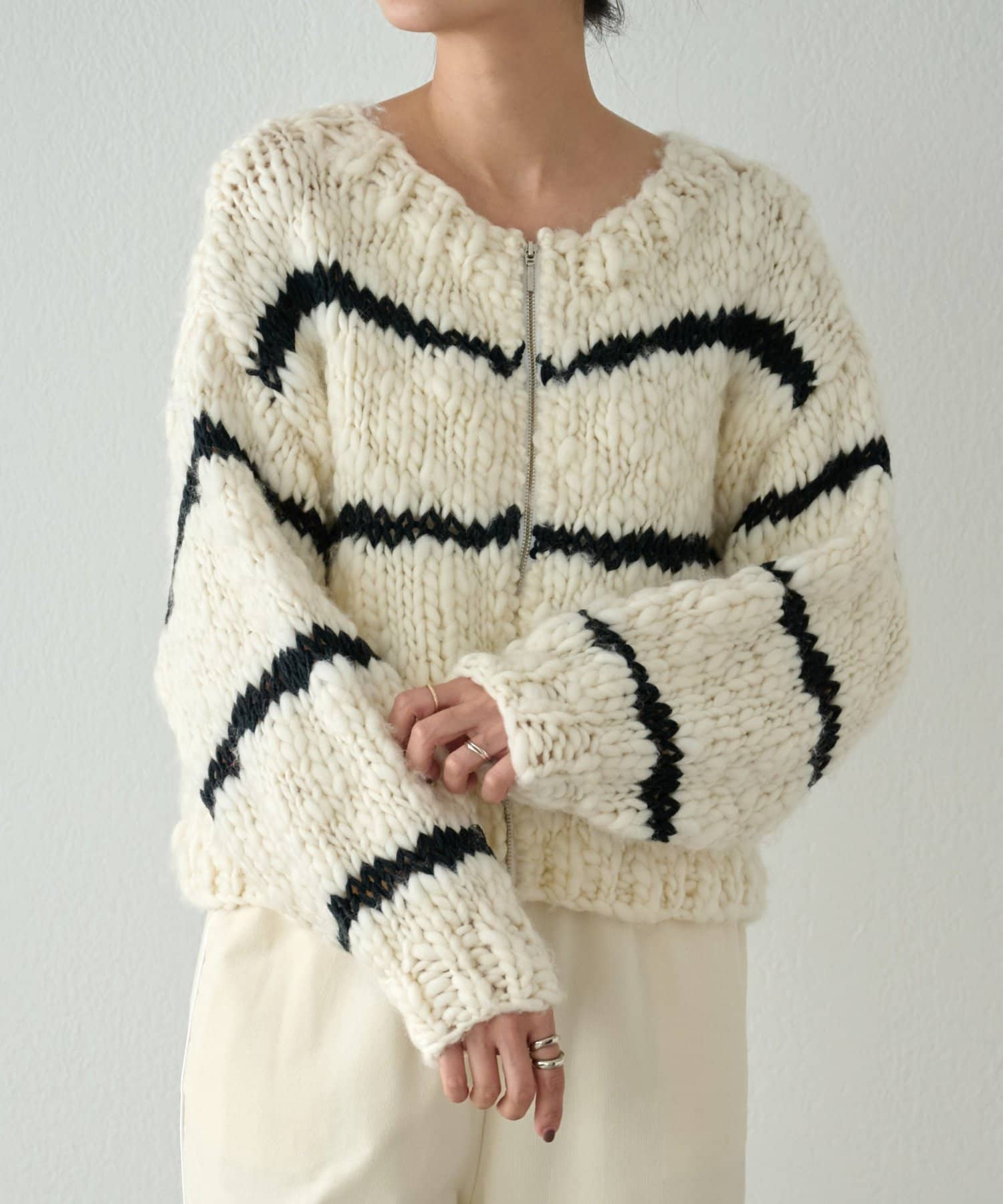 ほっこりしがちなざっくりニットも、オフホワイトにブラックのボーダーが入ることで甘くなりすぎず、こなれ感を演出。