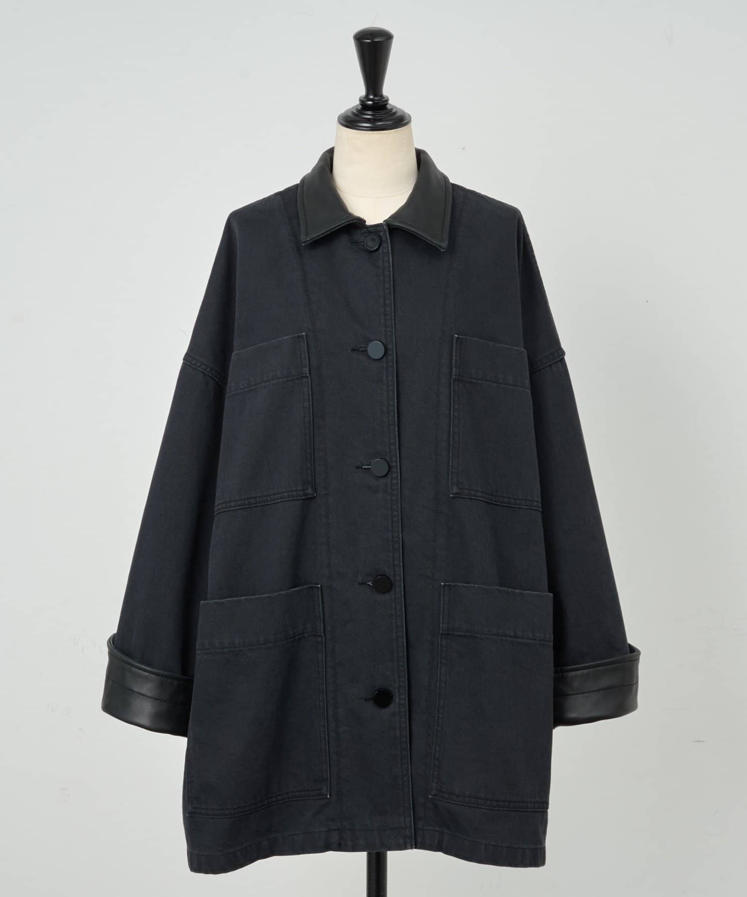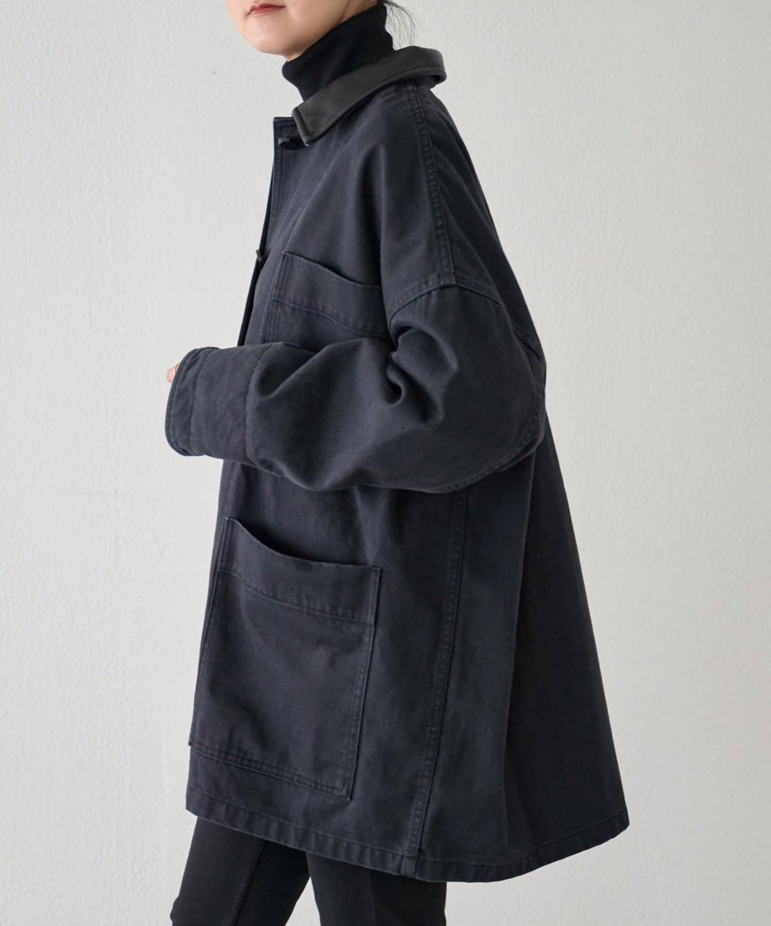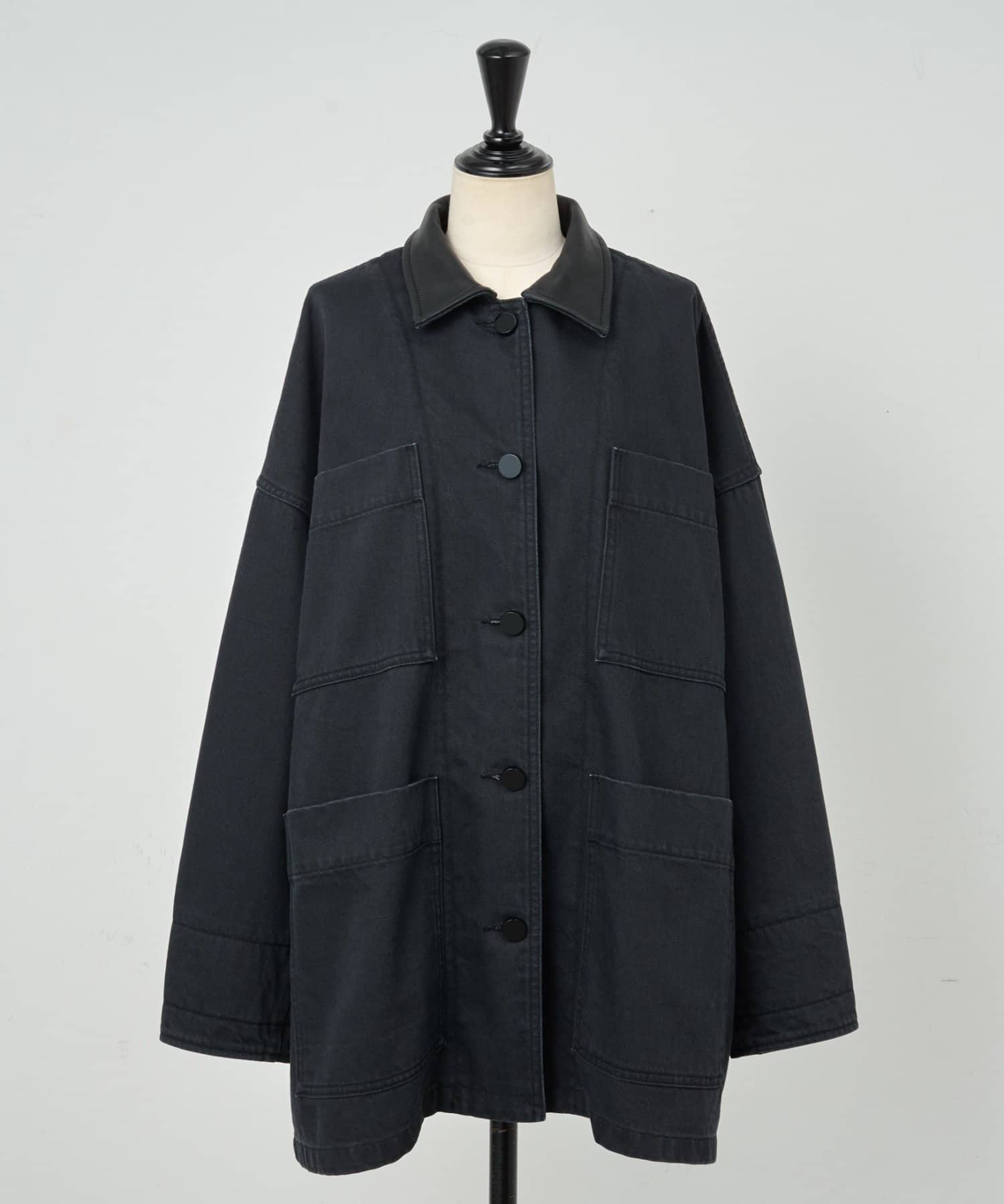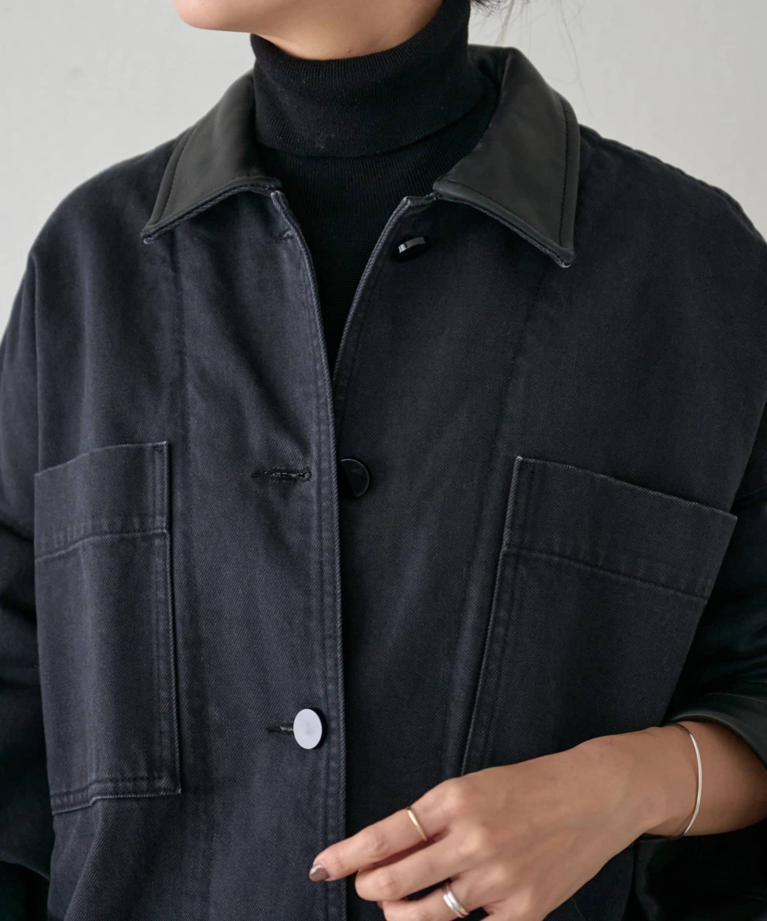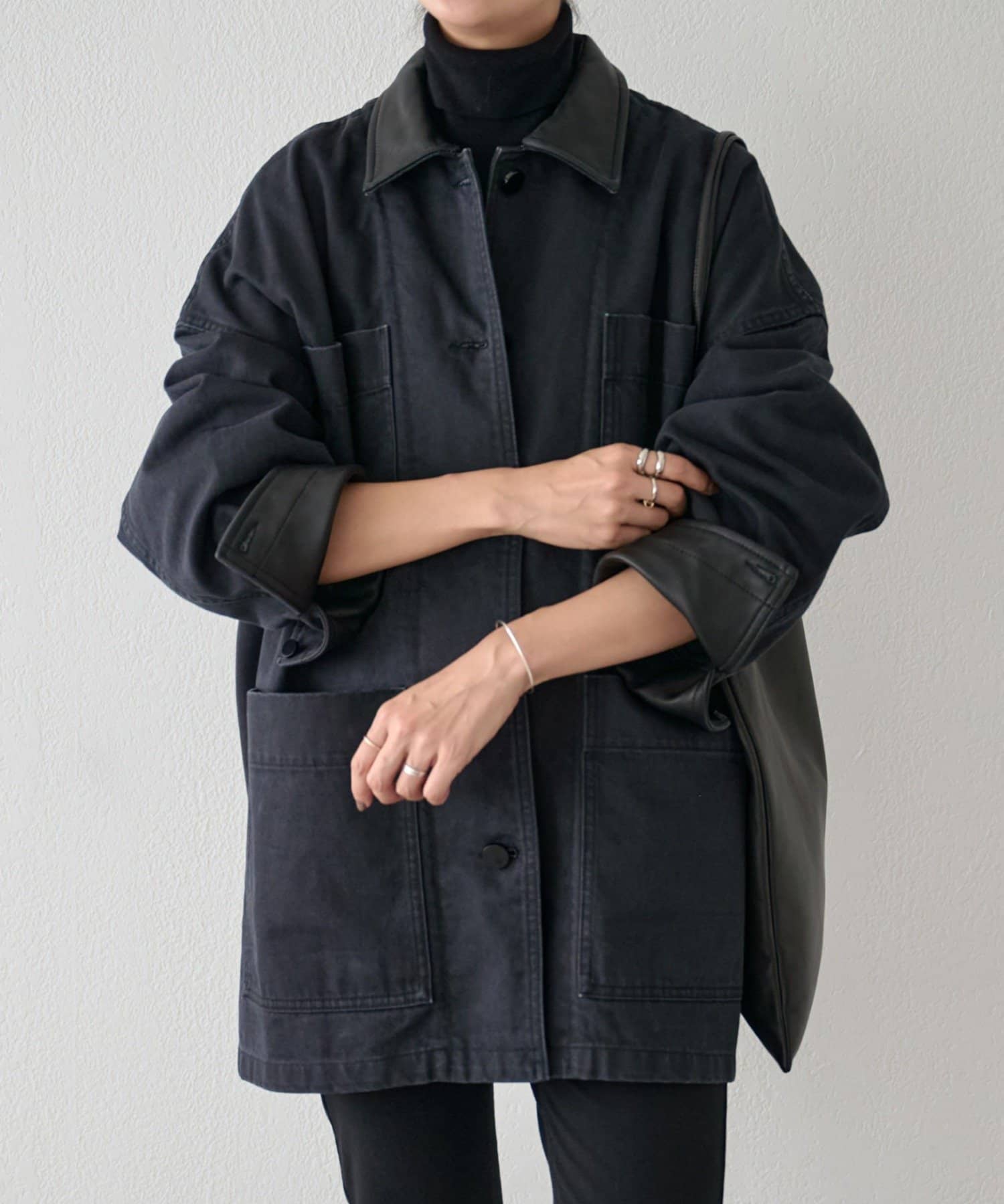 衿元と袖口のレザーが目を惹くワークジャケット。