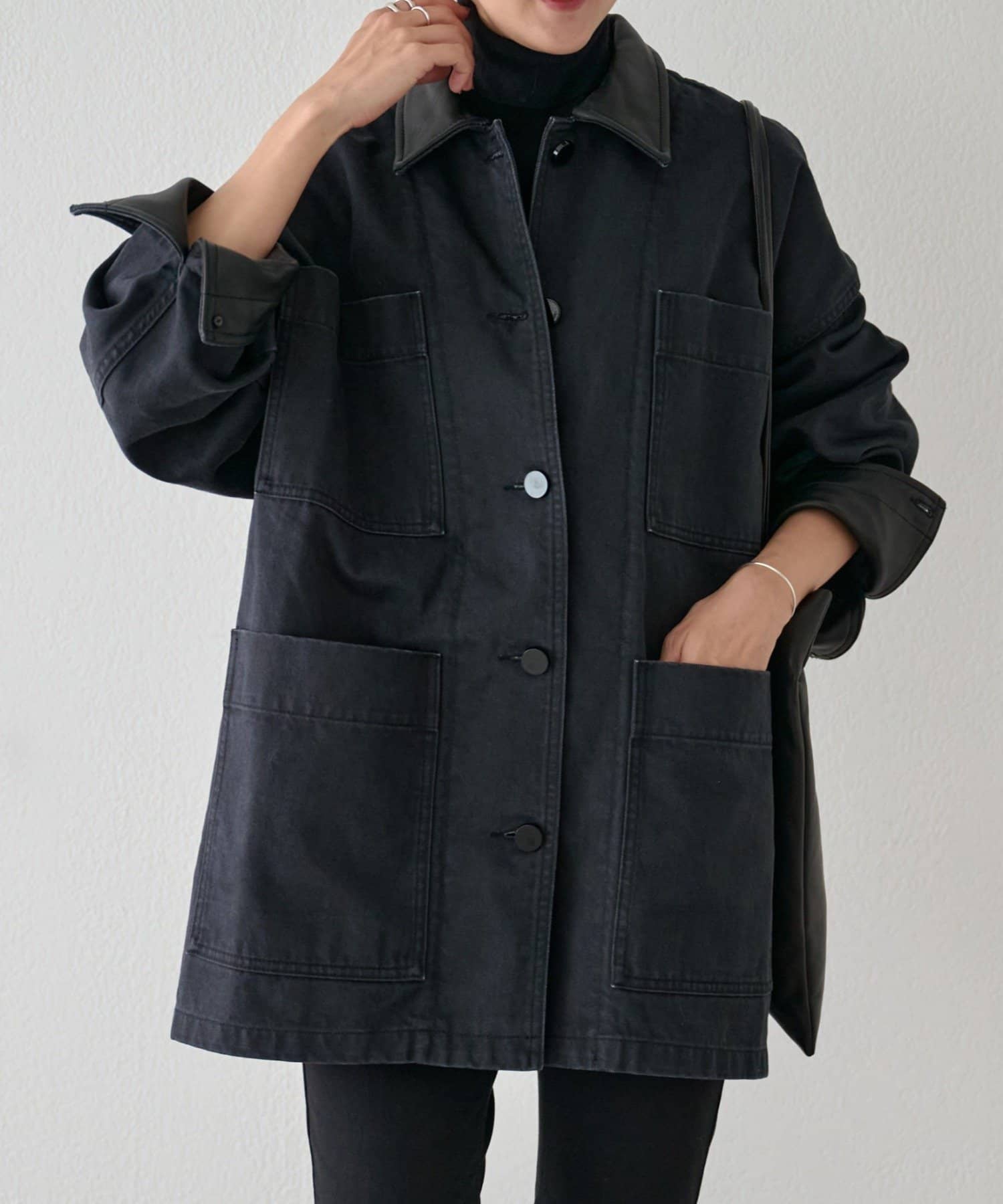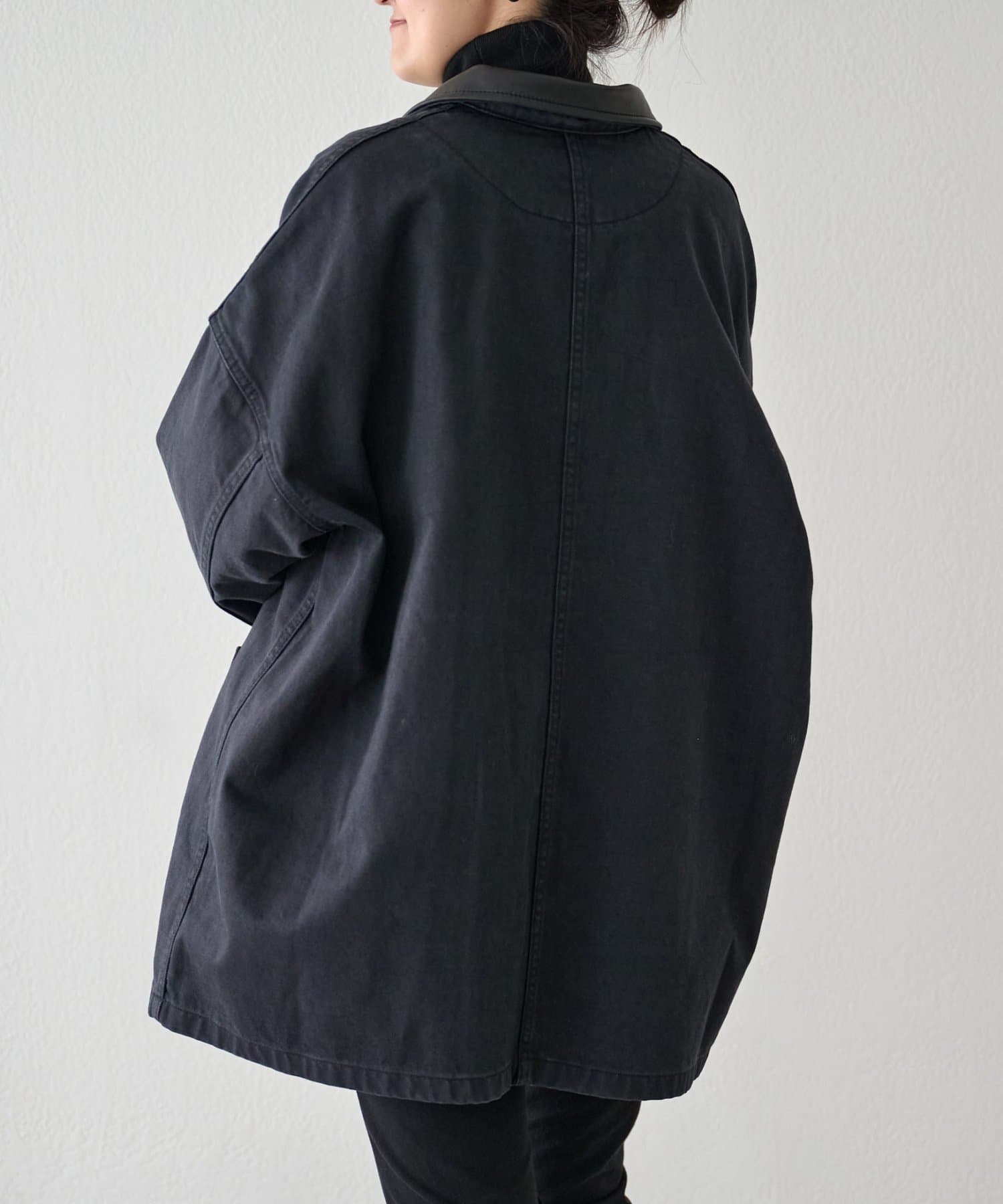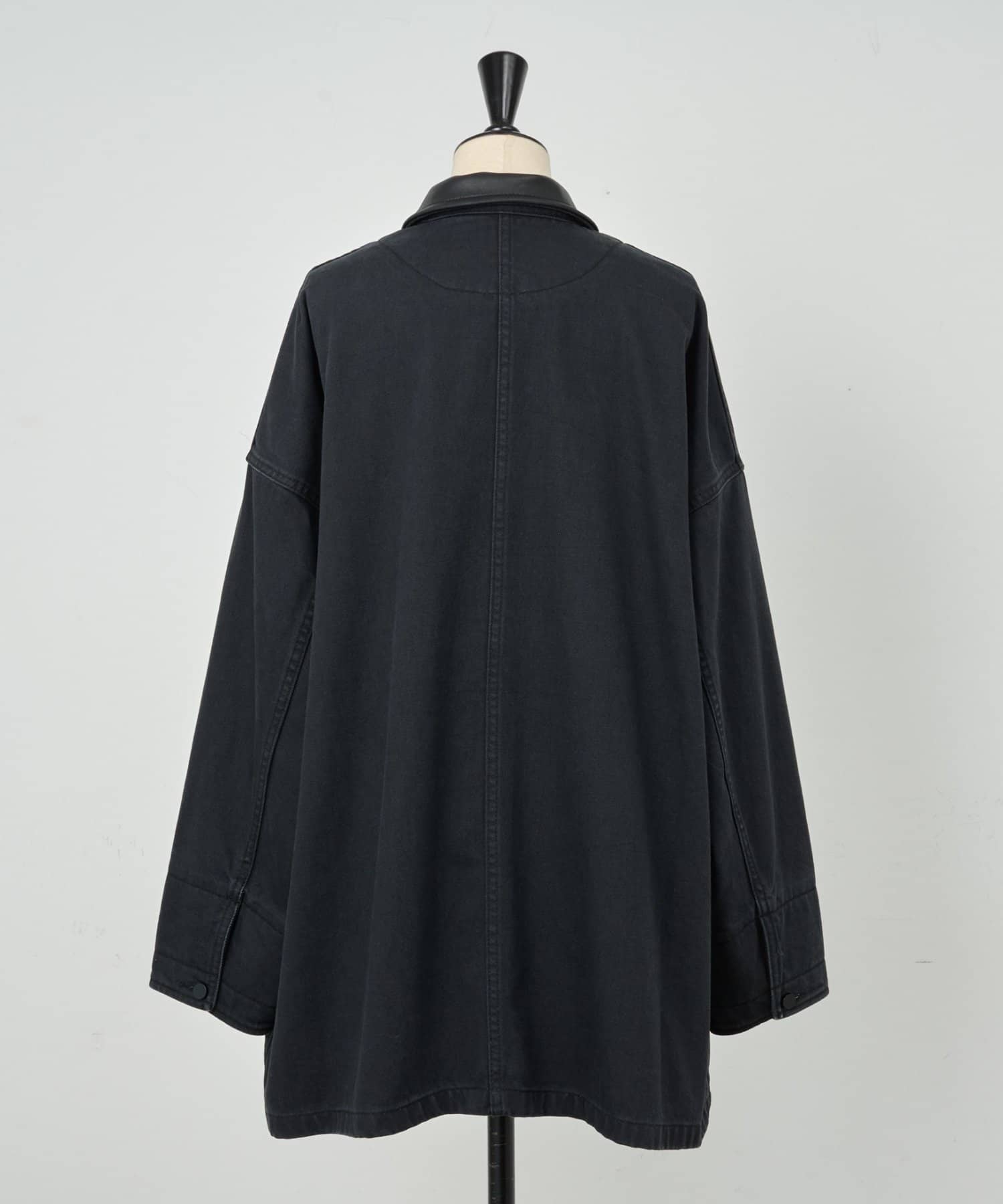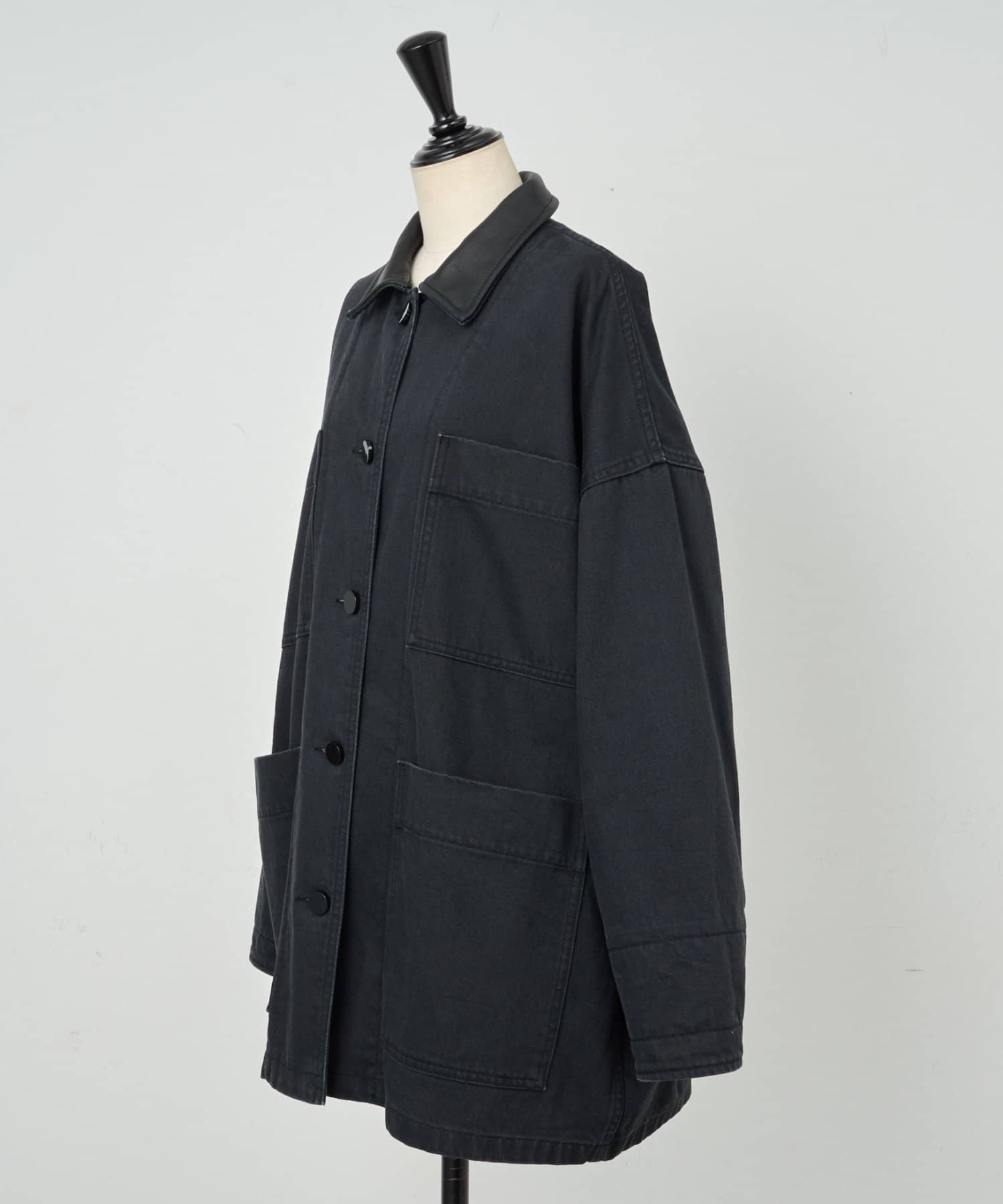 衿元と袖口のレザーが目を惹くワークジャケット。