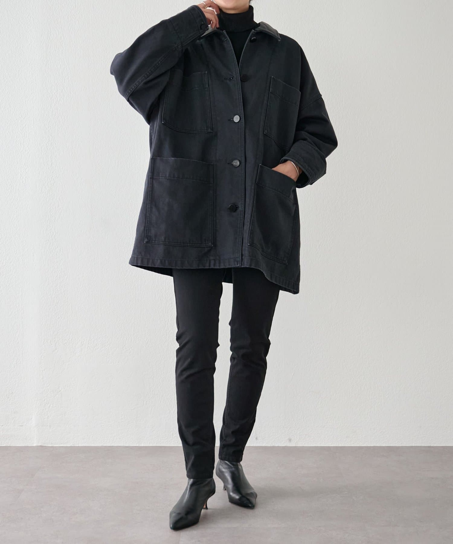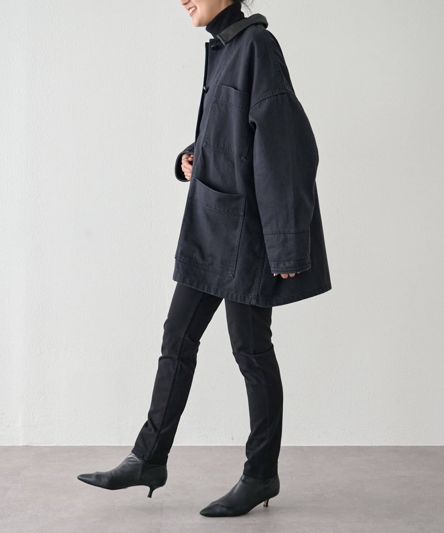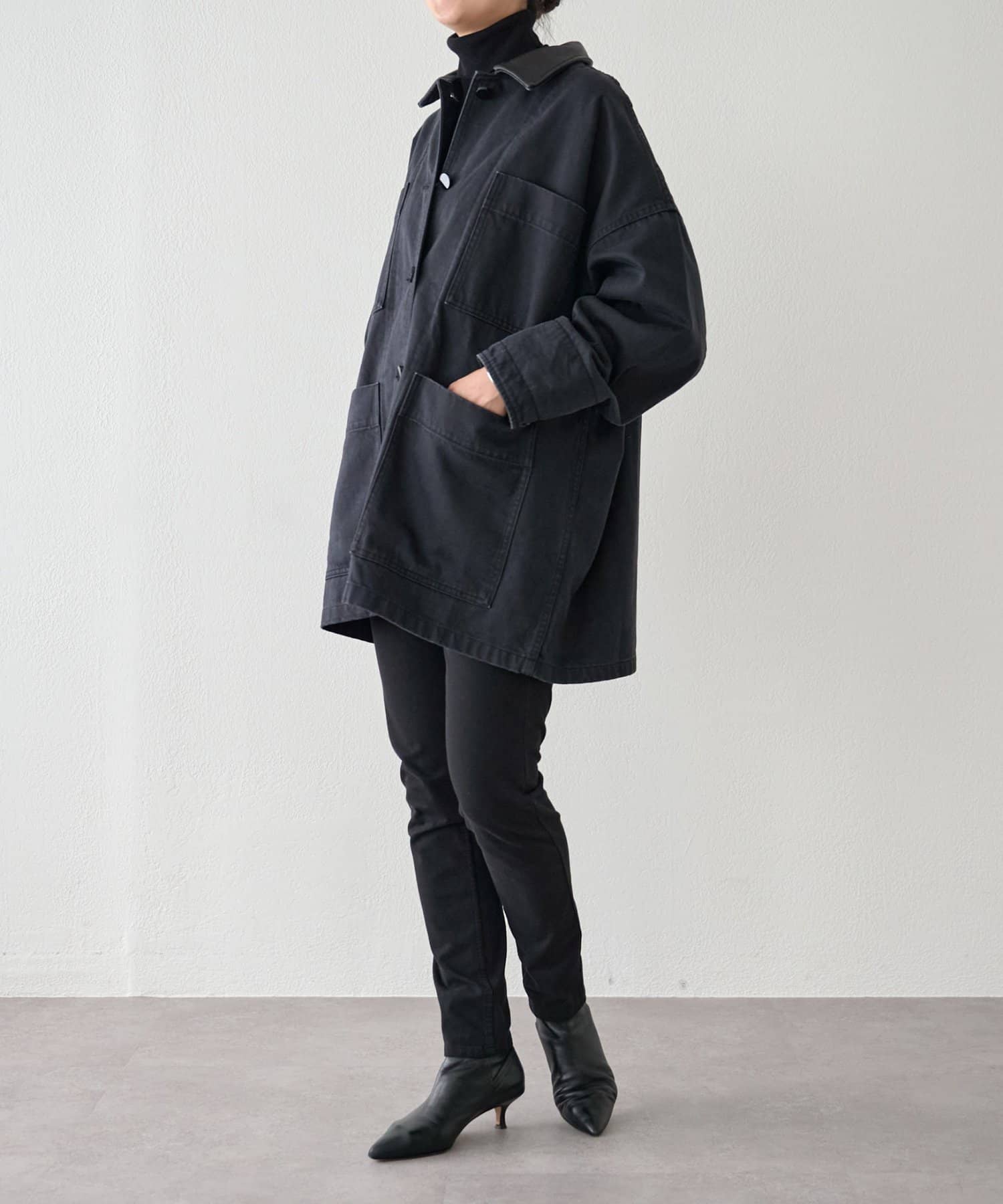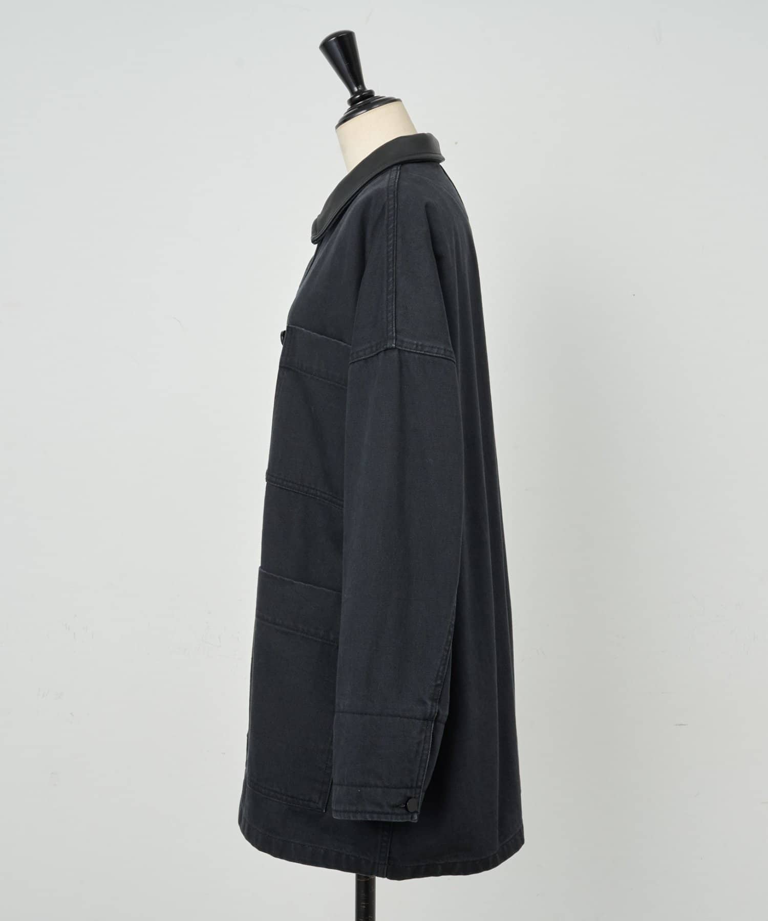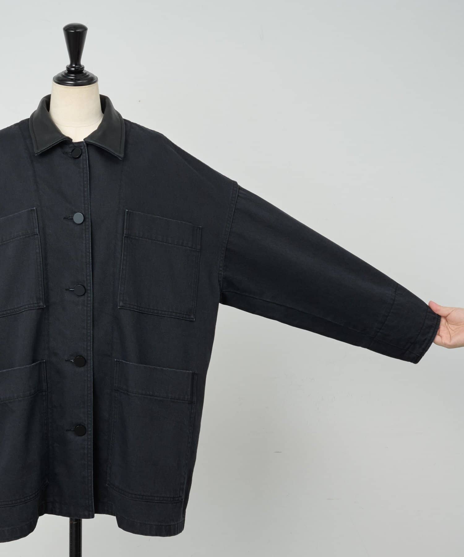 衿元と袖口のレザーが目を惹くワークジャケット。
