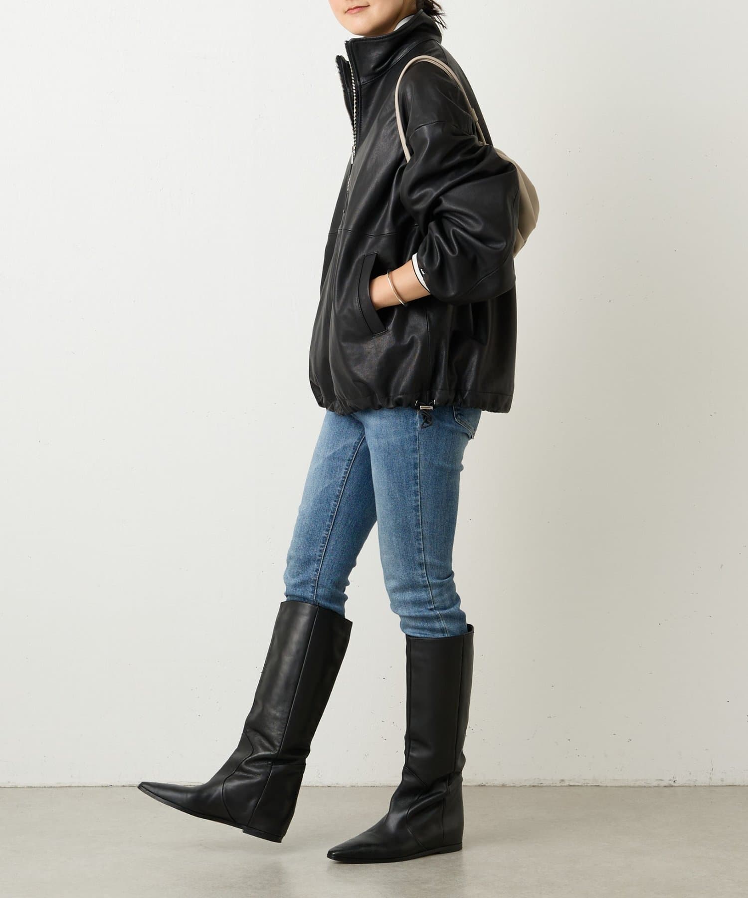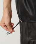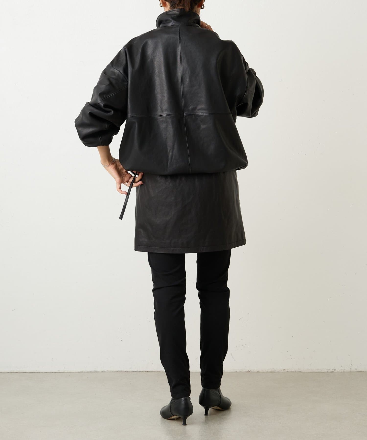 使用しているラムレザーは滑らかで柔らかく、シルエットや袖口のパフがあることでハードな印象になり過ぎず、レディライクな雰囲気に。