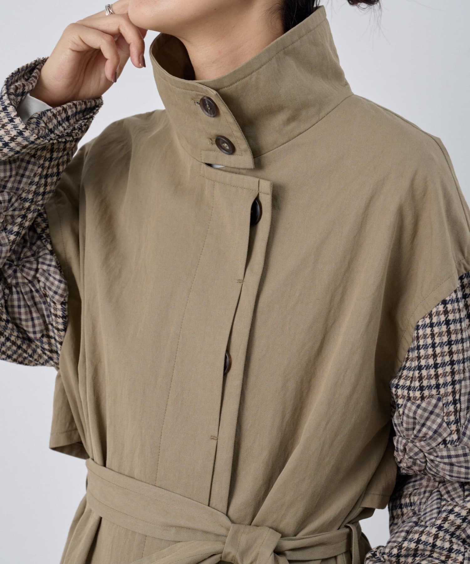 首元を美しく見せるスタンドカラー、ウエストラインを整える共布ベルト付き。