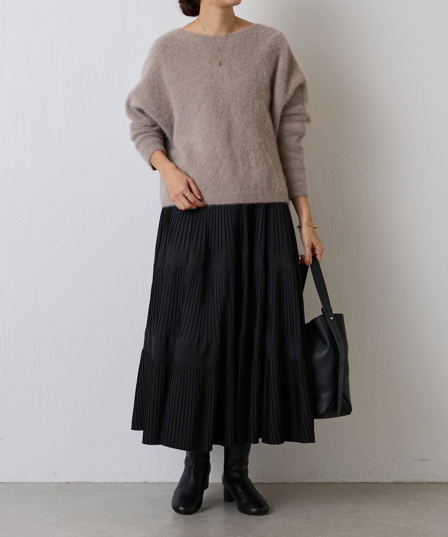 細めのプリーツで広がりすぎず、すっきりと穿けるのも嬉しいポイントです。