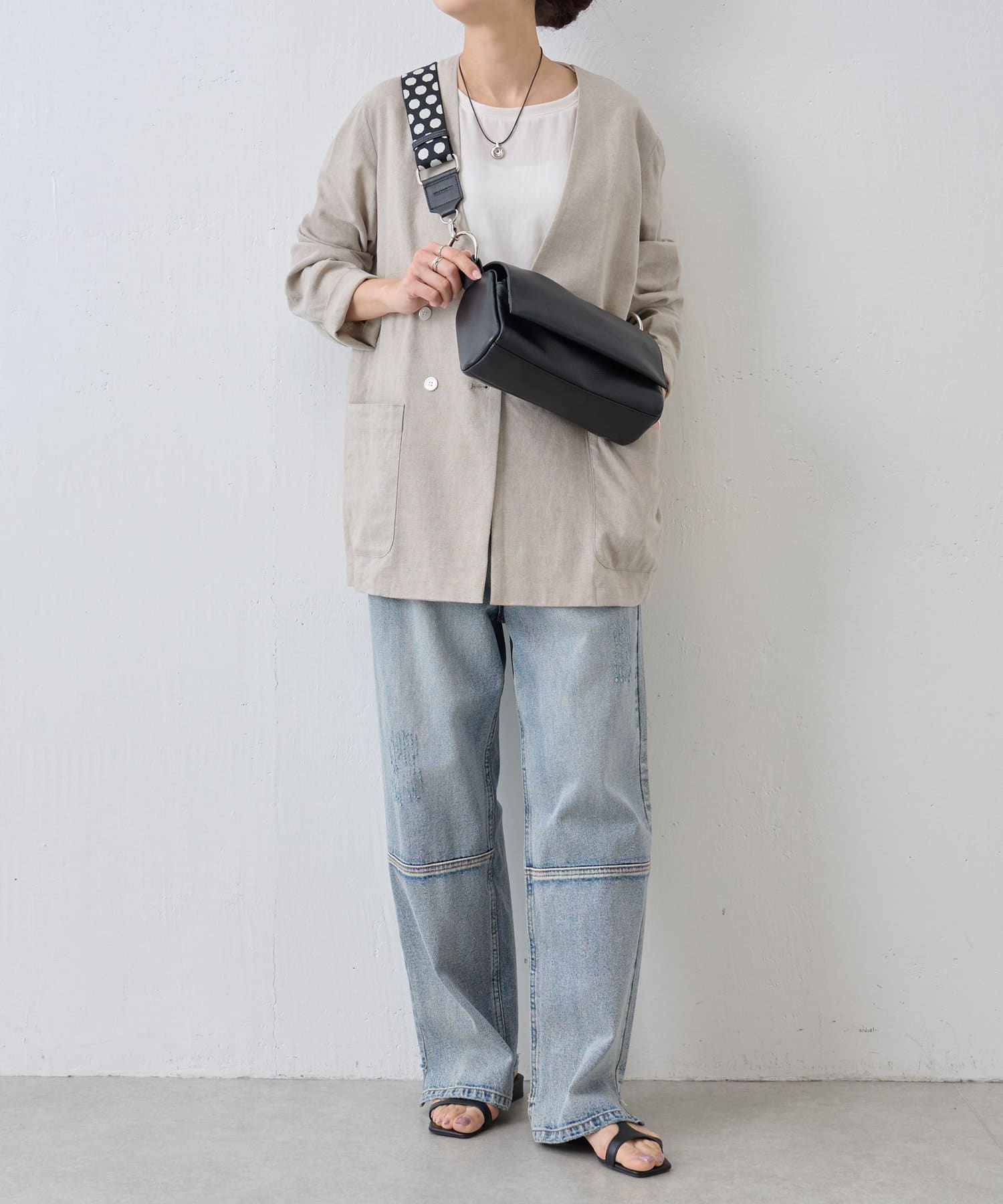 カジュアルダウンして普段持ちに雰囲気チェンジ。黒Bagにトープのショルダーも意外に合いました。長さ調整も無段階で良かったです