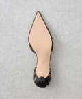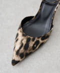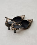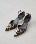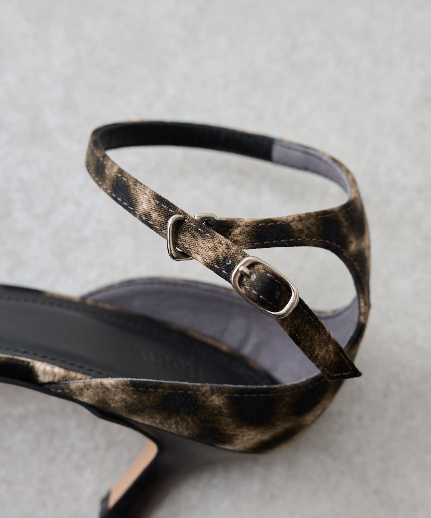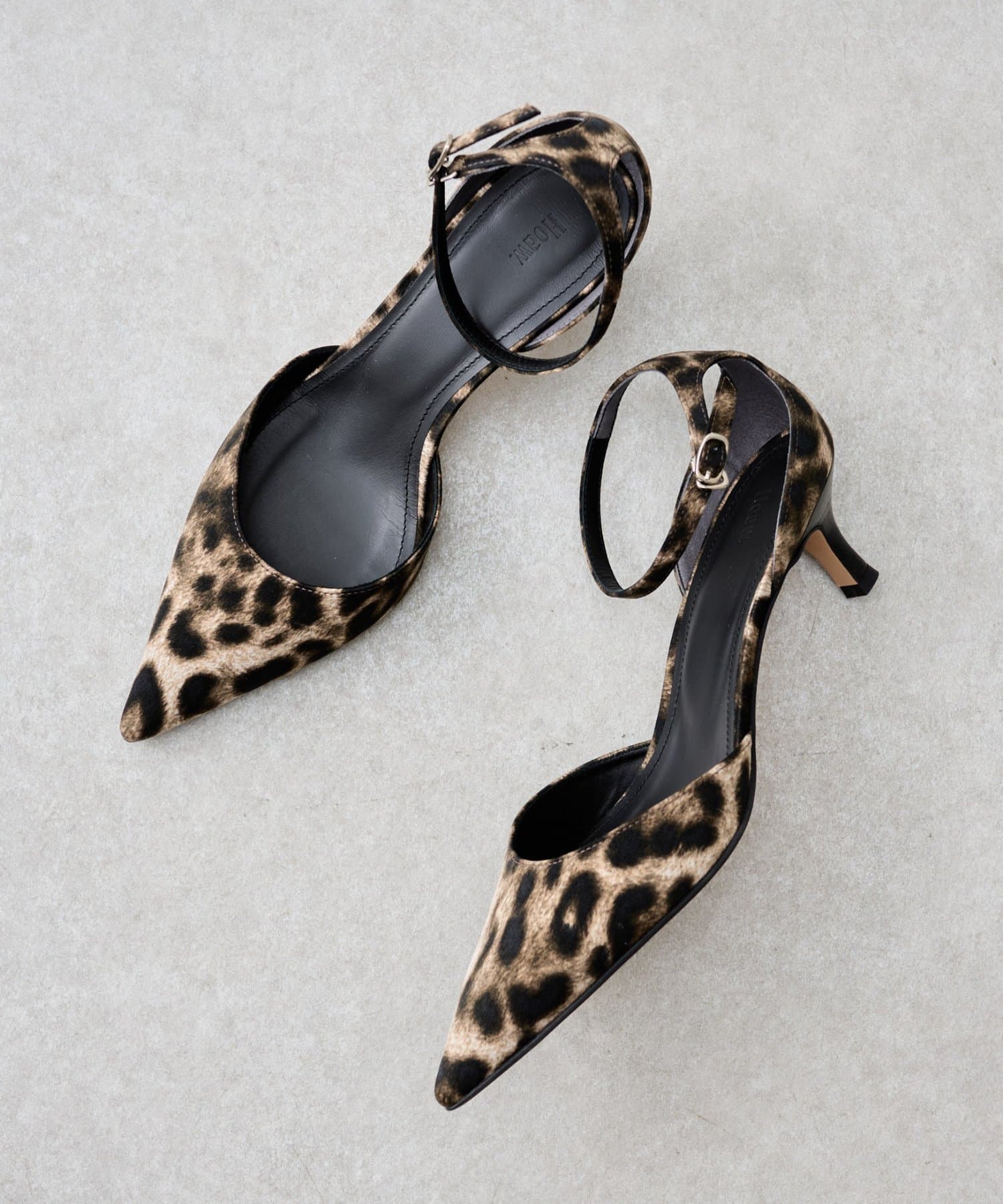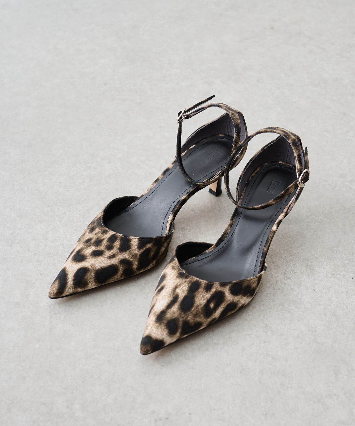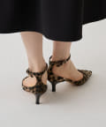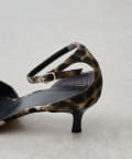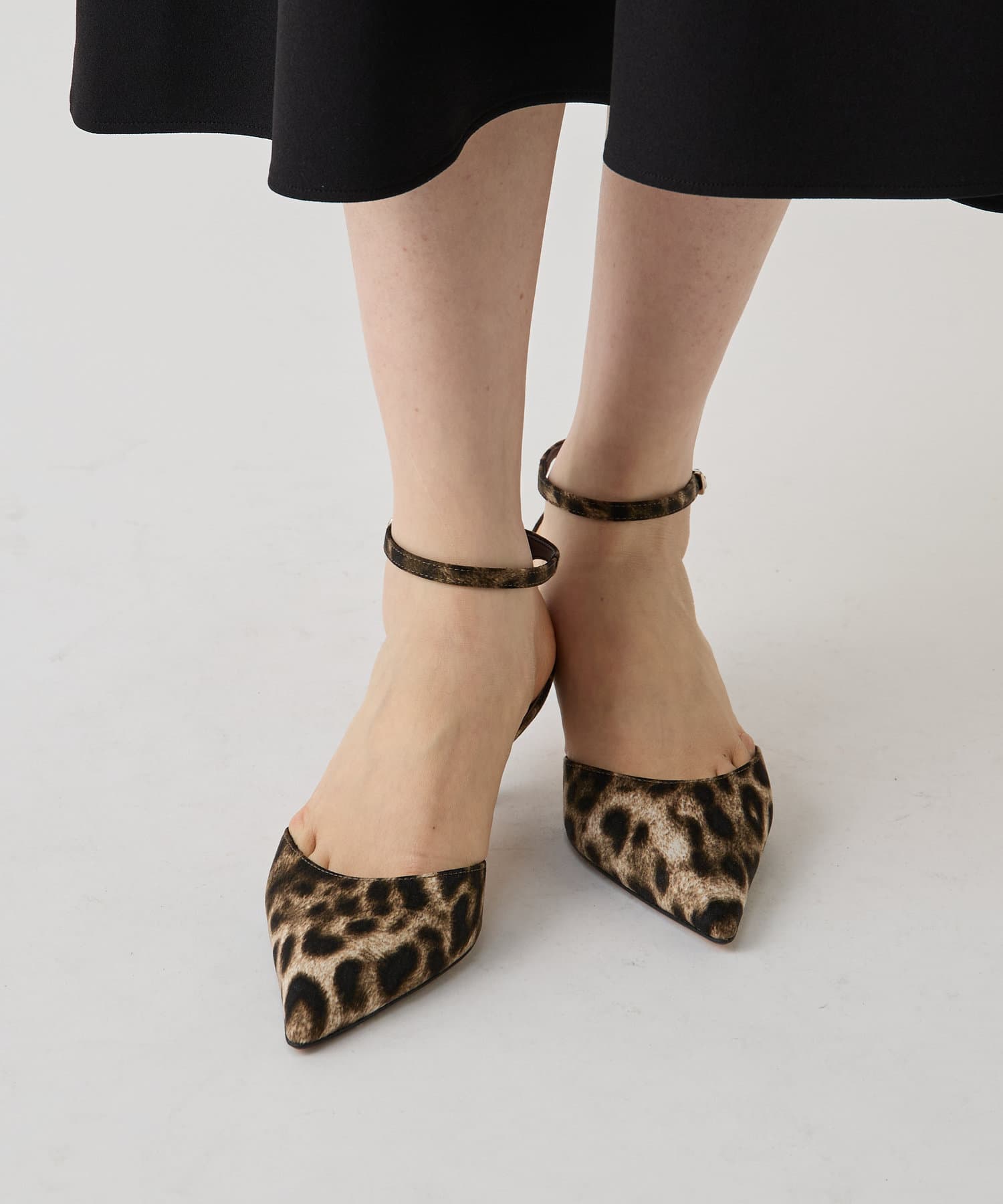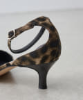 サテン素材のレオパードが目を惹くストラップパンプス。