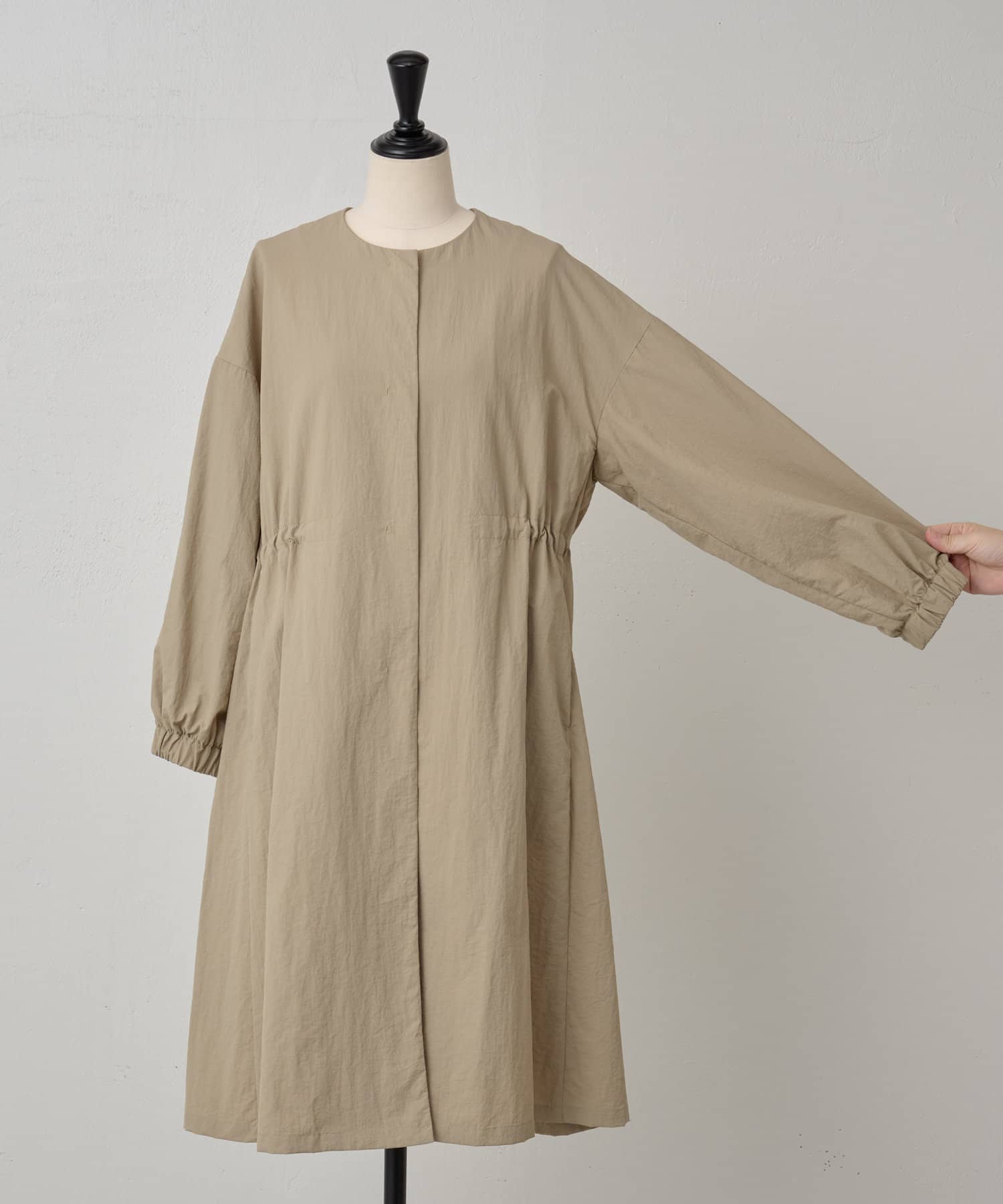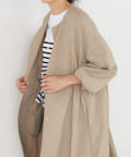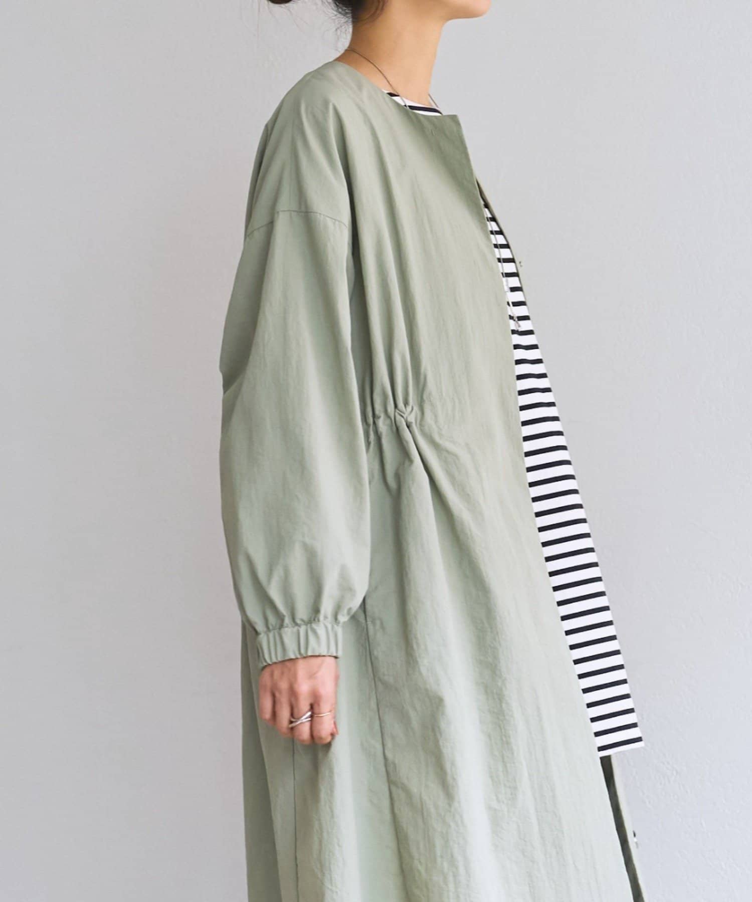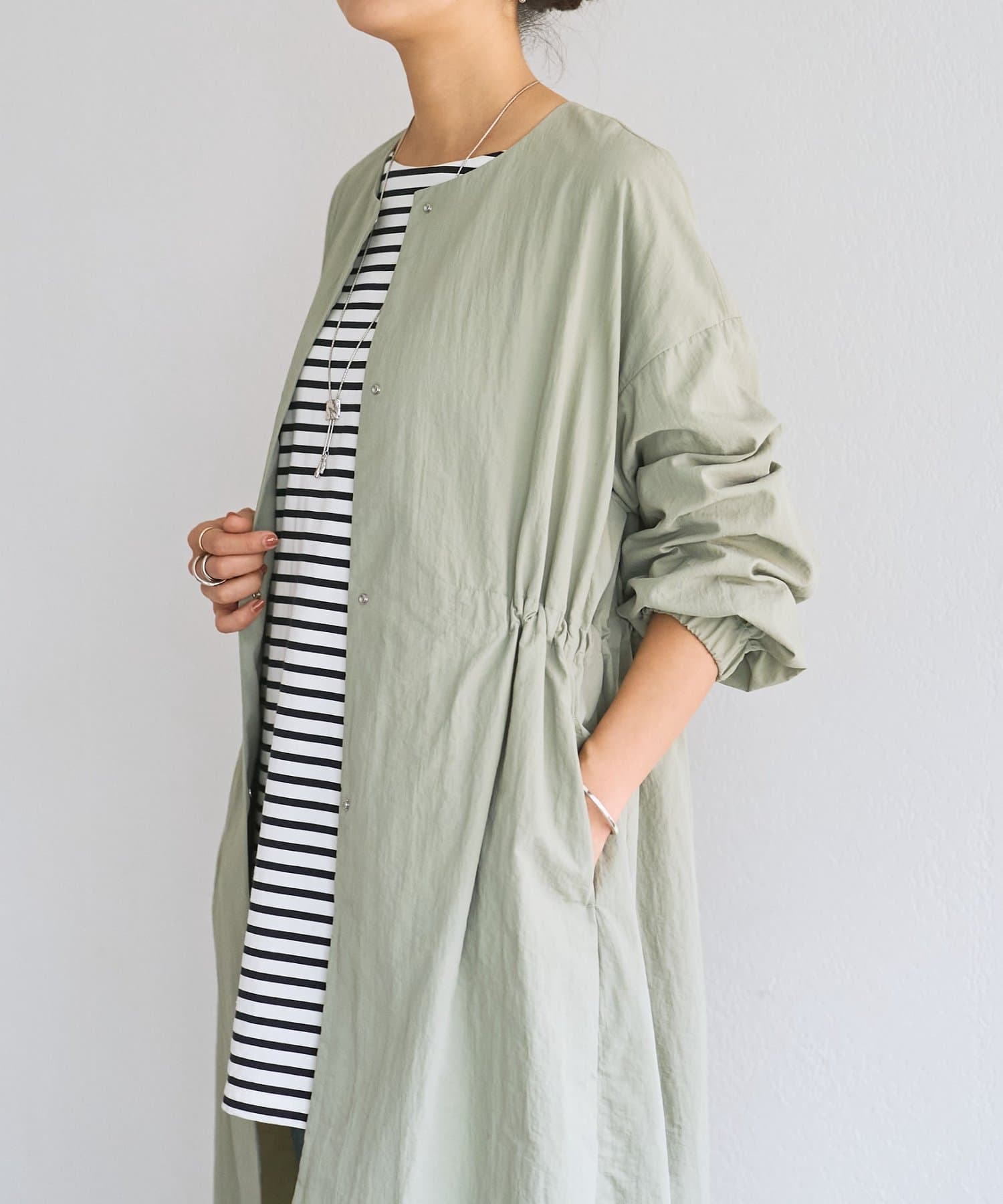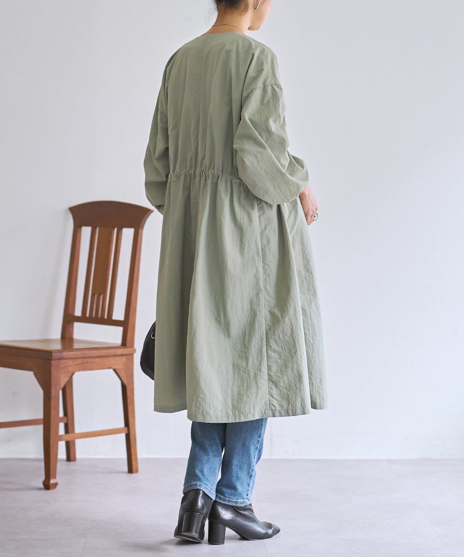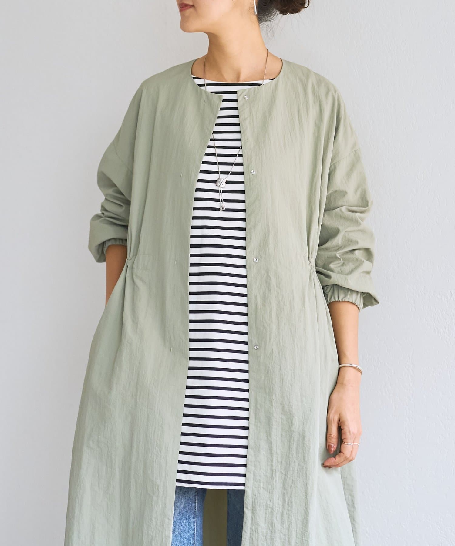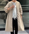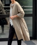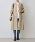 長いシーズン通して活躍するフレアーシルエットのノーカラーコート