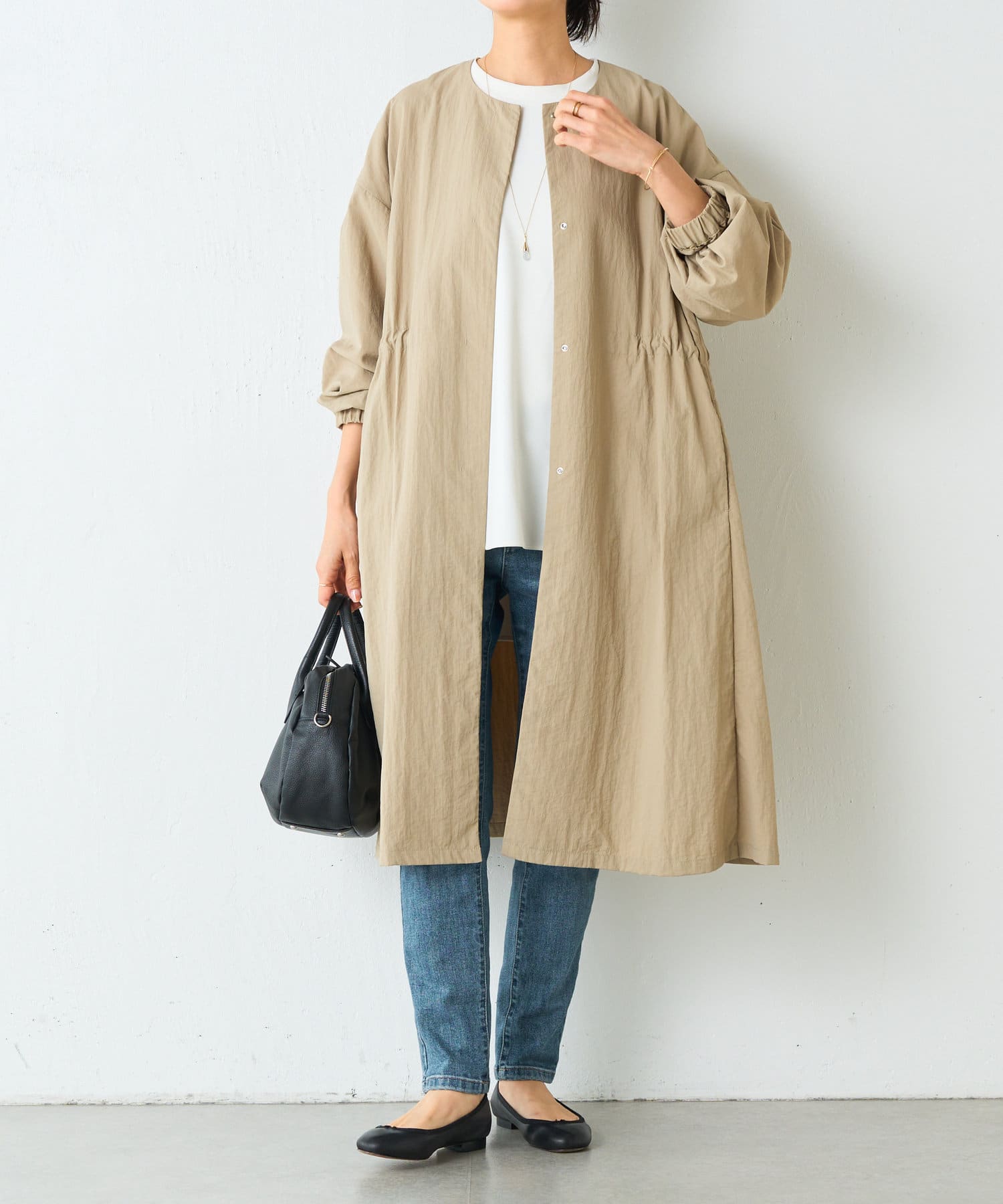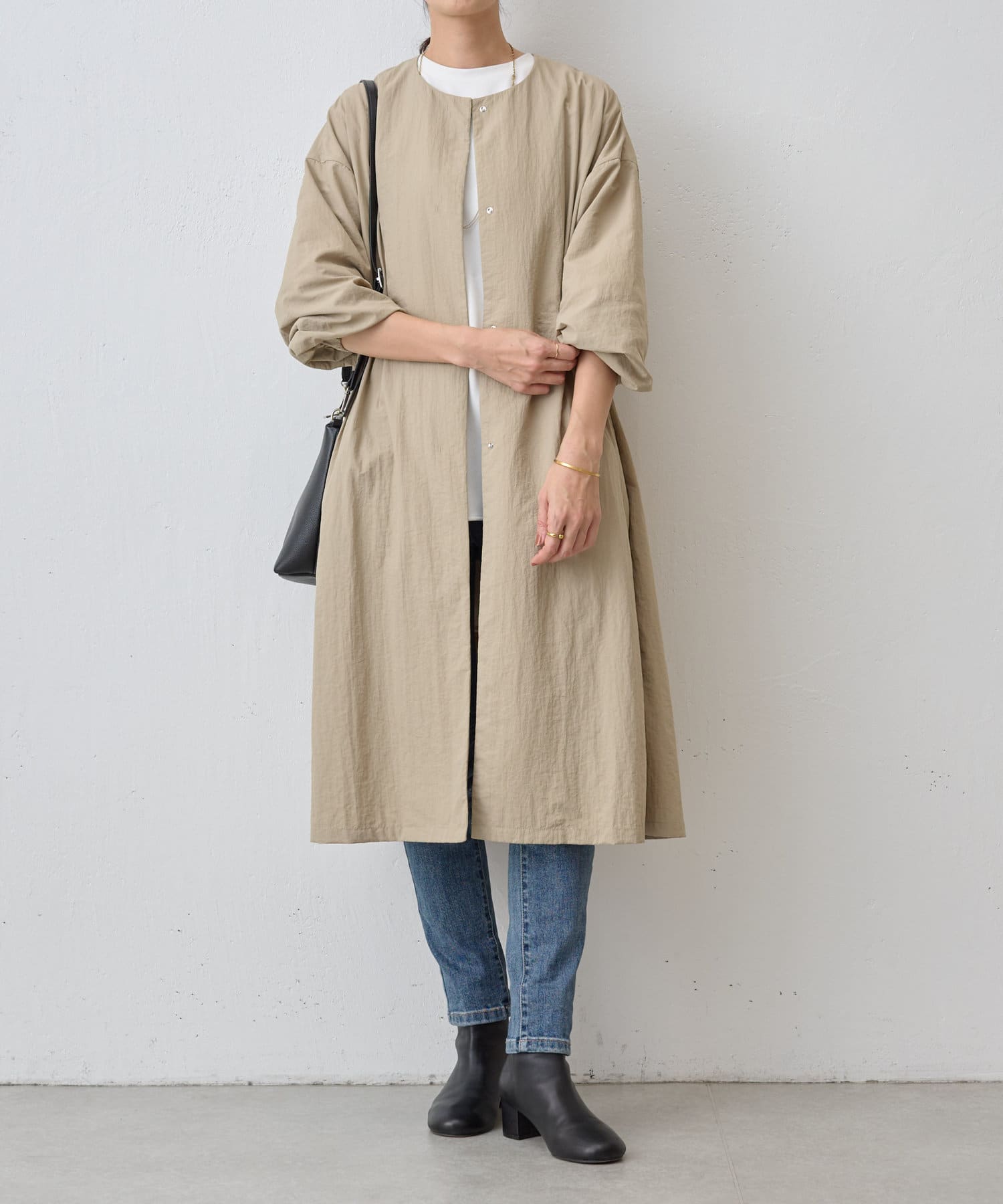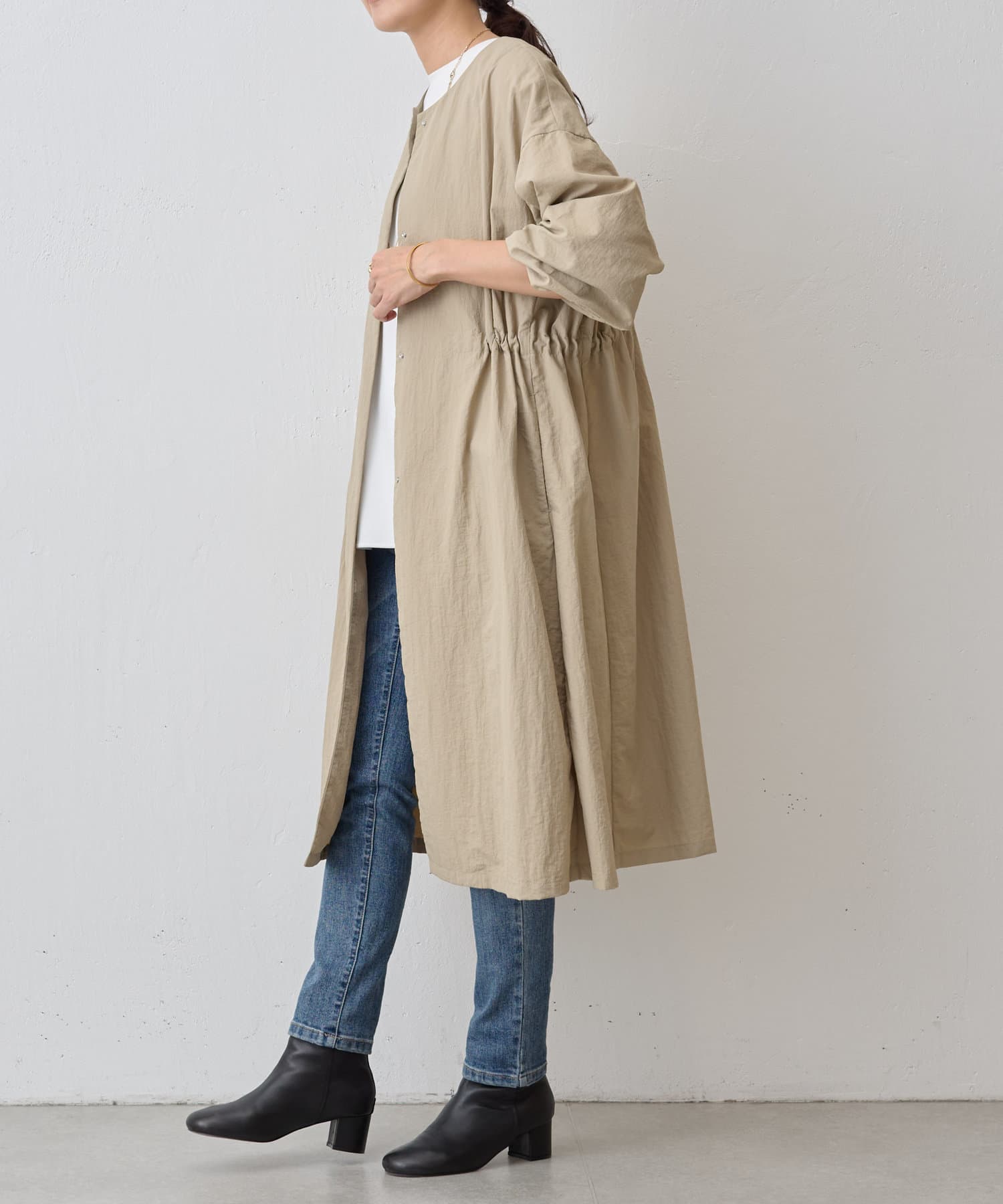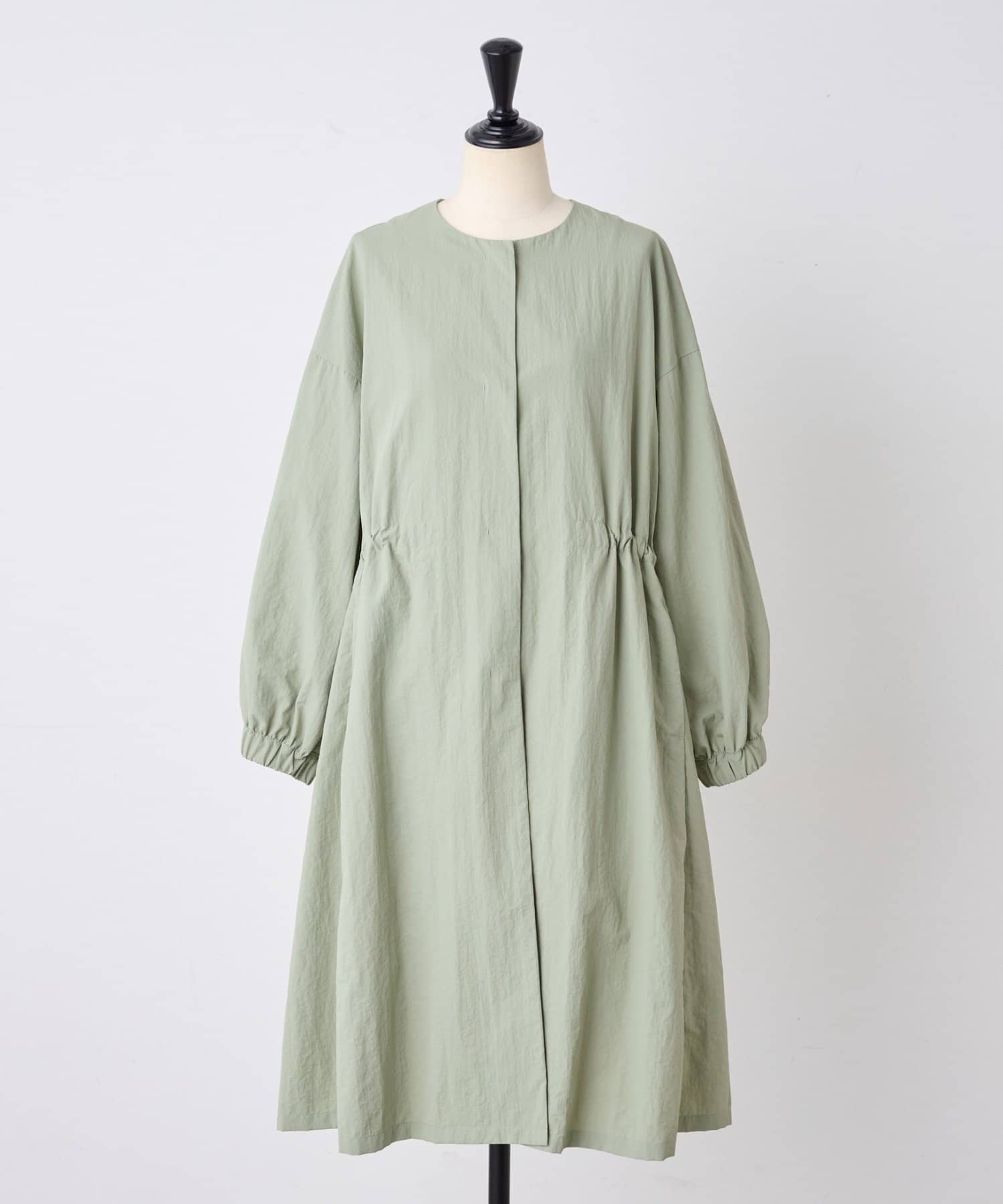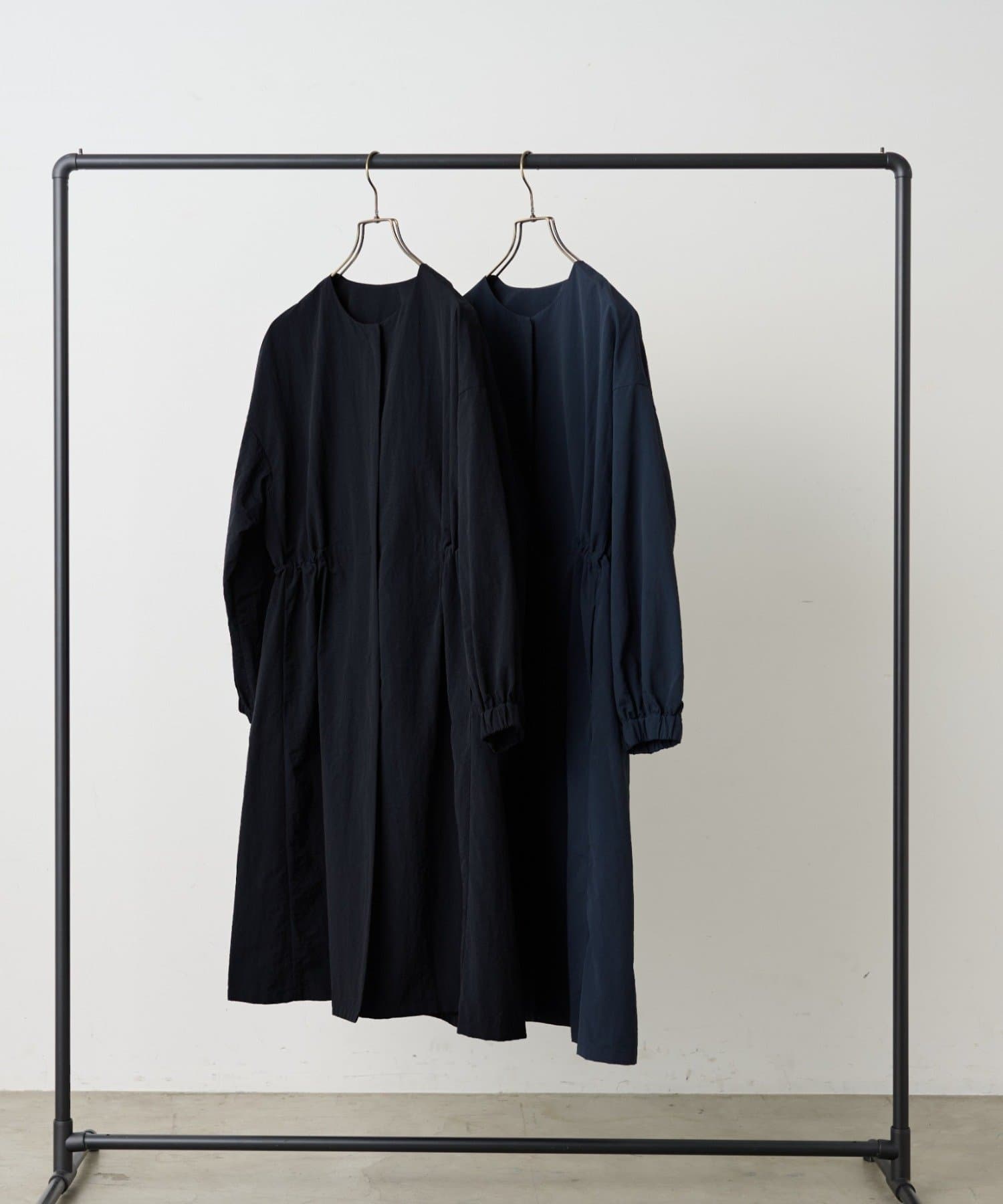 長いシーズン通して活躍するフレアーシルエットのノーカラーコート