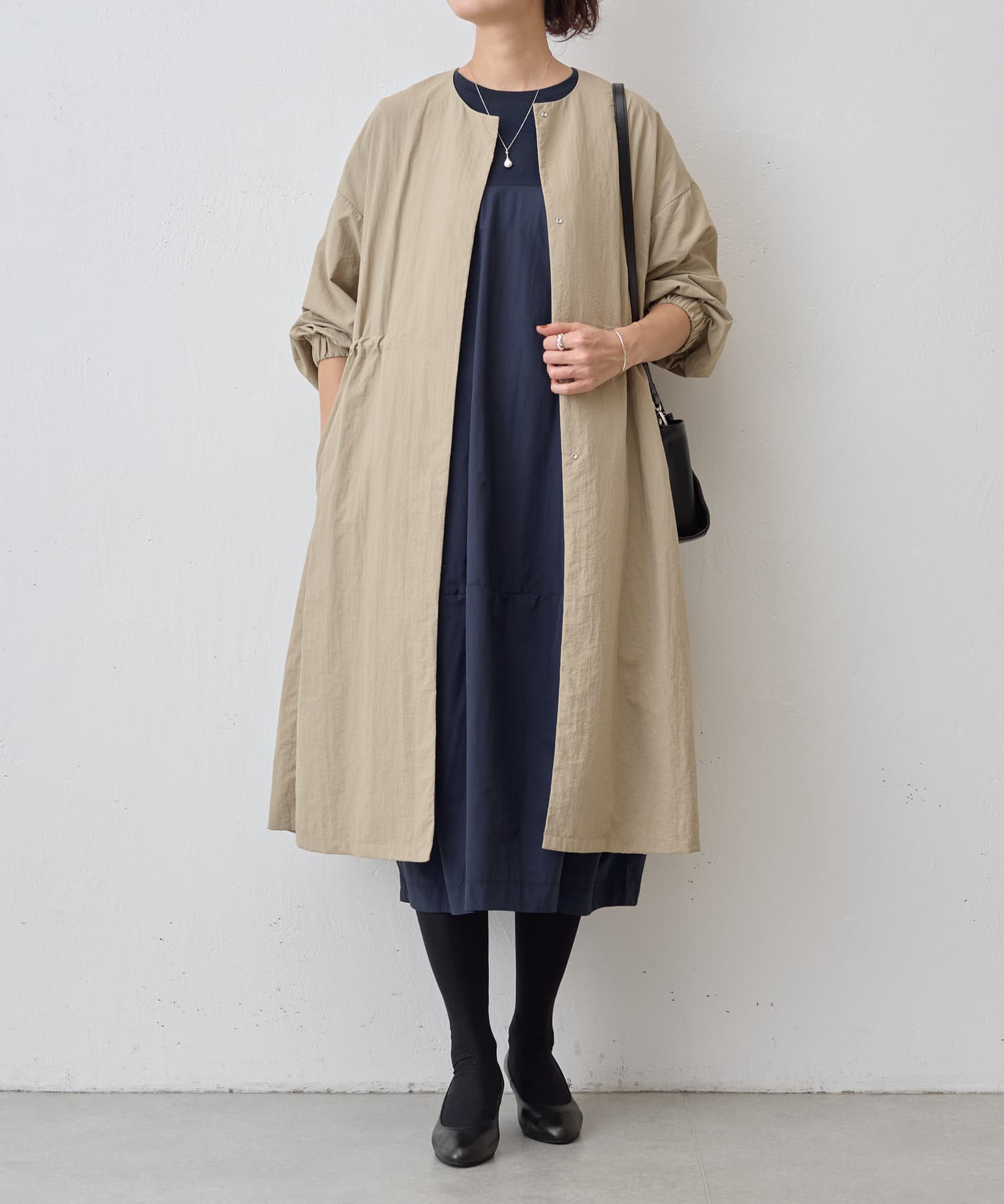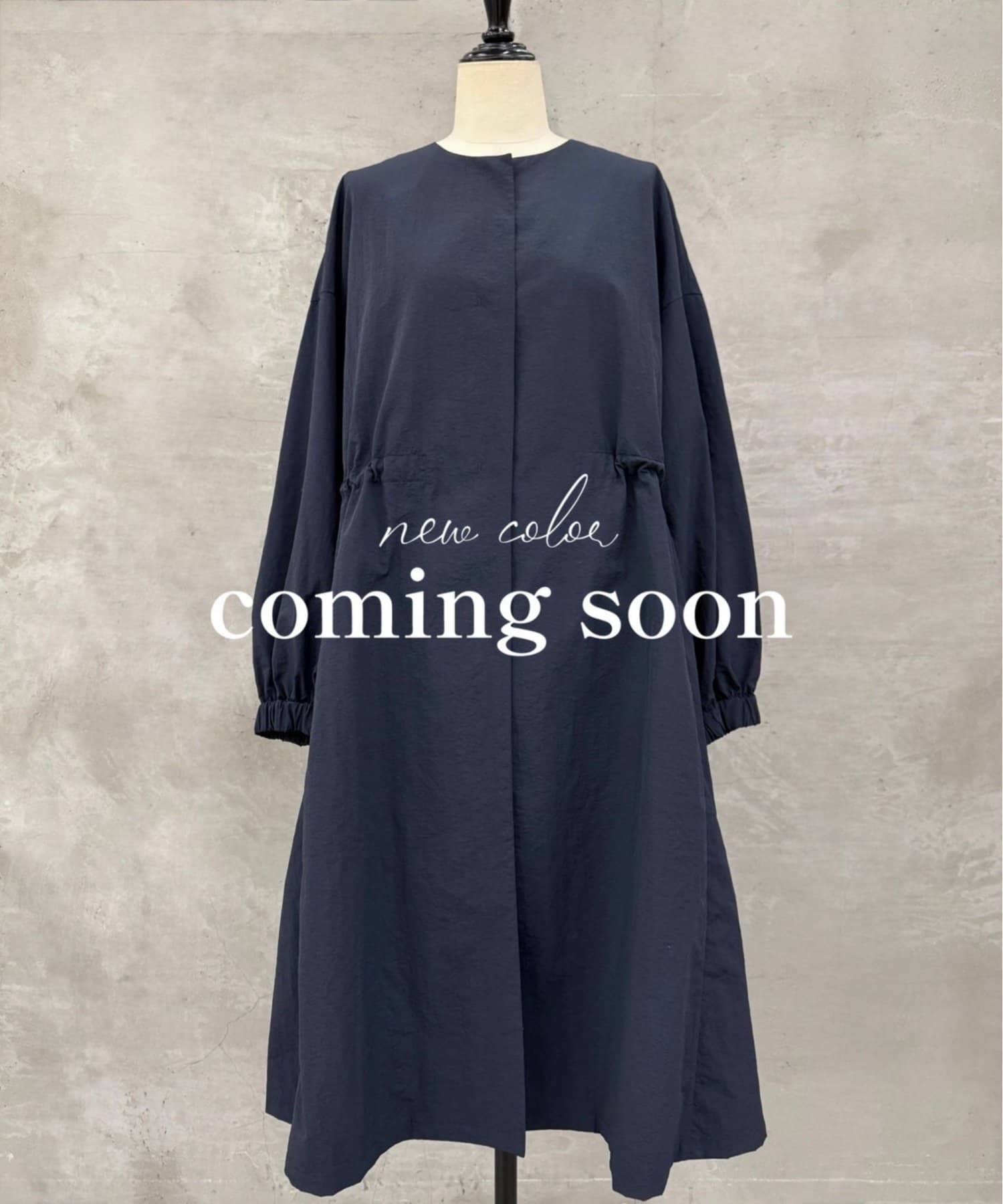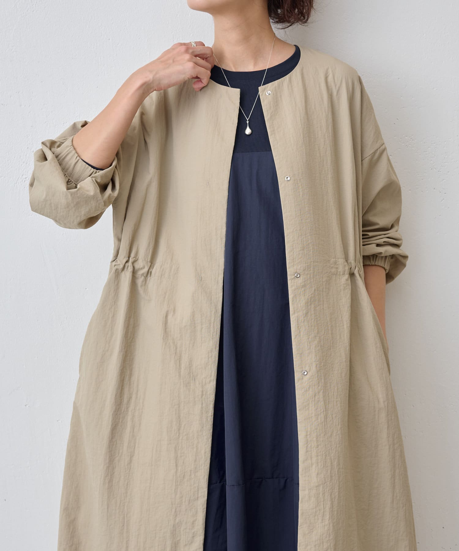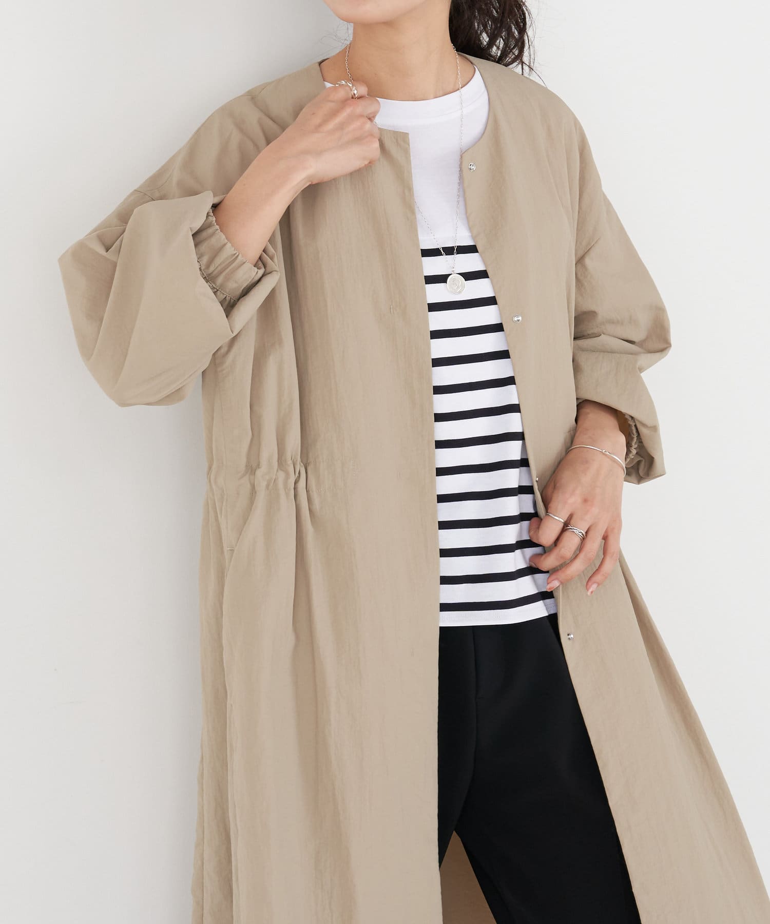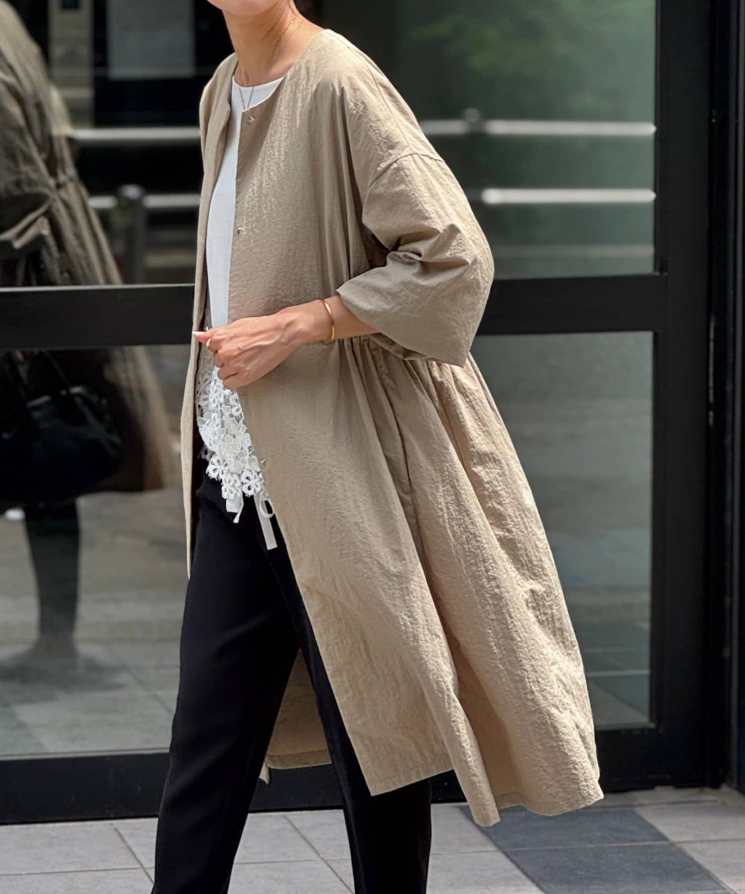 長いシーズン通して活躍するフレアーシルエットのノーカラーコート