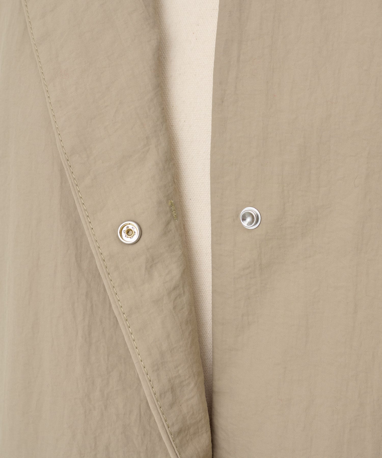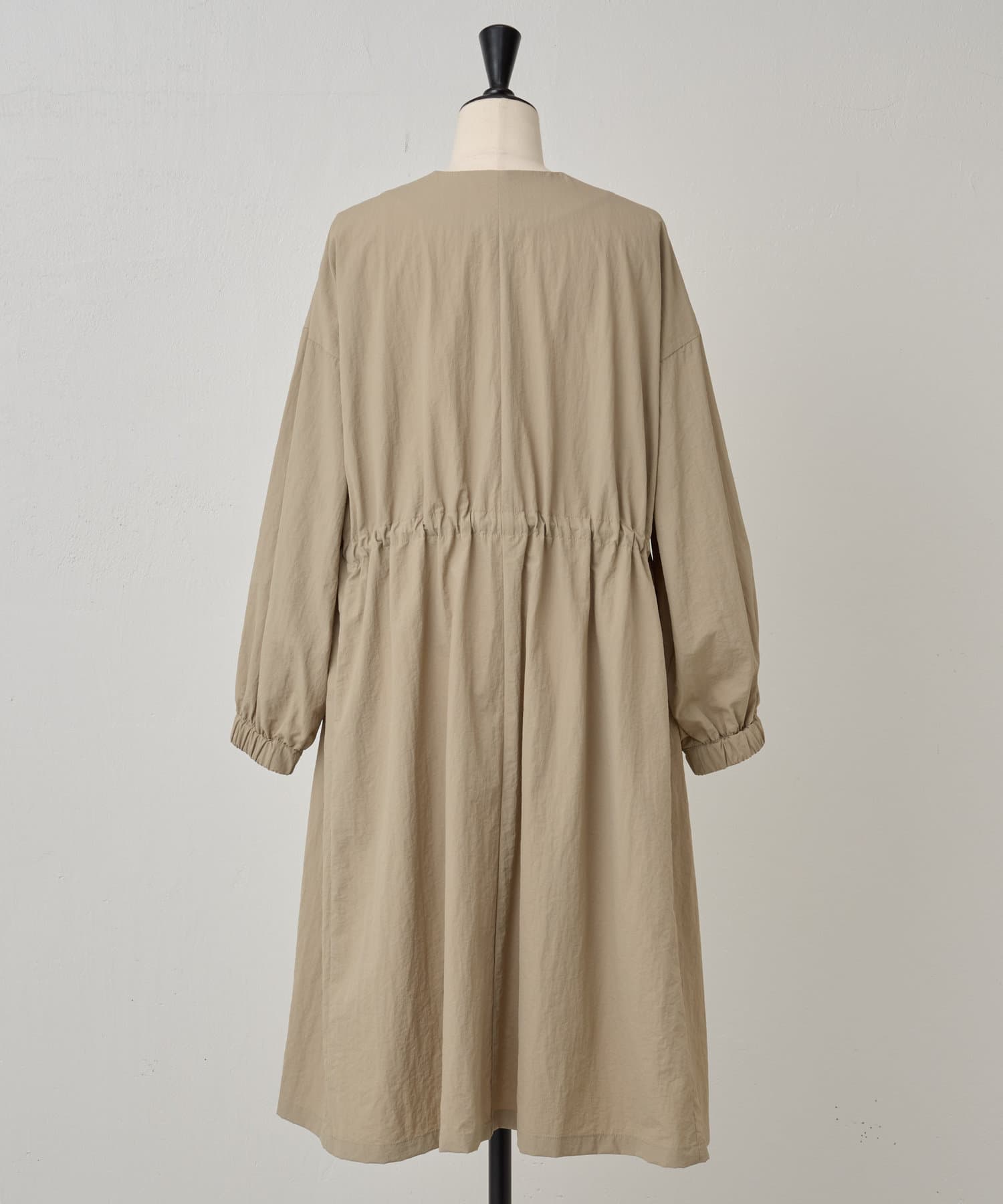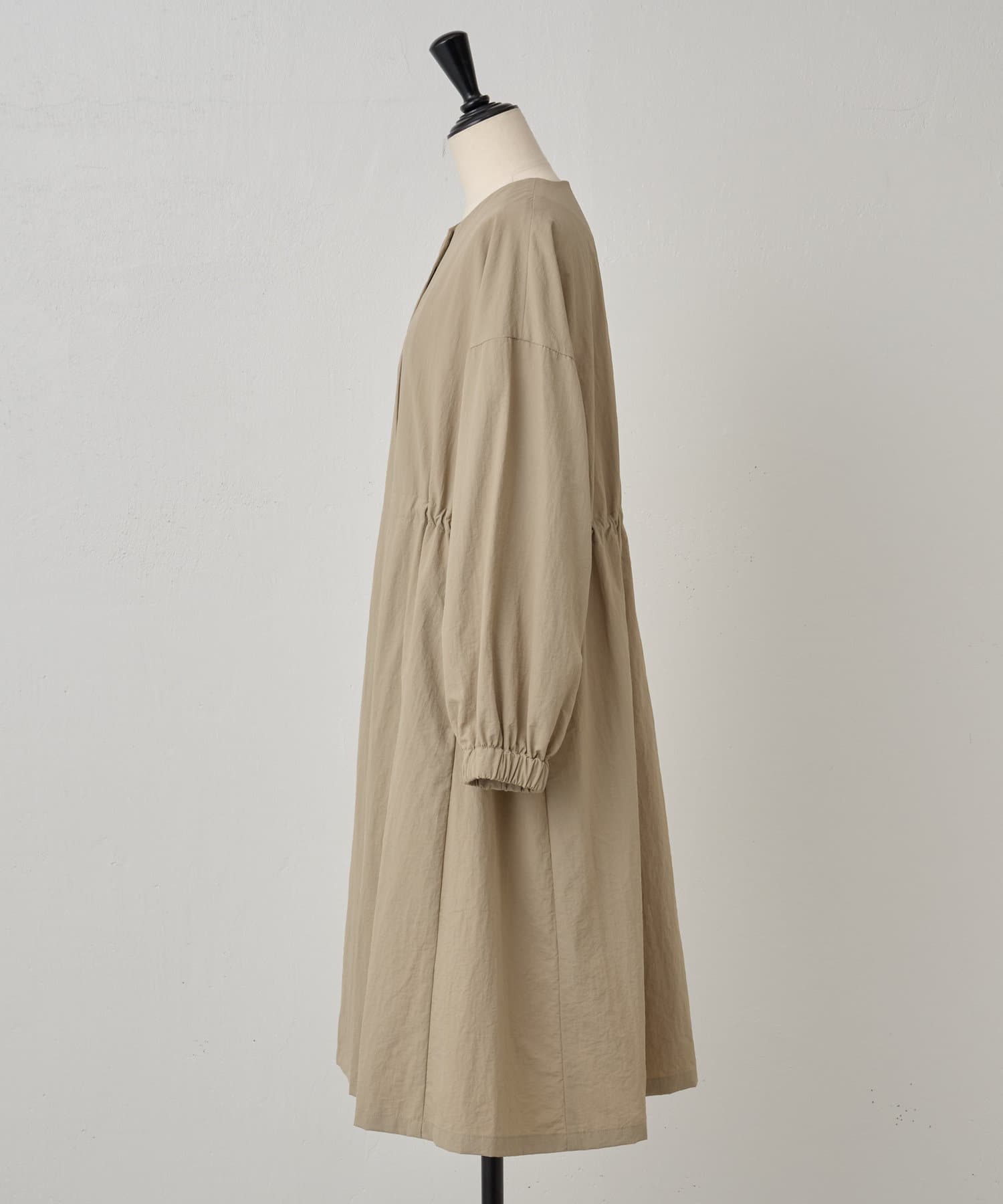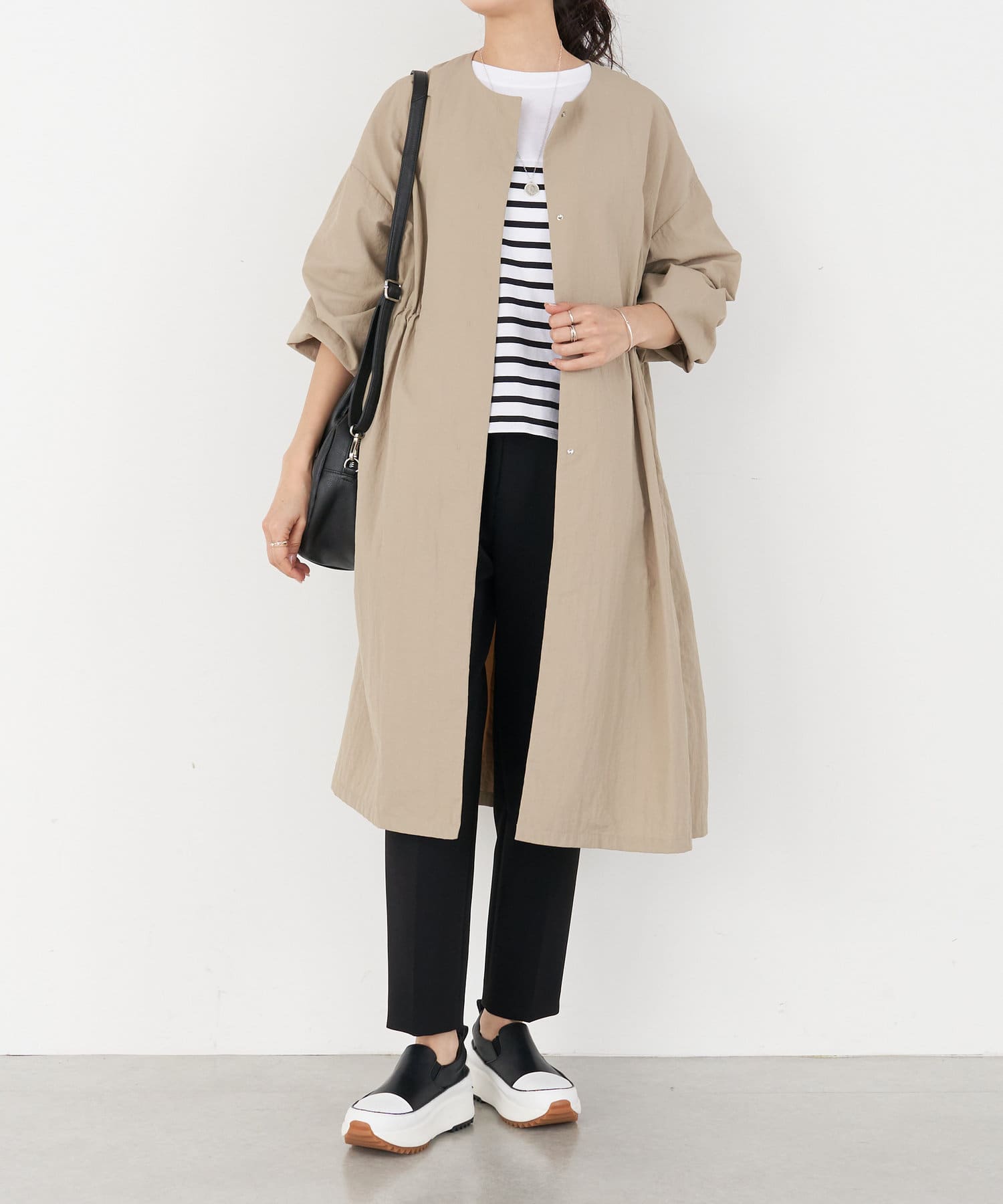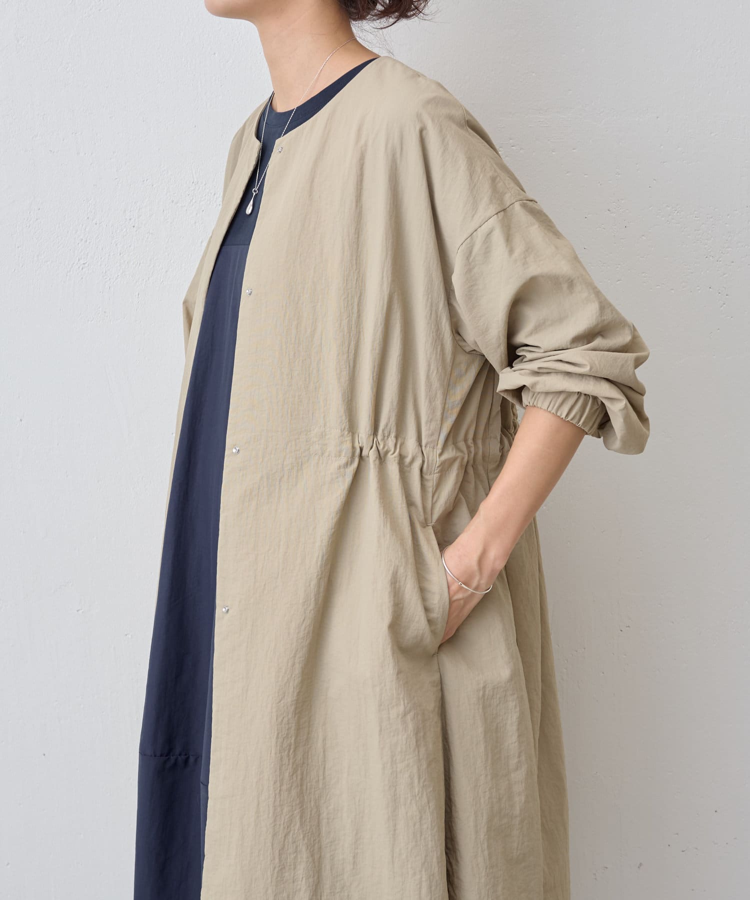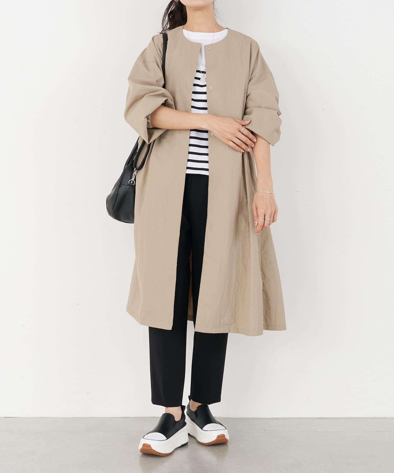 長いシーズン通して活躍するフレアーシルエットのノーカラーコート