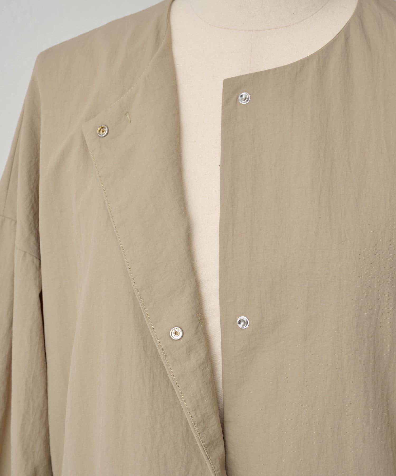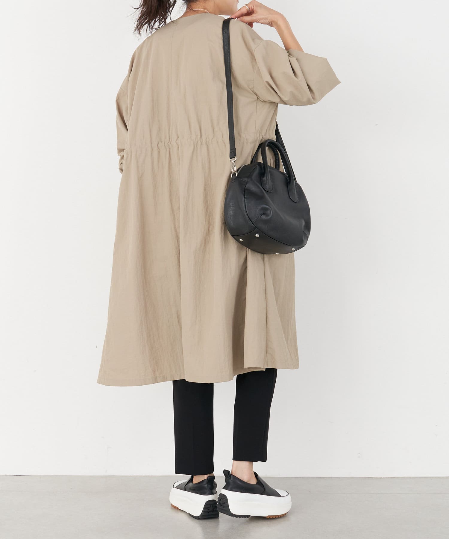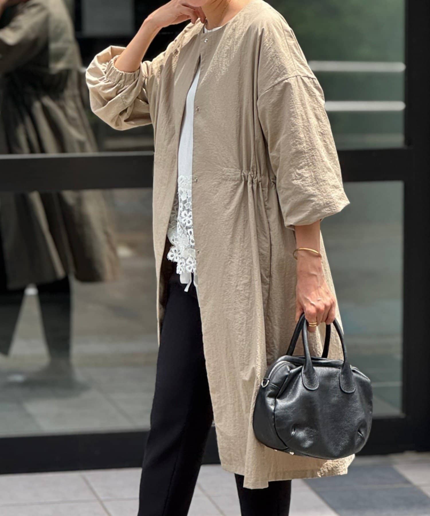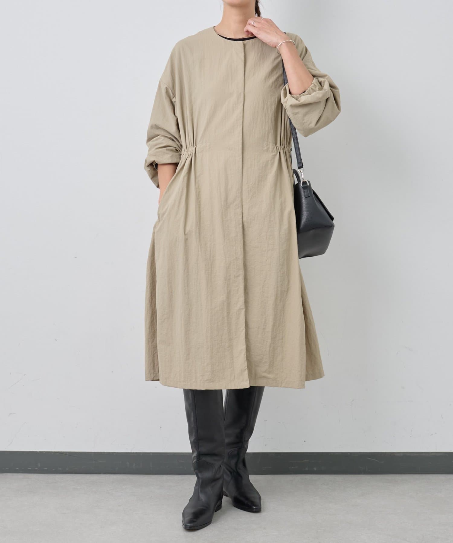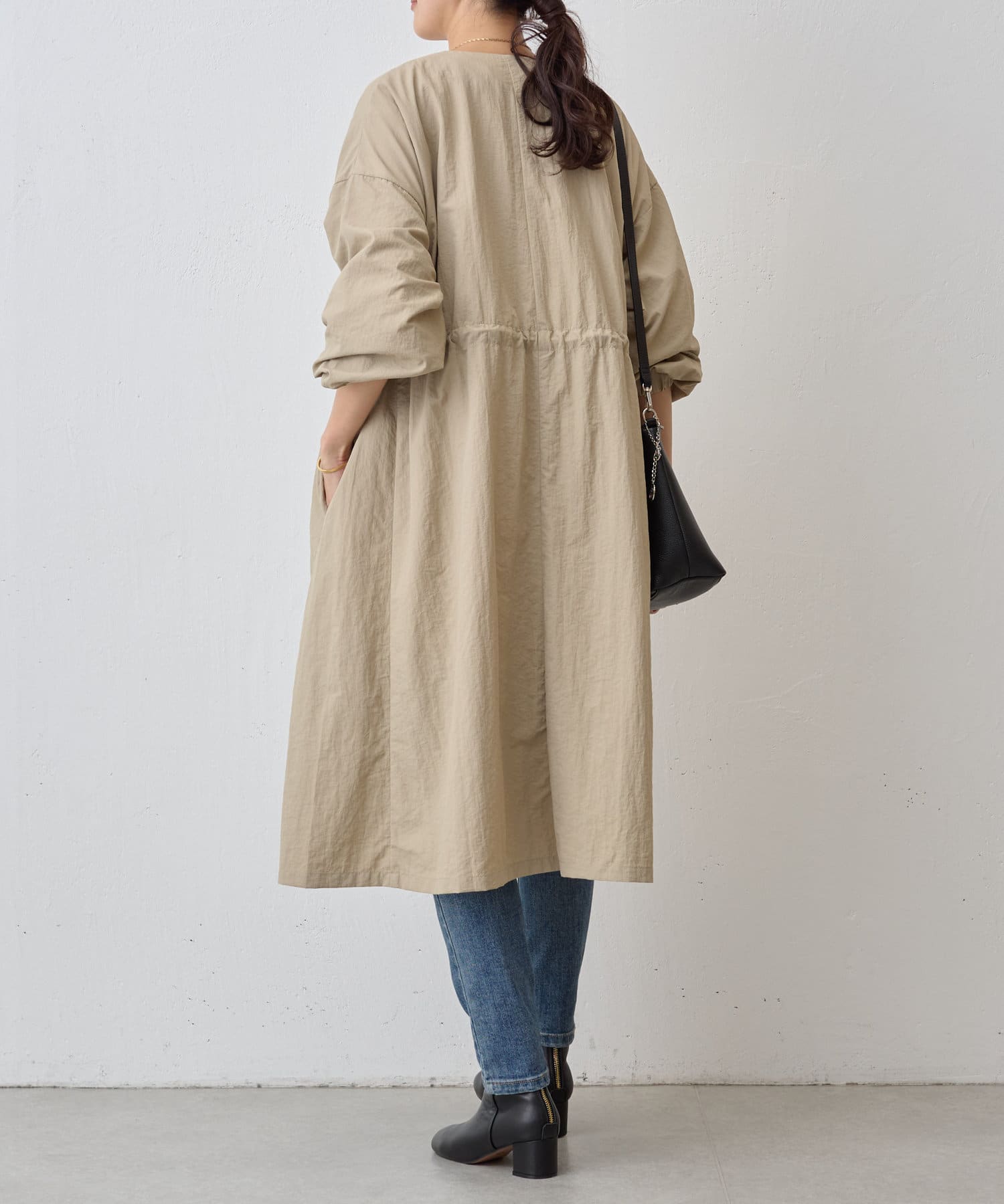長いシーズン通して活躍するフレアーシルエットのノーカラーコート