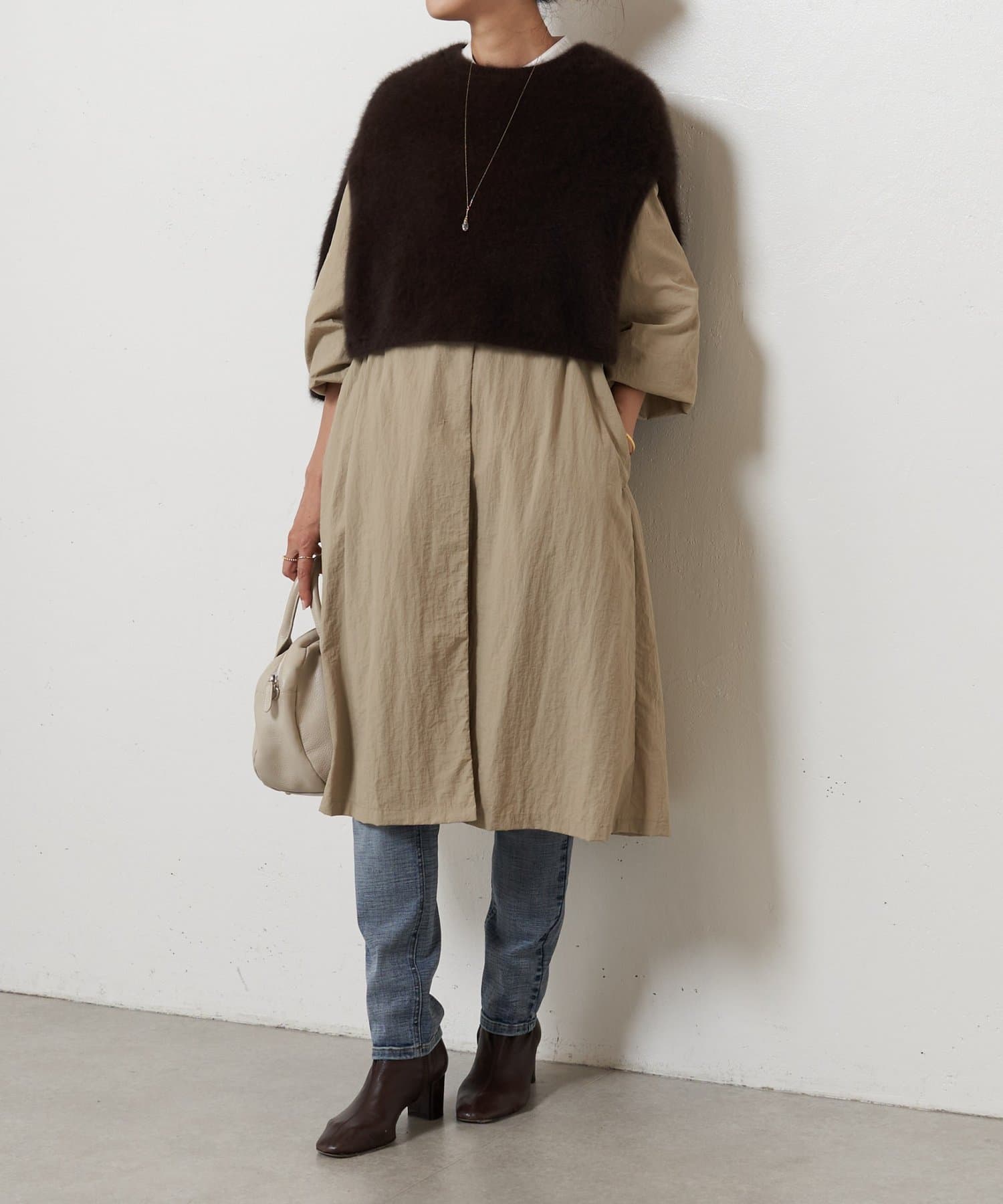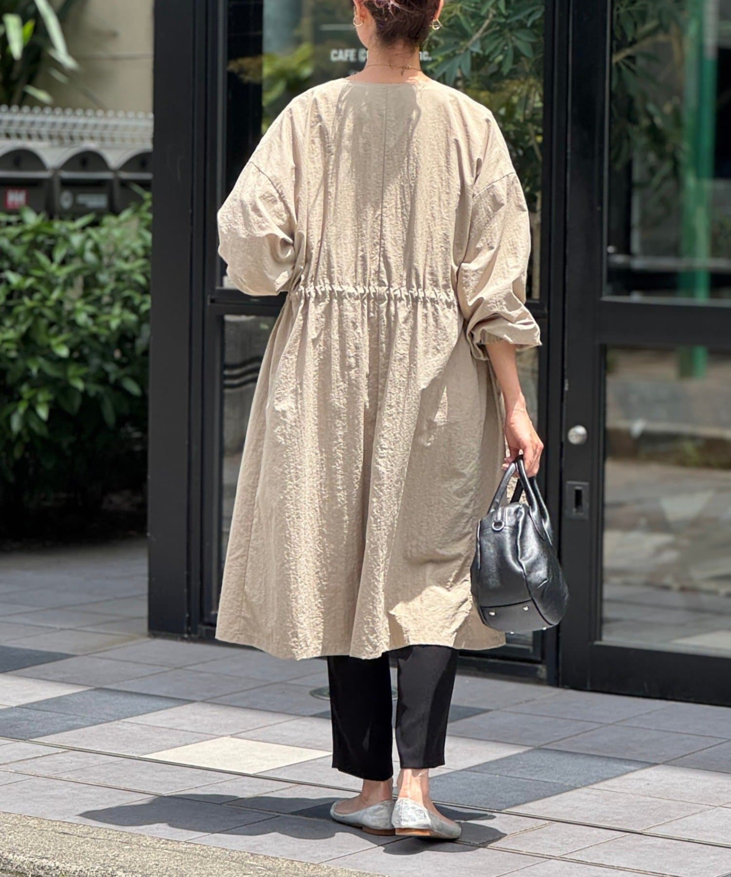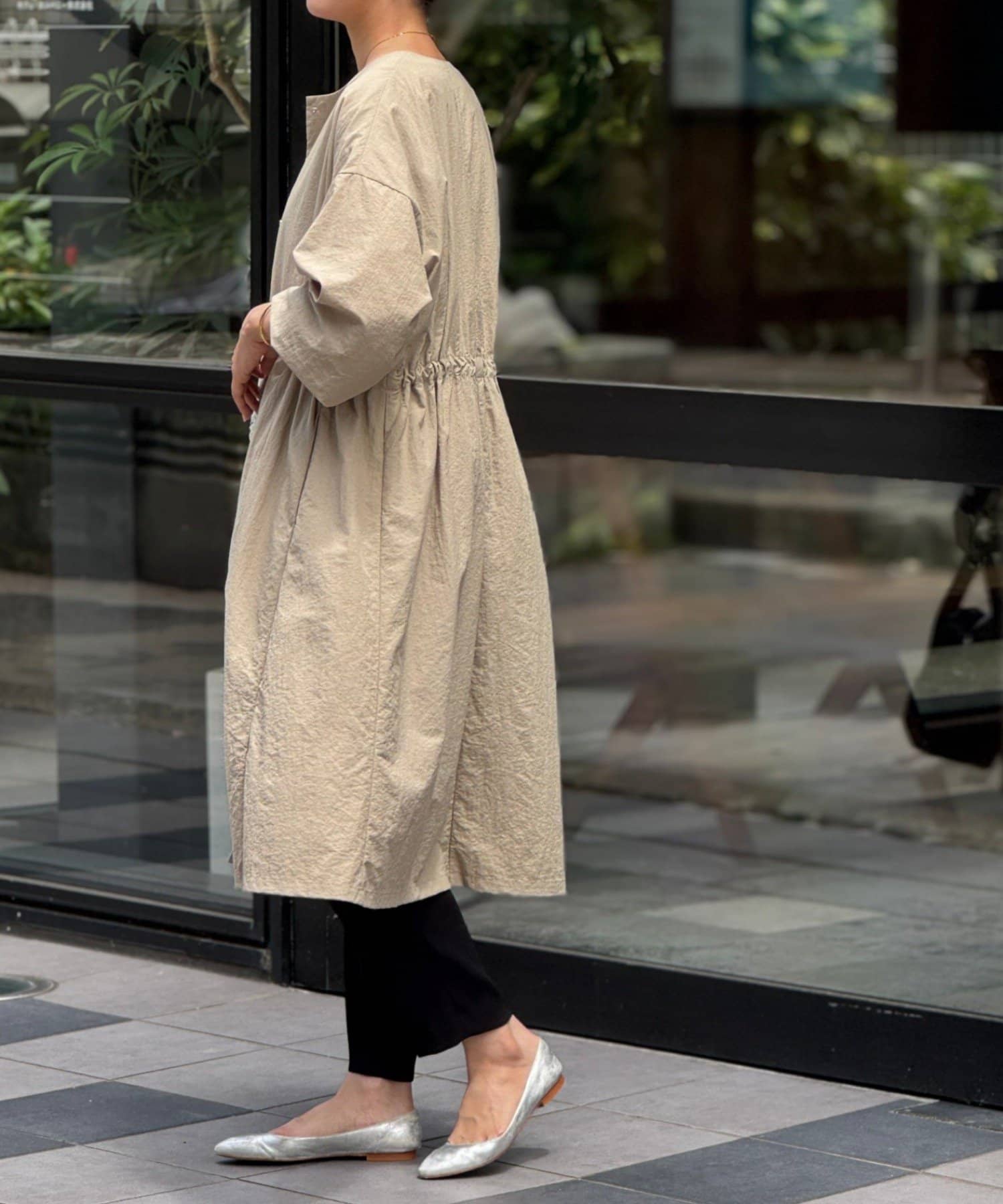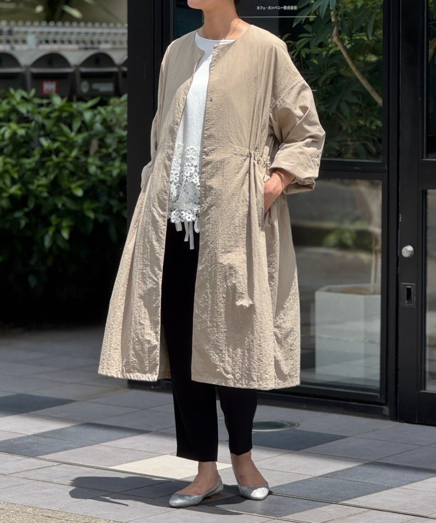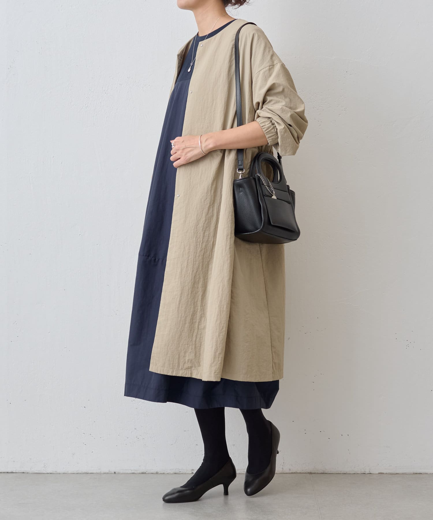 長いシーズン通して活躍するフレアーシルエットのノーカラーコート