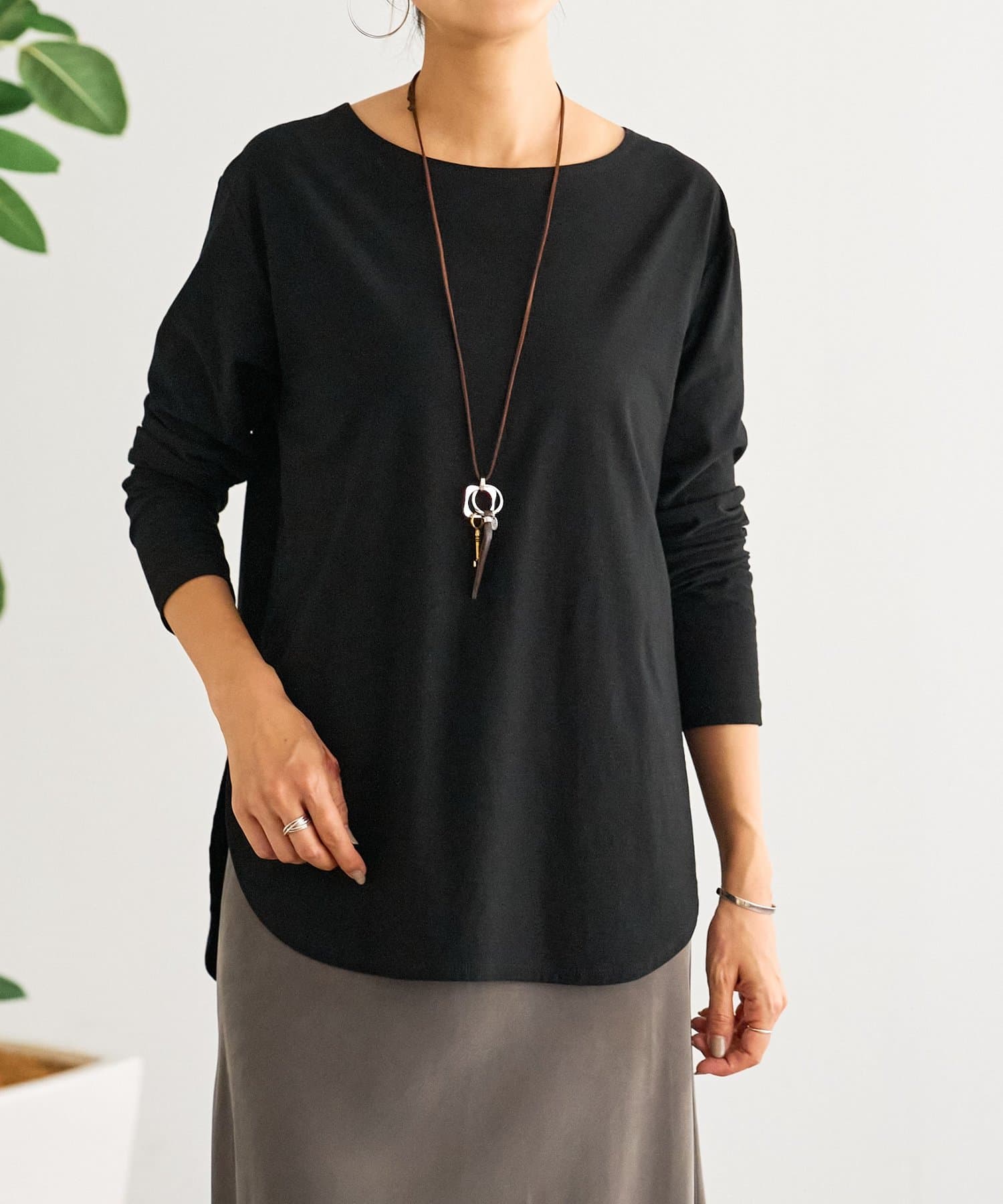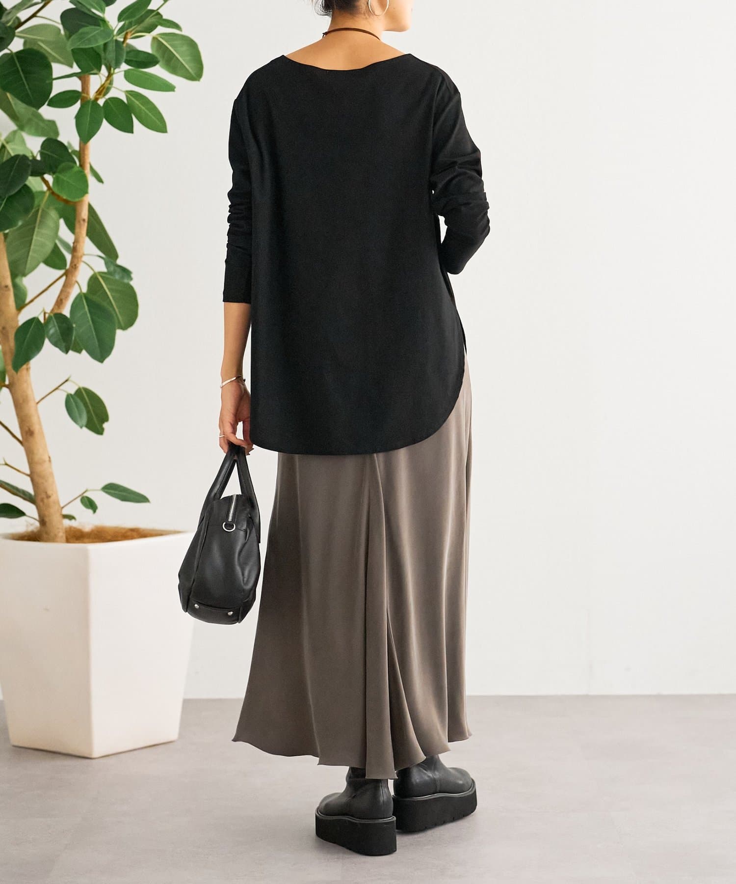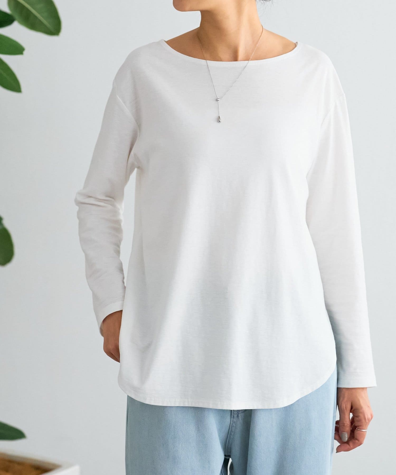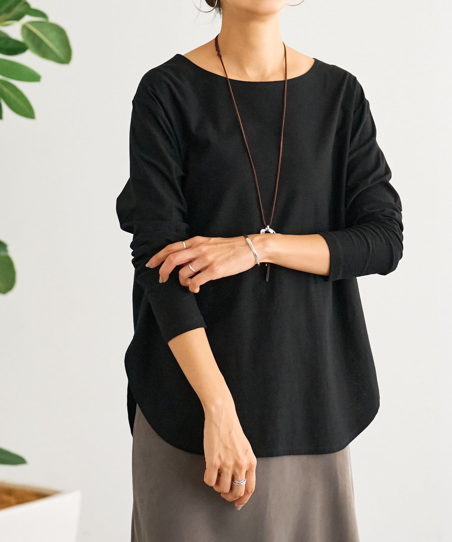 デコルテをきれいに見せてくれるボートネック、ヒップをカバーするレングスは一枚でラフに着られます。