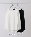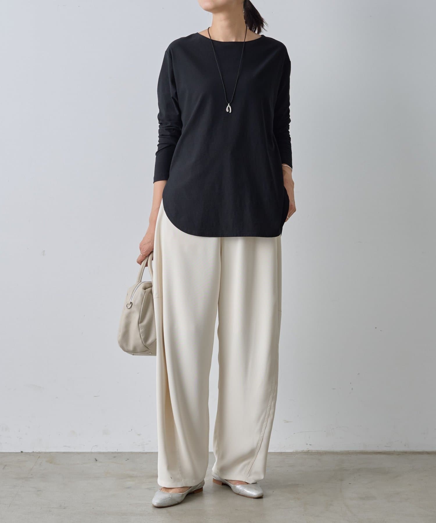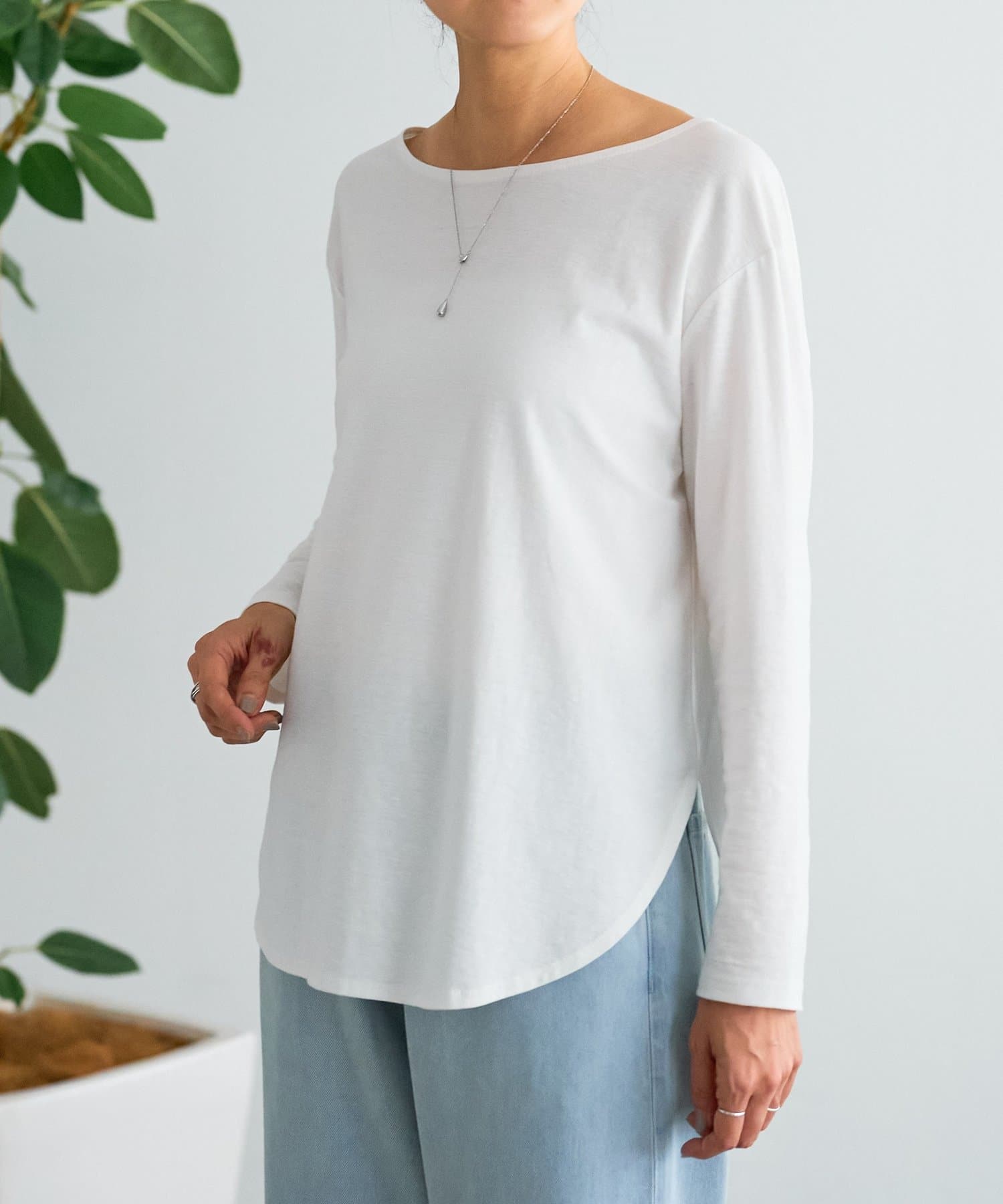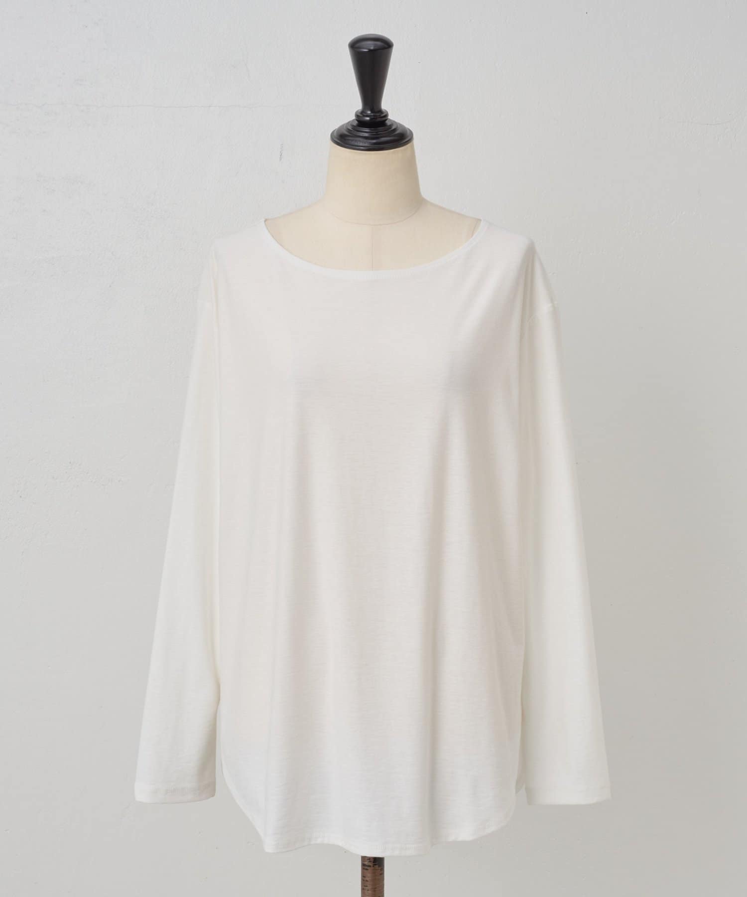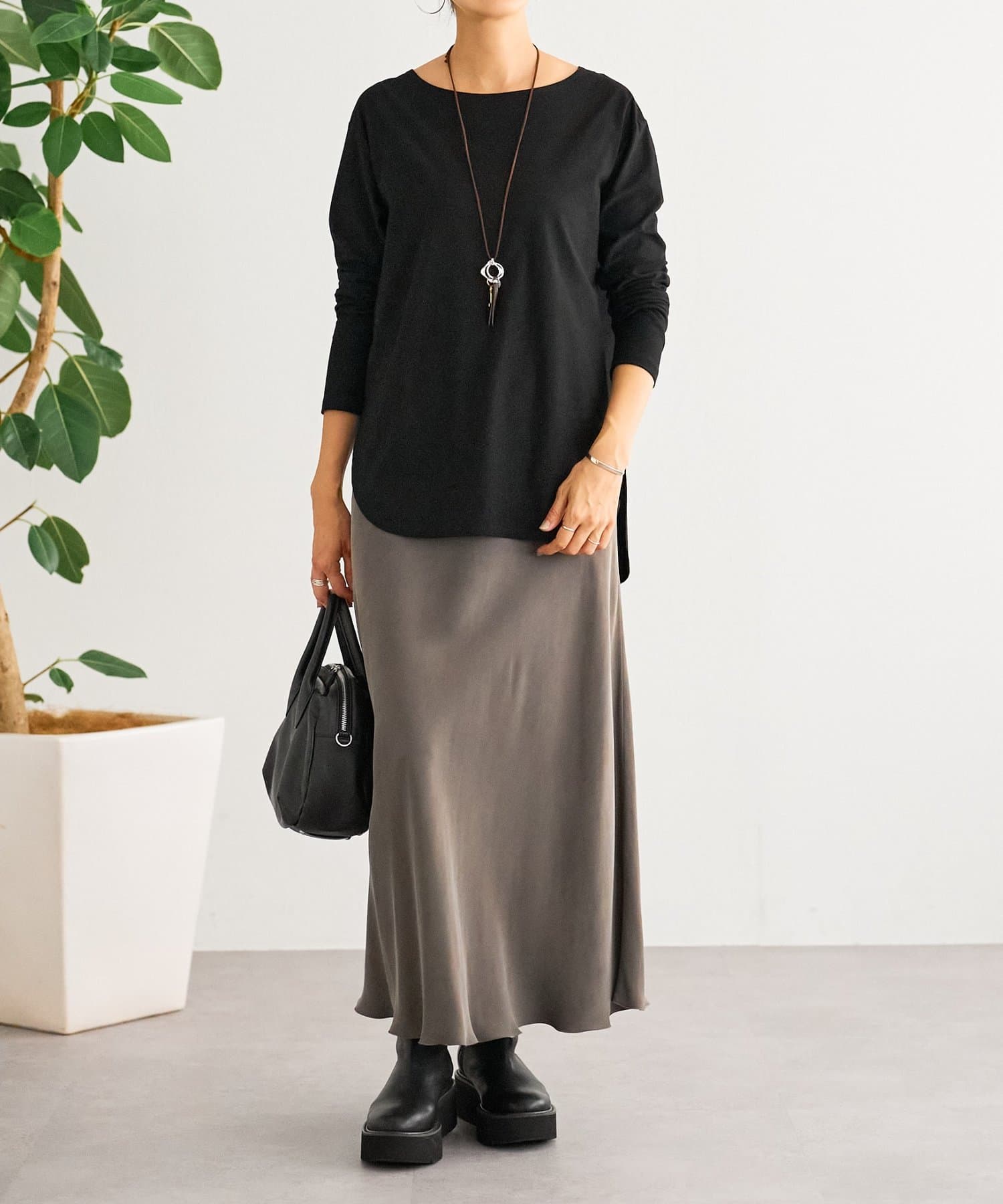 デコルテをきれいに見せてくれるボートネック、ヒップをカバーするレングスは一枚でラフに着られます。