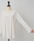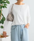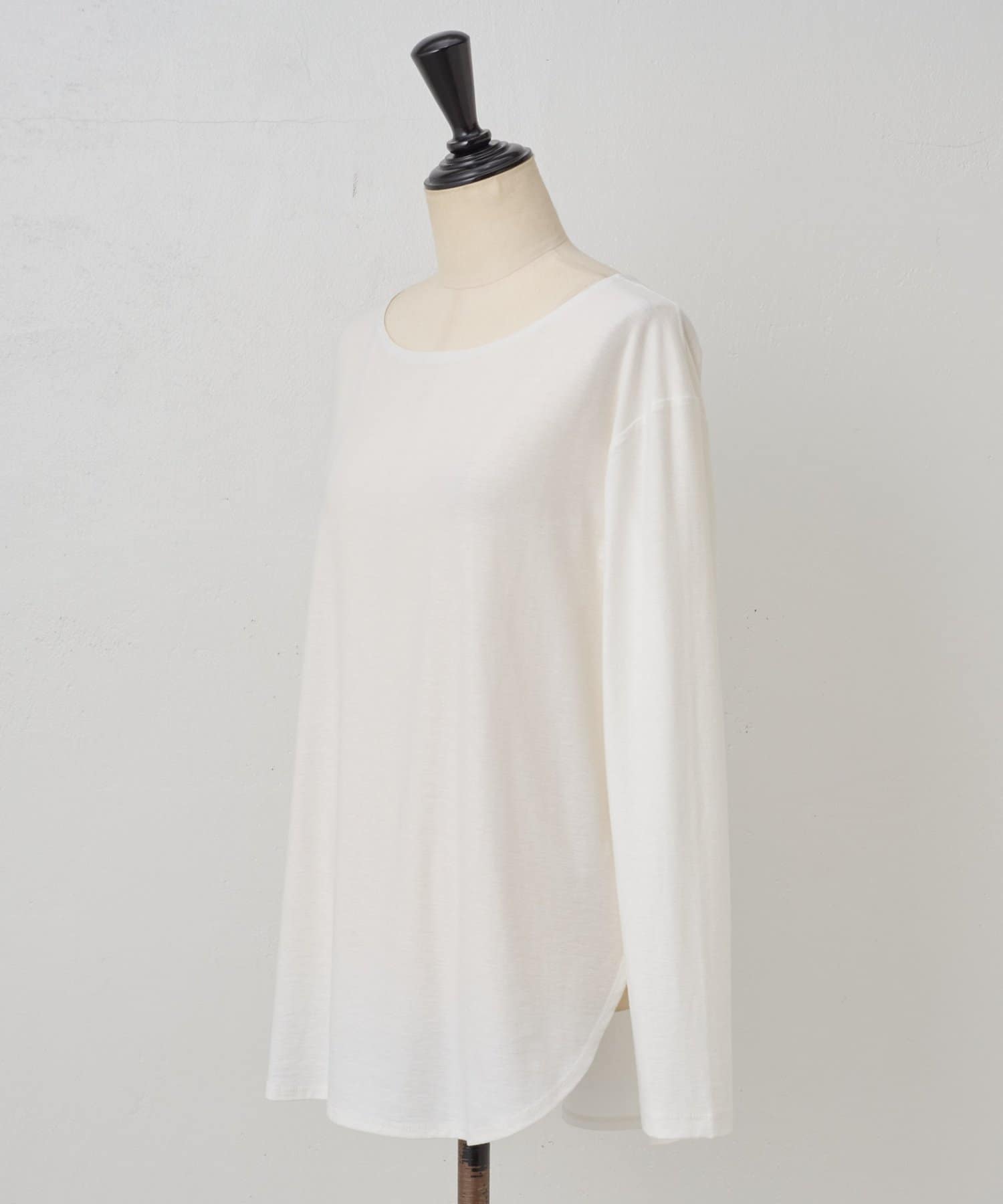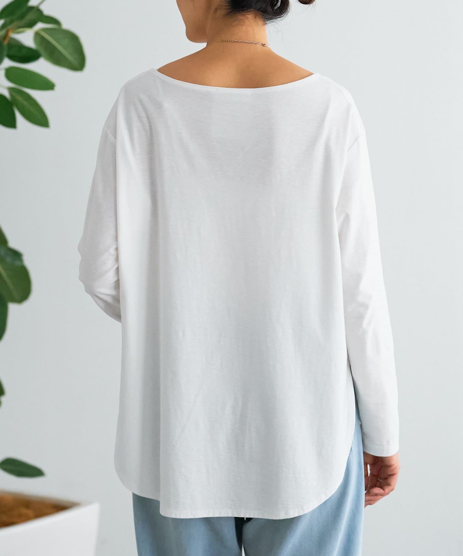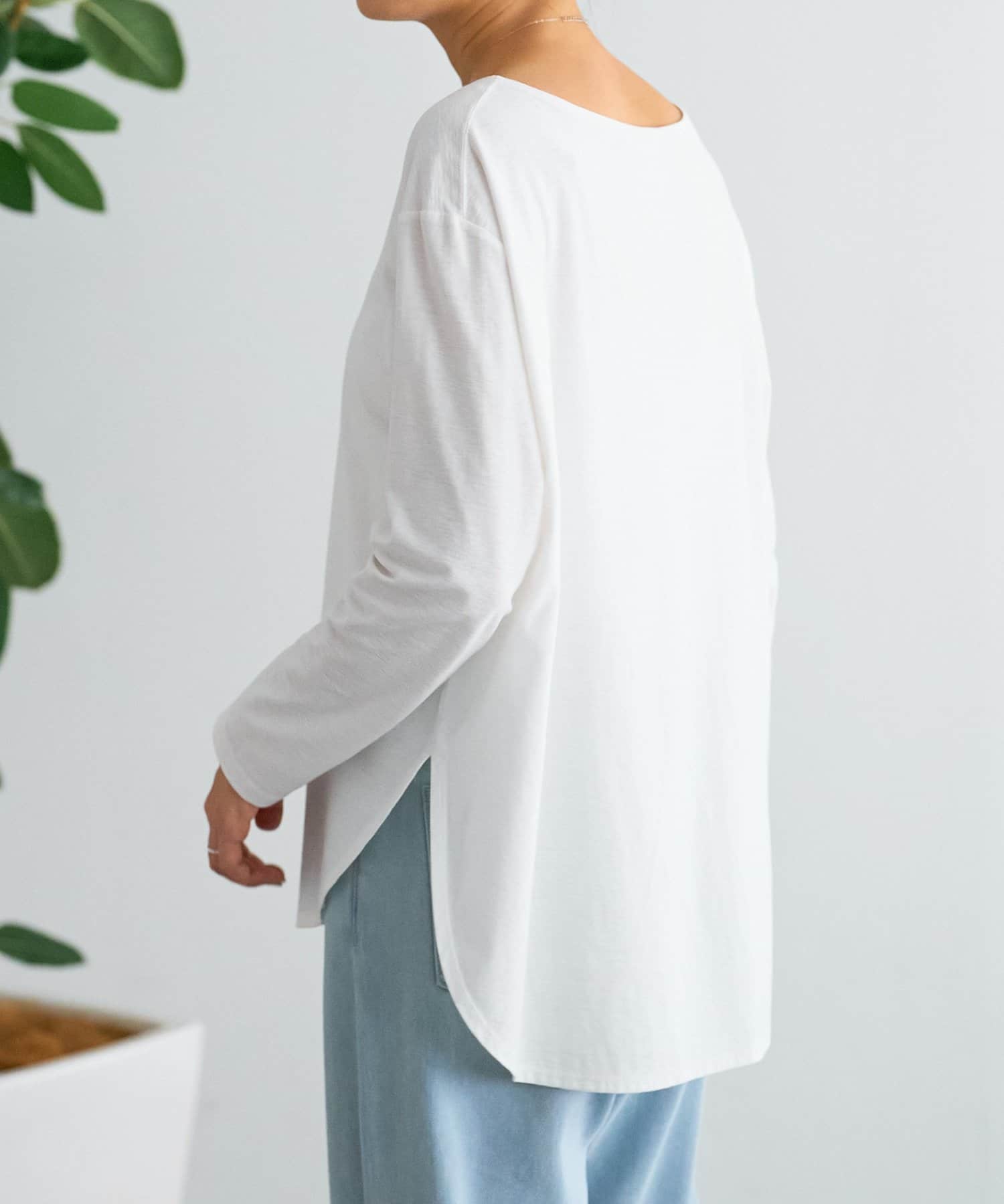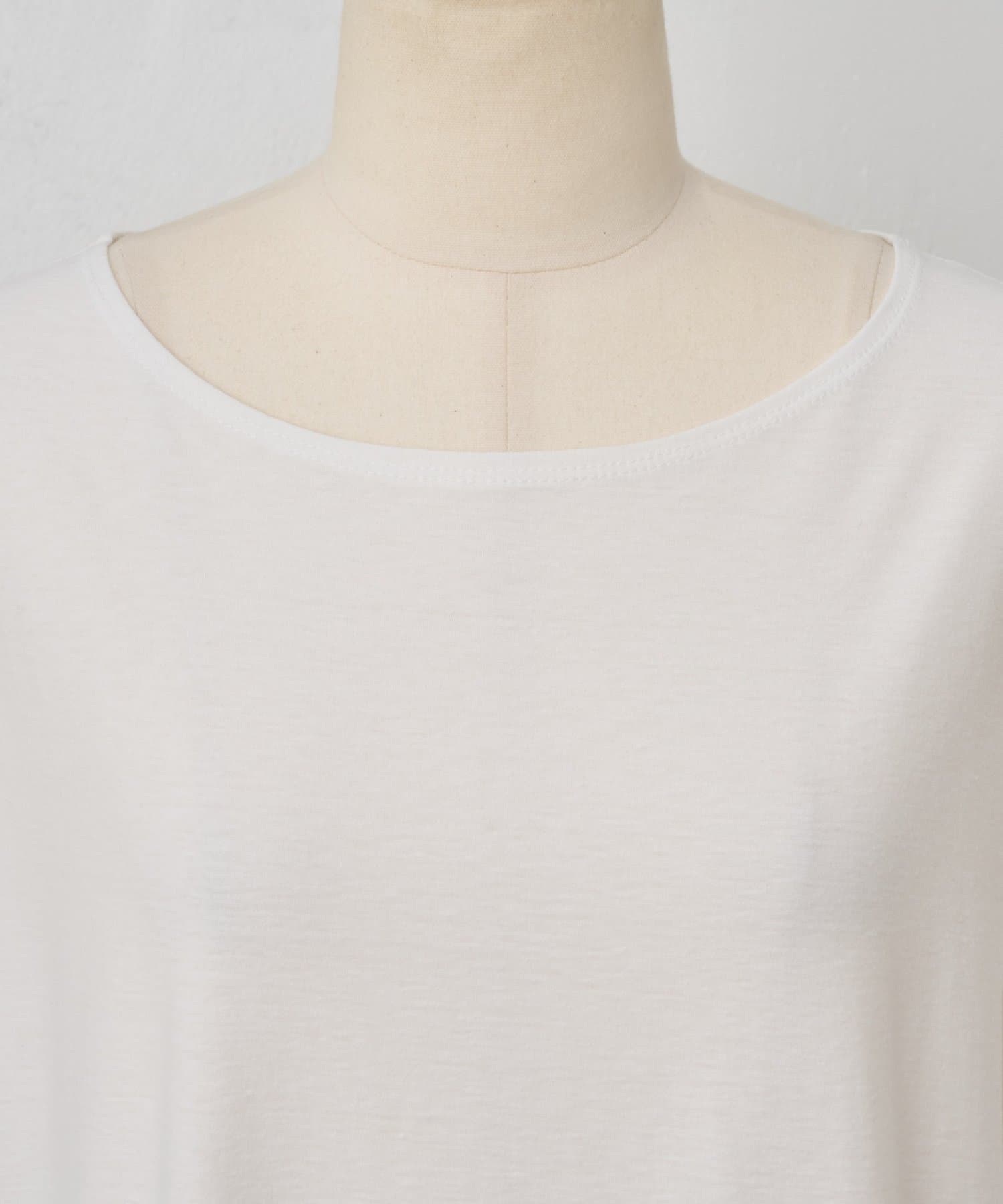デコルテをきれいに見せてくれるボートネック、ヒップをカバーするレングスは一枚でラフに着られます。