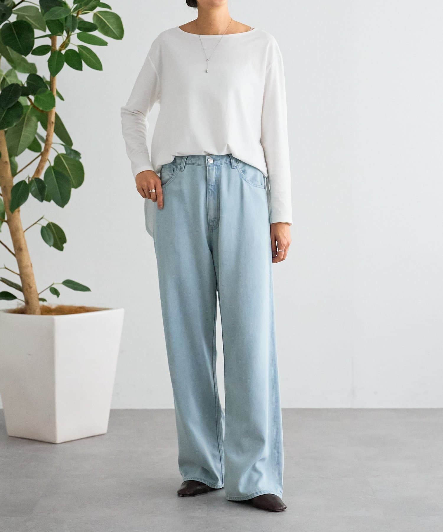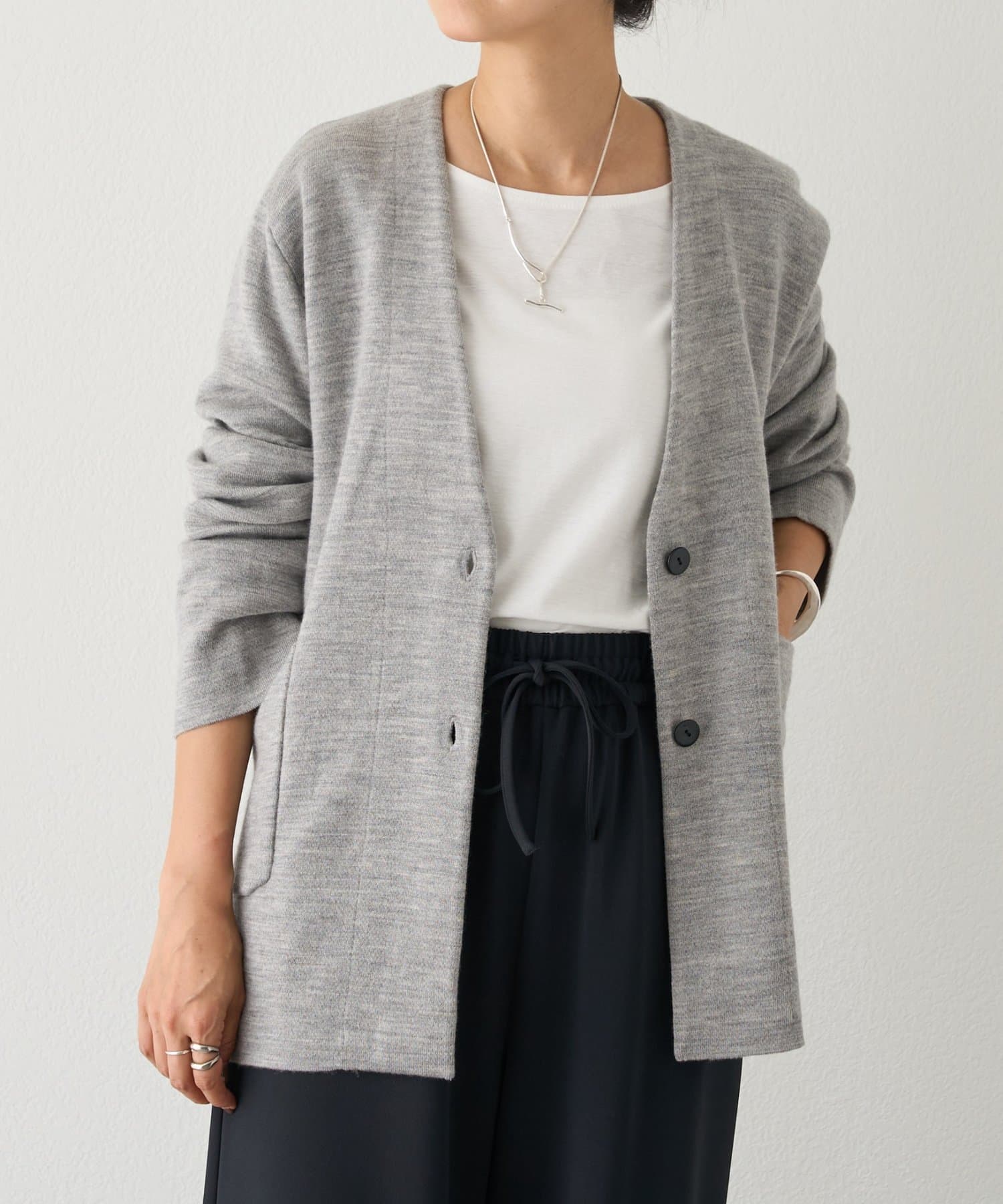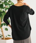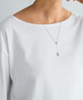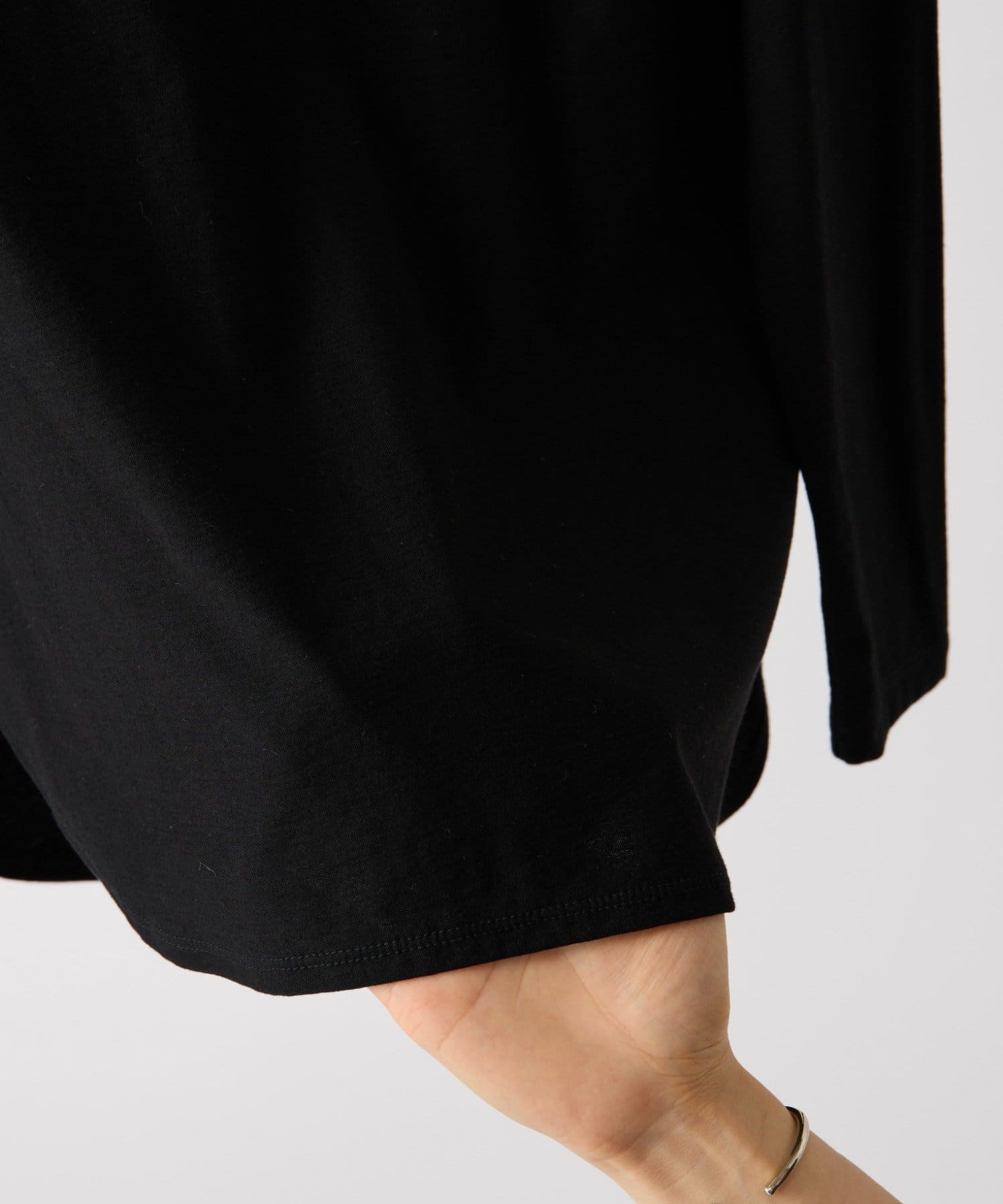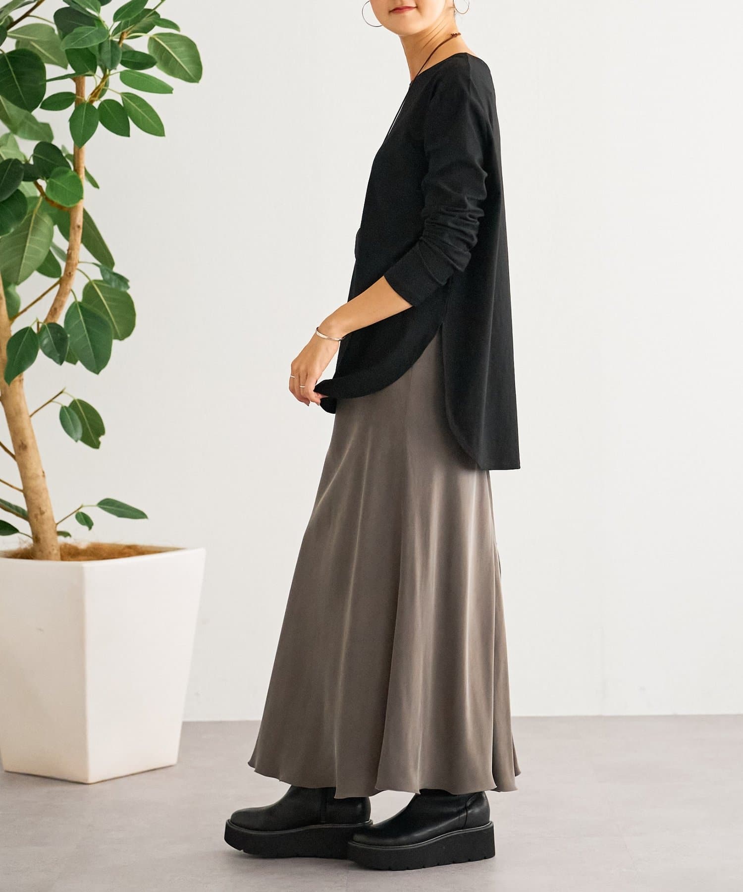 デコルテをきれいに見せてくれるボートネック、ヒップをカバーするレングスは一枚でラフに着られます。