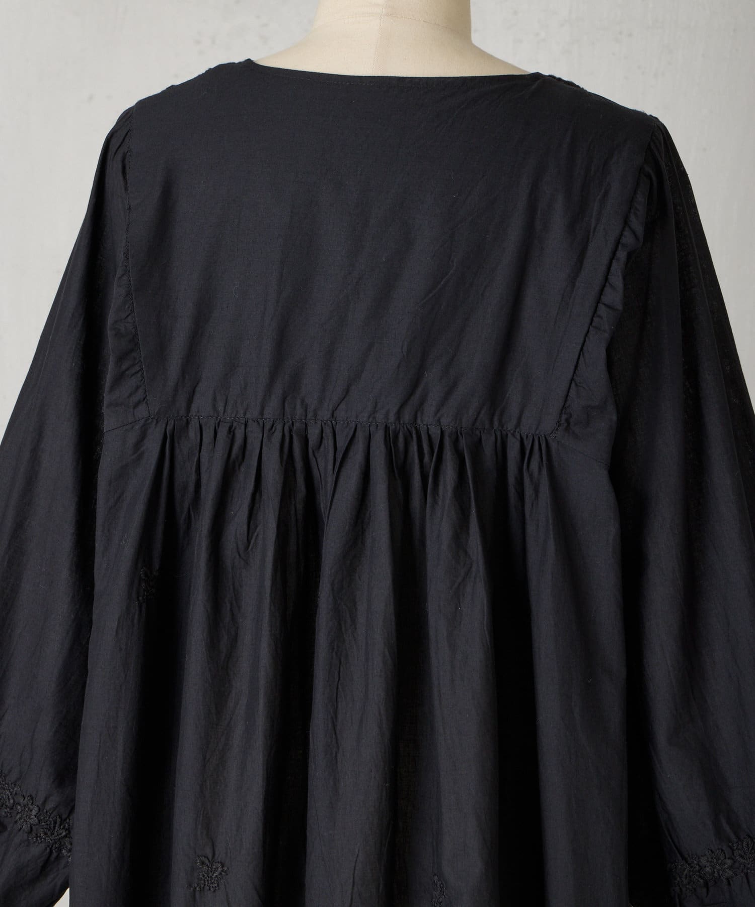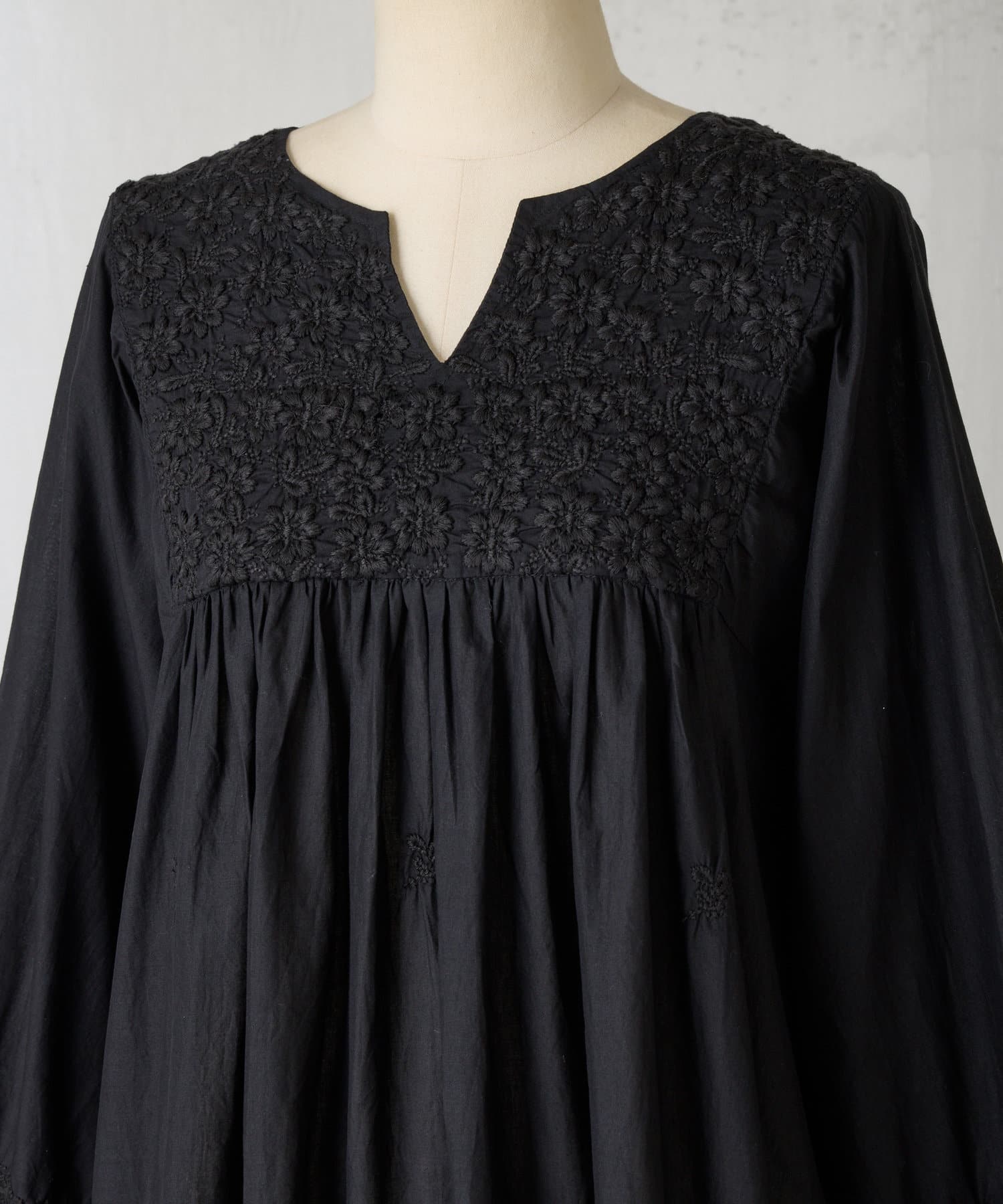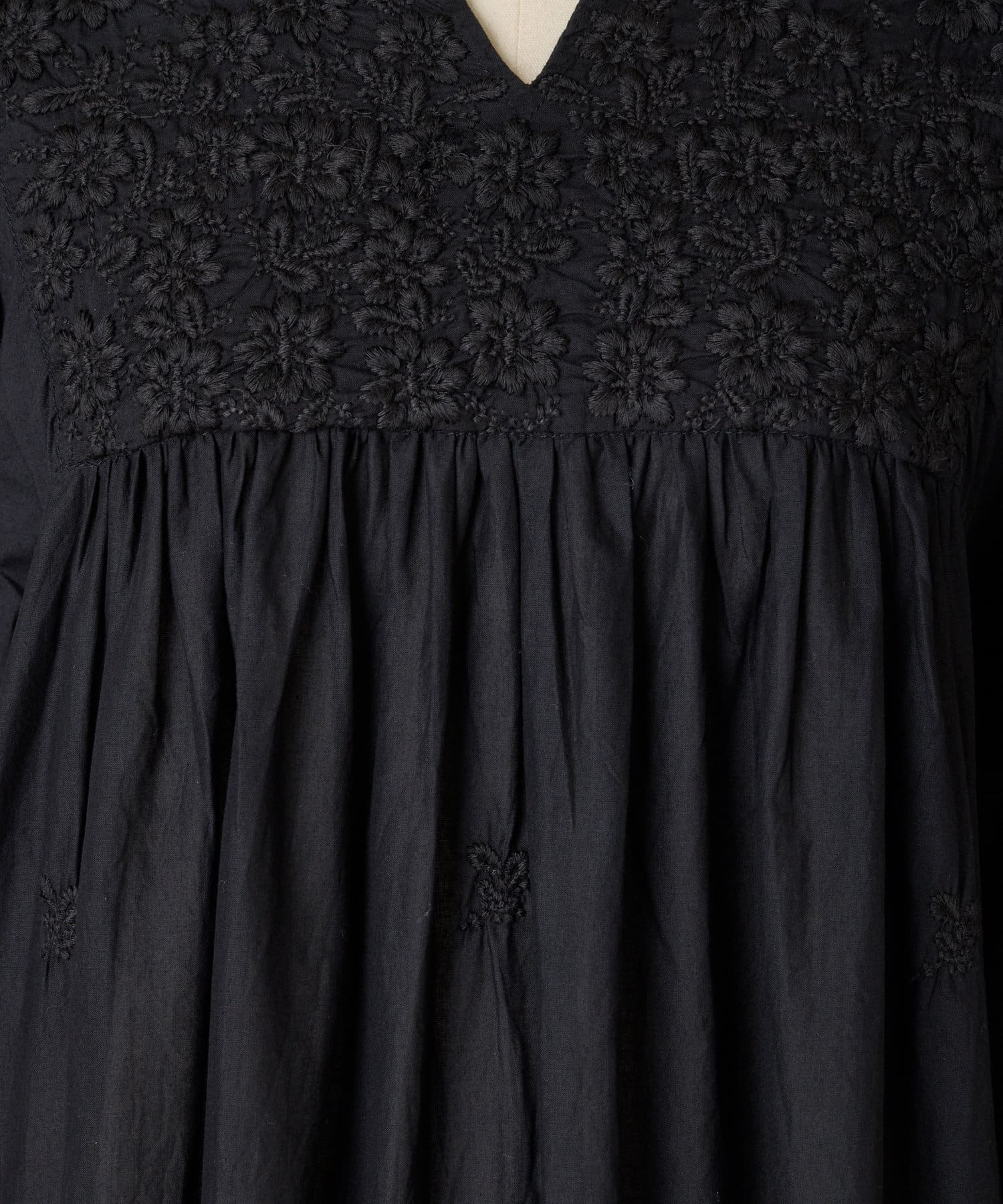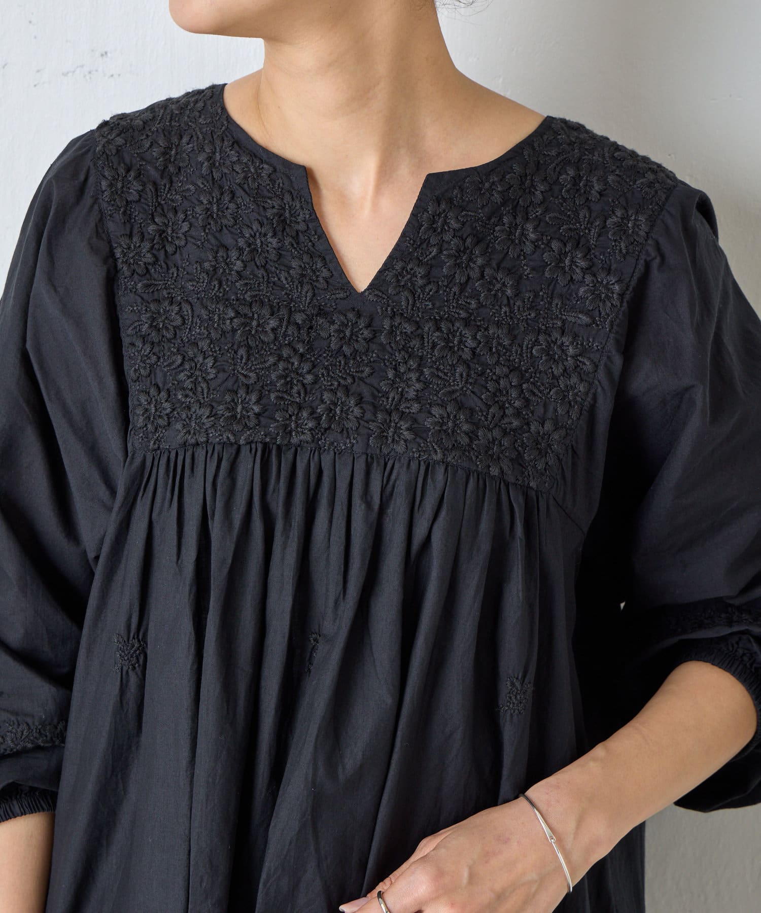 胸元と袖口だけでなく身頃にもあしらわれた繊細な刺繍が、シンプルながらも印象的なデザイン。