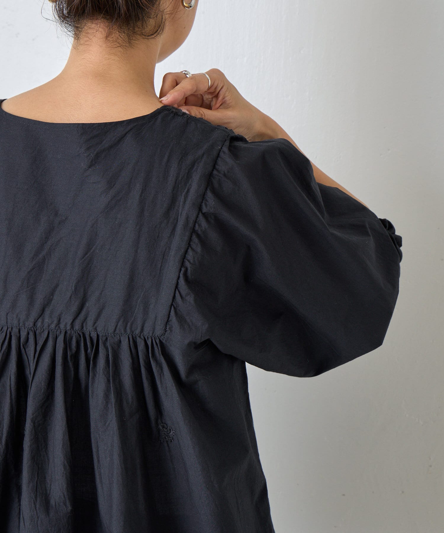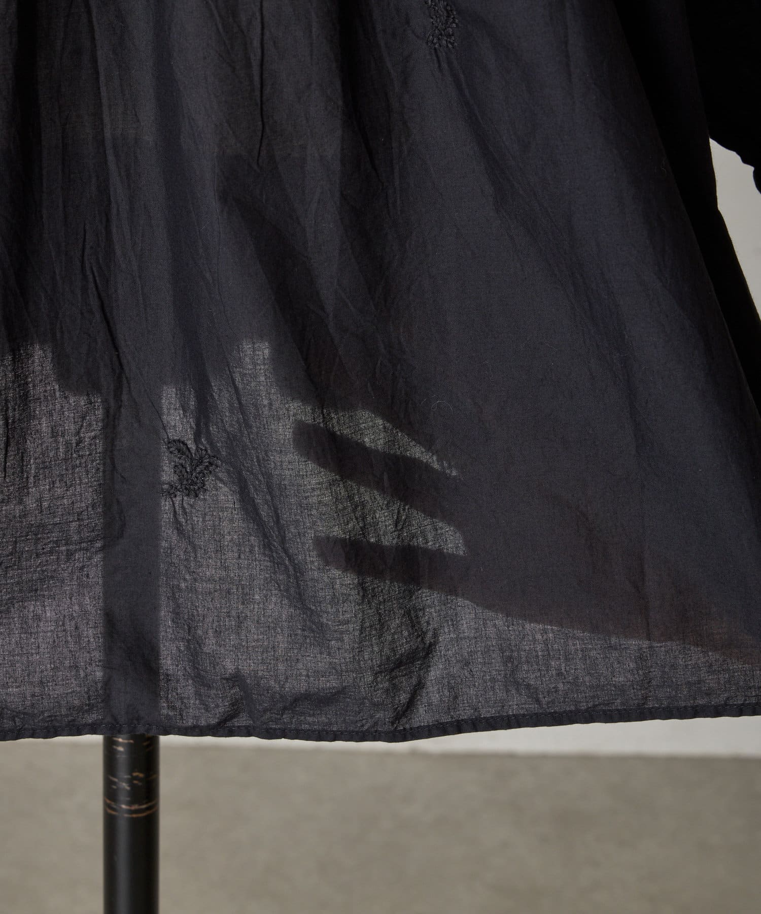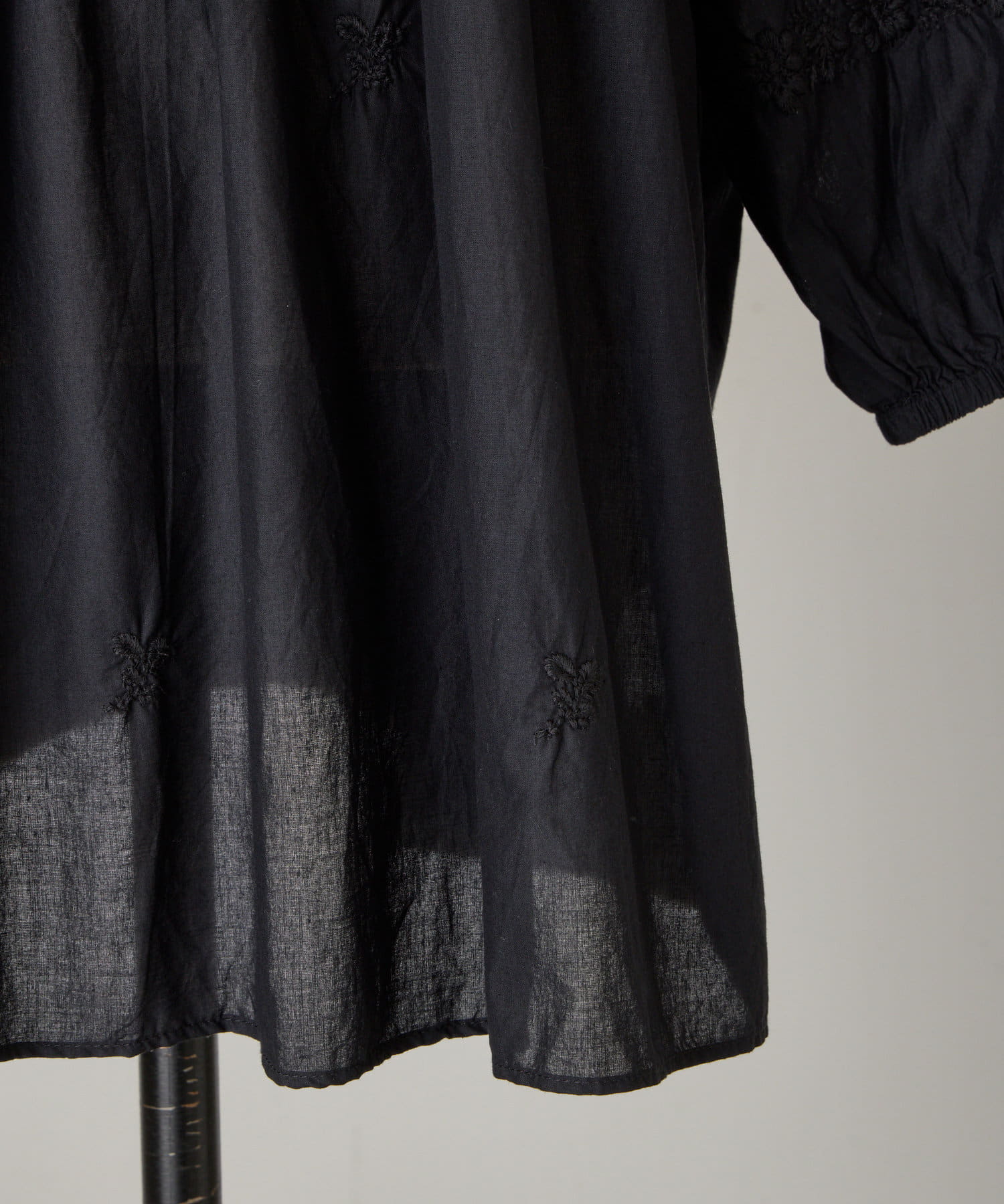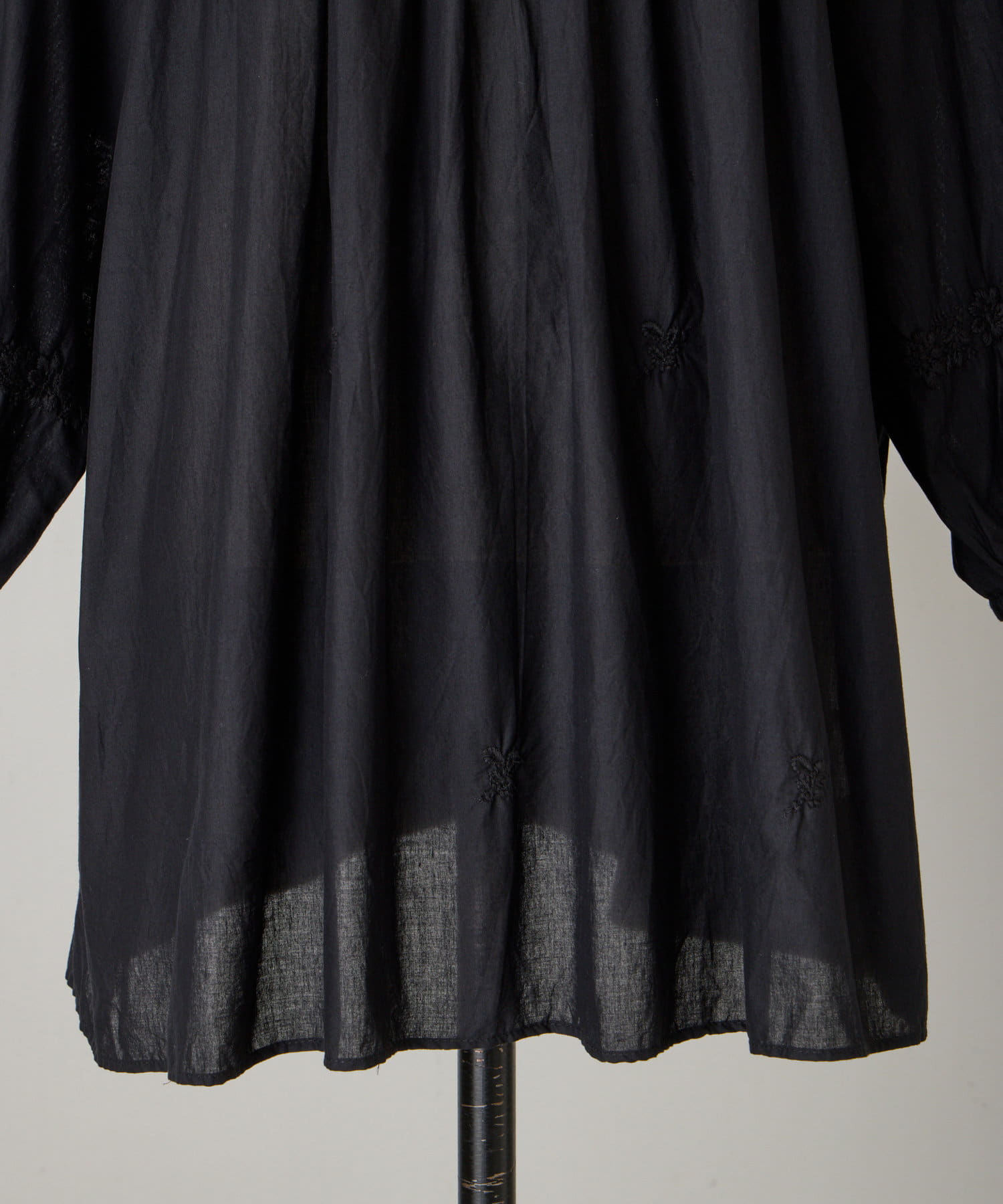胸元と袖口だけでなく身頃にもあしらわれた繊細な刺繍が、シンプルながらも印象的なデザイン。