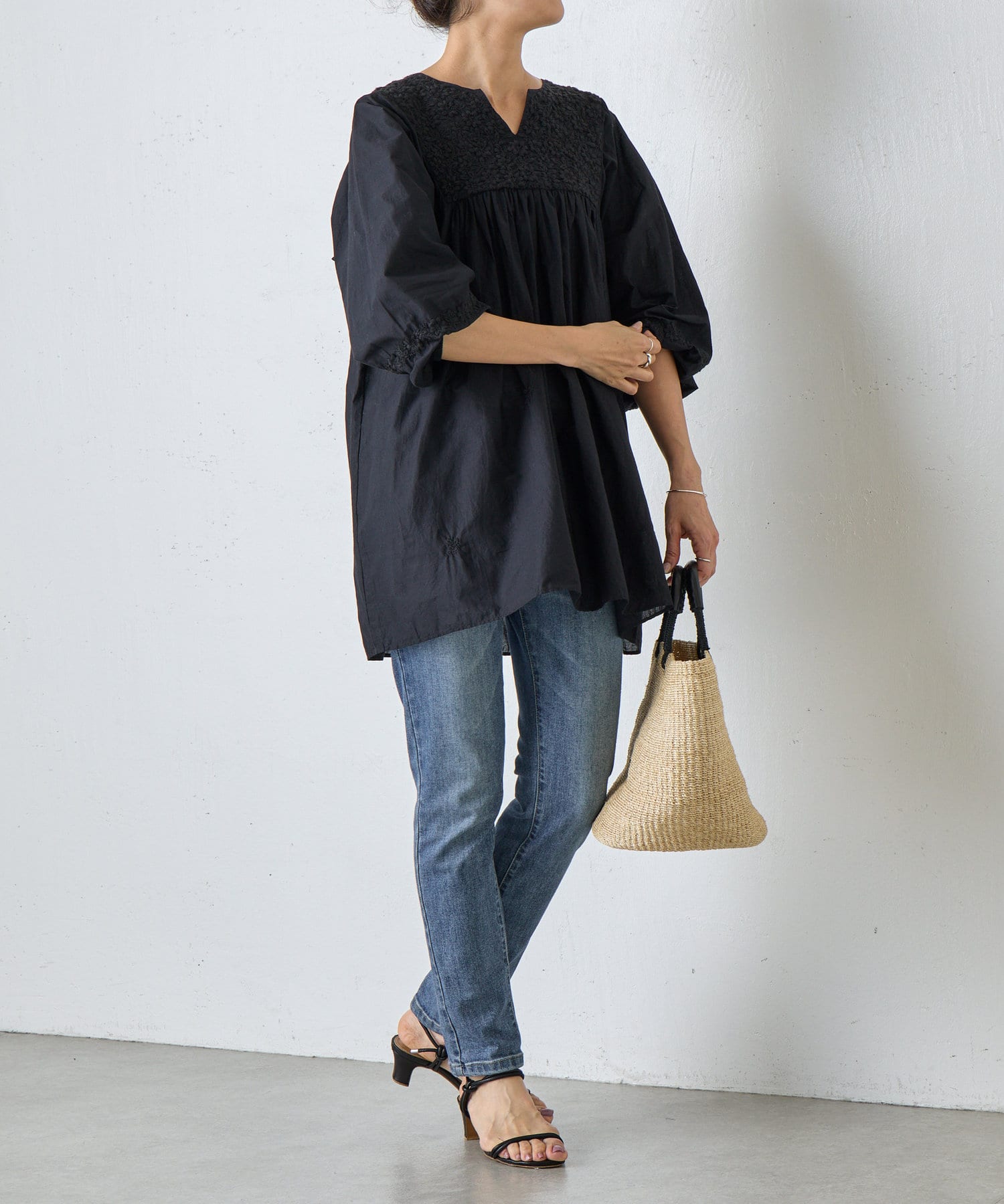 ゆったりとした身幅で体のラインを拾わずリラックス感がありつつも、さりげない刺繍使いが大人の上品な雰囲気を引き立てます。