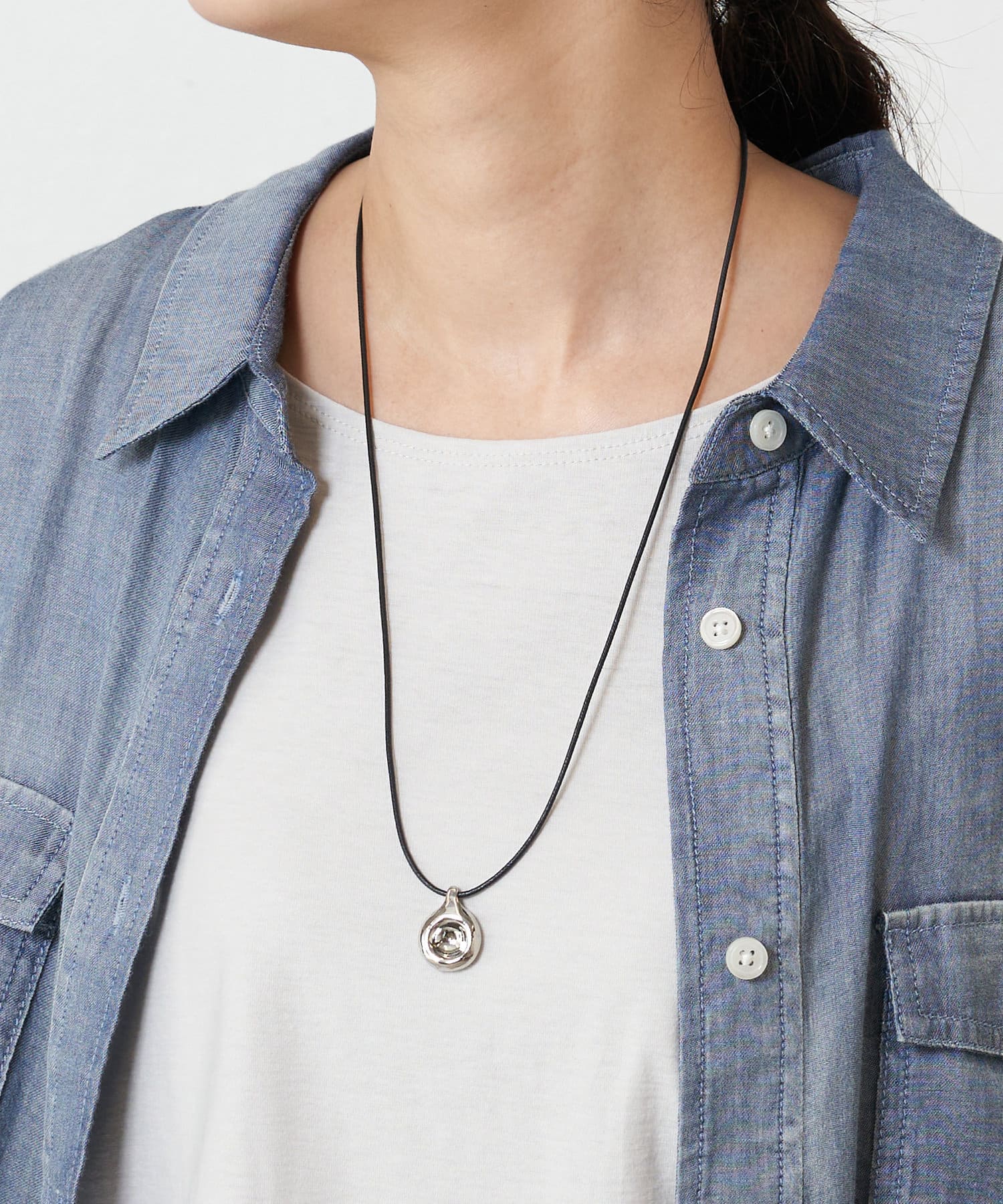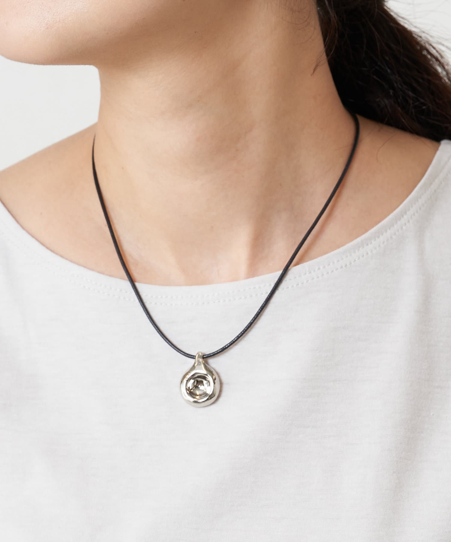 存在感のある大ぶりメタルモチーフが、コーディネートにモードなアクセントを添えるコードネックレス。