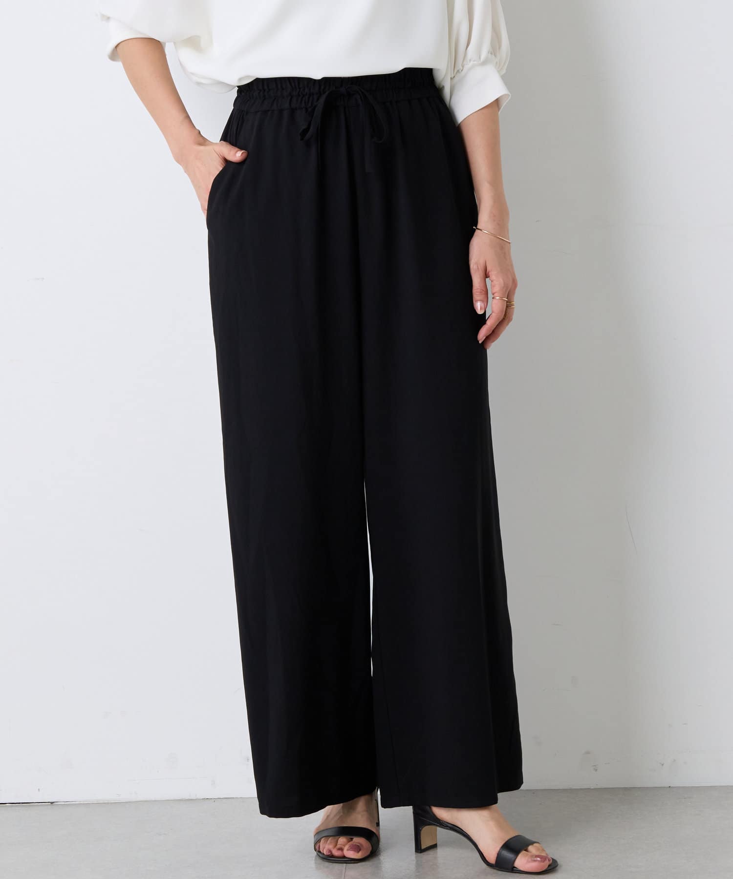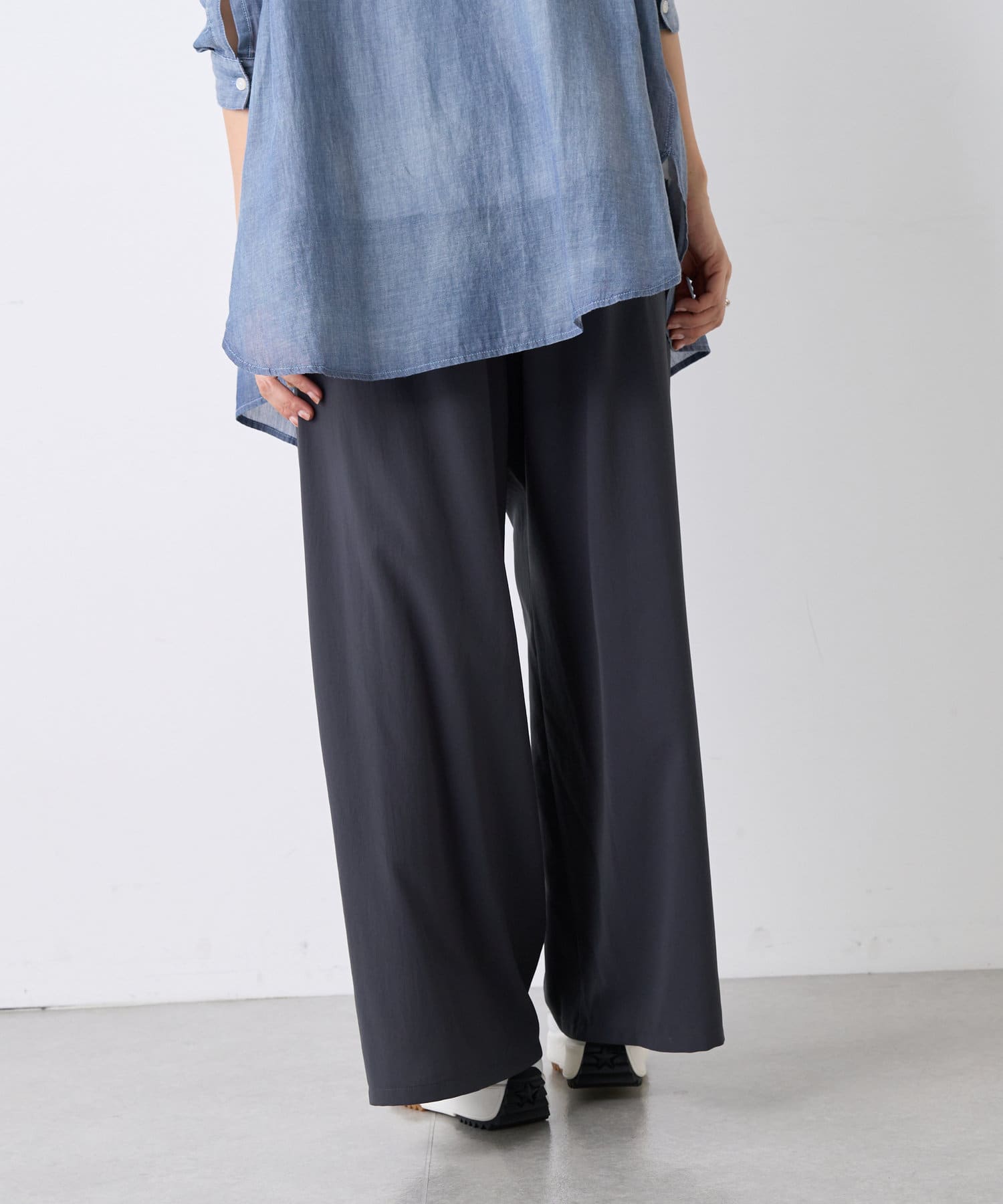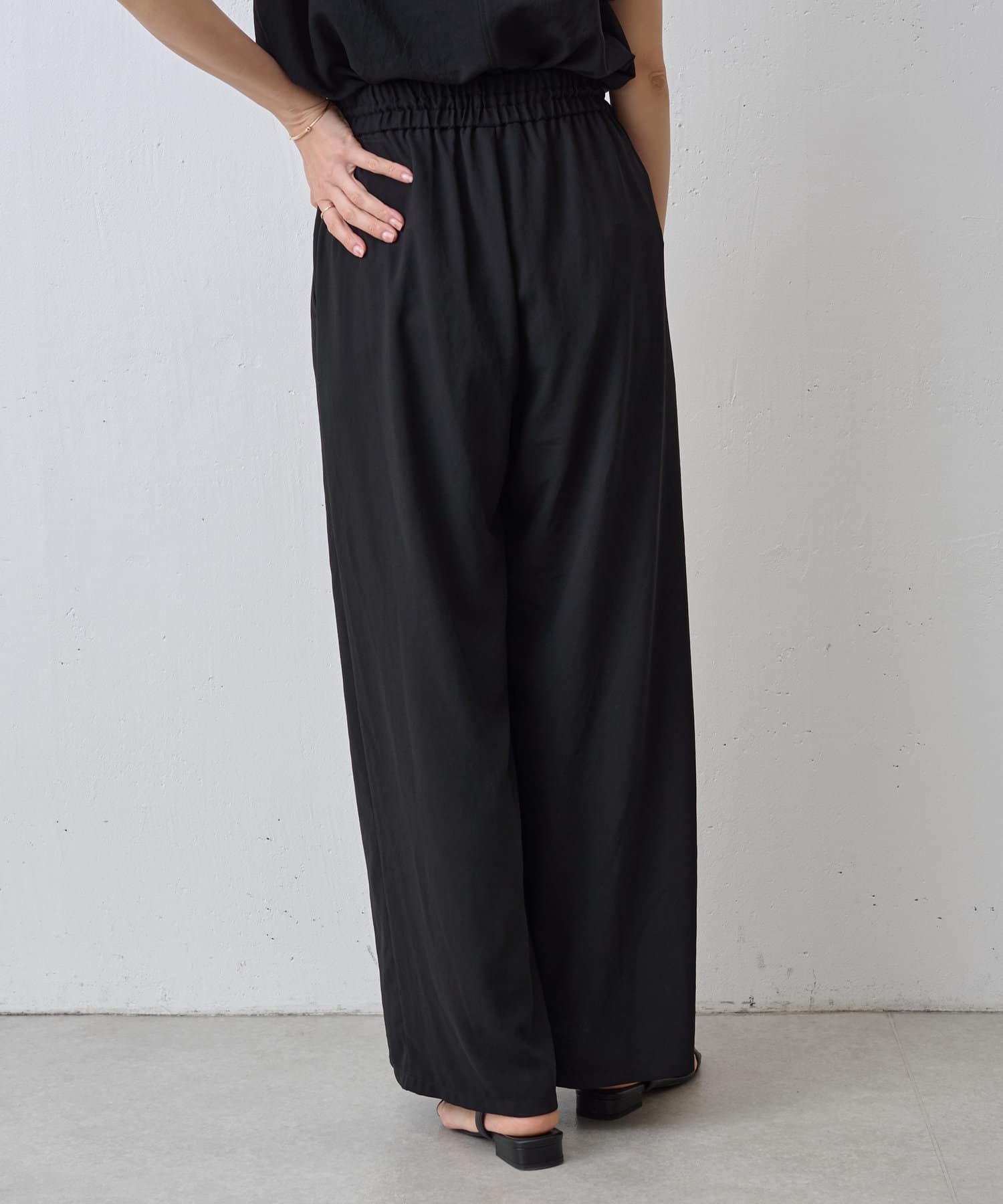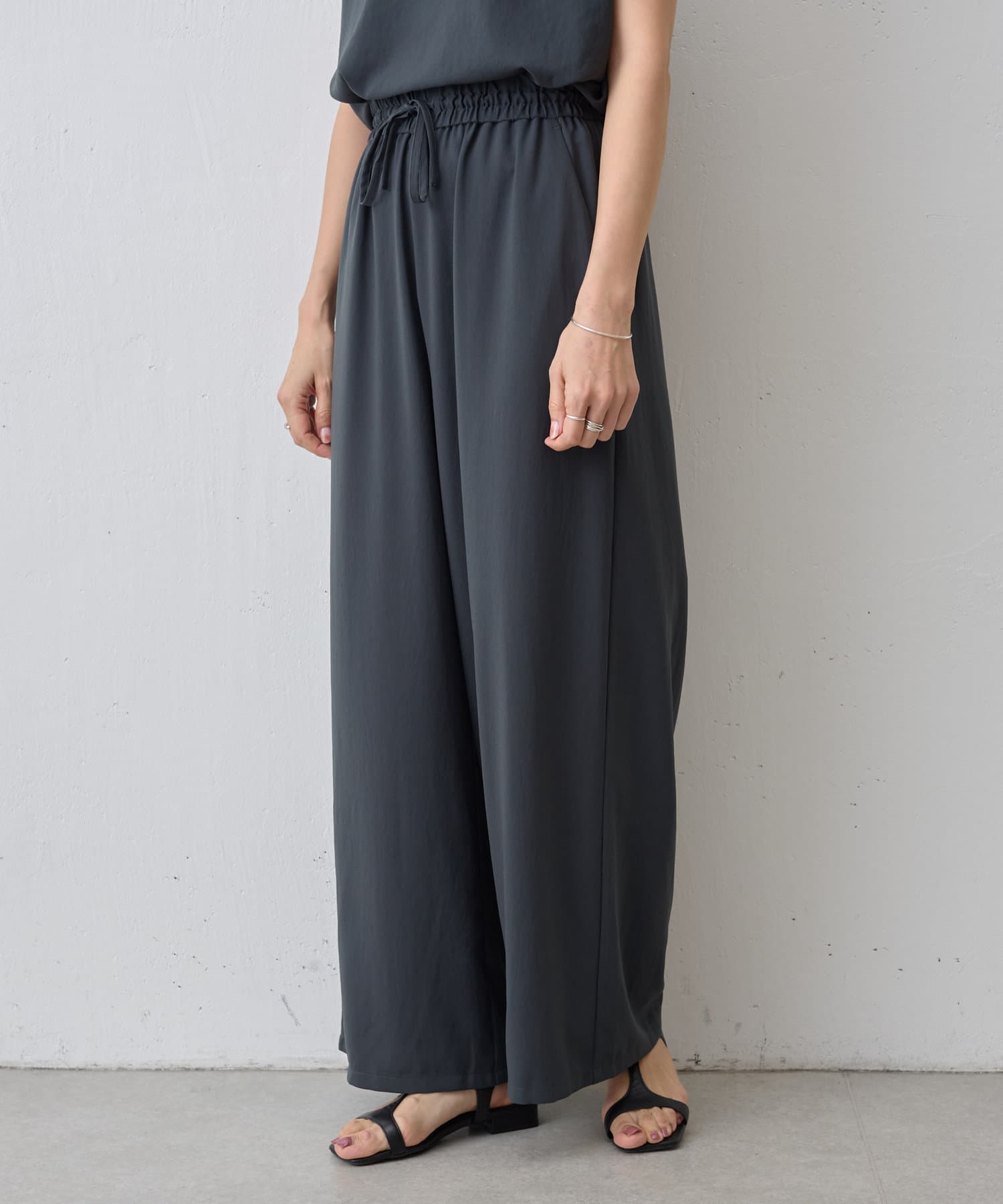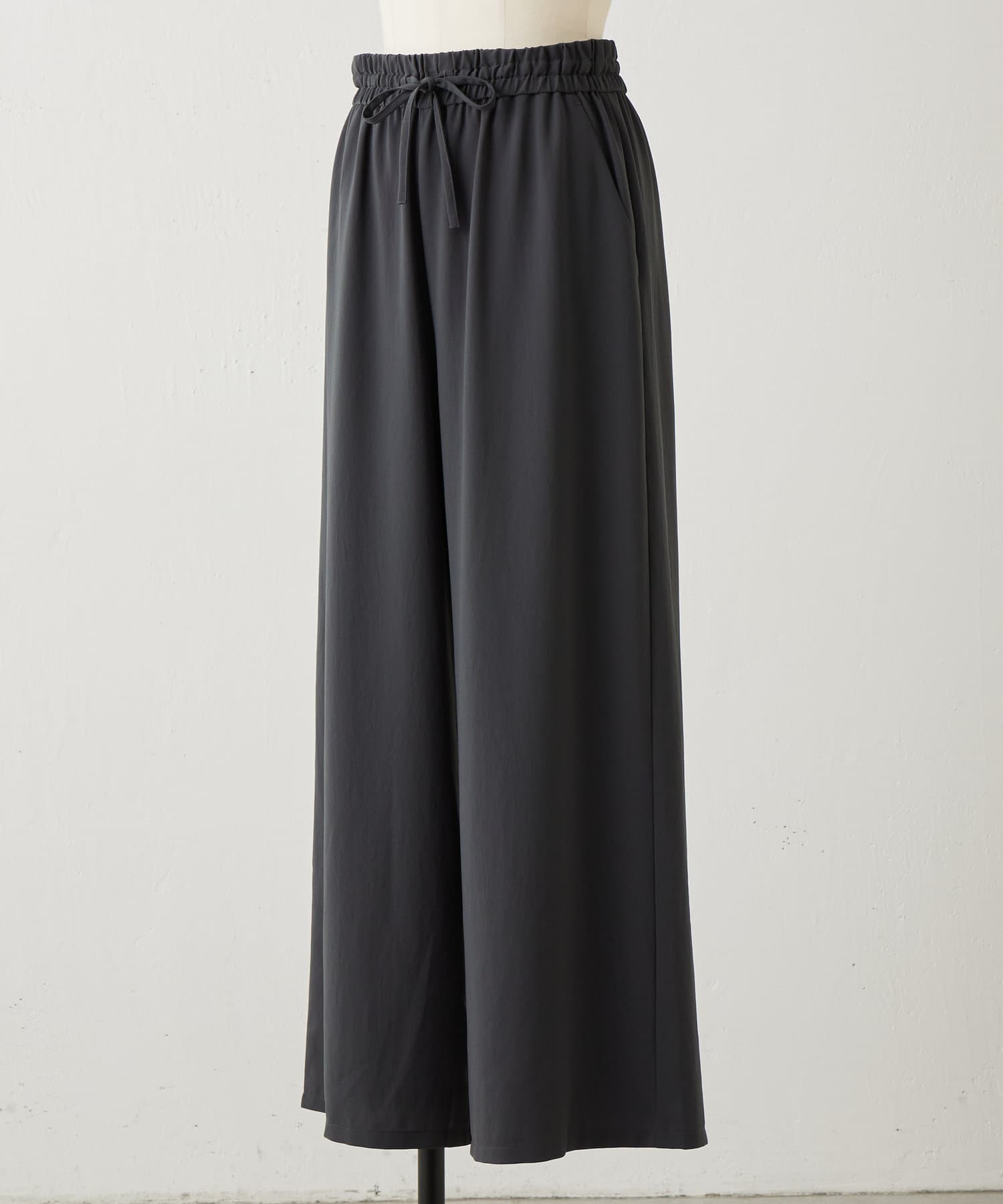 落ち感のあるジョーゼット素材を使用したワイドパンツ。