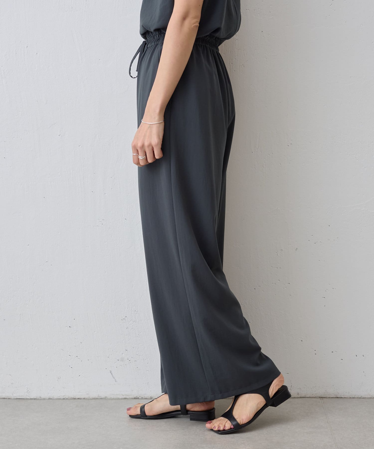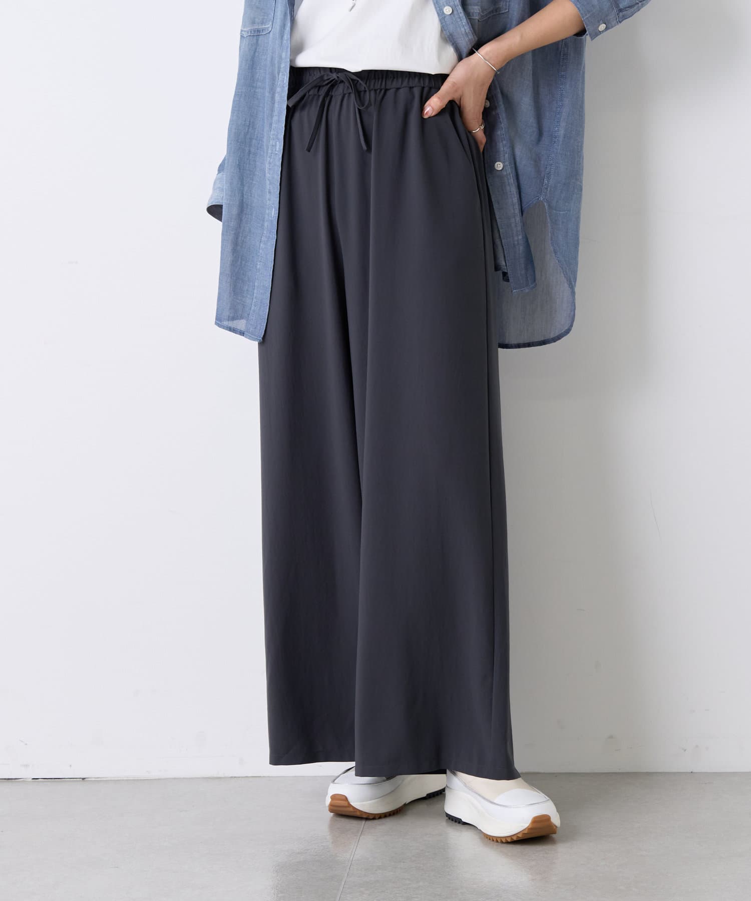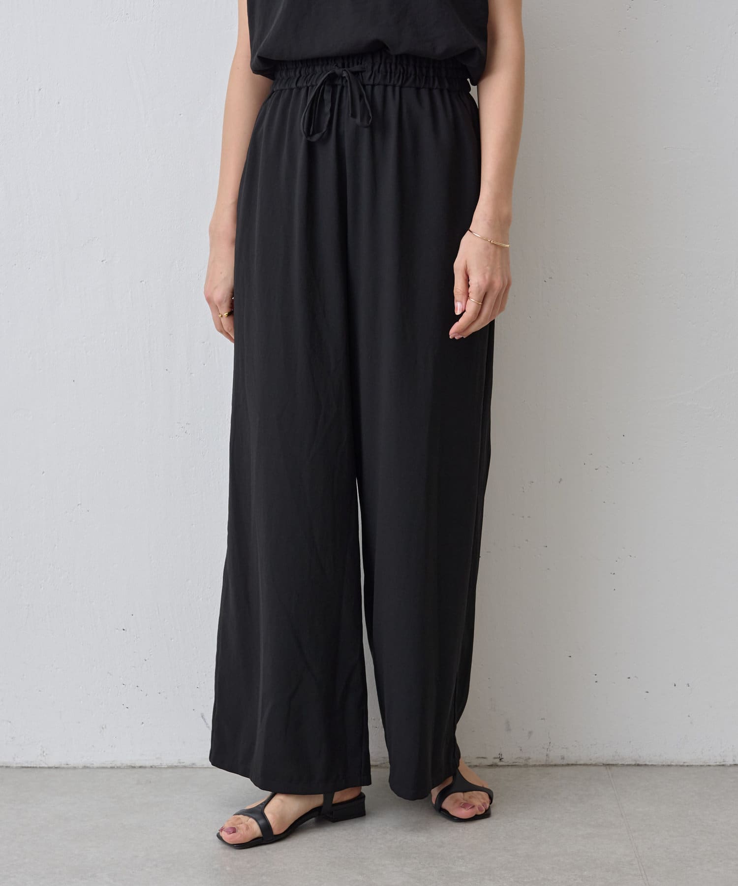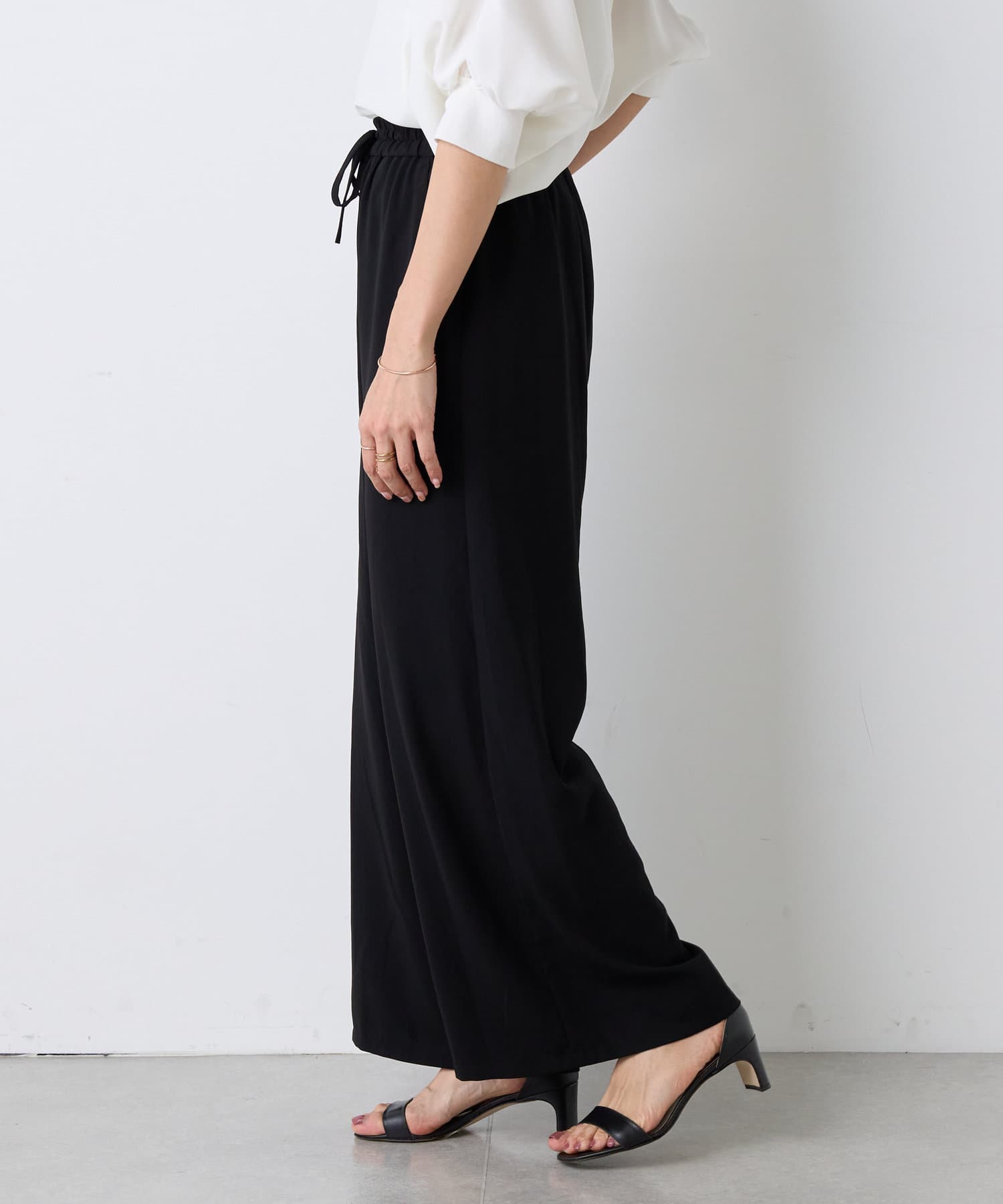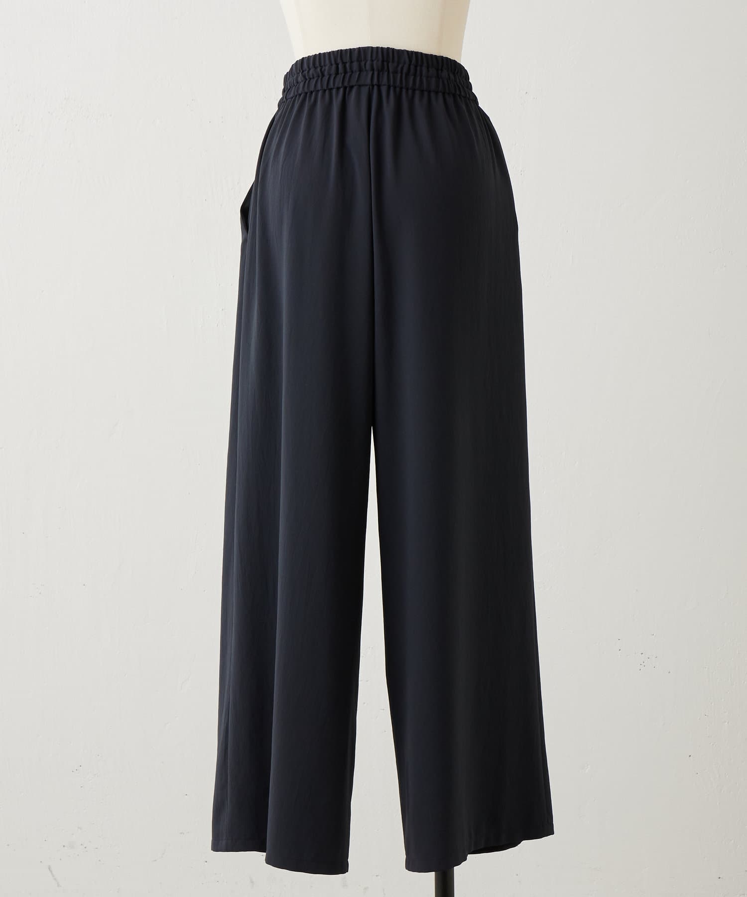 落ち感のあるジョーゼット素材を使用したワイドパンツ。