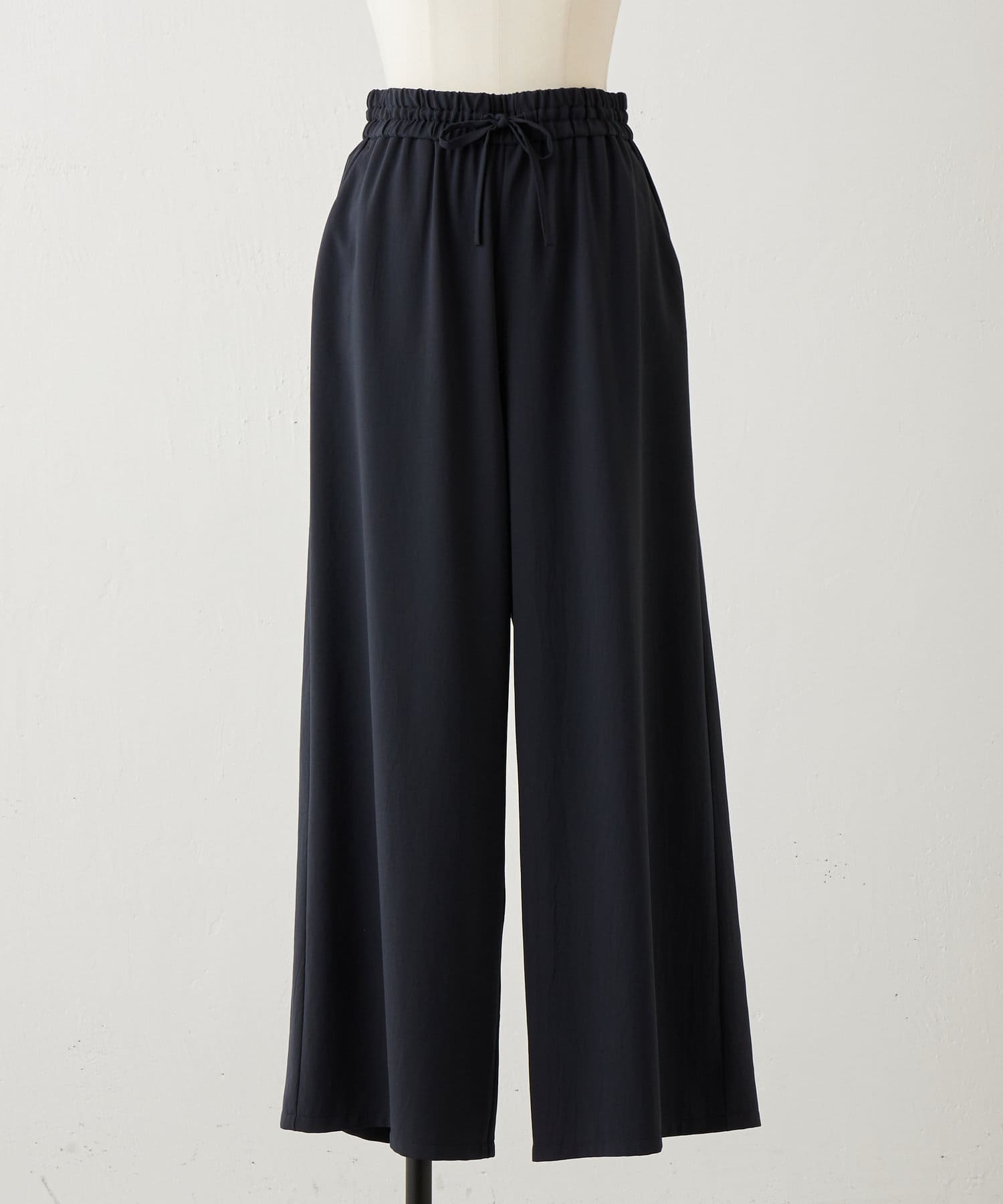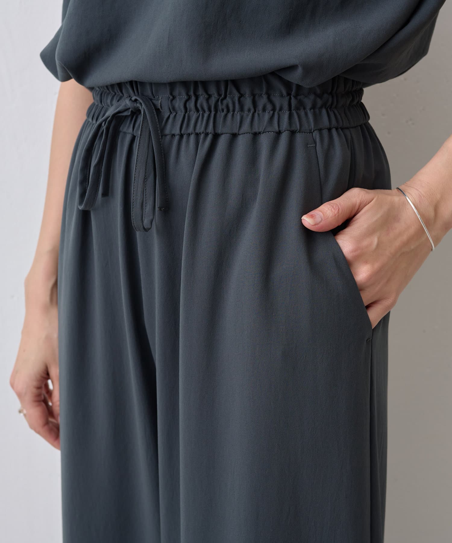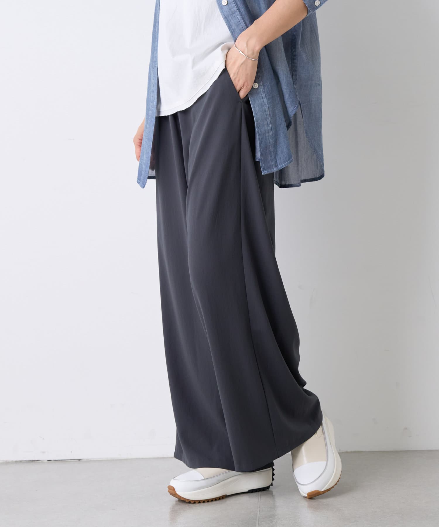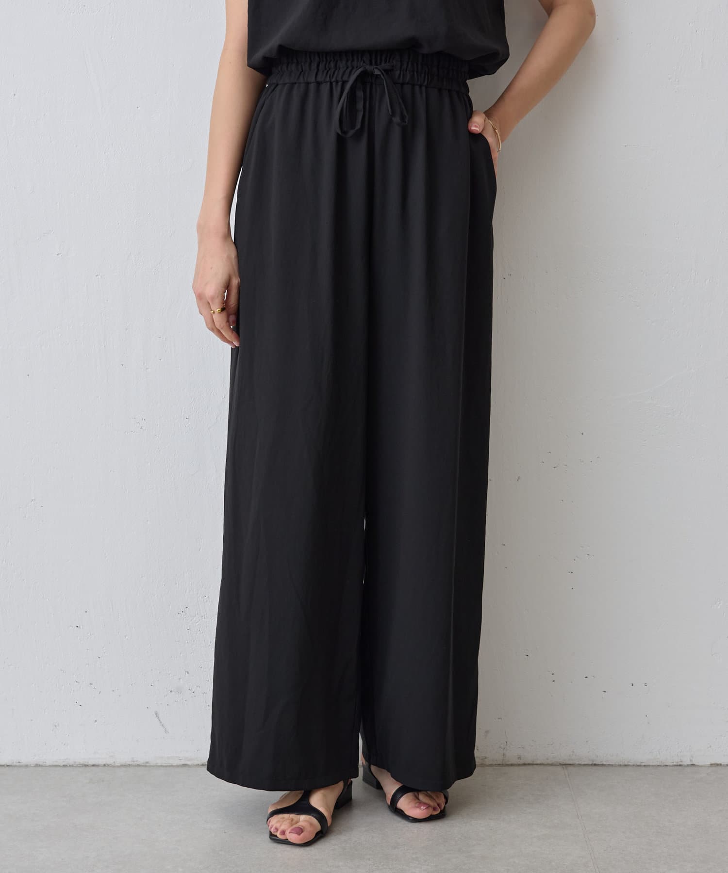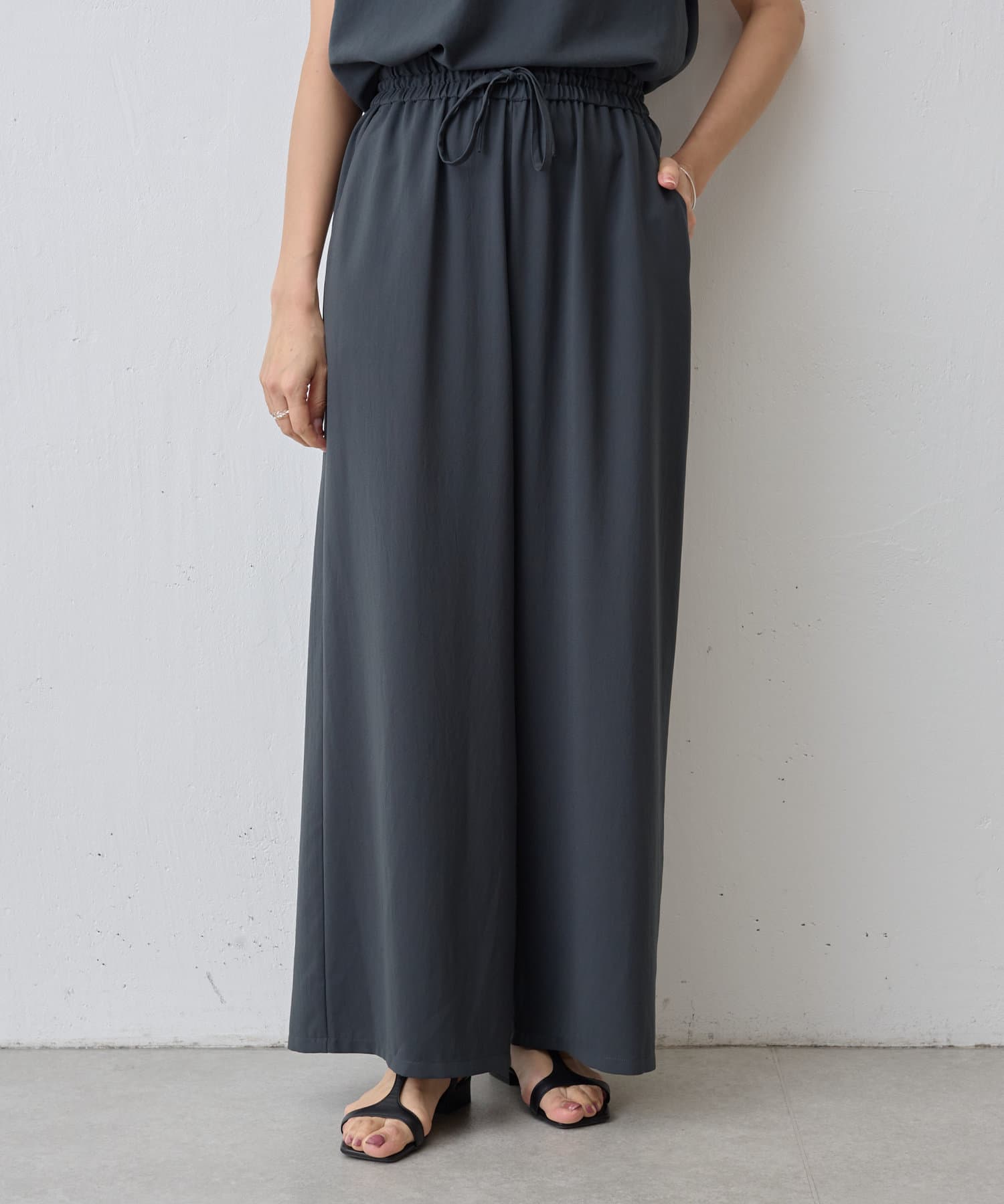 落ち感のあるジョーゼット素材を使用したワイドパンツ。