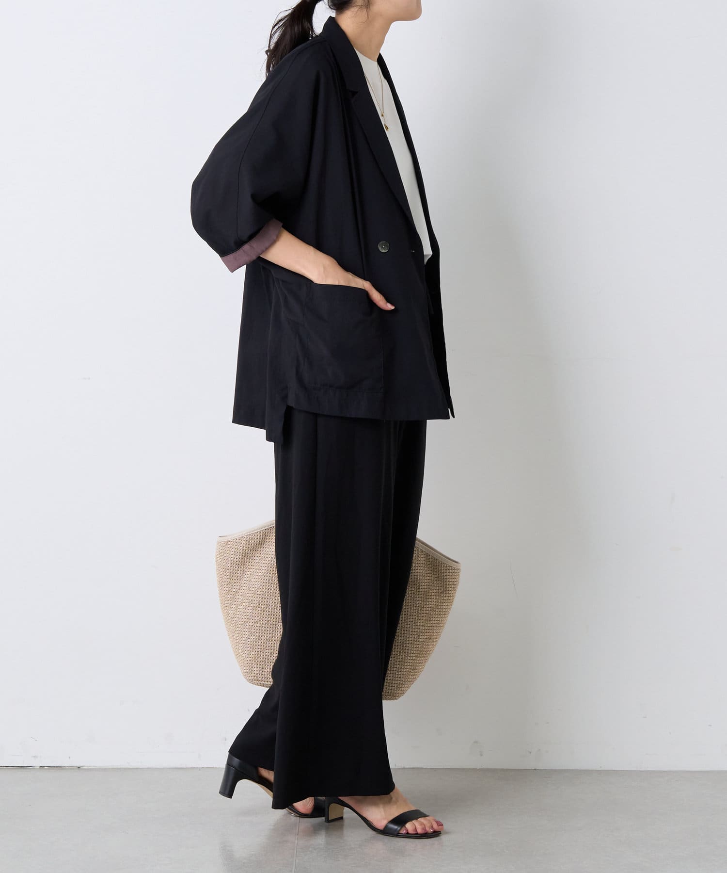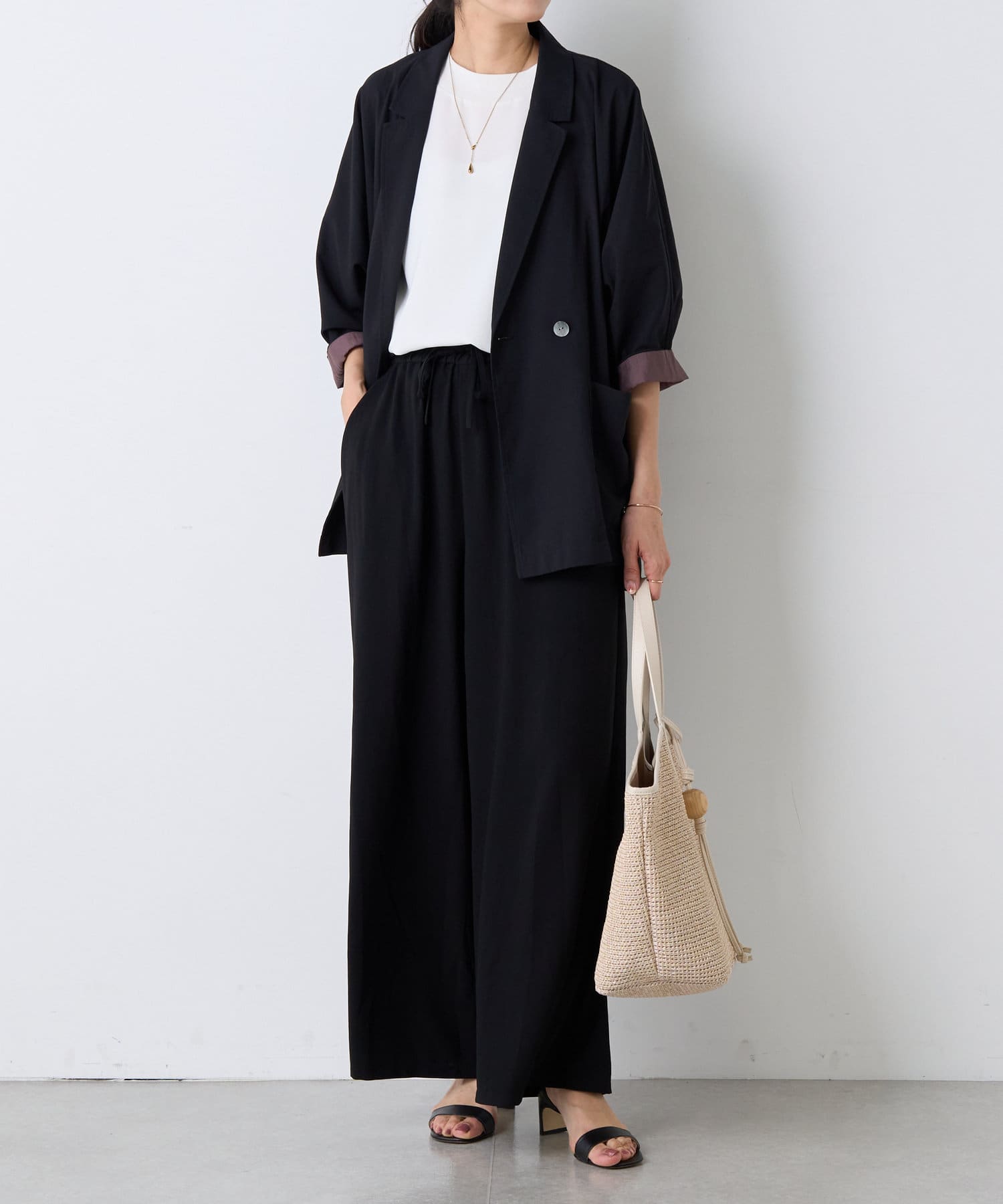 同素材のトップスとセットアップで着用すれば、より洗練されたコーディネートが完成。