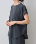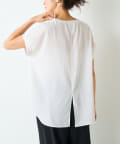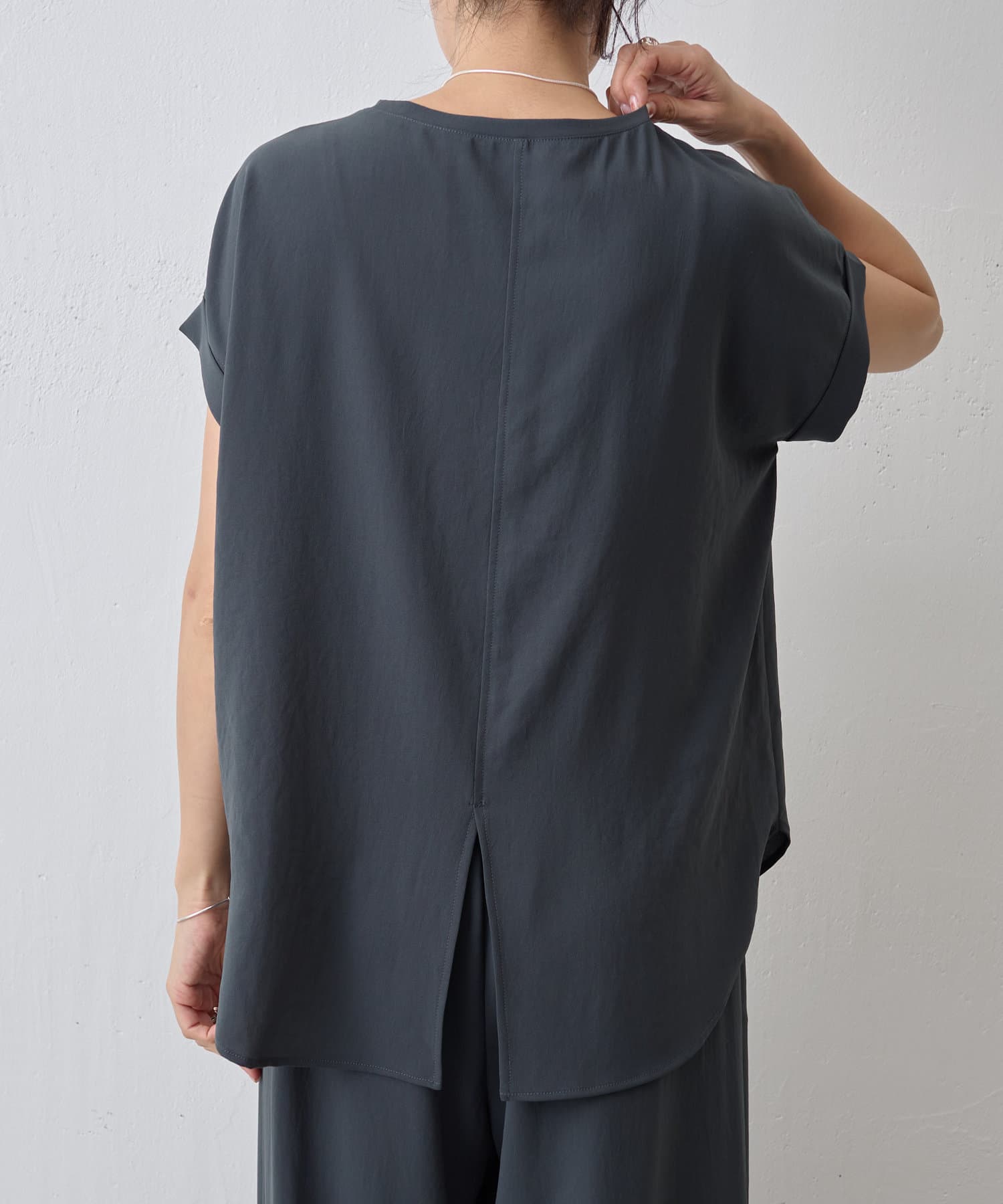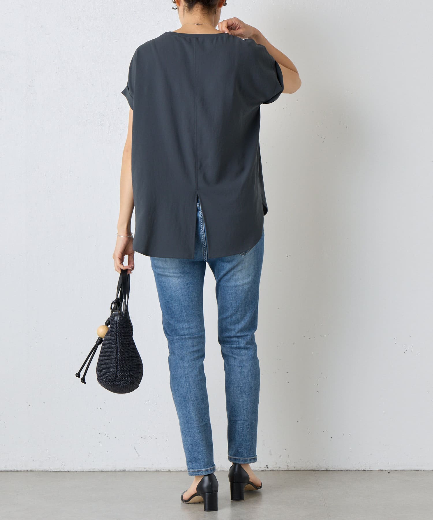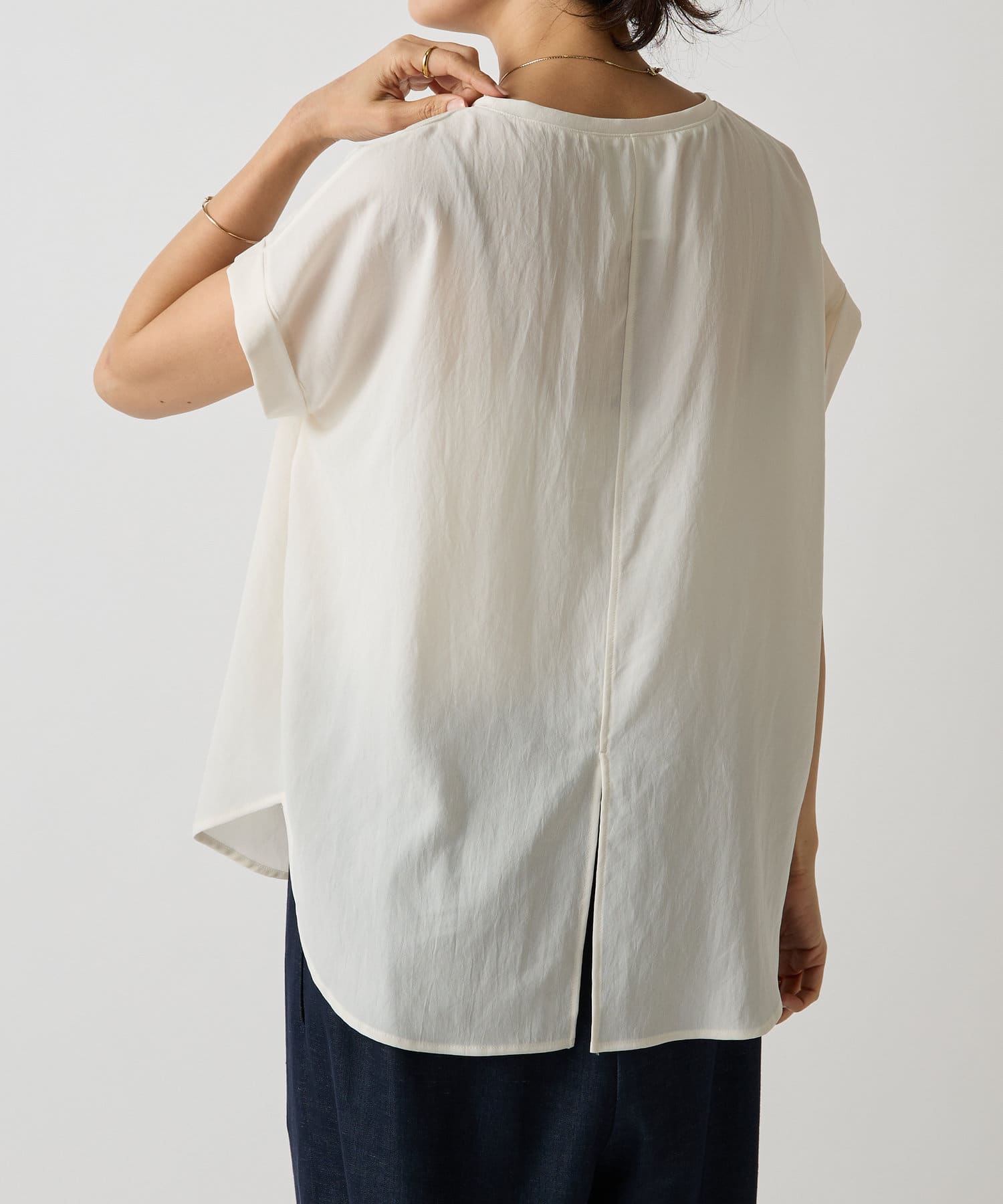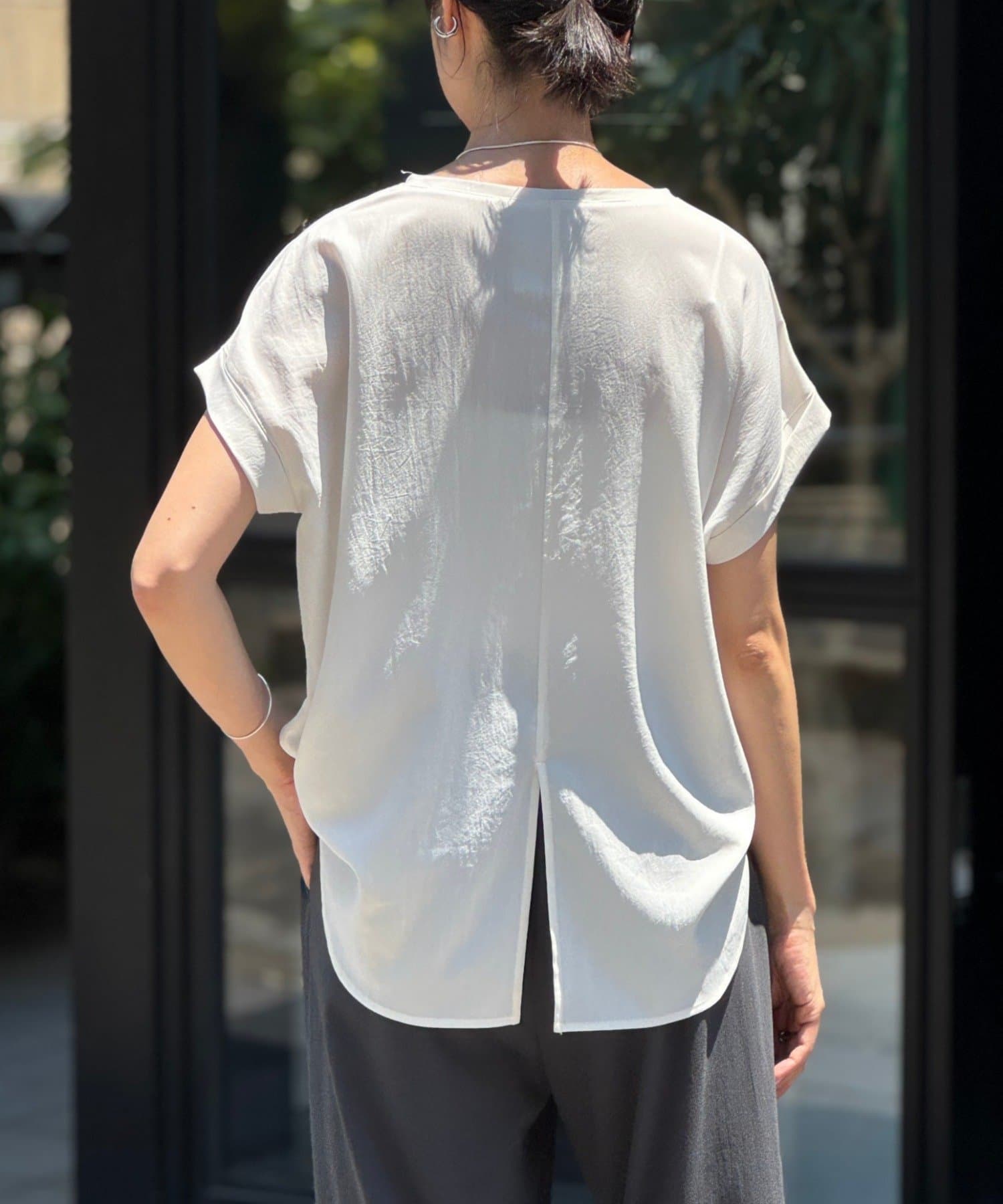 二の腕をすっきり見せてくれるフレンチスリーブに、バックスタイルにはスリットをいれ軽やかな印象に。