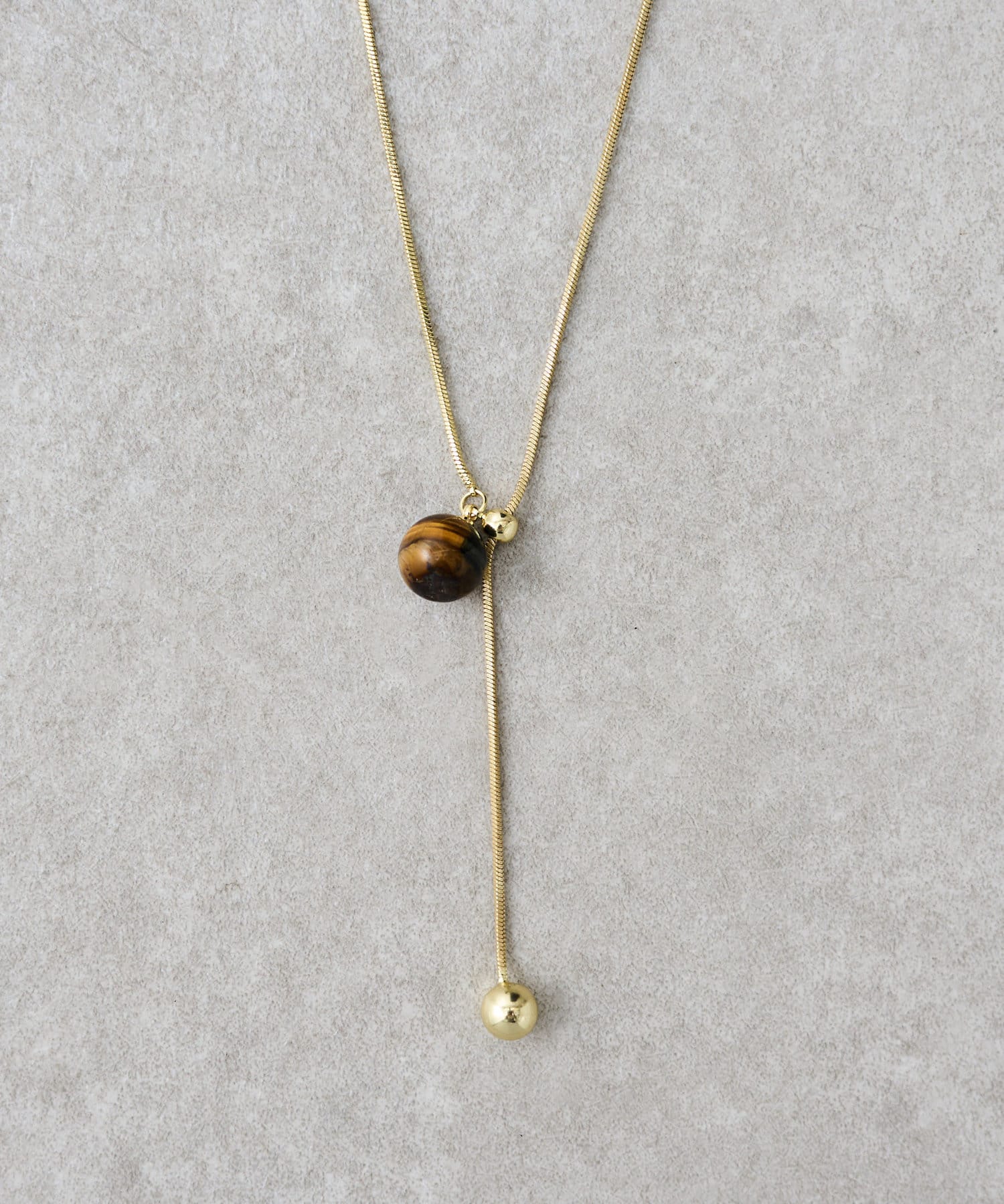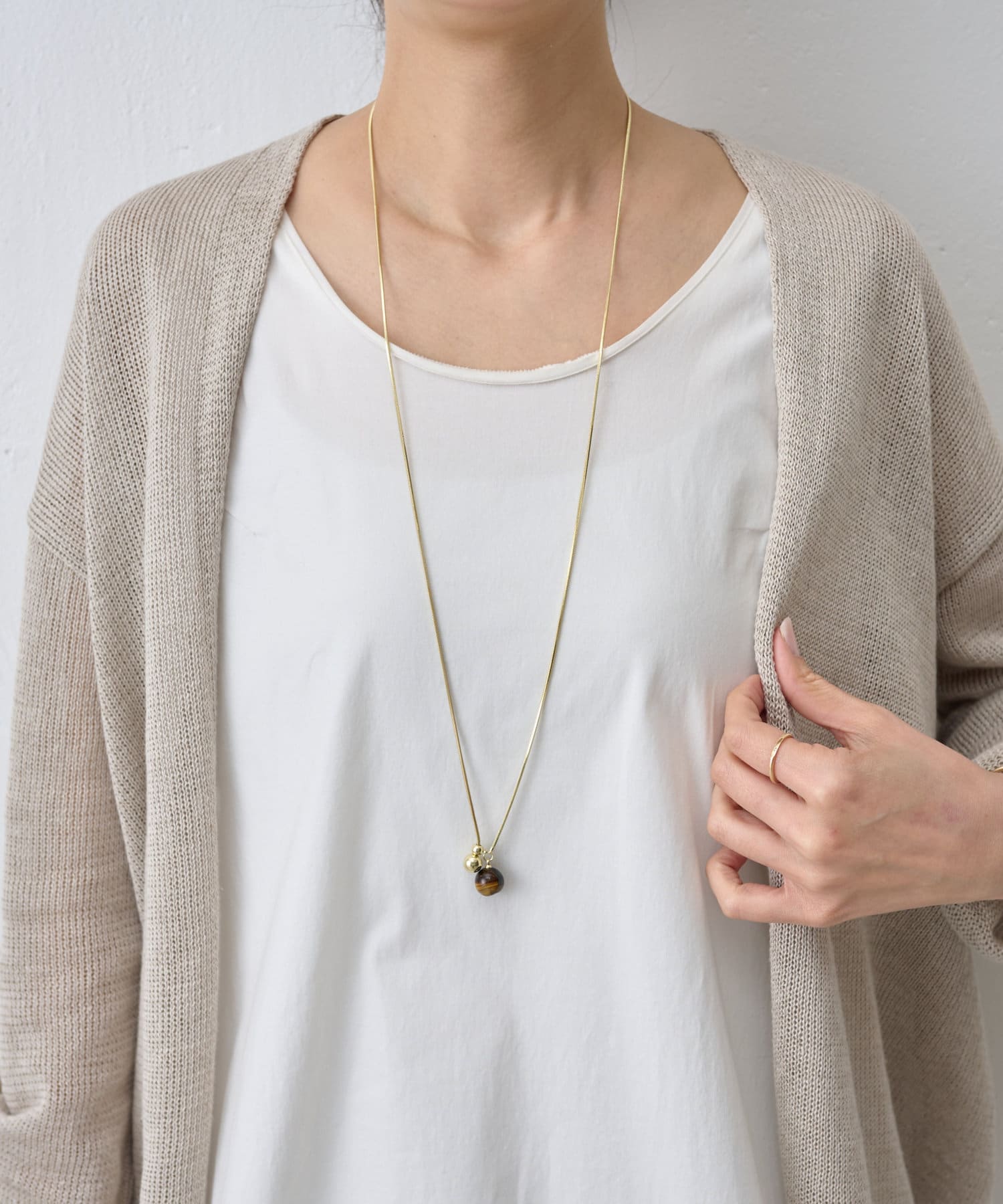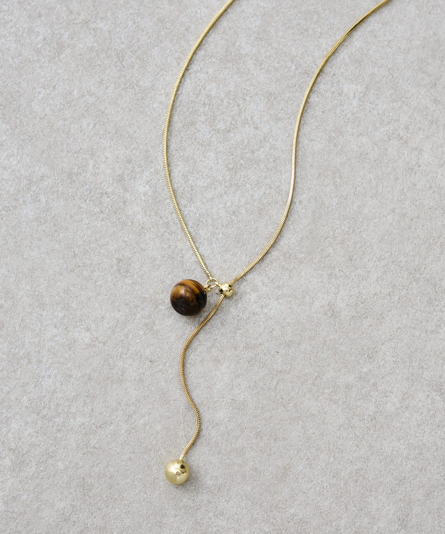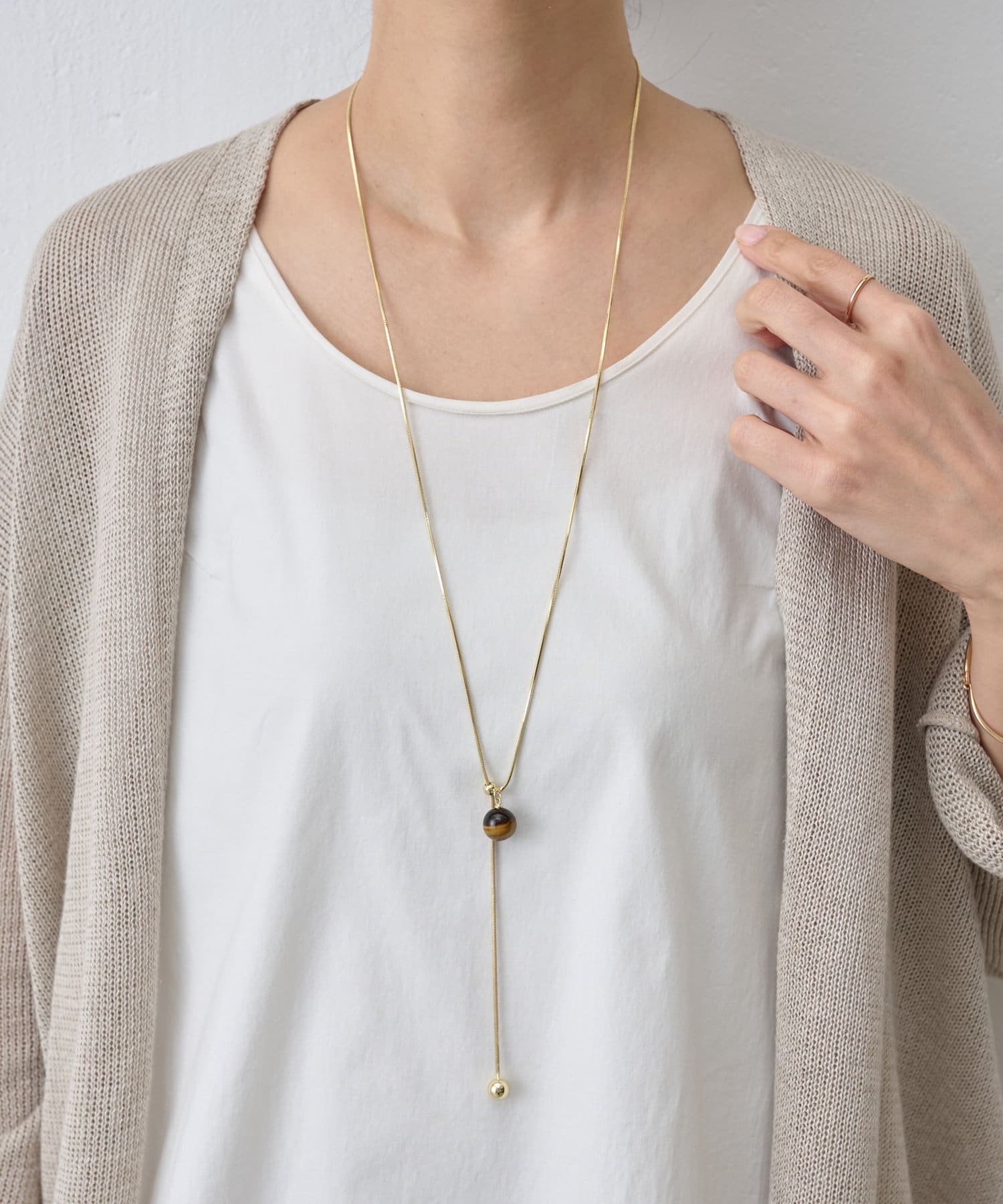 シンプルでありながら洗練された印象を与える、天然石(タイガーアイ)があしらわれたスライドネックレス。