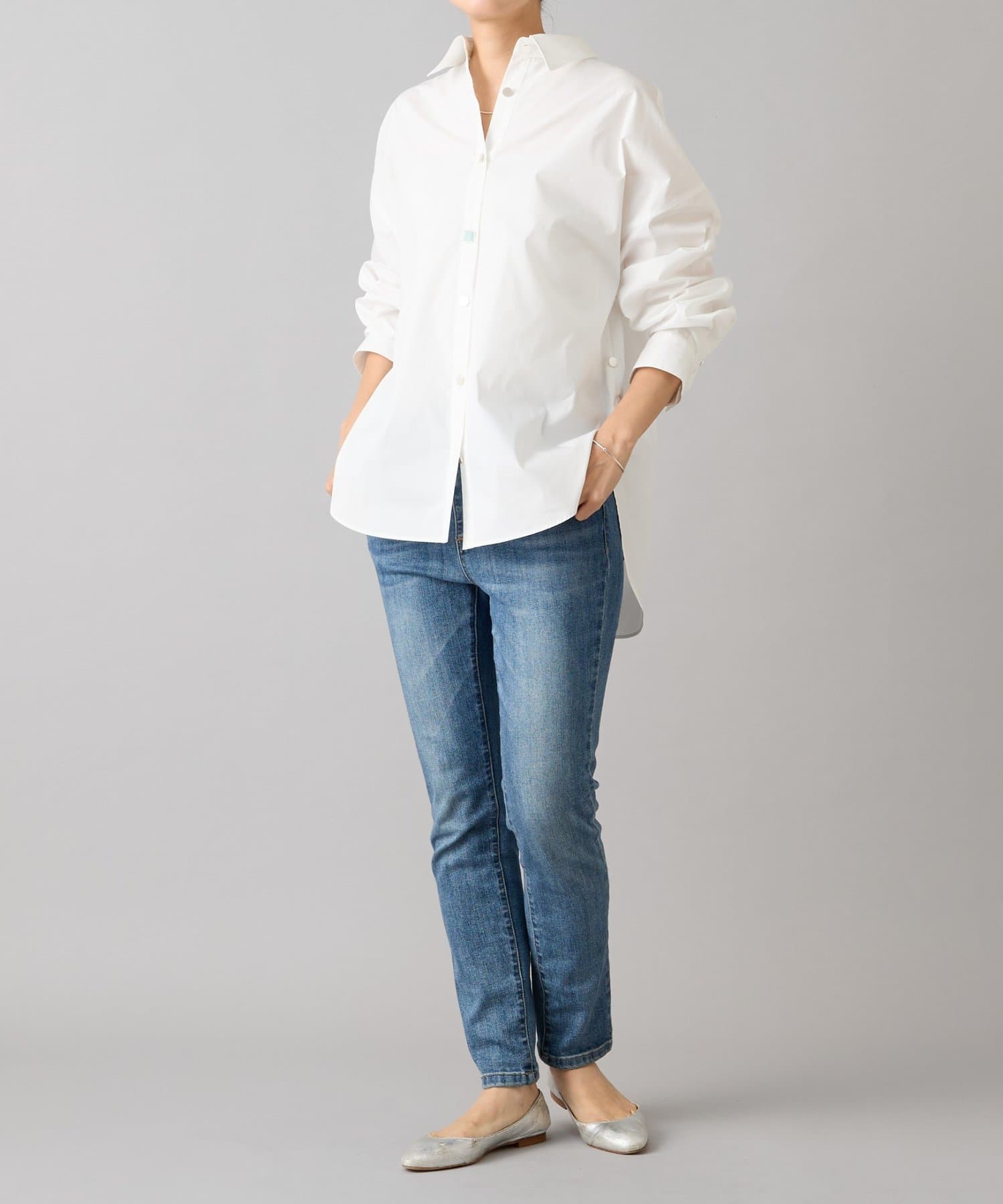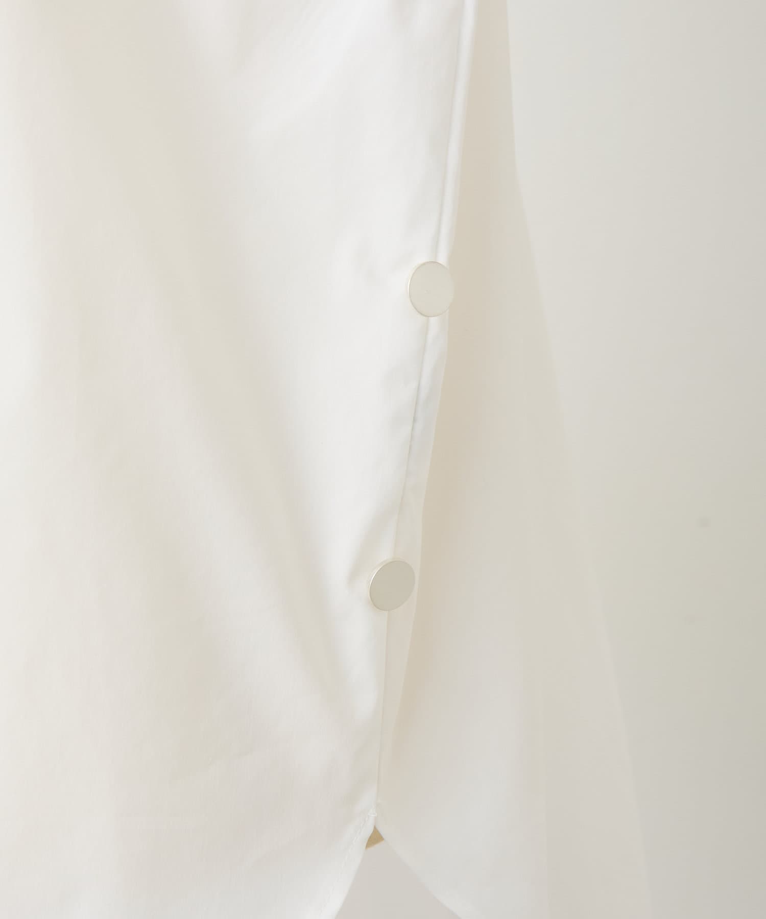 仕立てのよさが際立つすっきりとしたシルエットに、左右で異なるサイドのディテール—右はスリット入り、左にはメタルボタンを添えて、さりげない遊び心をプラス。