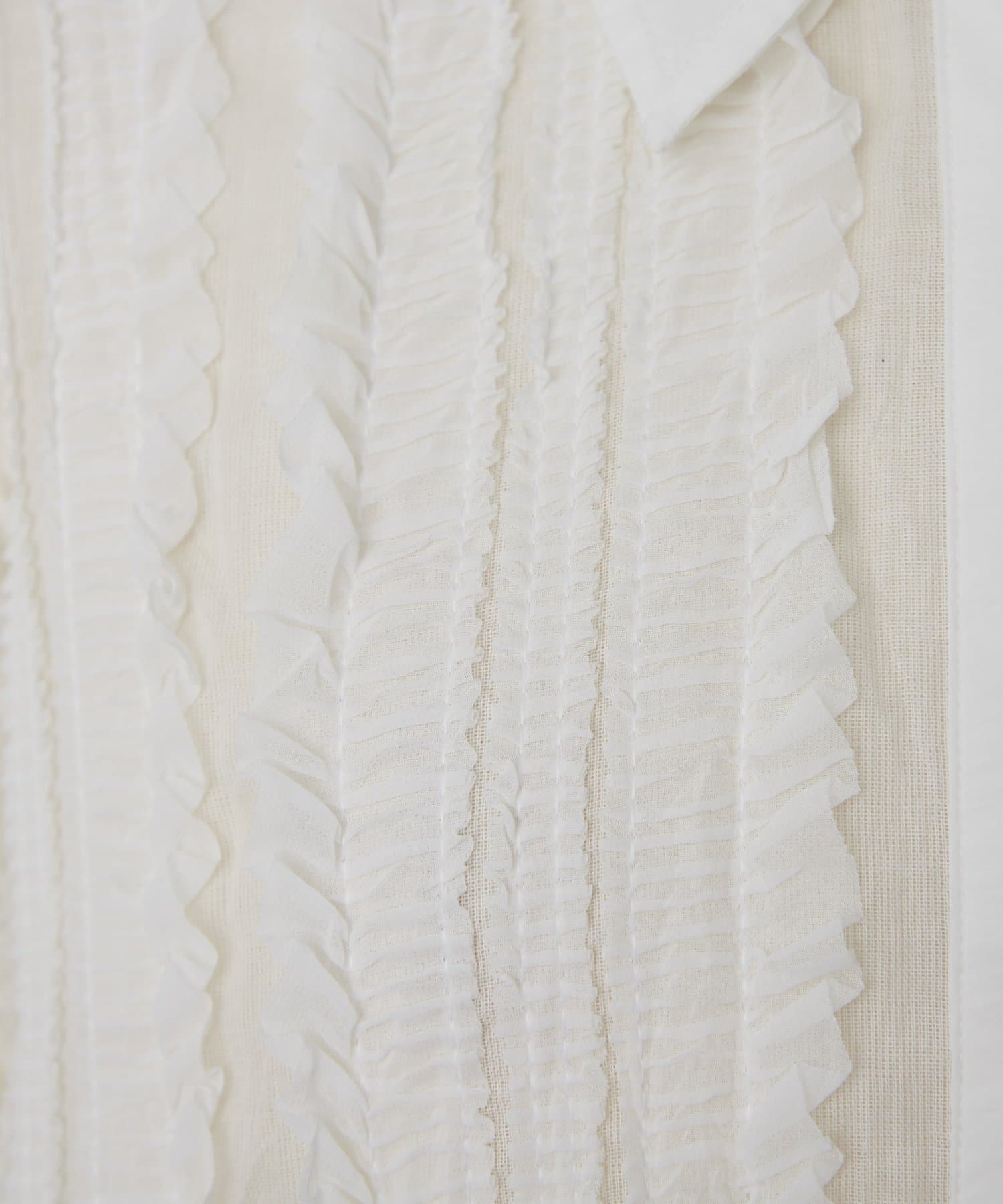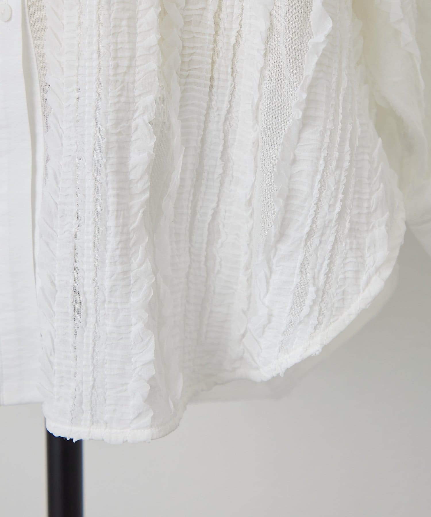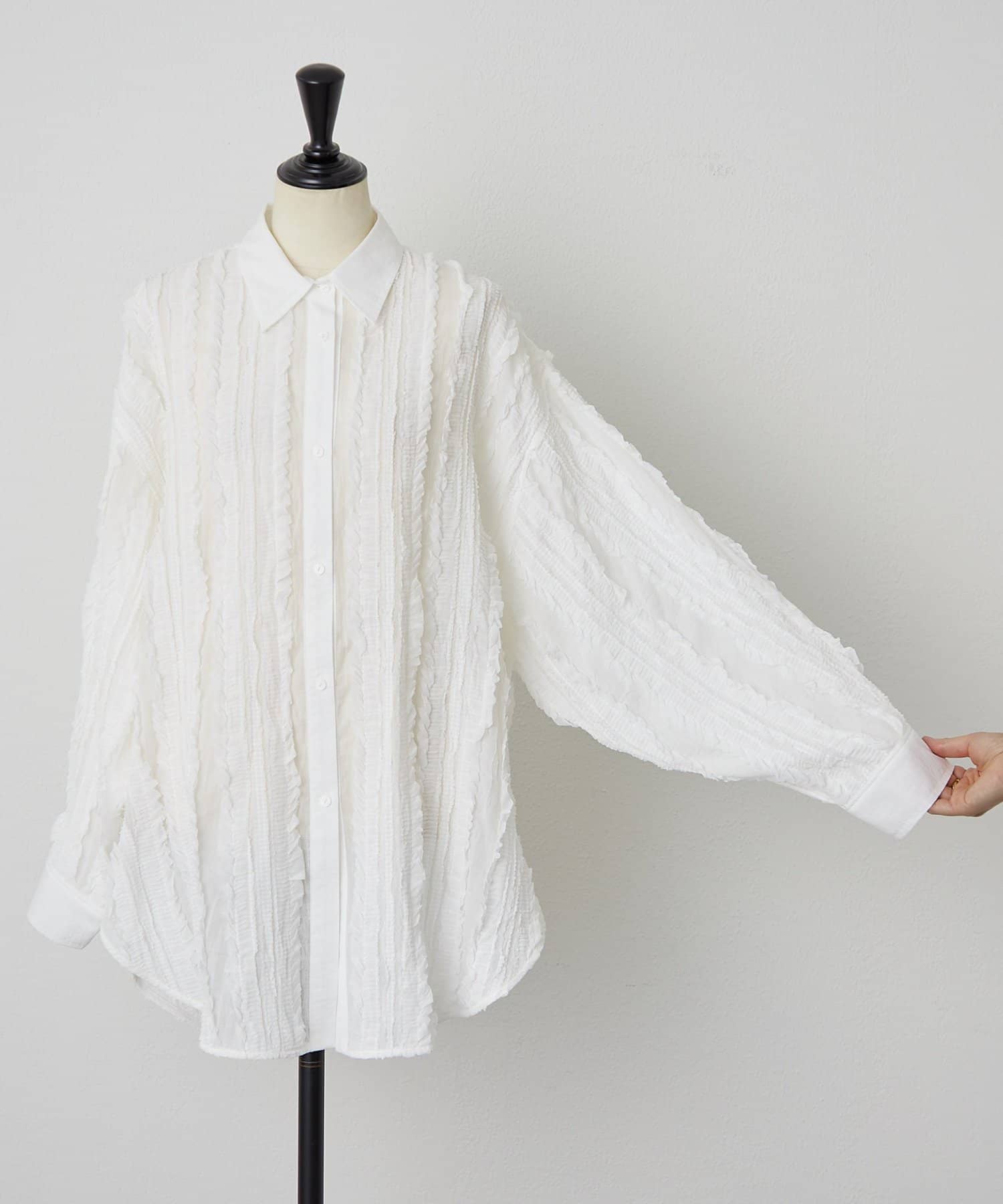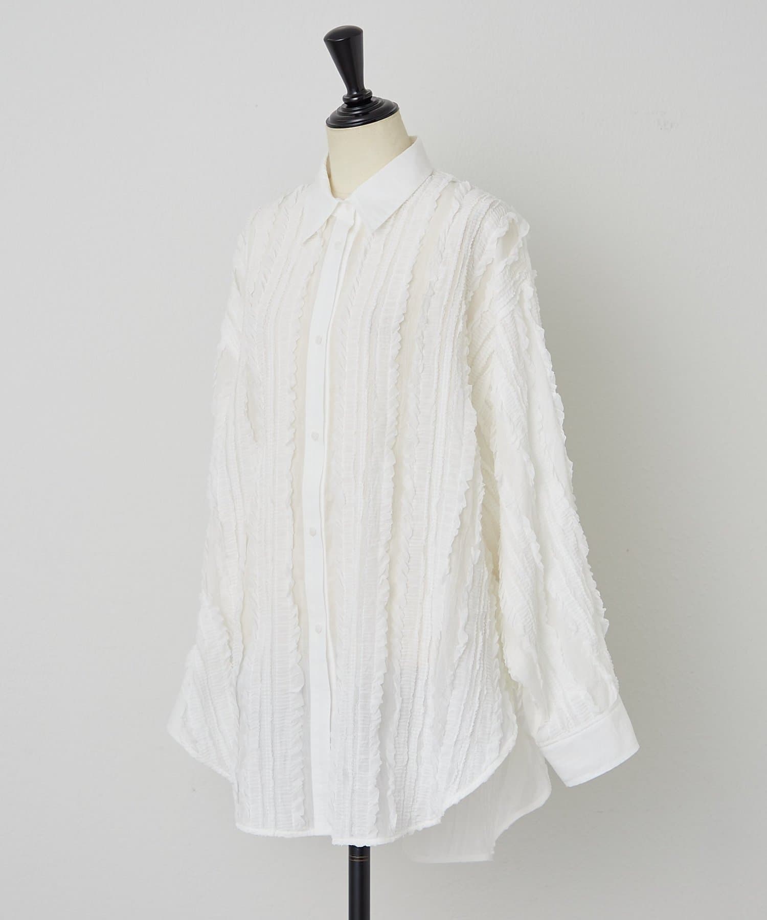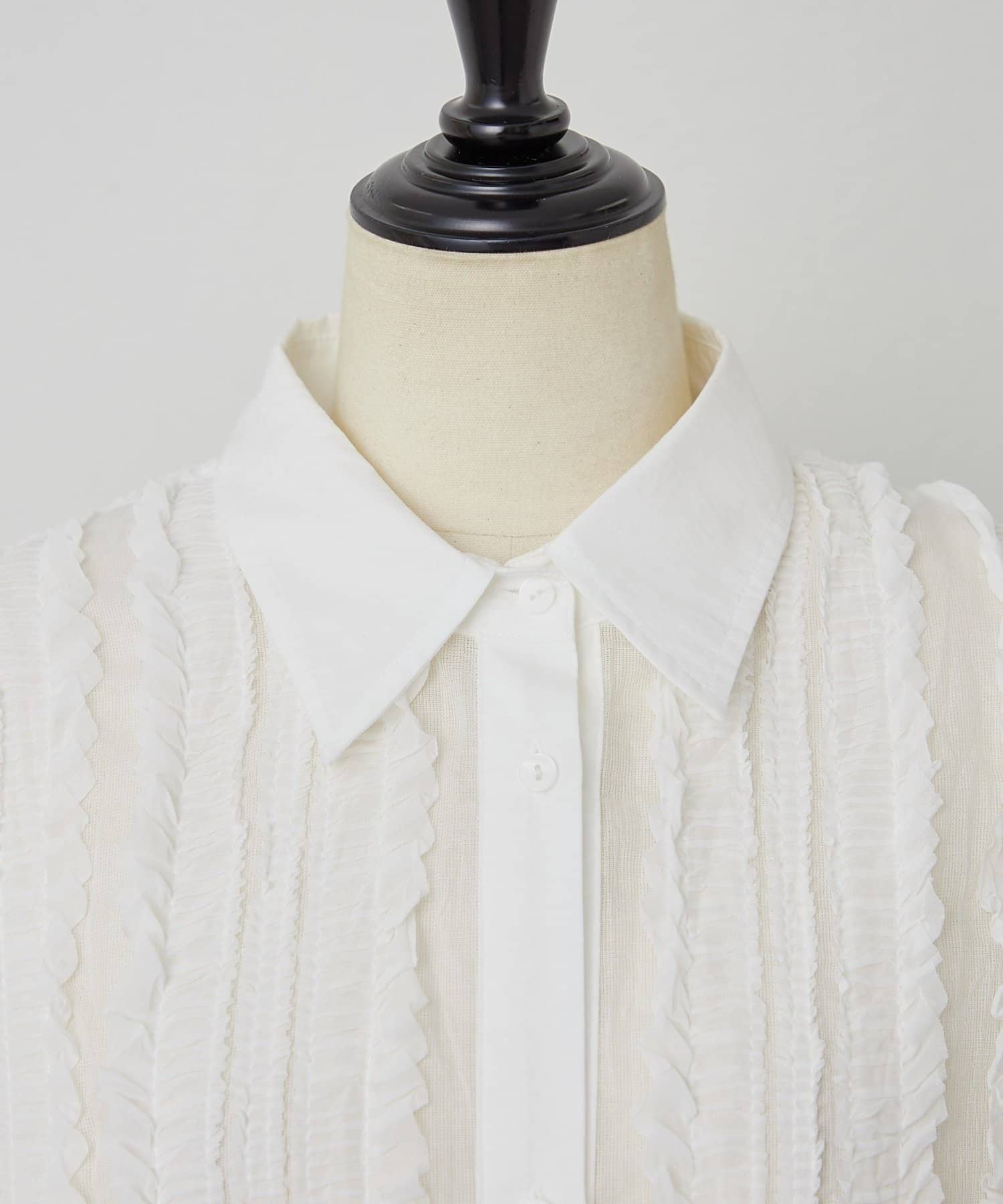 身頃いっぱいにあしらった繊細なフリルが目を惹く、ロマンティックなロングシャツブラウス。