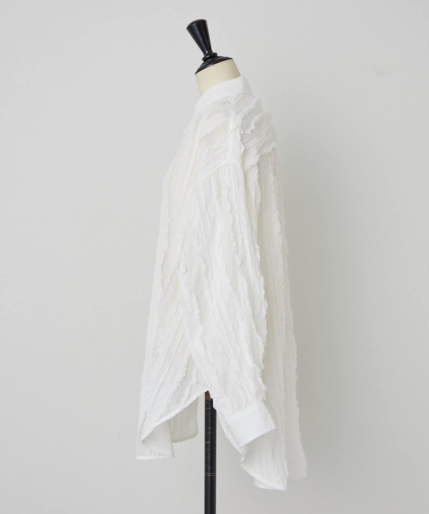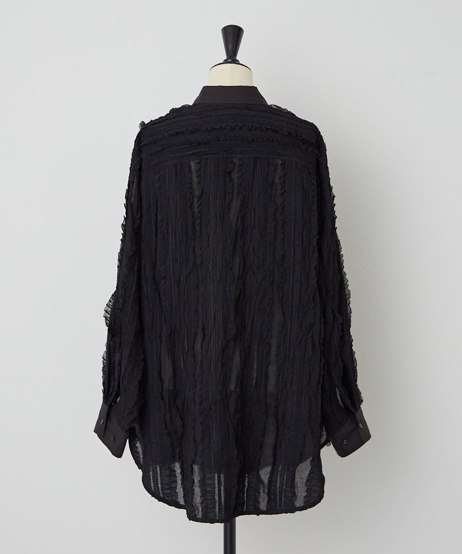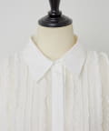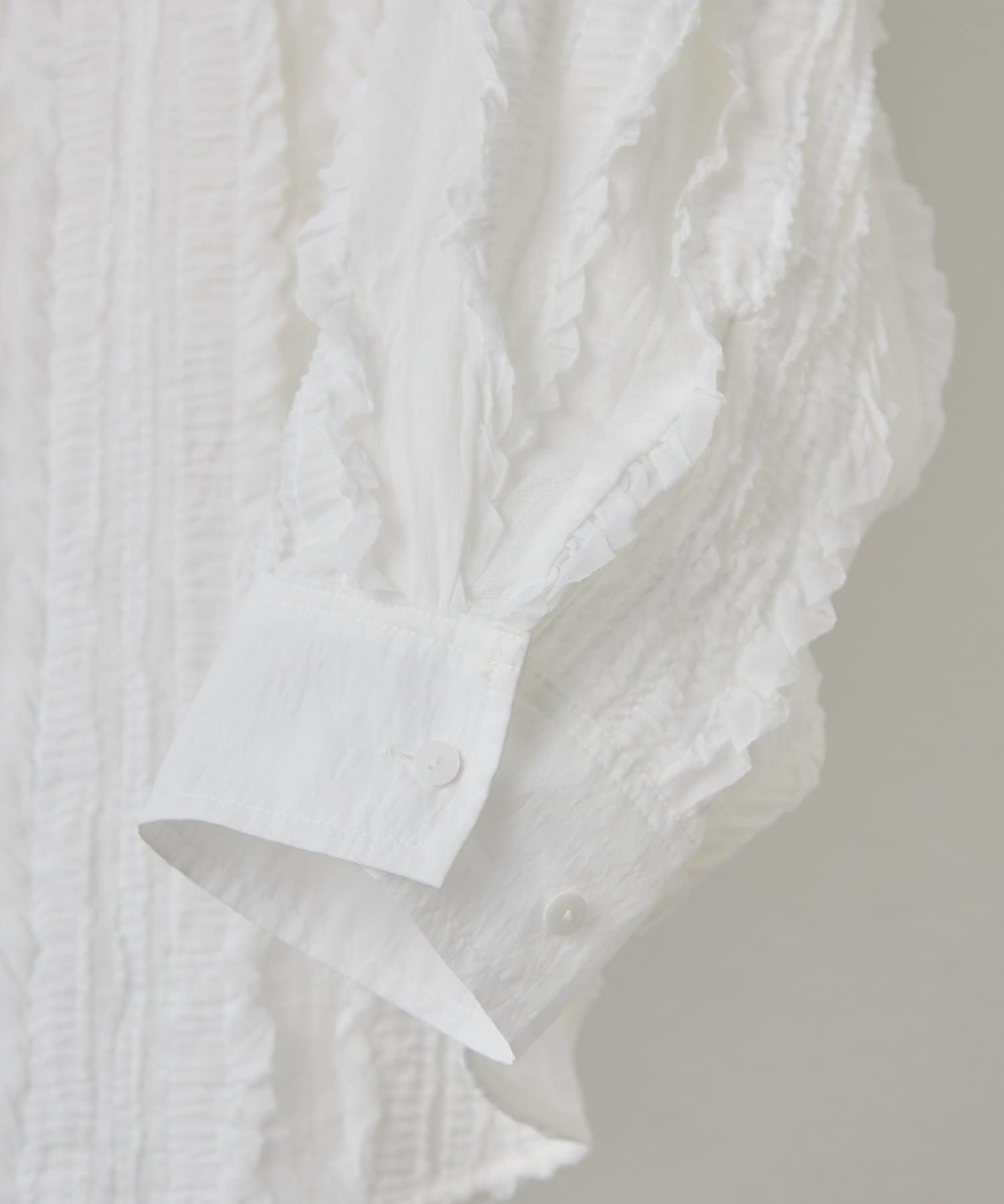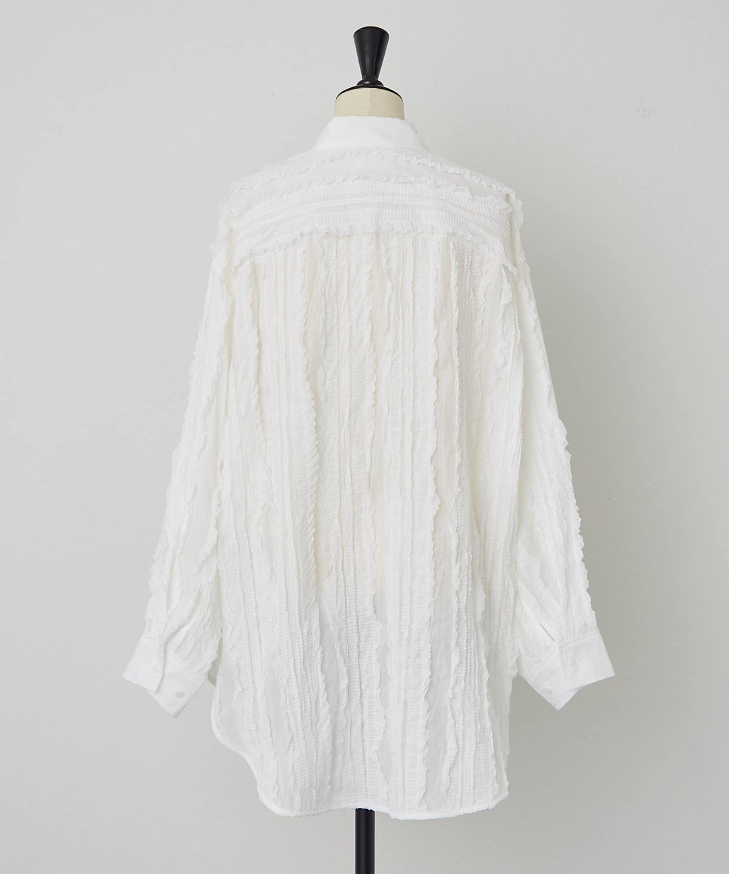 身頃いっぱいにあしらった繊細なフリルが目を惹く、ロマンティックなロングシャツブラウス。
