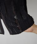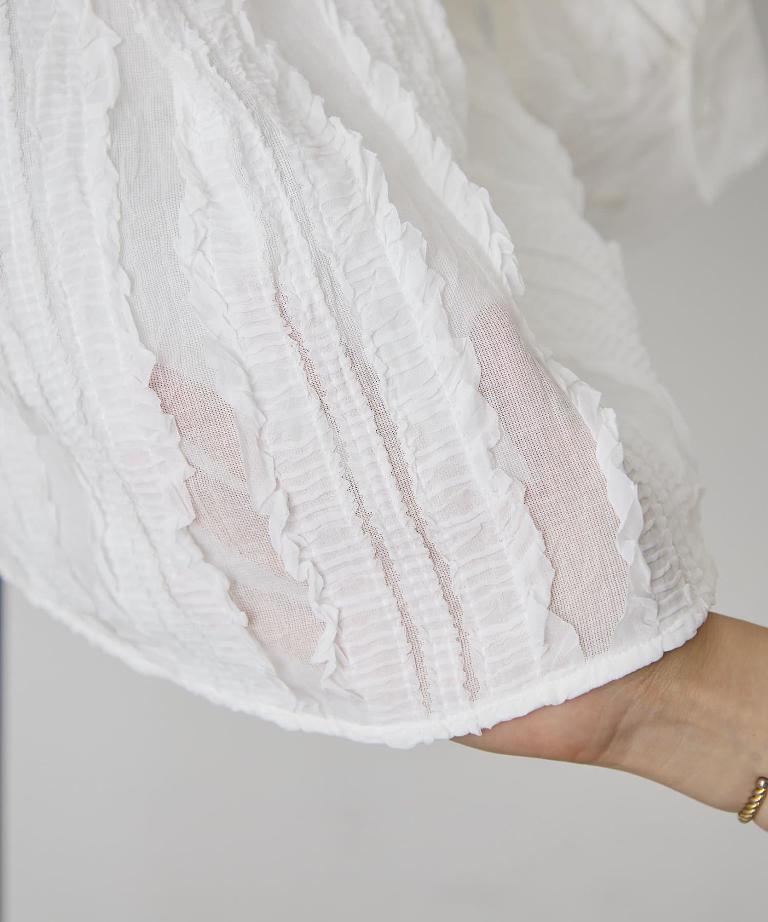 シアー感のあるシフォン生地を細かくタックを入れながら縫い付けることで繊細なギャザーフリルにしています。