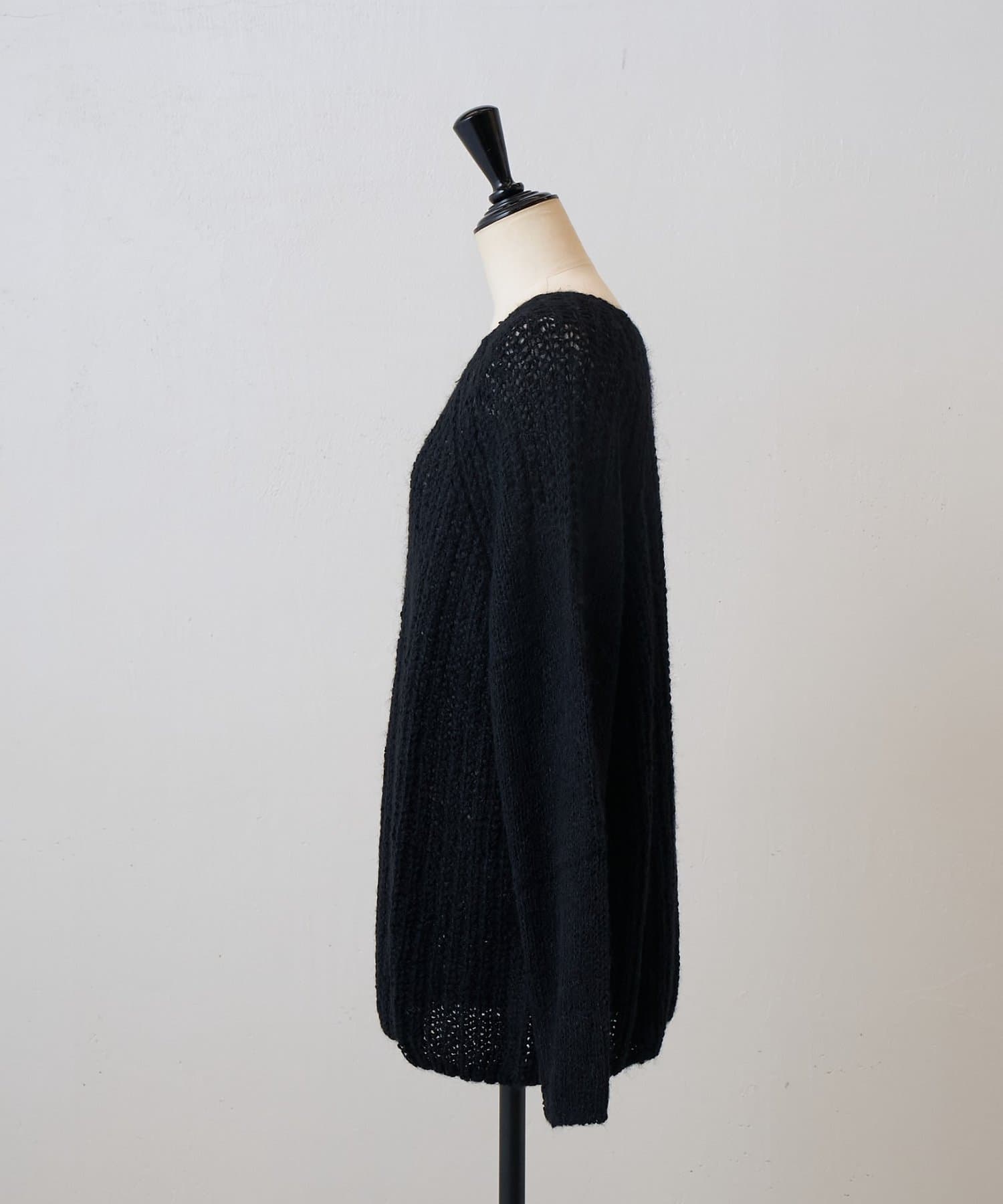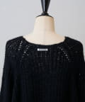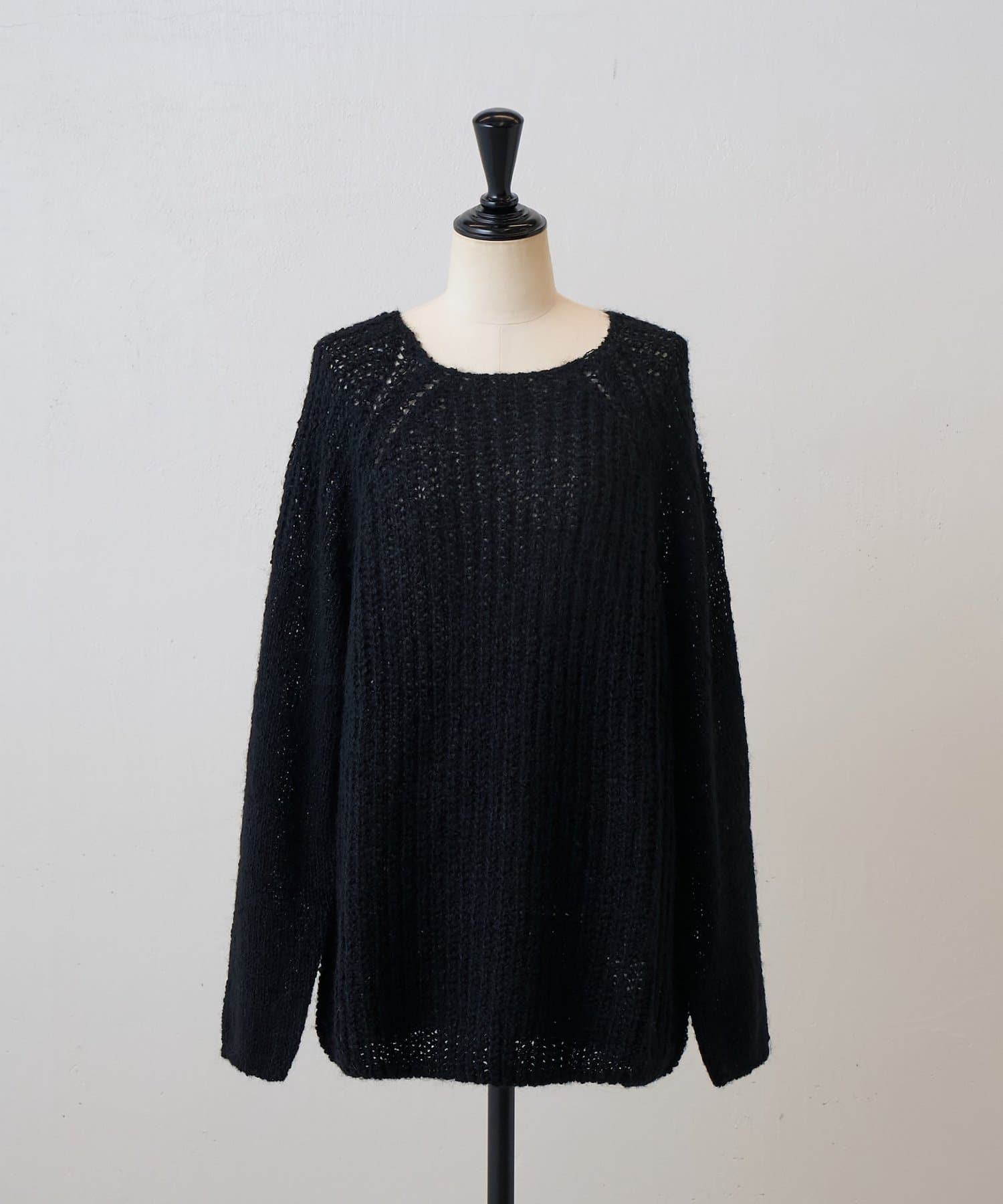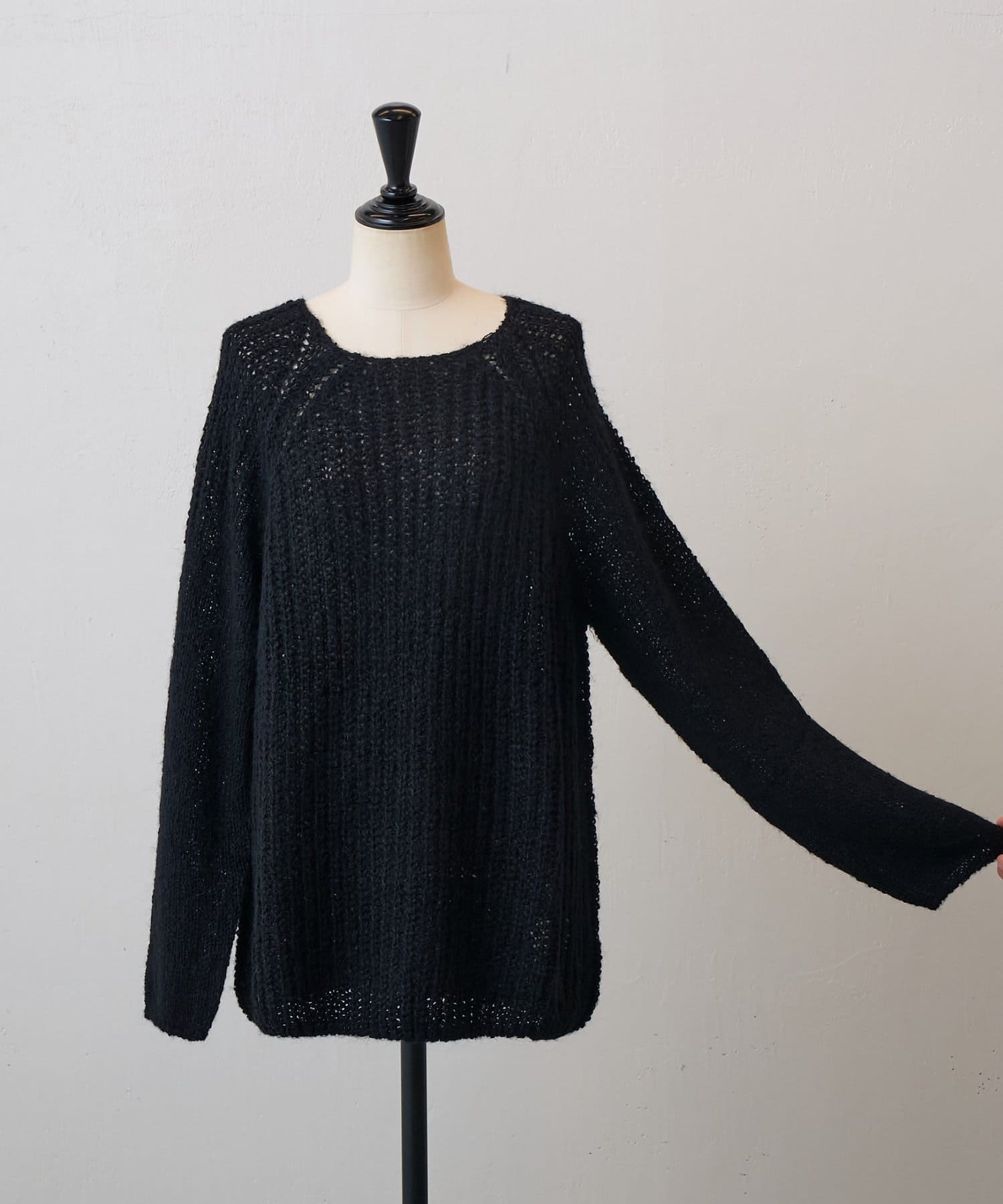 ローゲージの網目がわかいいルーズシルエットのニット。アルパカ混の節のあるニット糸を使用。