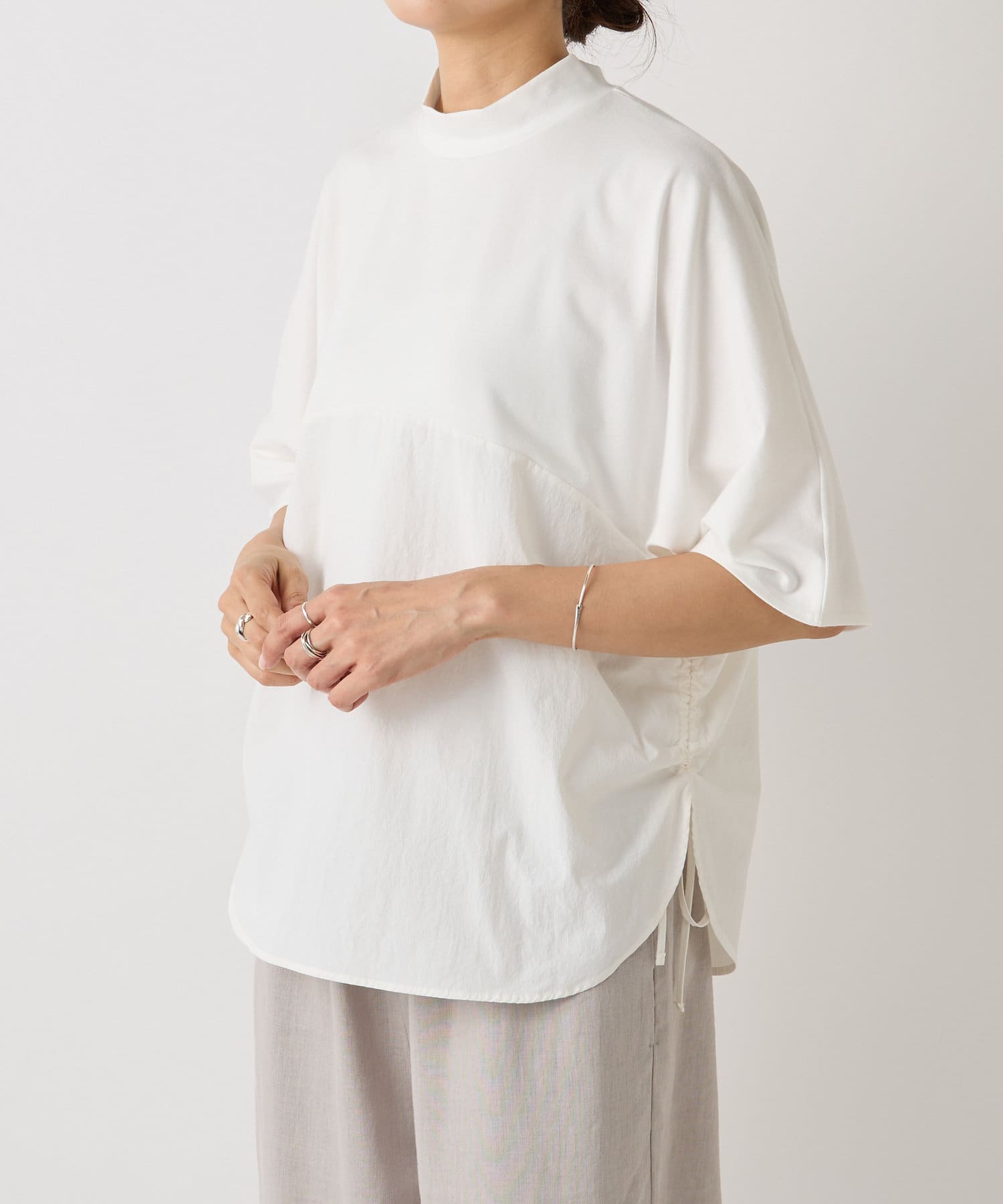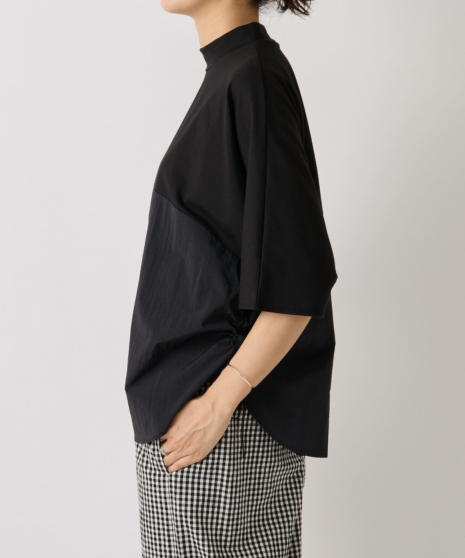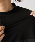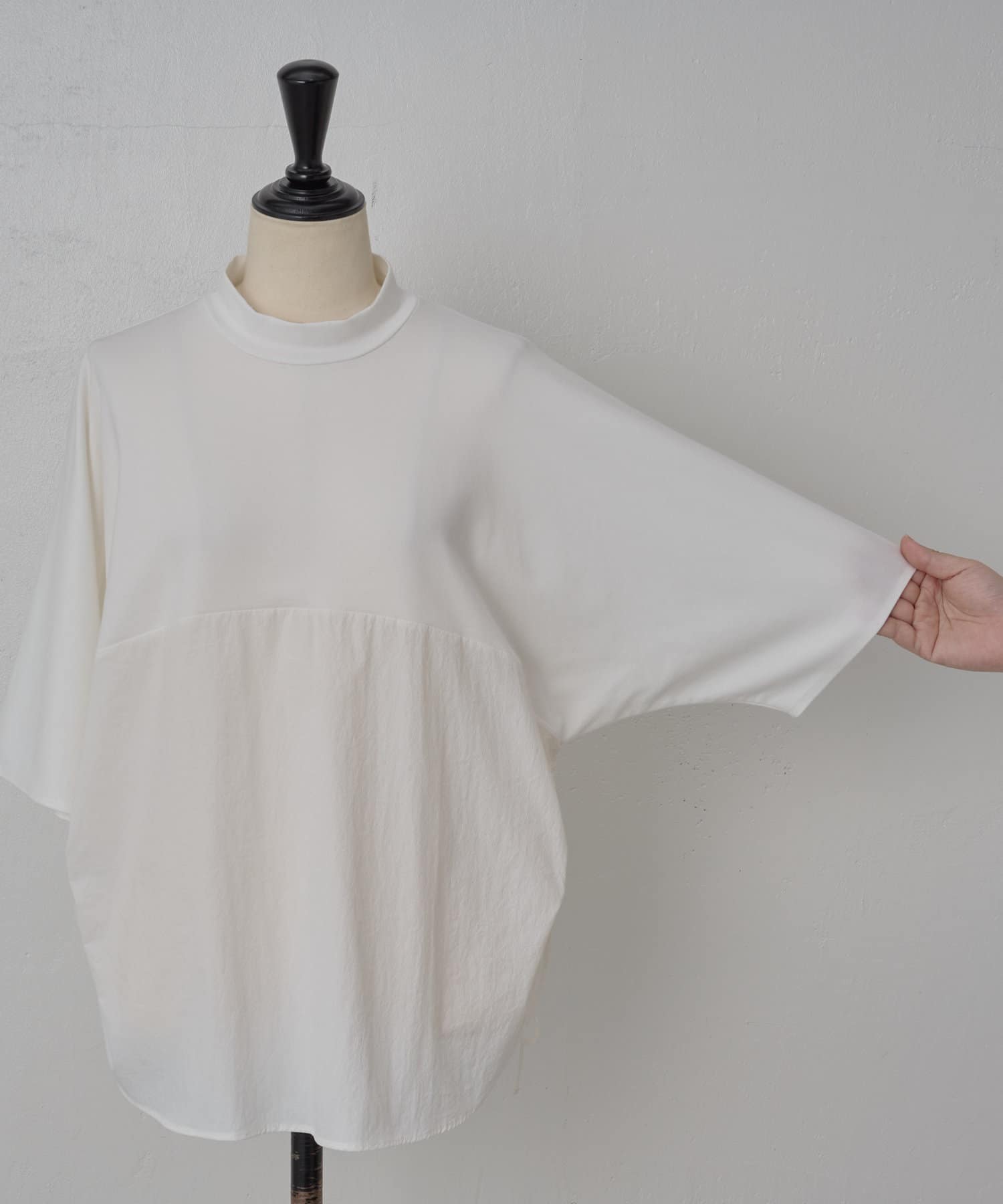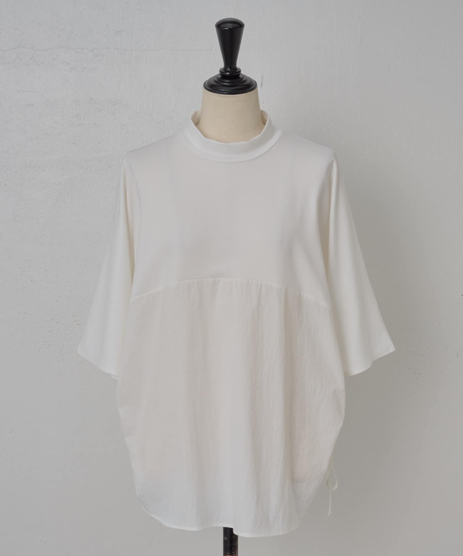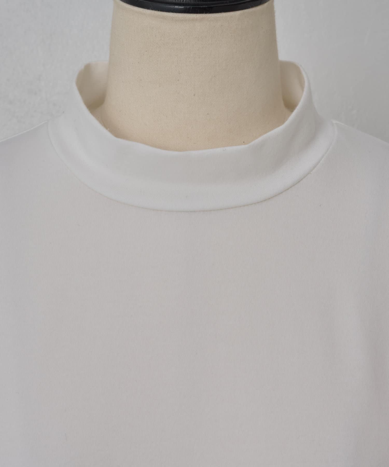 首元の開きが気になる方におすすめの、スタンドカラー仕様で安心感のあるカットソー。