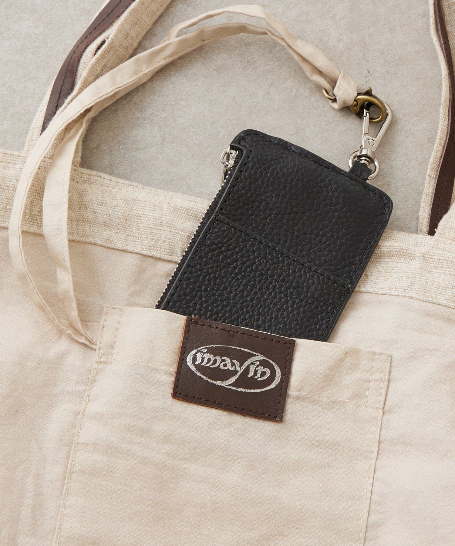 内側にはカニカン付きのストラップがついているので、パスケースなどを取り付けるのにも便利です。